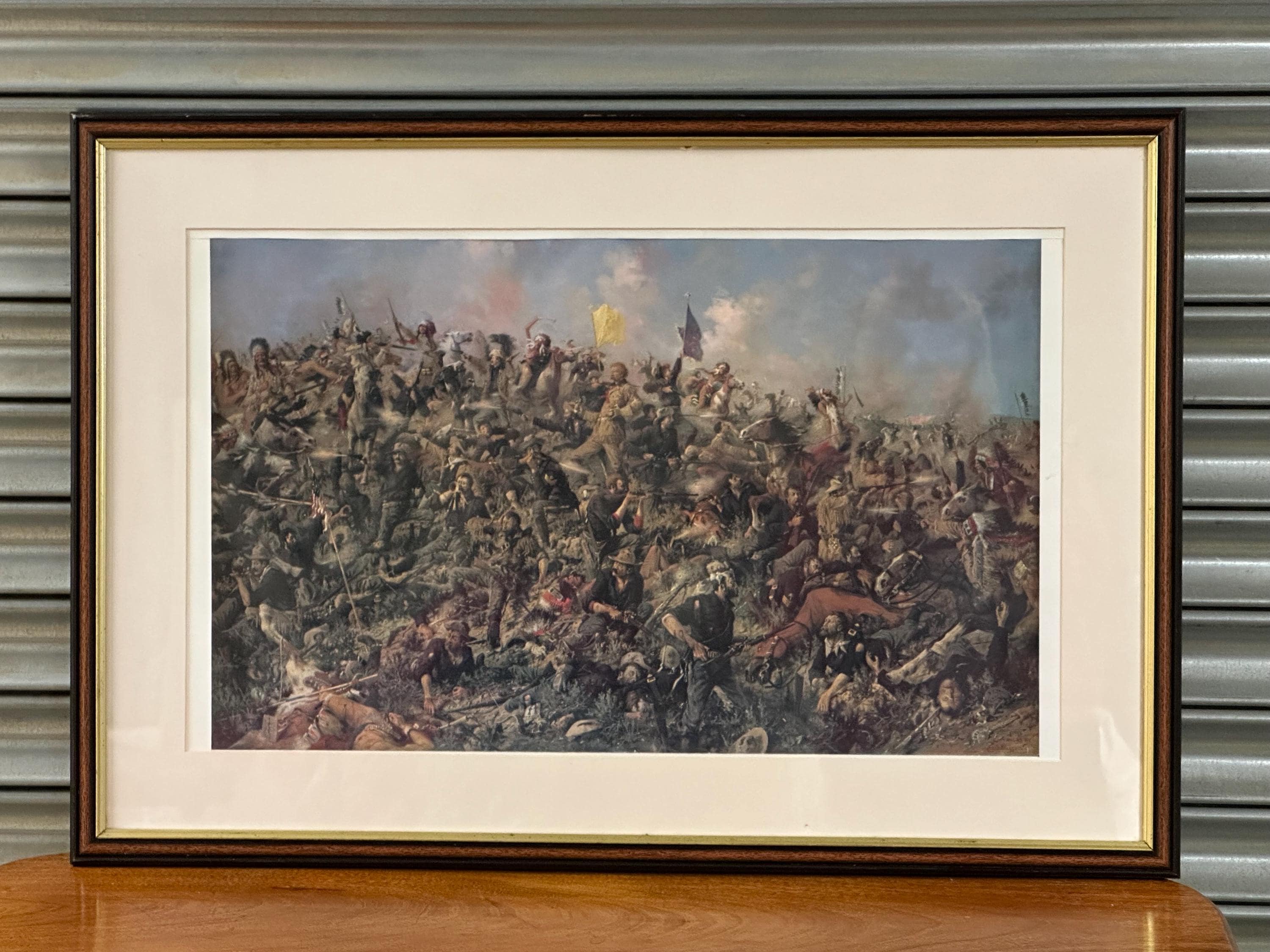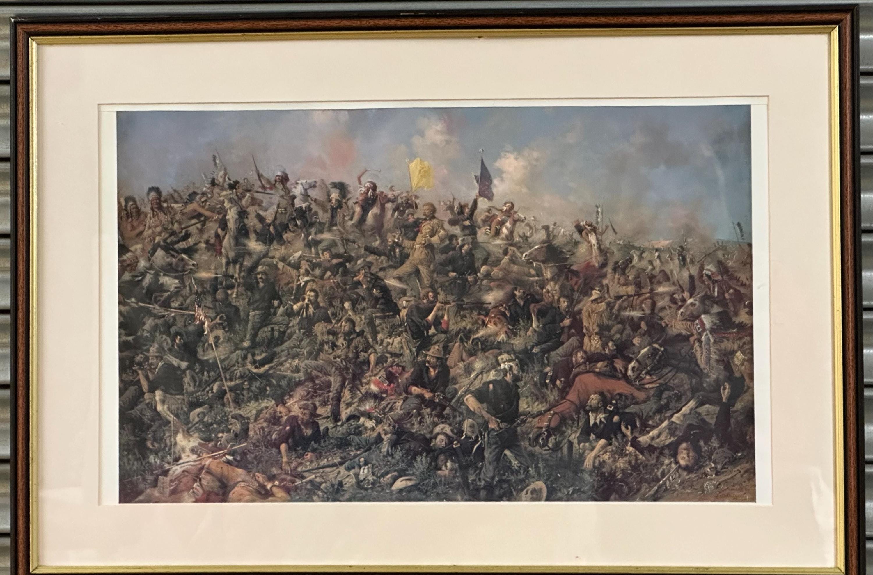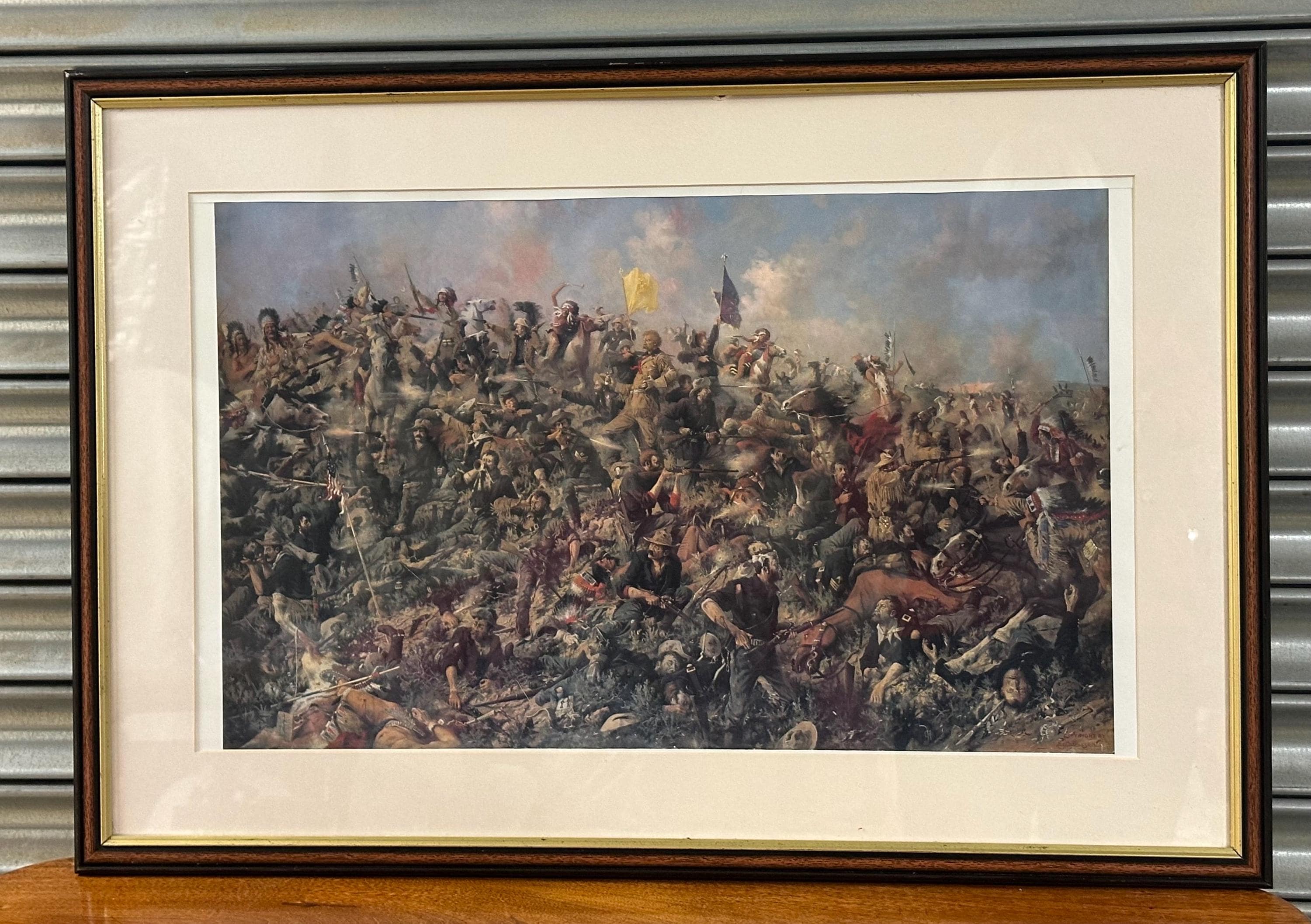 A dramatic framed print depicting Custer’s Last Stand, one of the most iconic moments in American Western and military history. This highly detailed artwork shows the intense final battle of Lt. Col. George Armstrong Custer and the 7th Cavalry at the Battle of the Little Bighorn, portrayed with vivid movement, colour, and emotion.