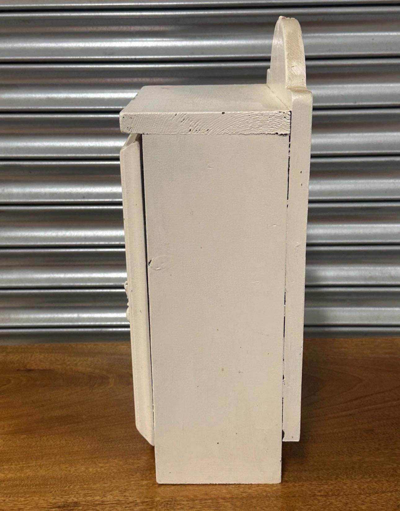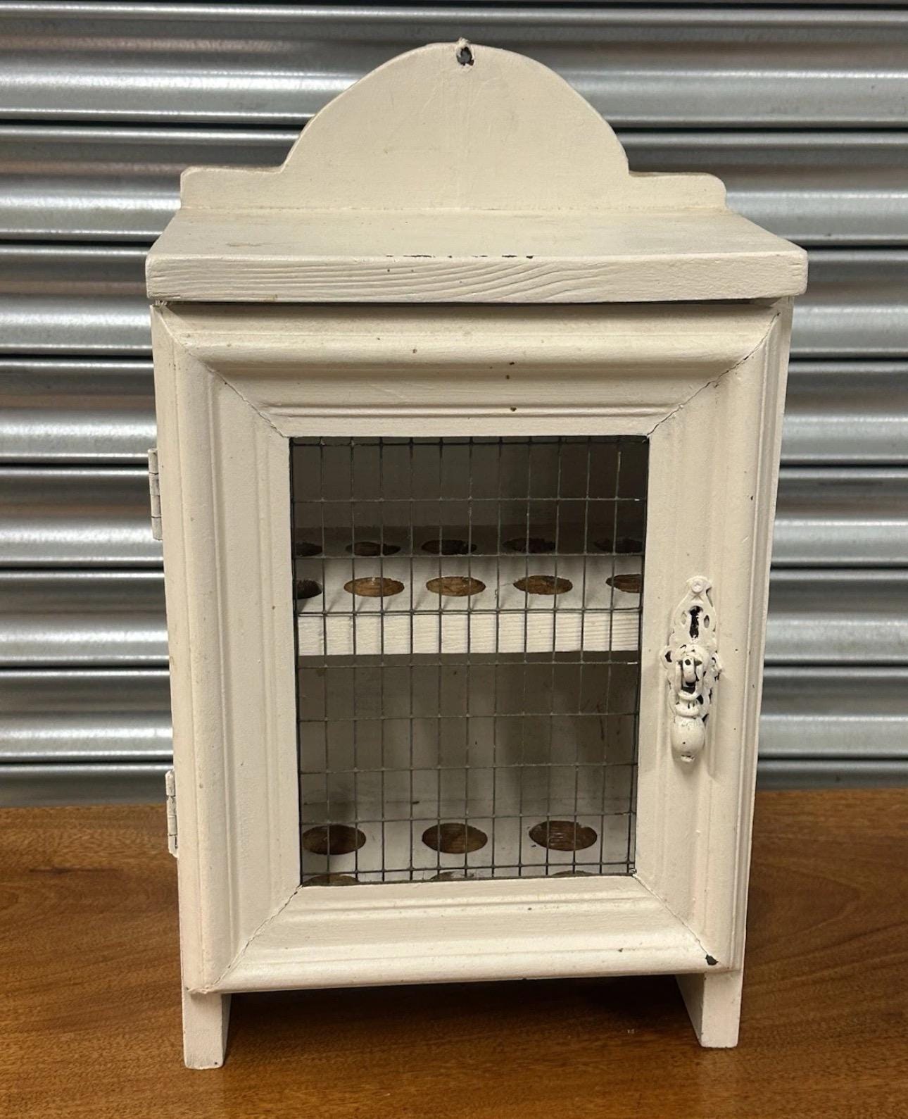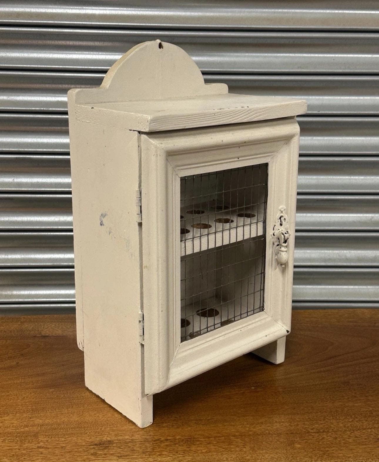 This lovely vintage wooden egg cabinet is full of rustic charm and perfect for a country kitchen. Finished in a soft cream paint with light distressing, it features a wire-front door, original decorative metal catch, and two internal shelves with circular cut-outs designed to securely hold eggs.