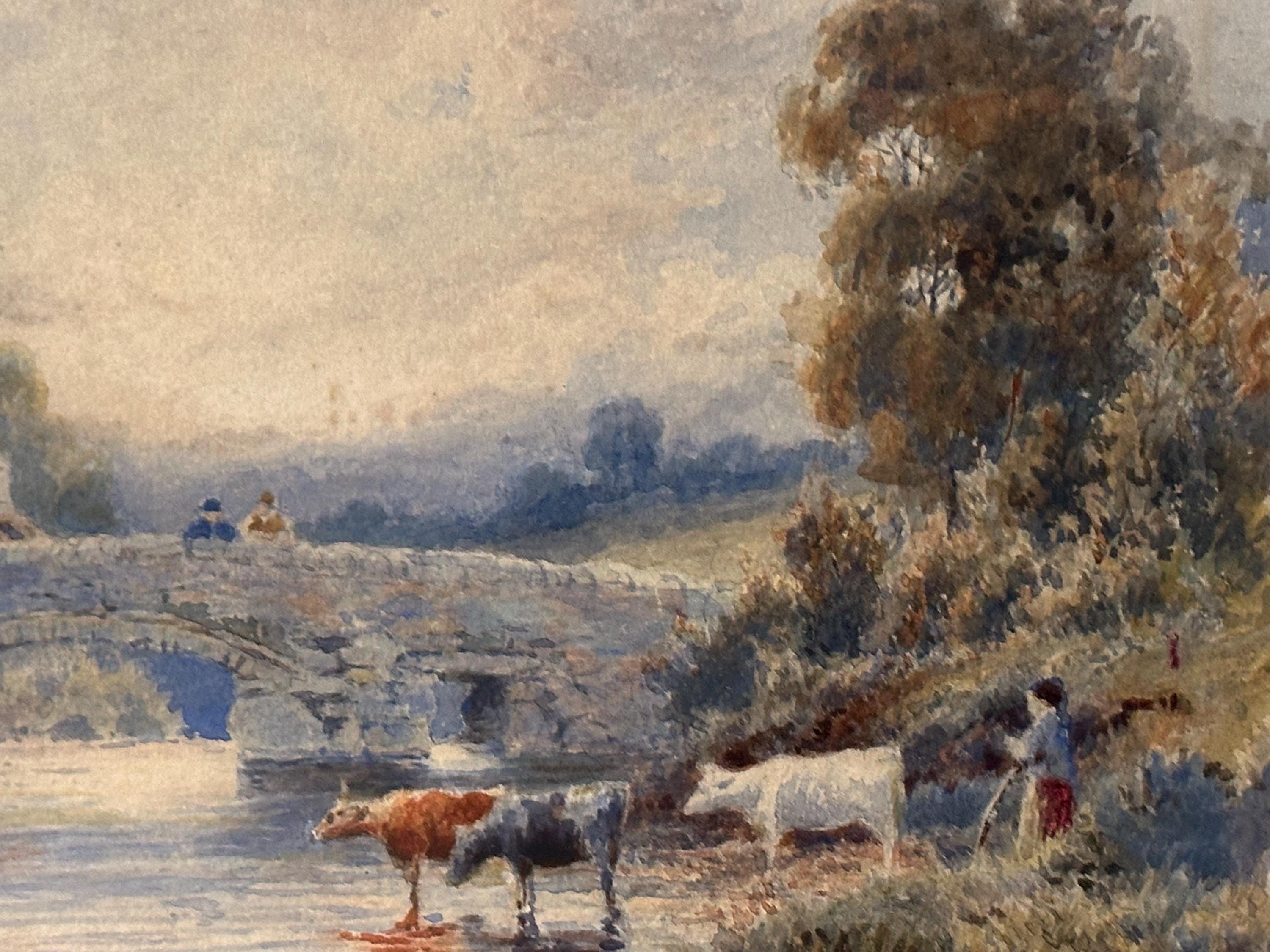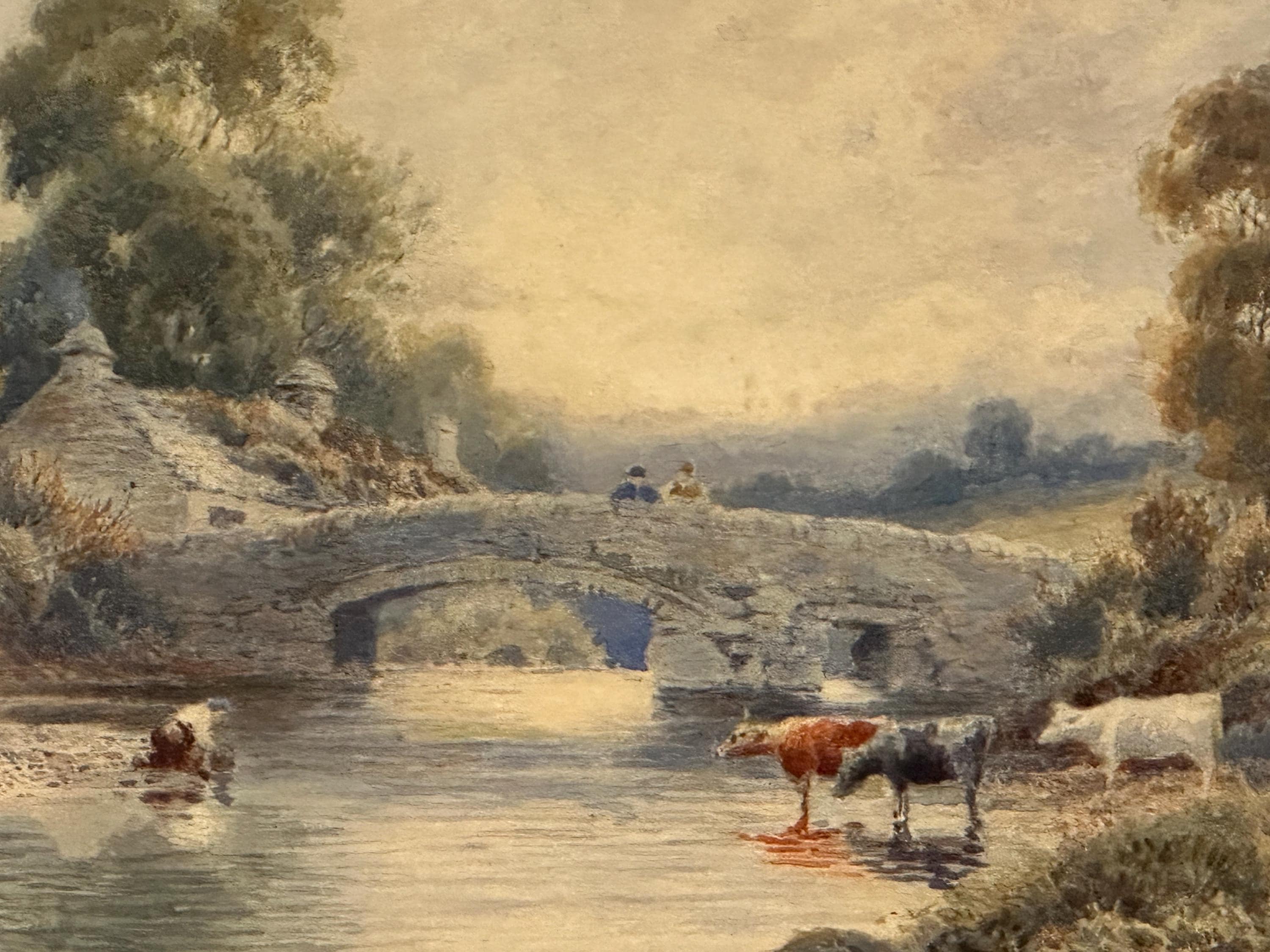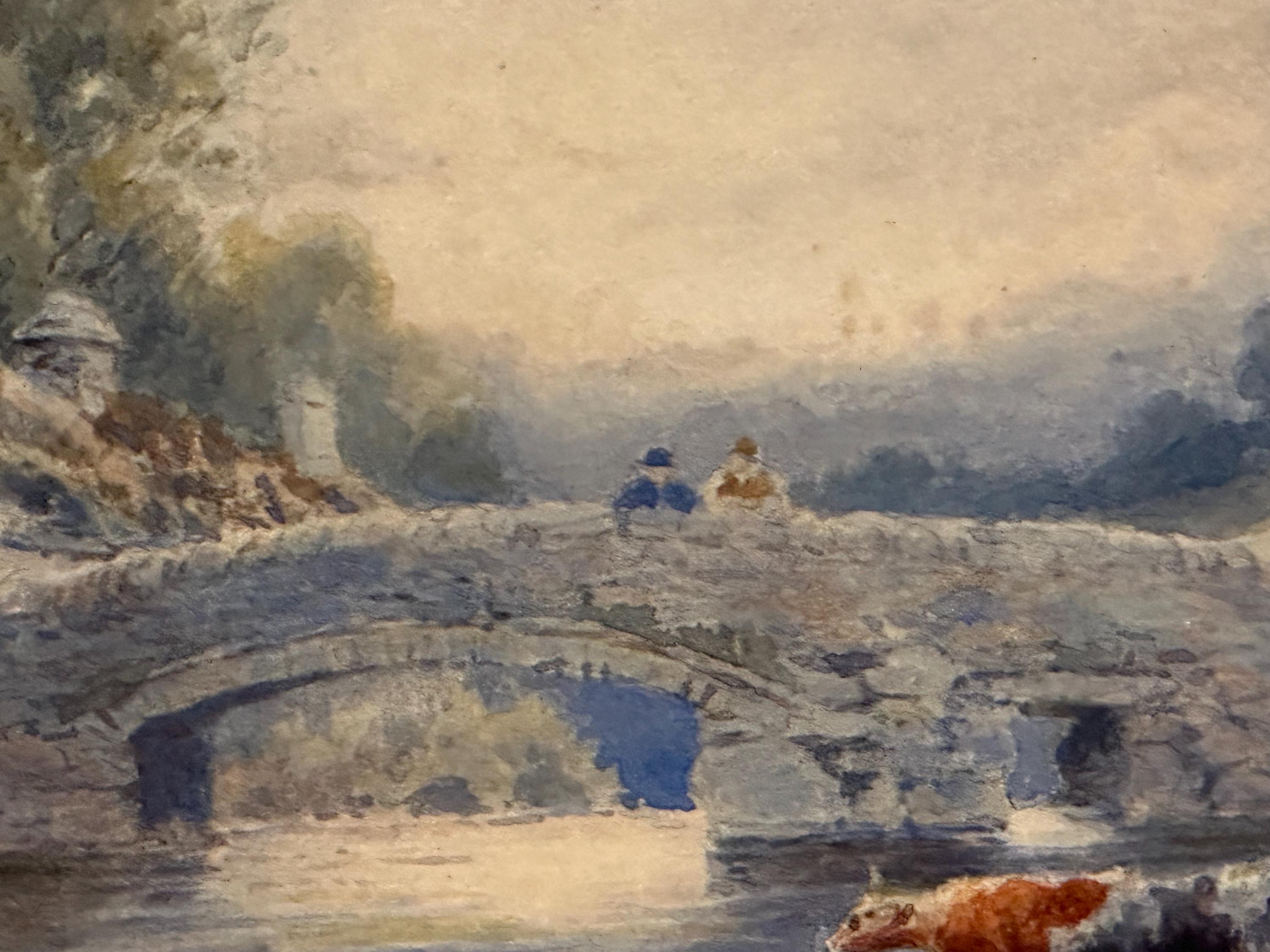 The painting captures a tranquil riverside moment featuring a stone arched bridge, cattle watering at the river’s edge, a figure tending livestock, and charming rural buildings nestled among mature trees. The scene is bathed in soft, misty light, showcasing Dobson’s ability to create depth, mood and a sense of calm.