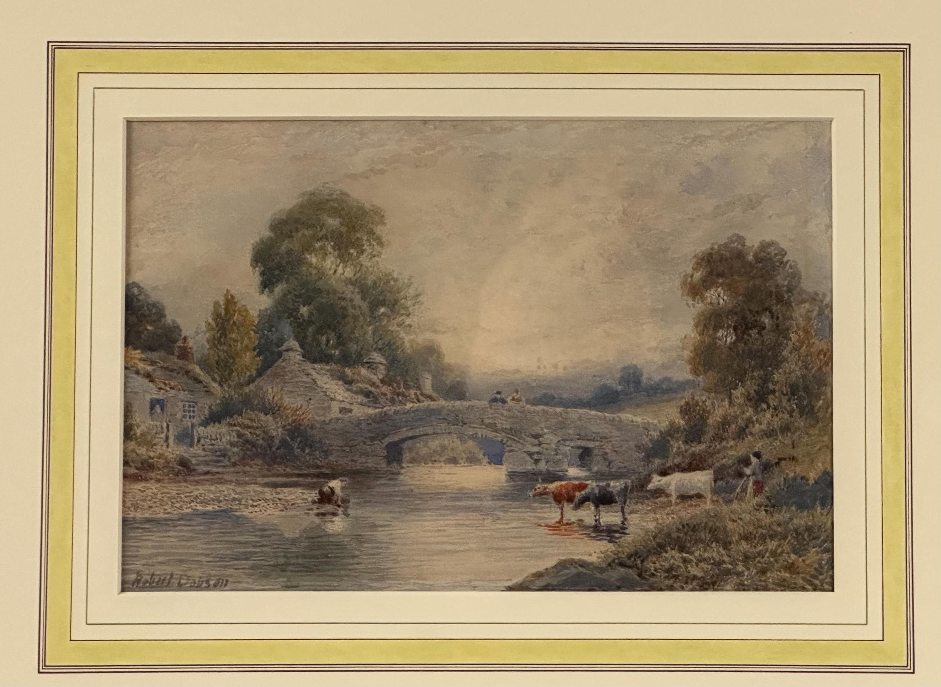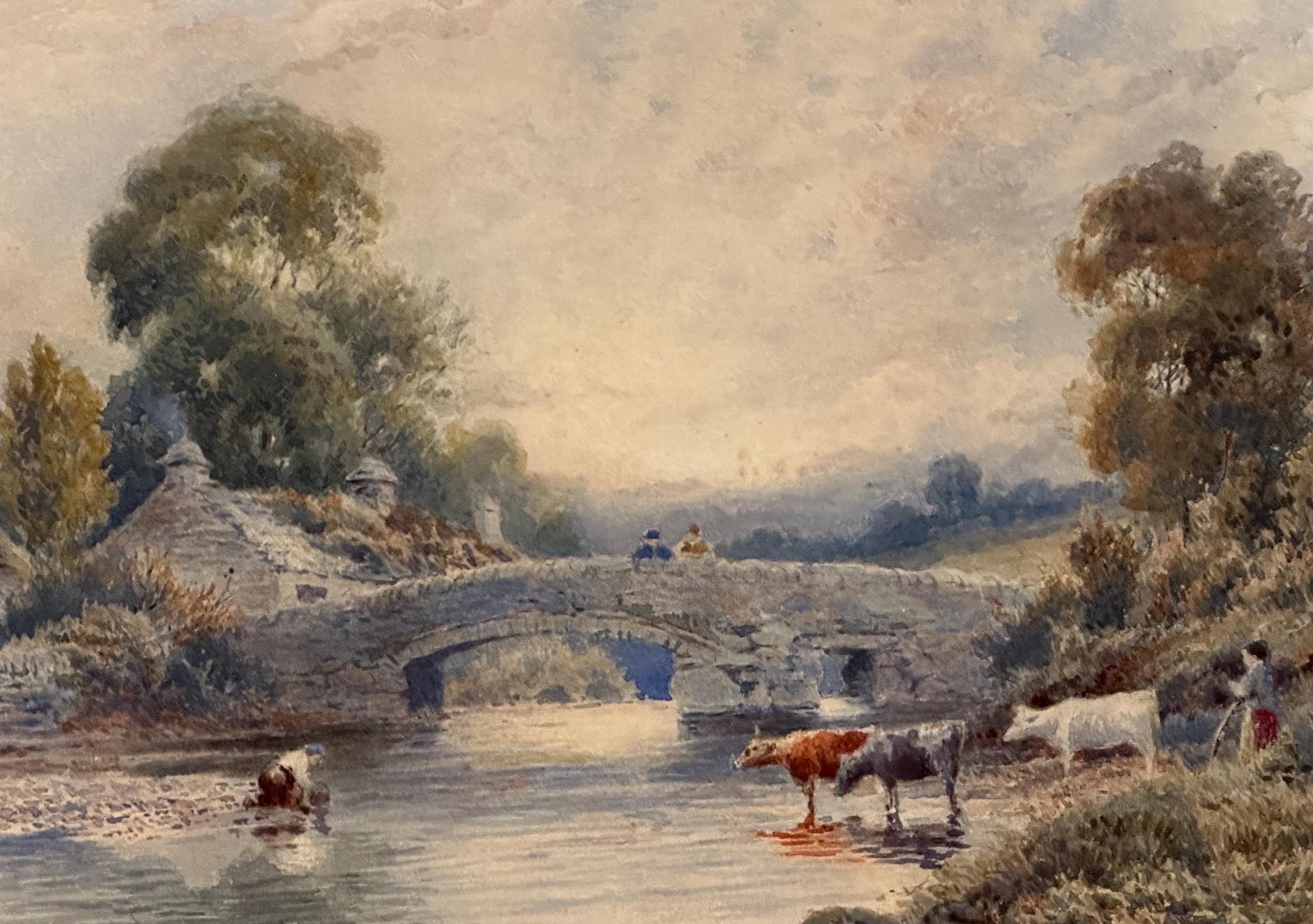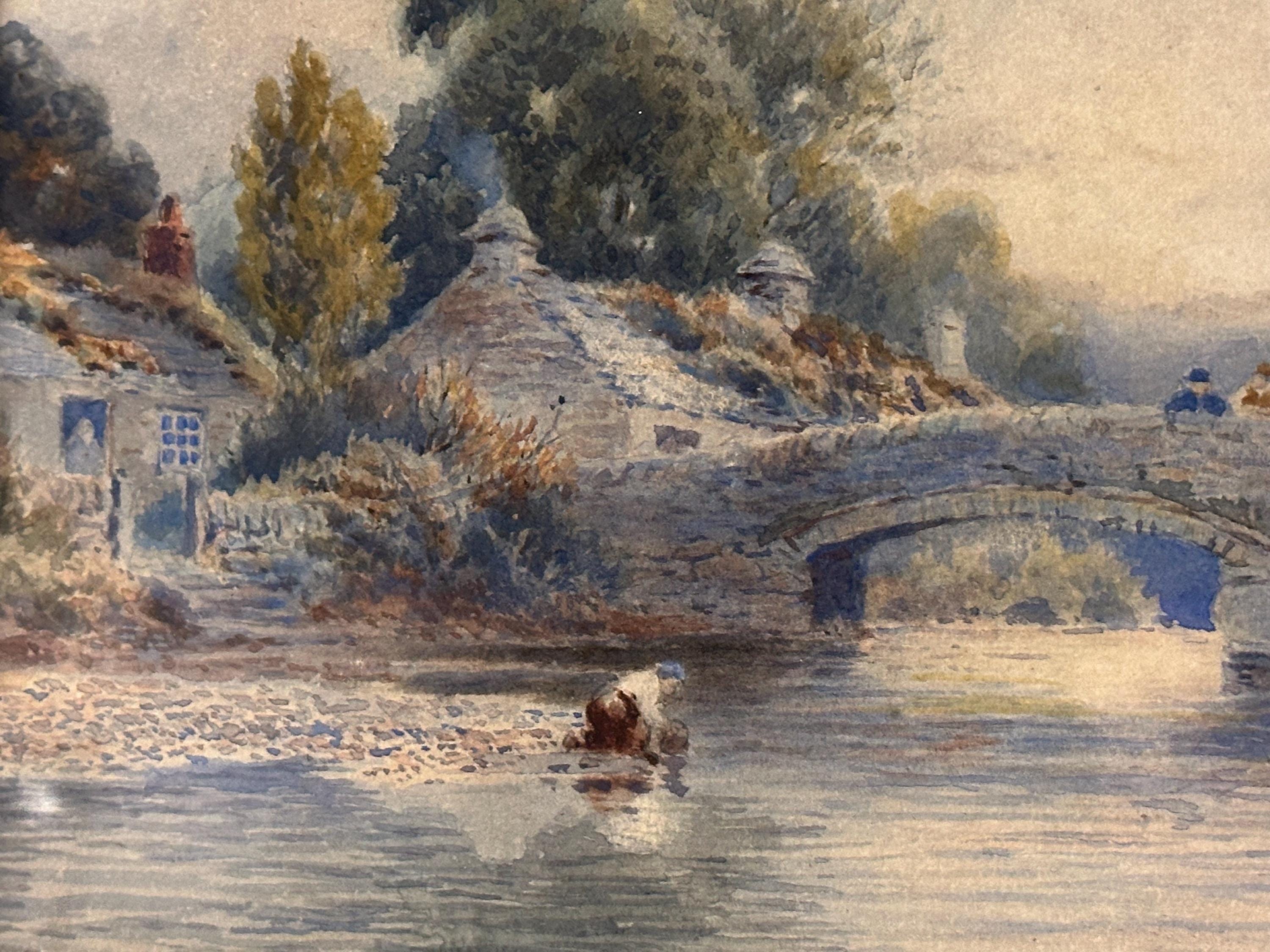 The painting captures a tranquil riverside moment featuring a stone arched bridge, cattle watering at the river’s edge, a figure tending livestock, and charming rural buildings nestled among mature trees. The scene is bathed in soft, misty light, showcasing Dobson’s ability to create depth, mood and a sense of calm.