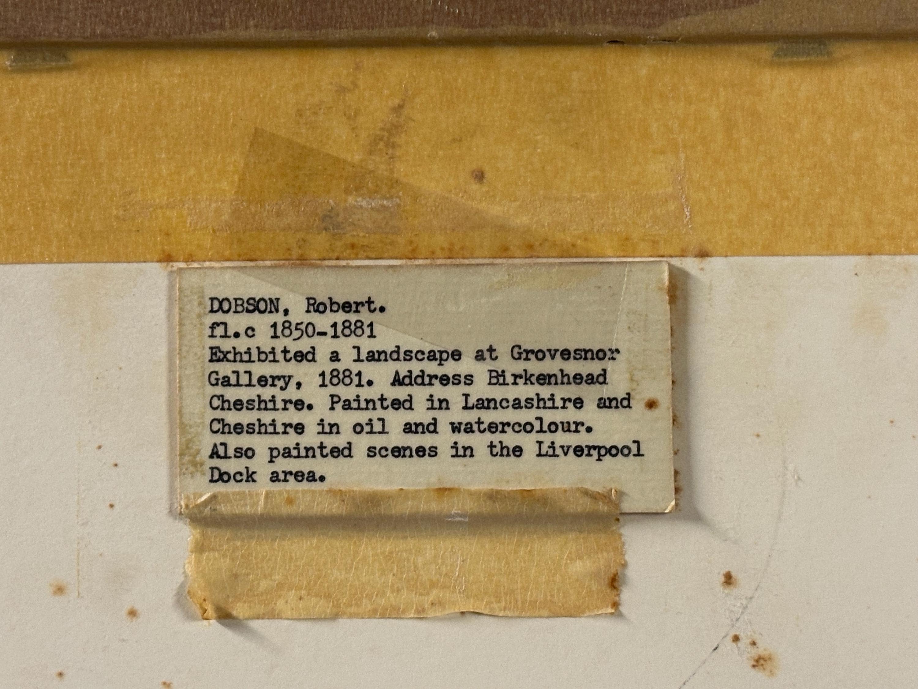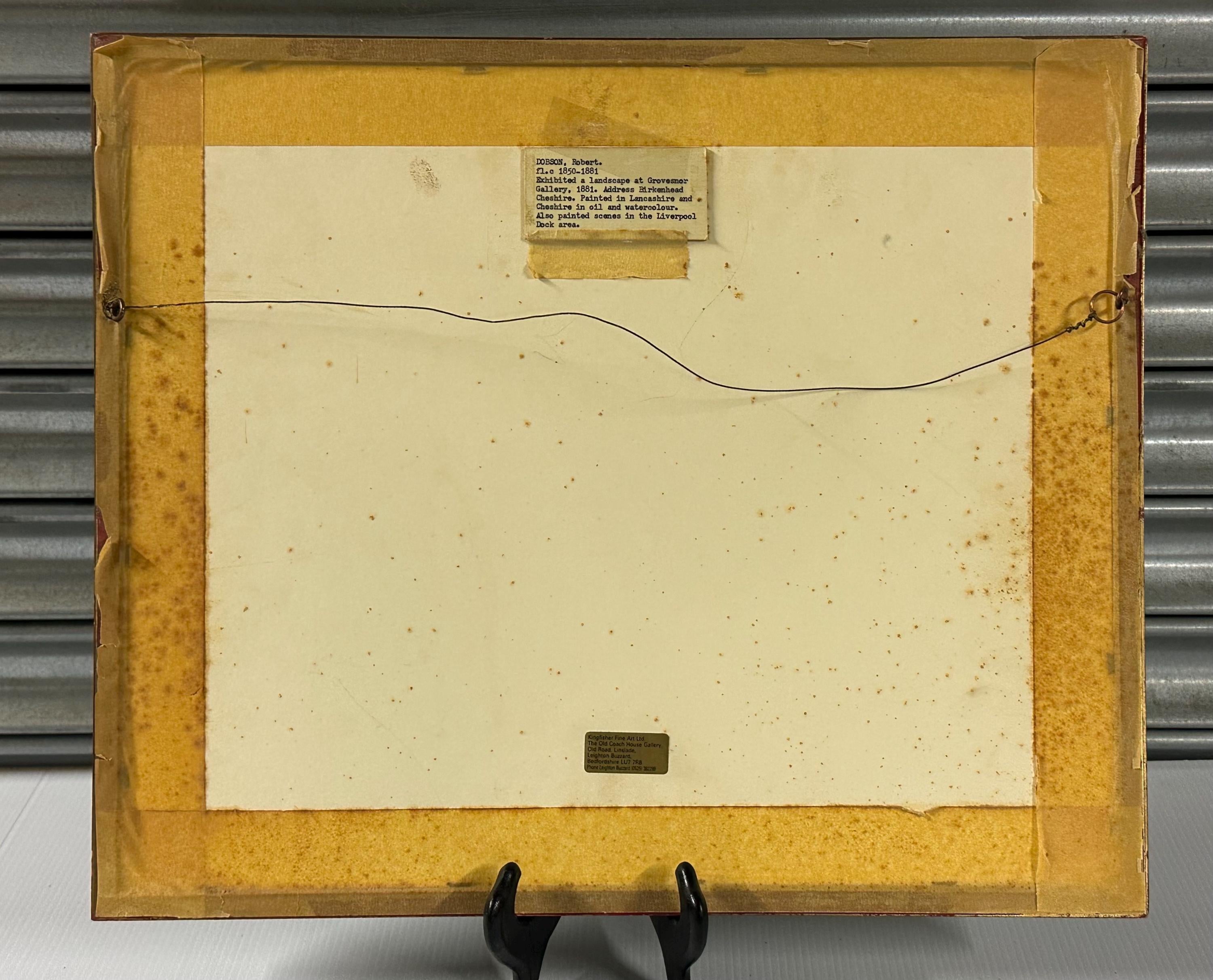 Dobson lived in Birkenhead in 1889 and Liverpool in 1898. He painted a few landscapes but was known for his paintings depicting Liverpool's docks. He exhibited five works at the Liverpool Autumn Exhibition between 1898 and 1901, one landscape at the Grosvenor Gallery in 1881 and once at Manchester.