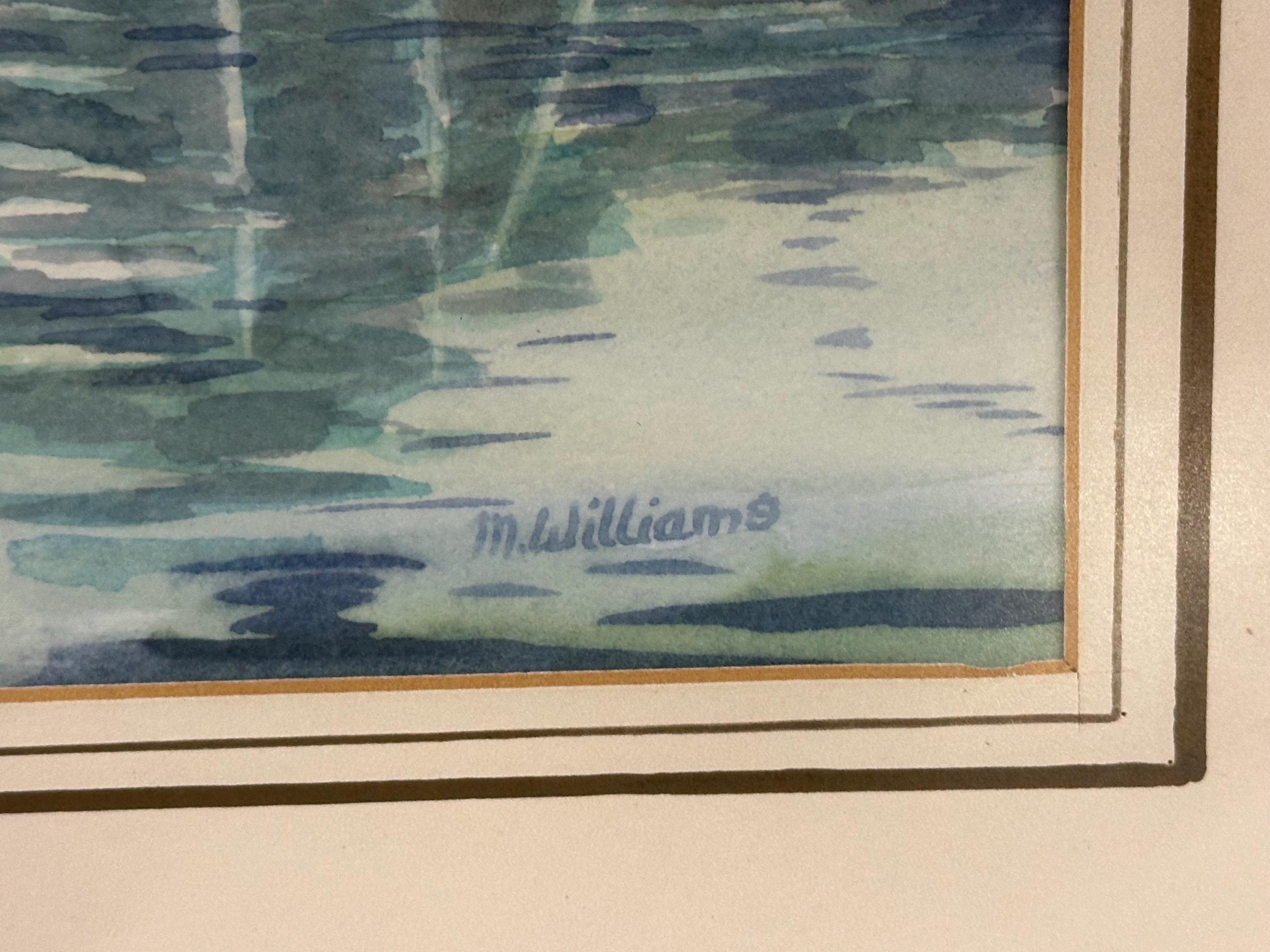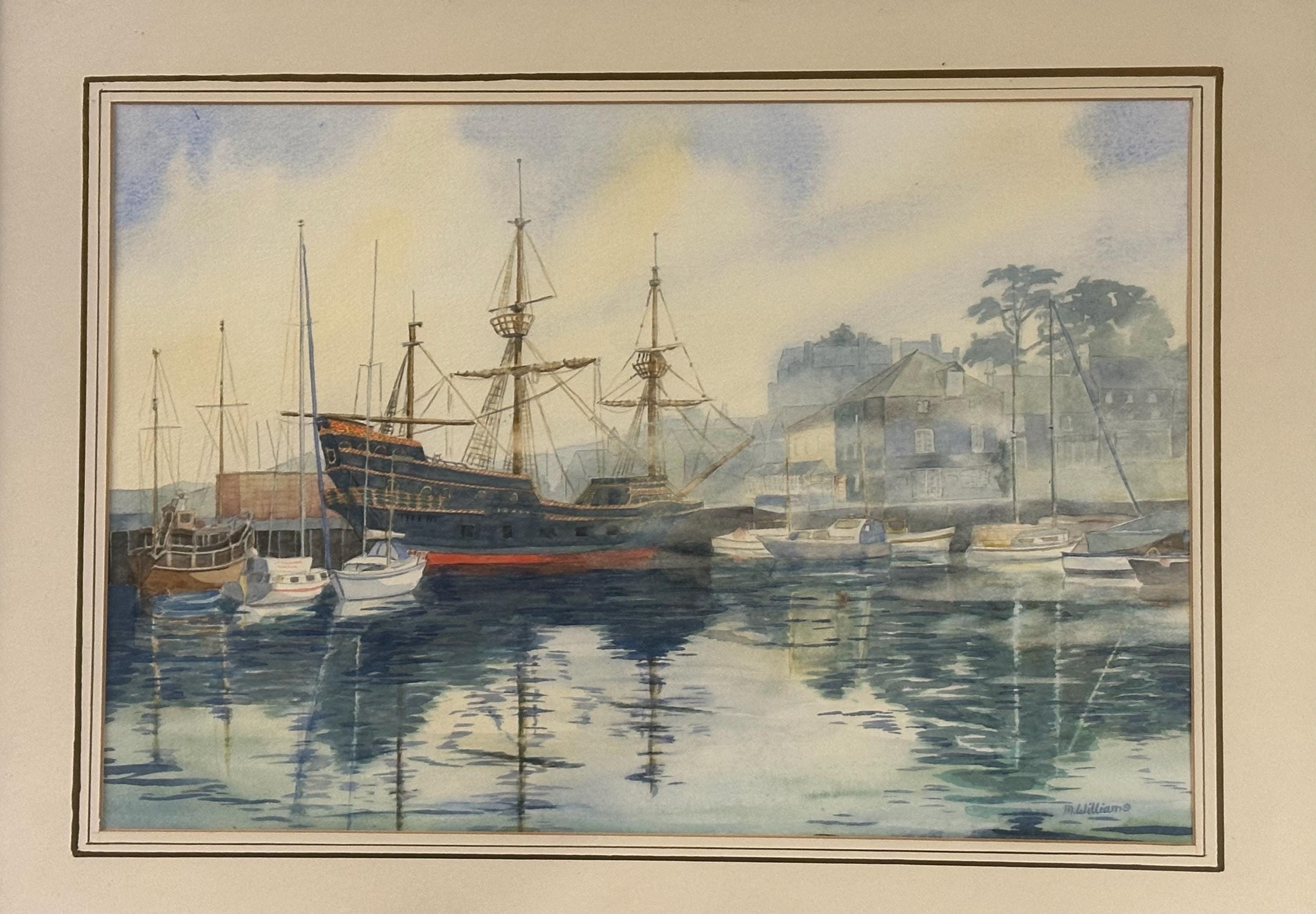 This is a charming and atmospheric watercolour painting depicting the famous Golden Hind moored in Padstow Harbour, signed lower right by the artist M. Williams. The scene captures a tranquil harbour view with boats at rest, their reflections shimmering across calm blue water, and soft coastal light washing over the historic ship and surrounding buildings.