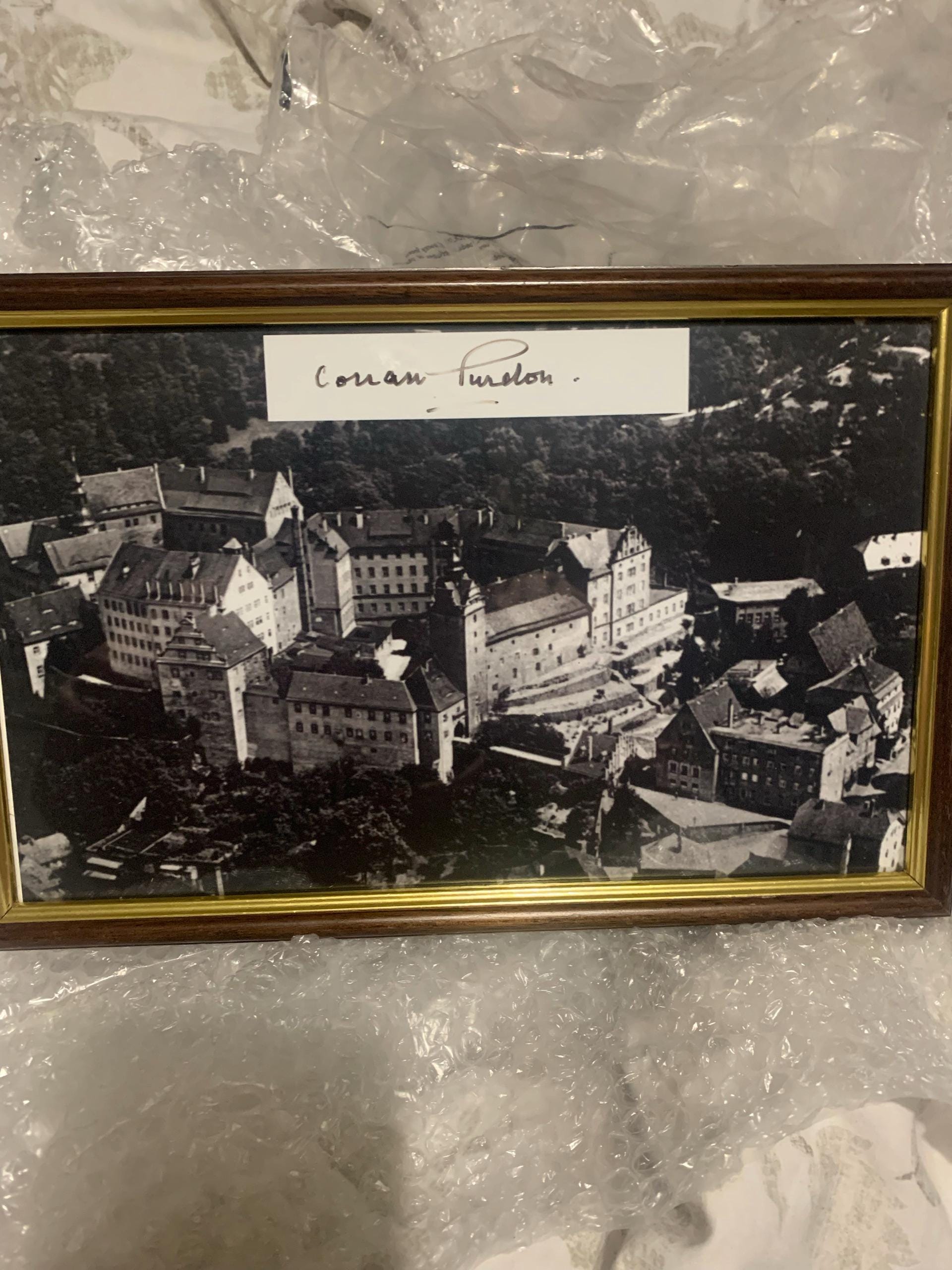 A fascinating framed photographic display featuring an aerial black-and-white view of a large European castle complex. Mounted at the top of the frame is an original hand-signed autograph of Major General Corran Purdon, a distinguished British Army officer highly regarded for his service during WWII and throughout a long military career.