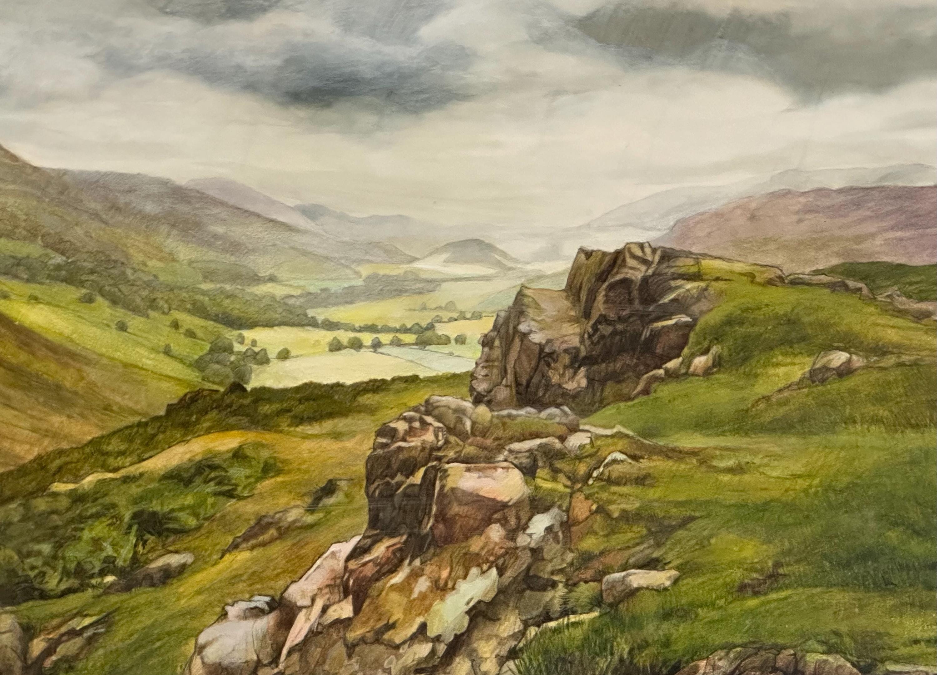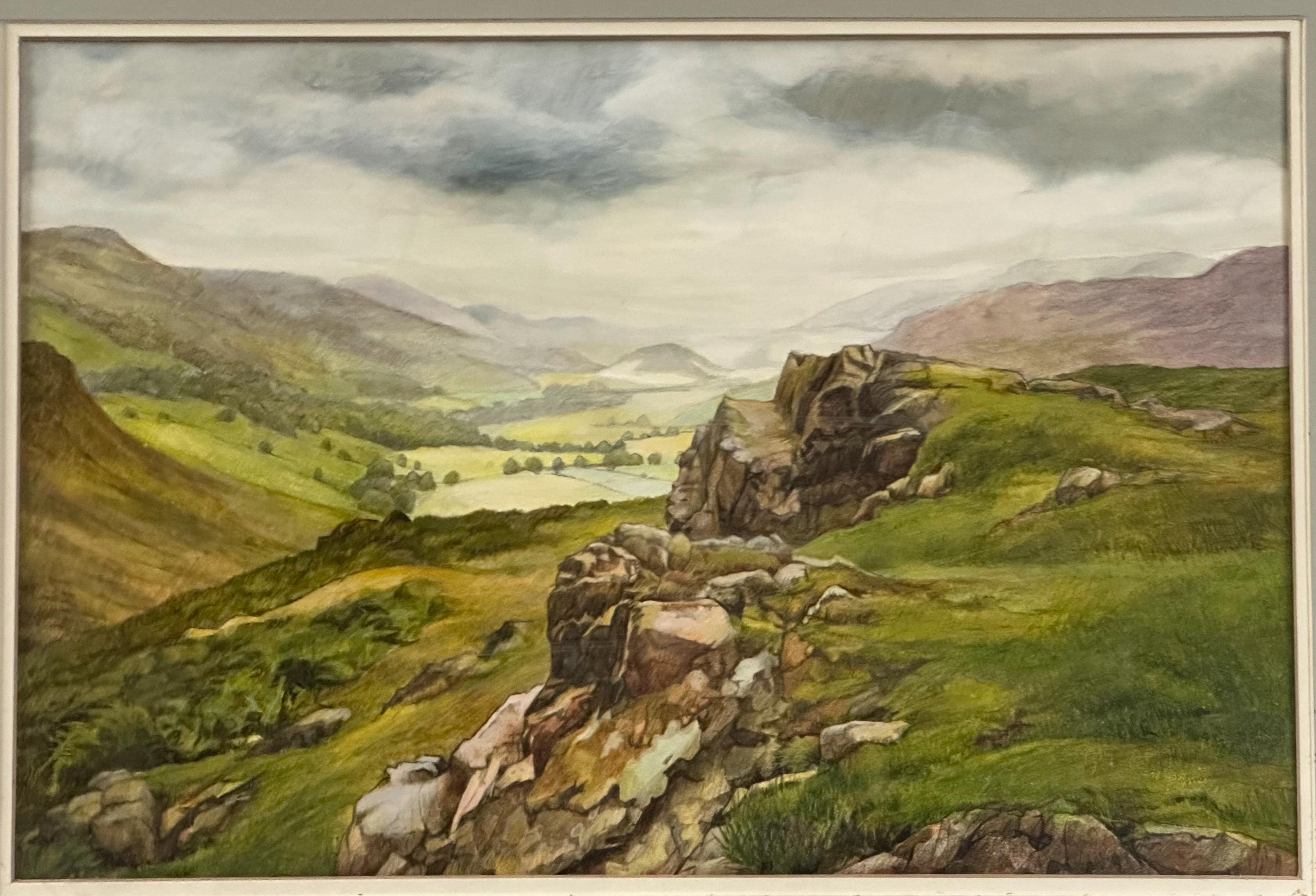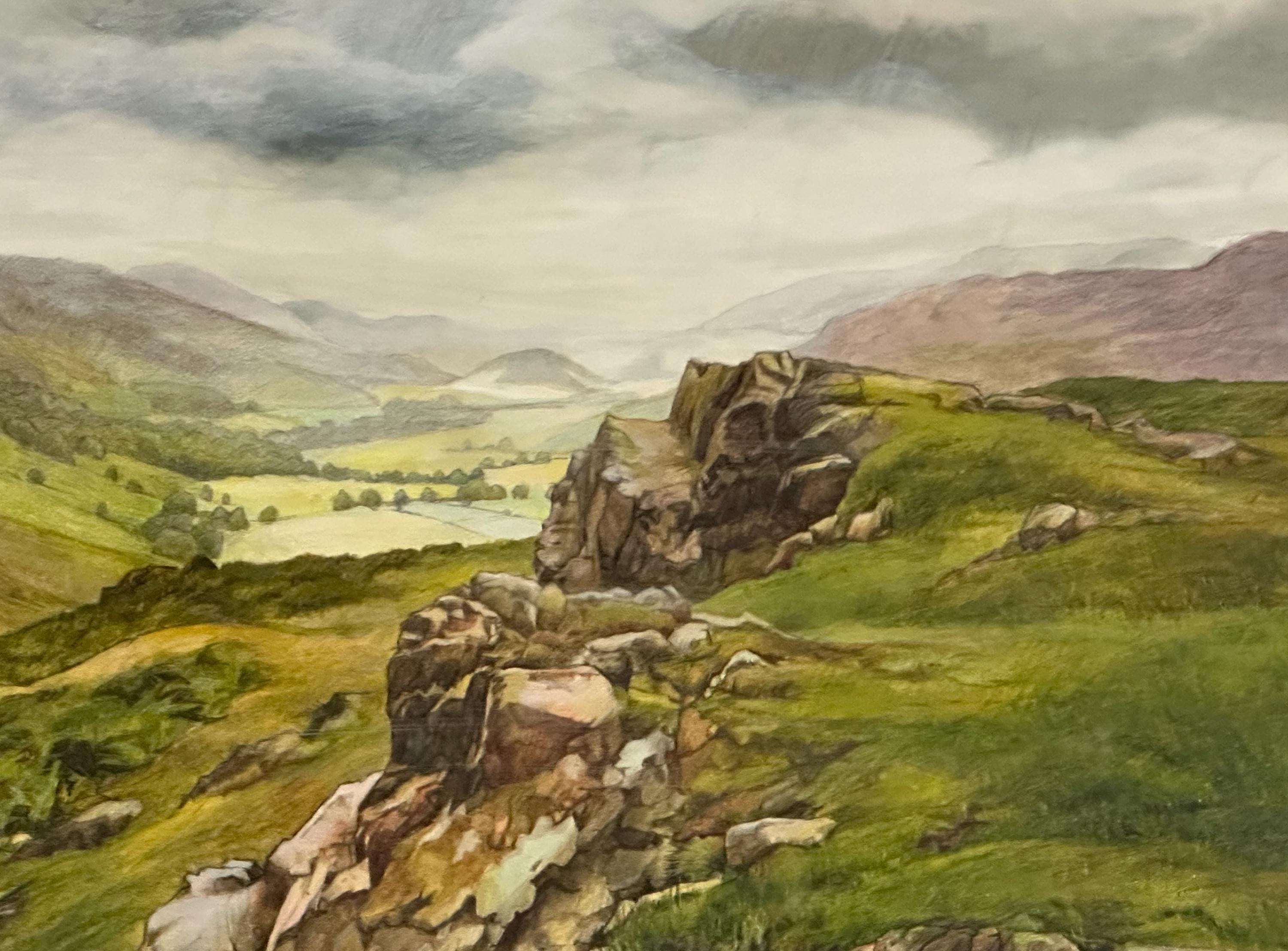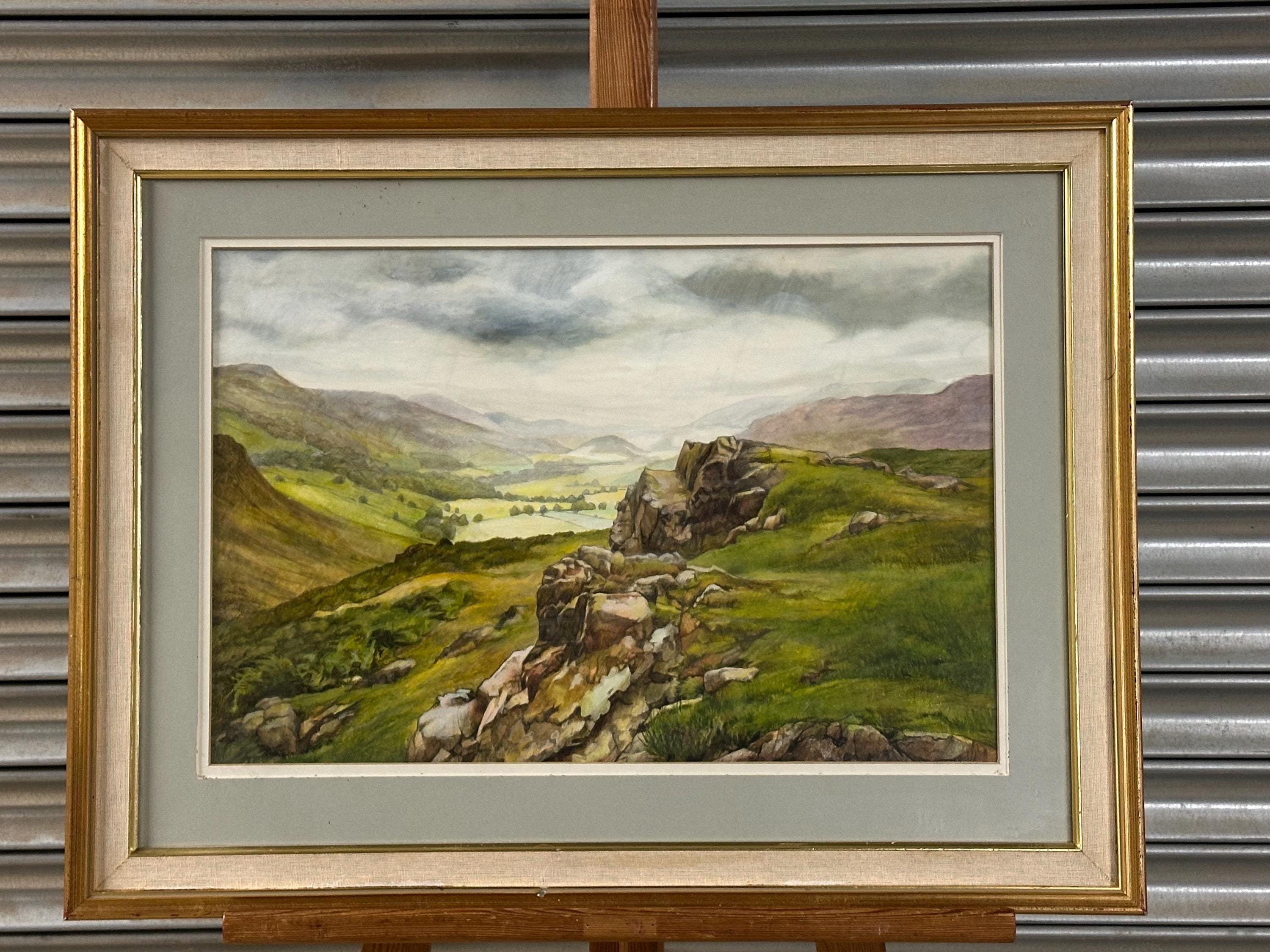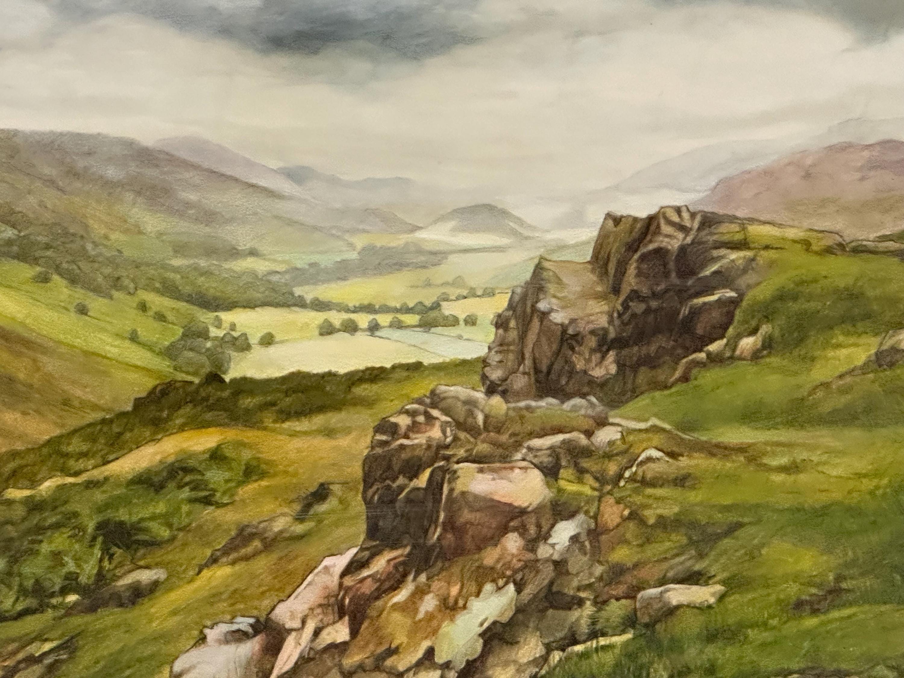 A striking original mixed-media landscape artwork by Keith Wood, titled “Eskdale from Hardknott” and dated 1981. This atmospheric piece captures the dramatic beauty of the Lake District, with sweeping valleys, rolling hills, rocky outcrops and a distant shimmering light over the landscape. The composition is rich in depth, detail and natural colour, making it a wonderful piece for collectors of British landscapes.