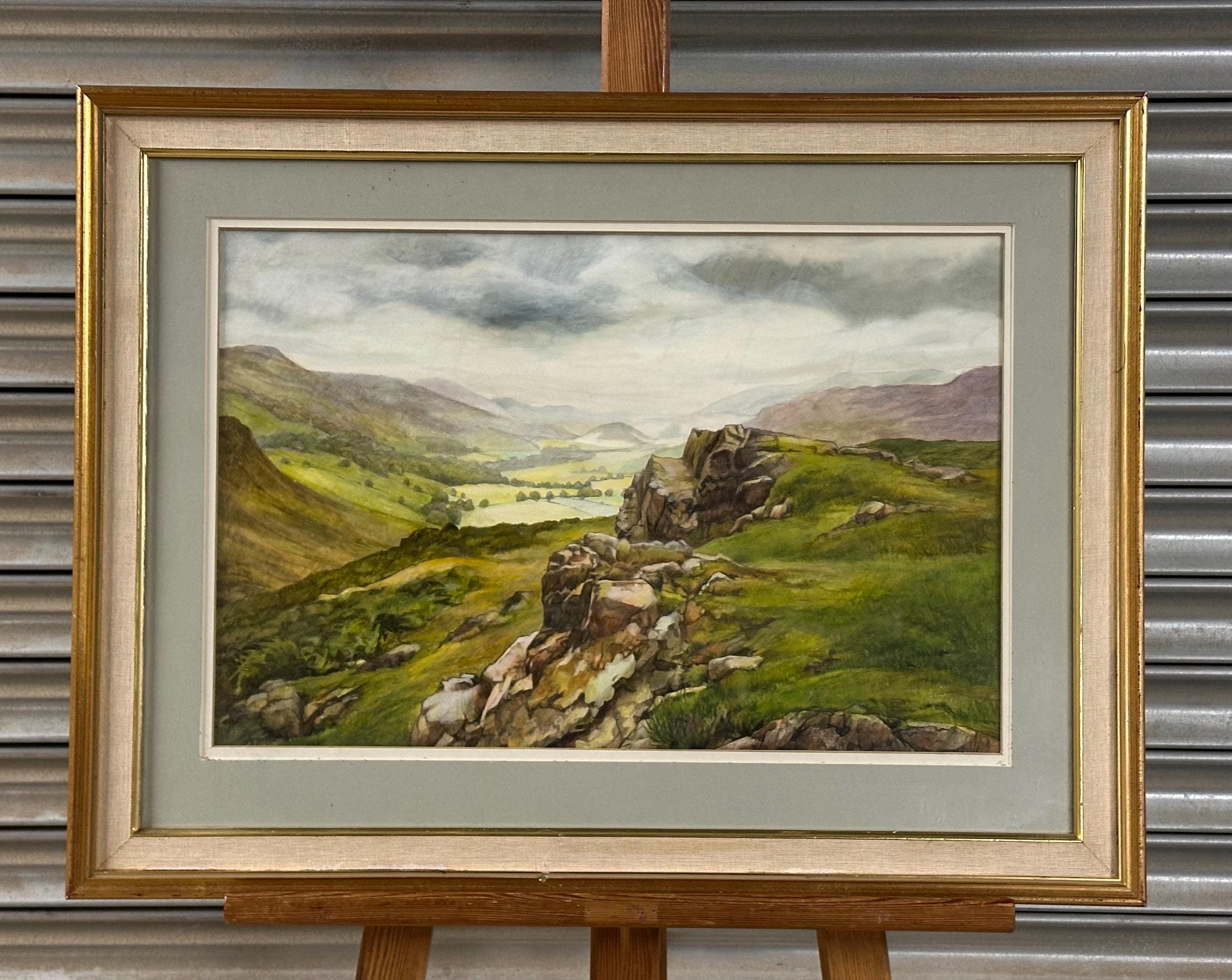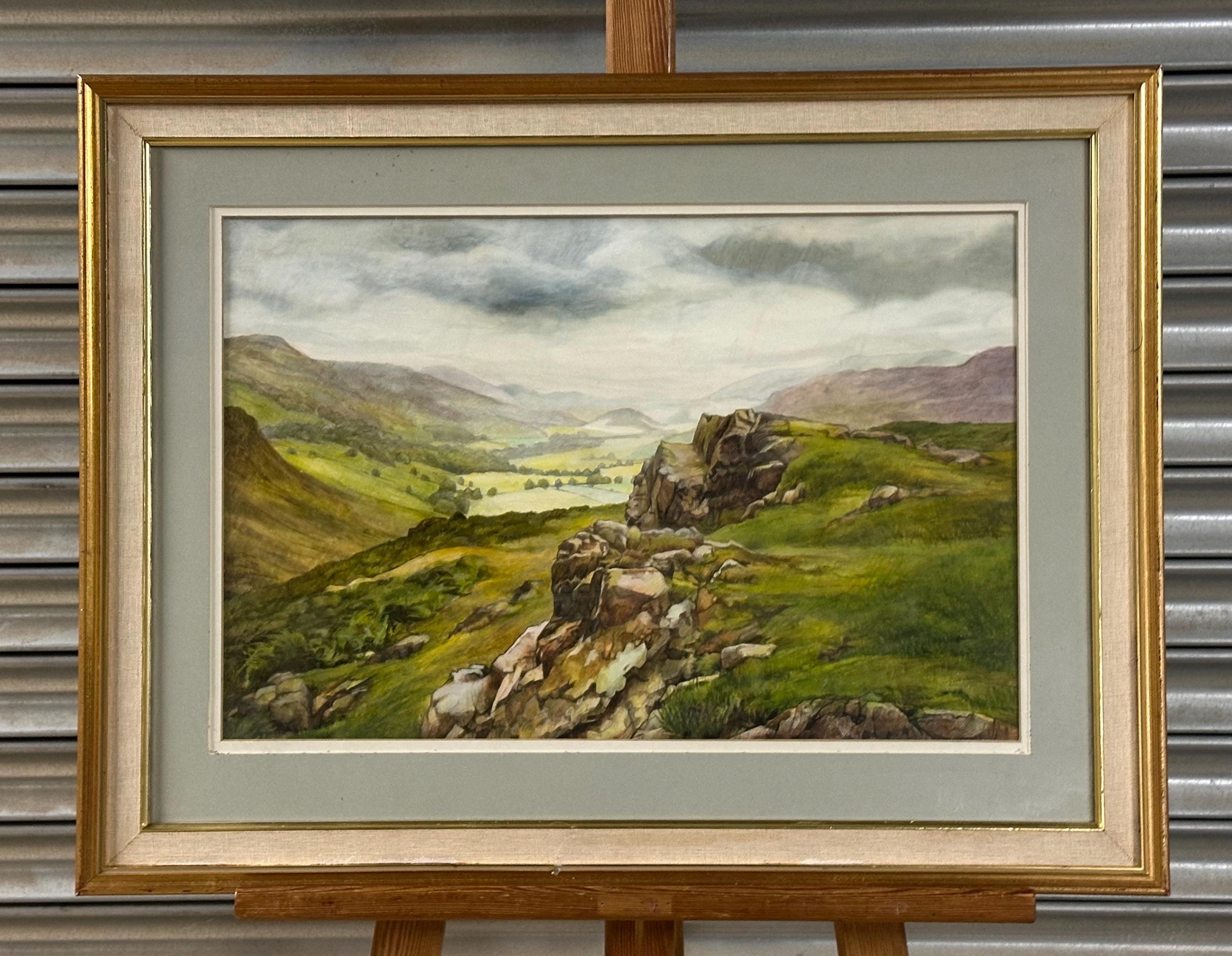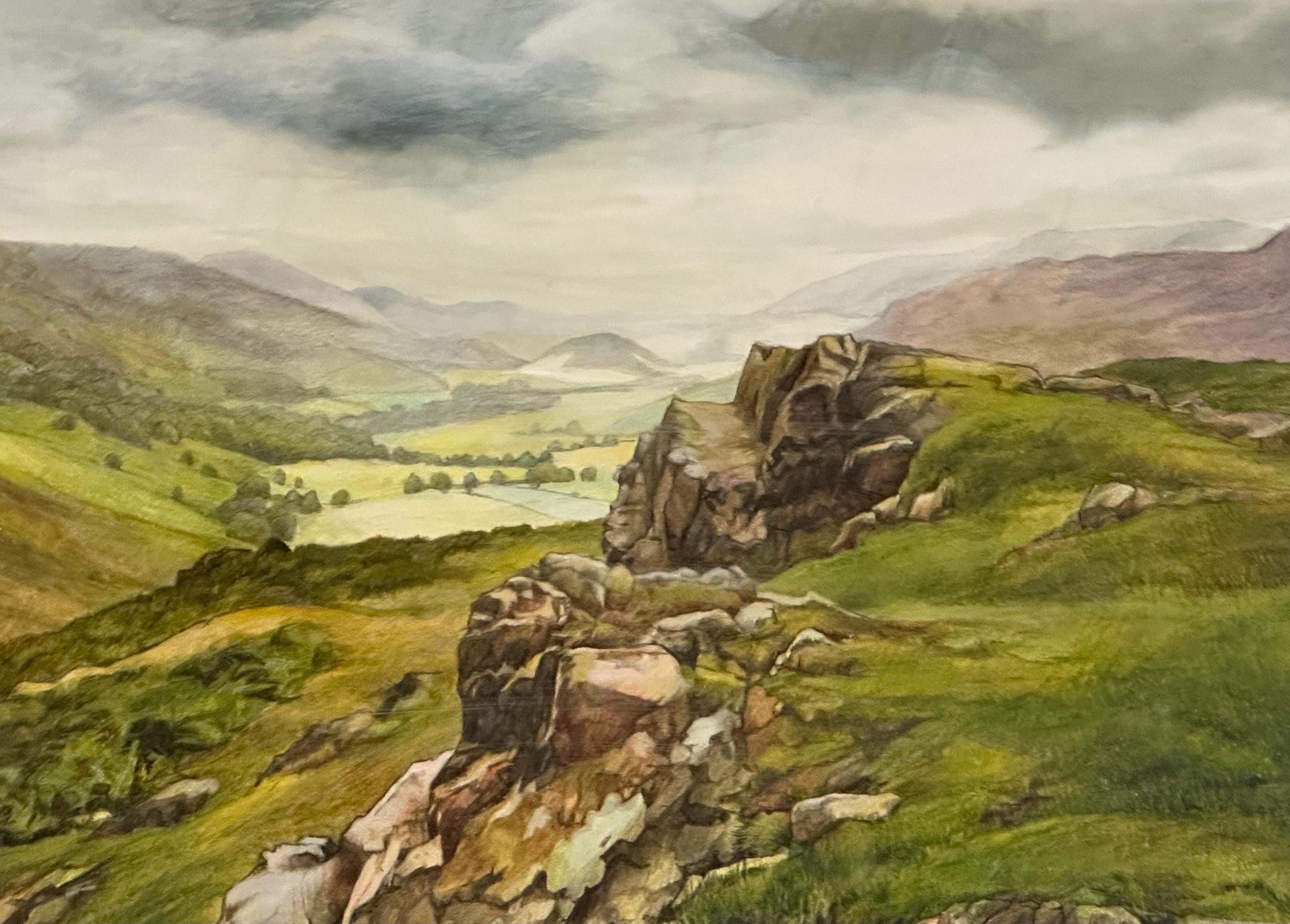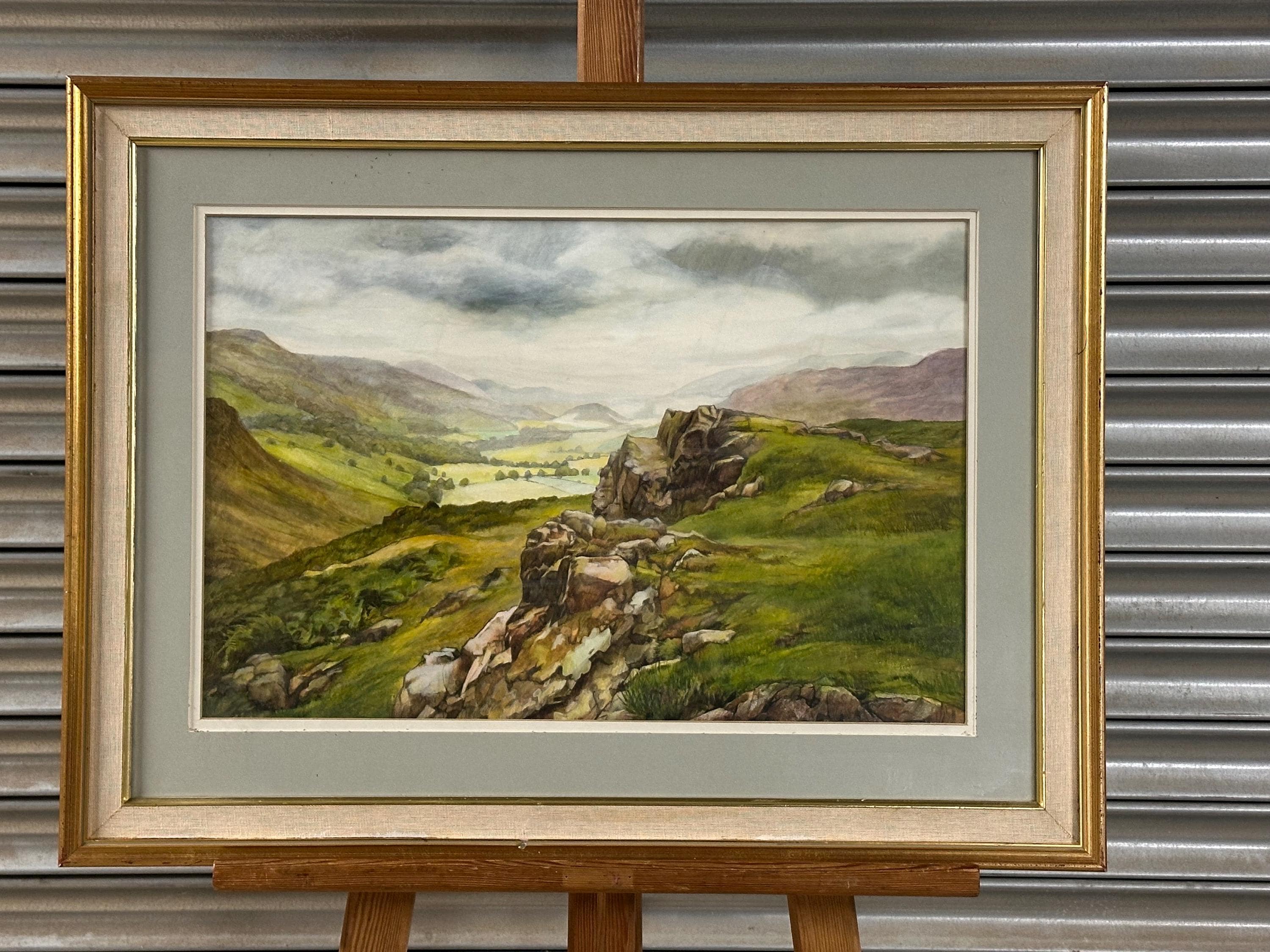 A striking original mixed-media landscape artwork by Keith Wood, titled “Eskdale from Hardknott” and dated 1981. This atmospheric piece captures the dramatic beauty of the Lake District, with sweeping valleys, rolling hills, rocky outcrops and a distant shimmering light over the landscape. The composition is rich in depth, detail and natural colour, making it a wonderful piece for collectors of British landscapes.