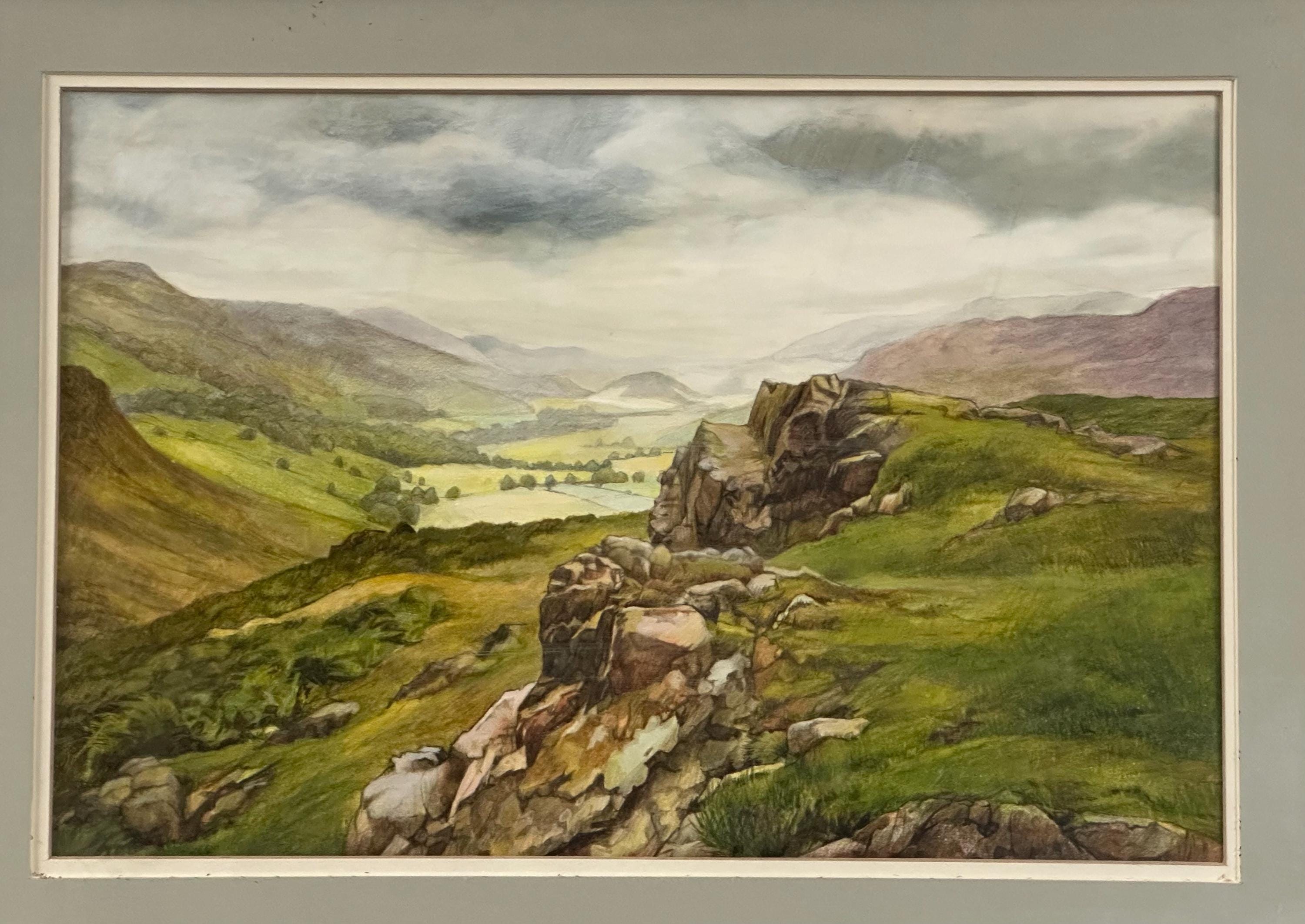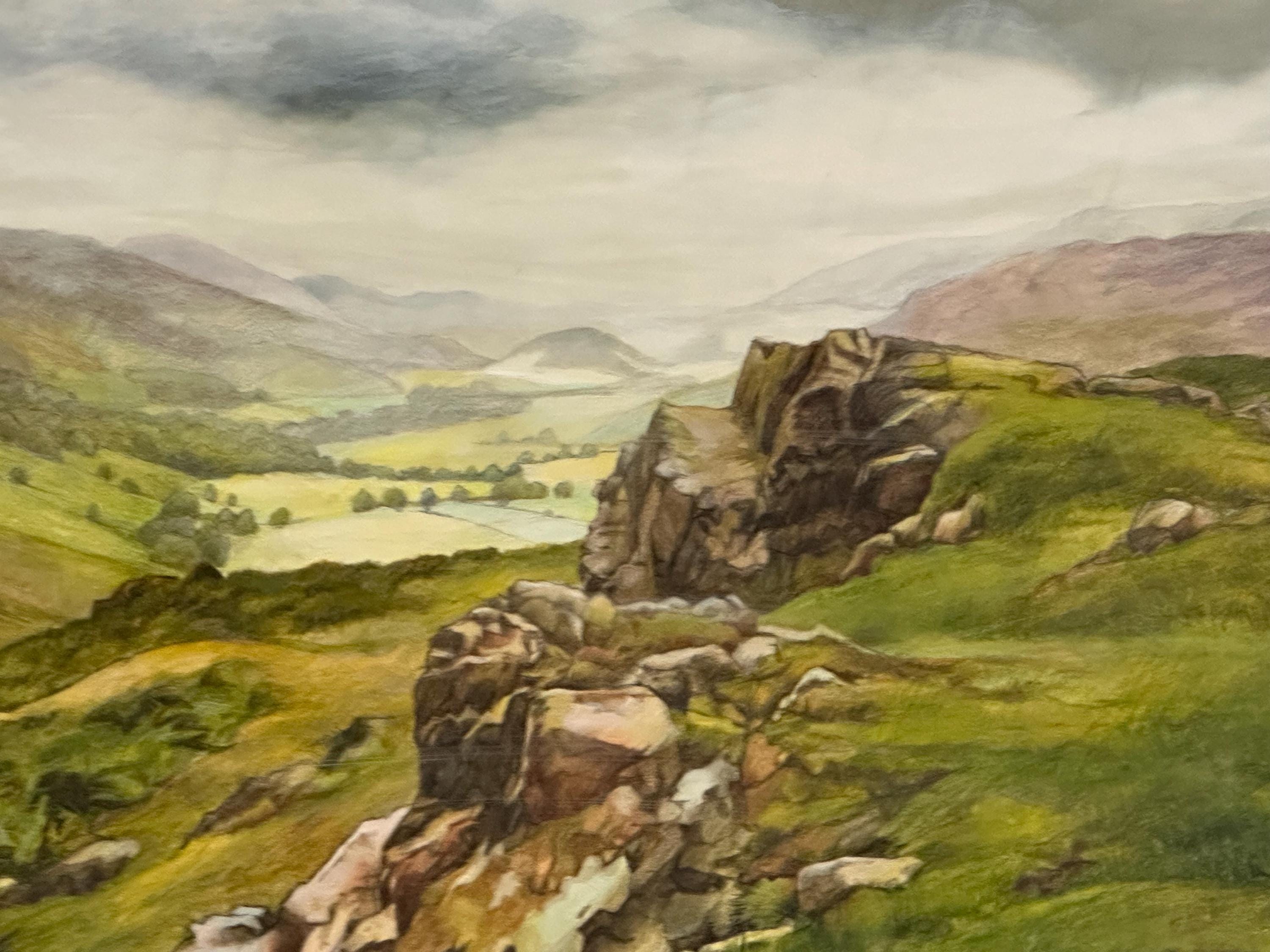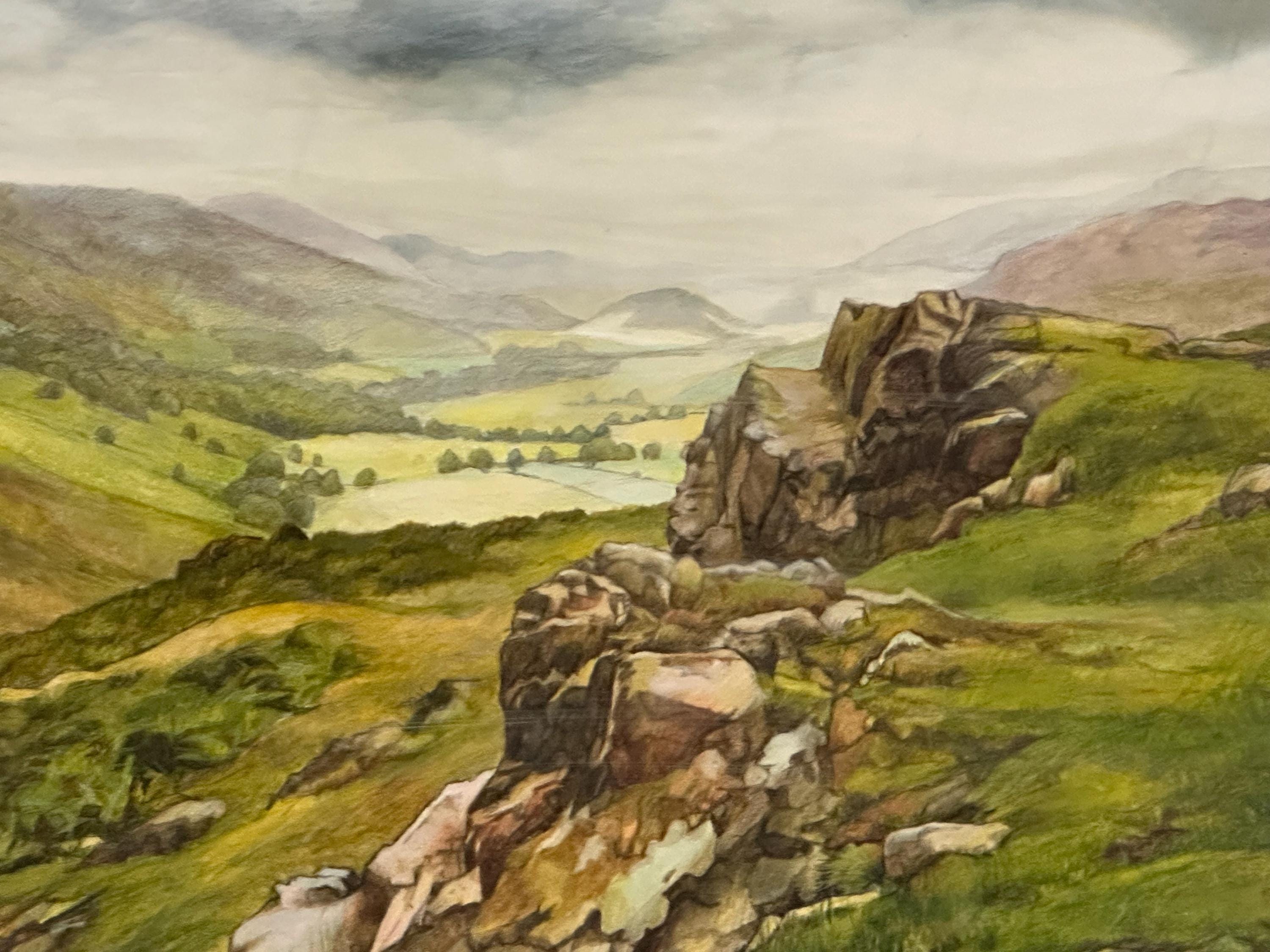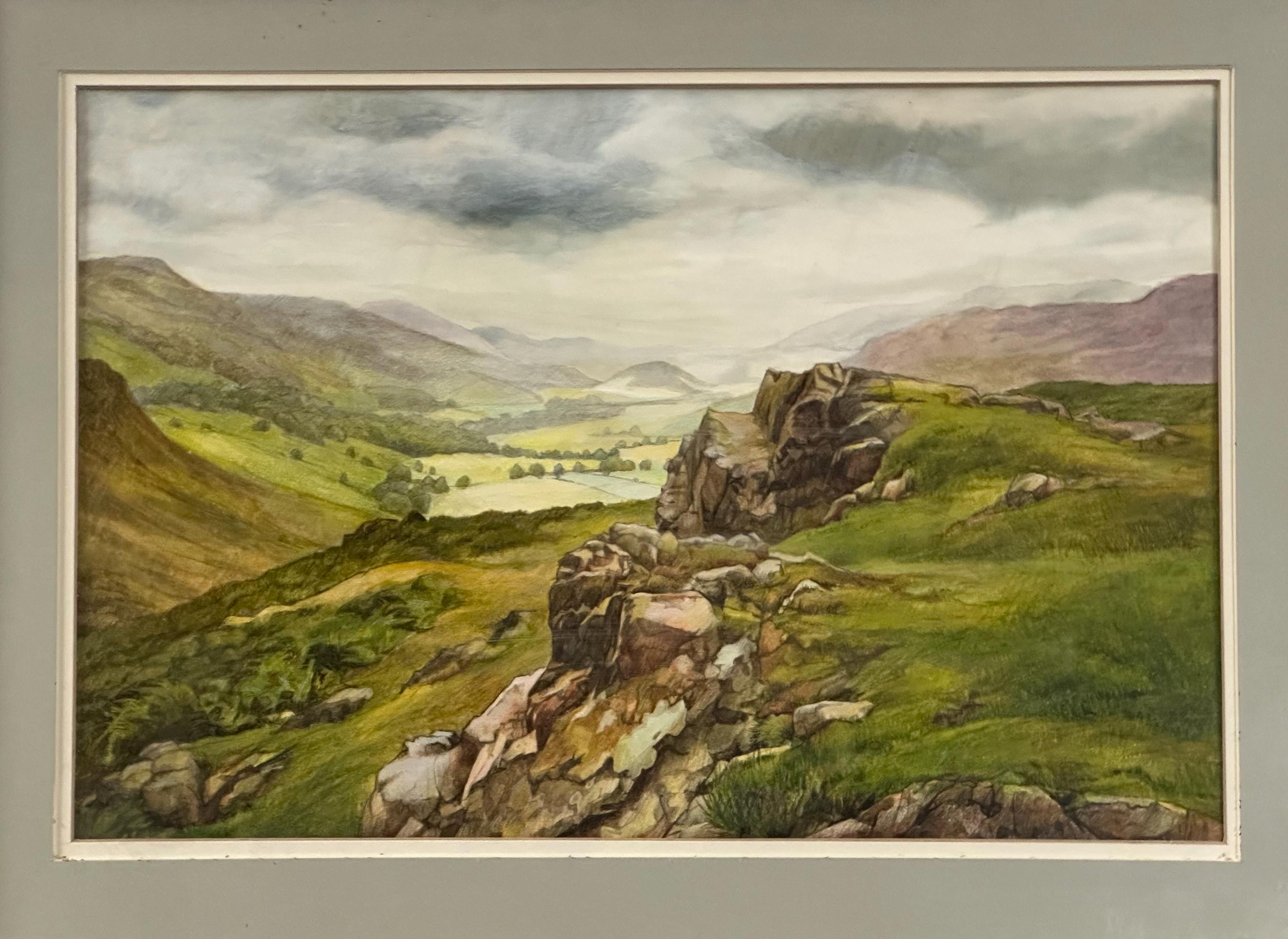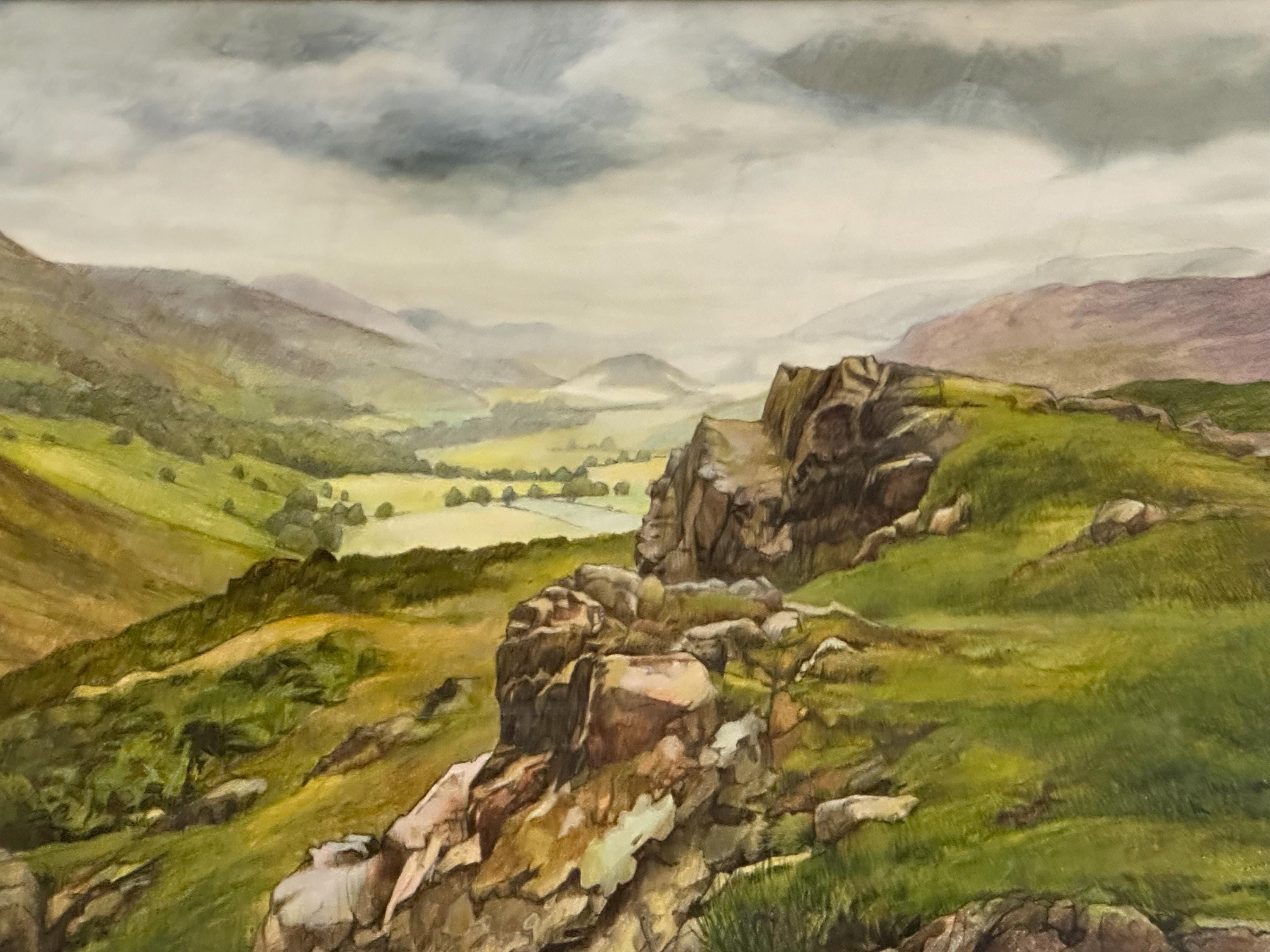 A striking original mixed-media landscape artwork by Keith Wood, titled “Eskdale from Hardknott” and dated 1981. This atmospheric piece captures the dramatic beauty of the Lake District, with sweeping valleys, rolling hills, rocky outcrops and a distant shimmering light over the landscape. The composition is rich in depth, detail and natural colour, making it a wonderful piece for collectors of British landscapes.