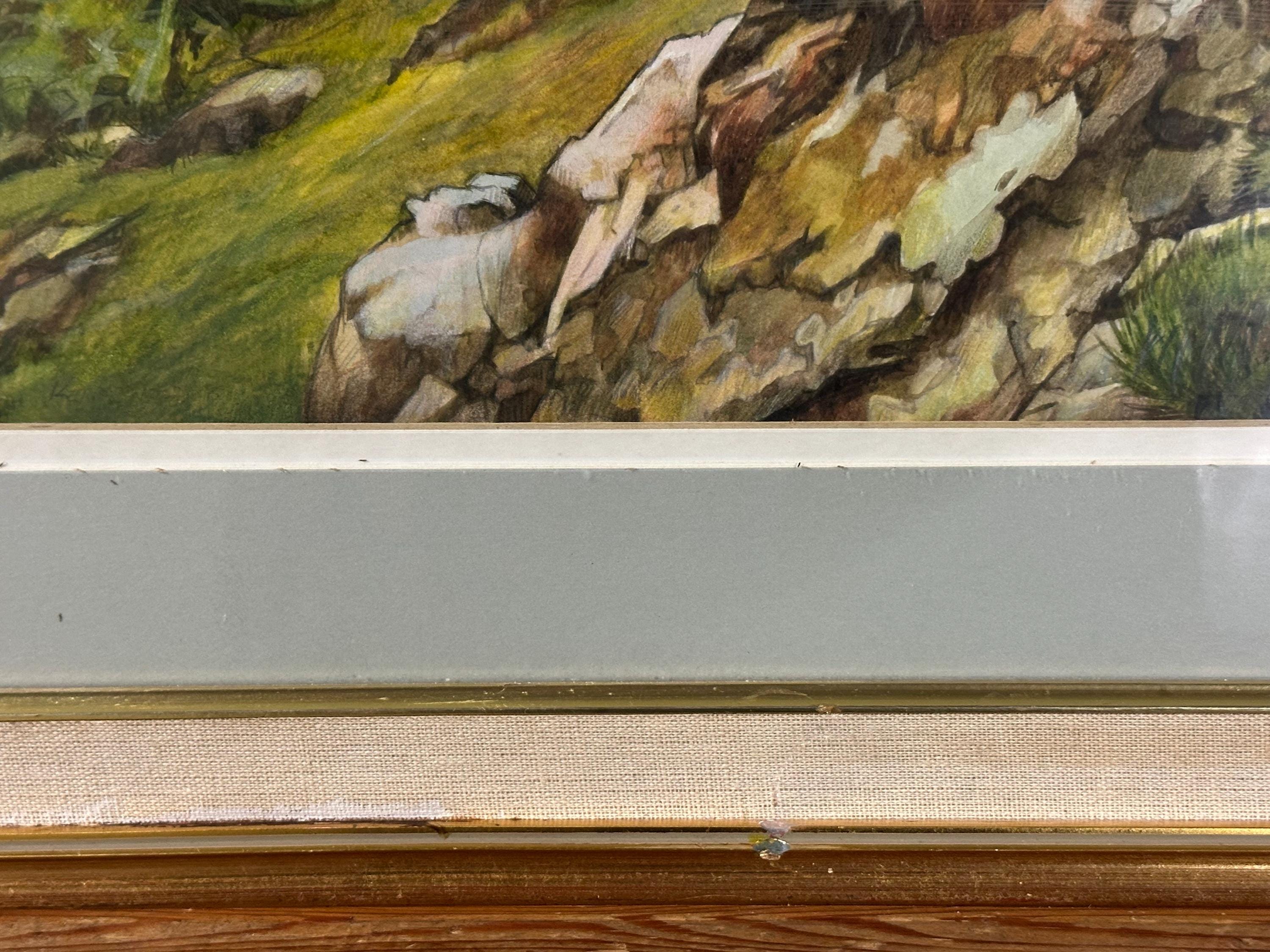 The work is executed in mixed media, giving the scene texture and softness while retaining definition in the rocky foreground. The colours remain vibrant and the overall presentation is very pleasing.