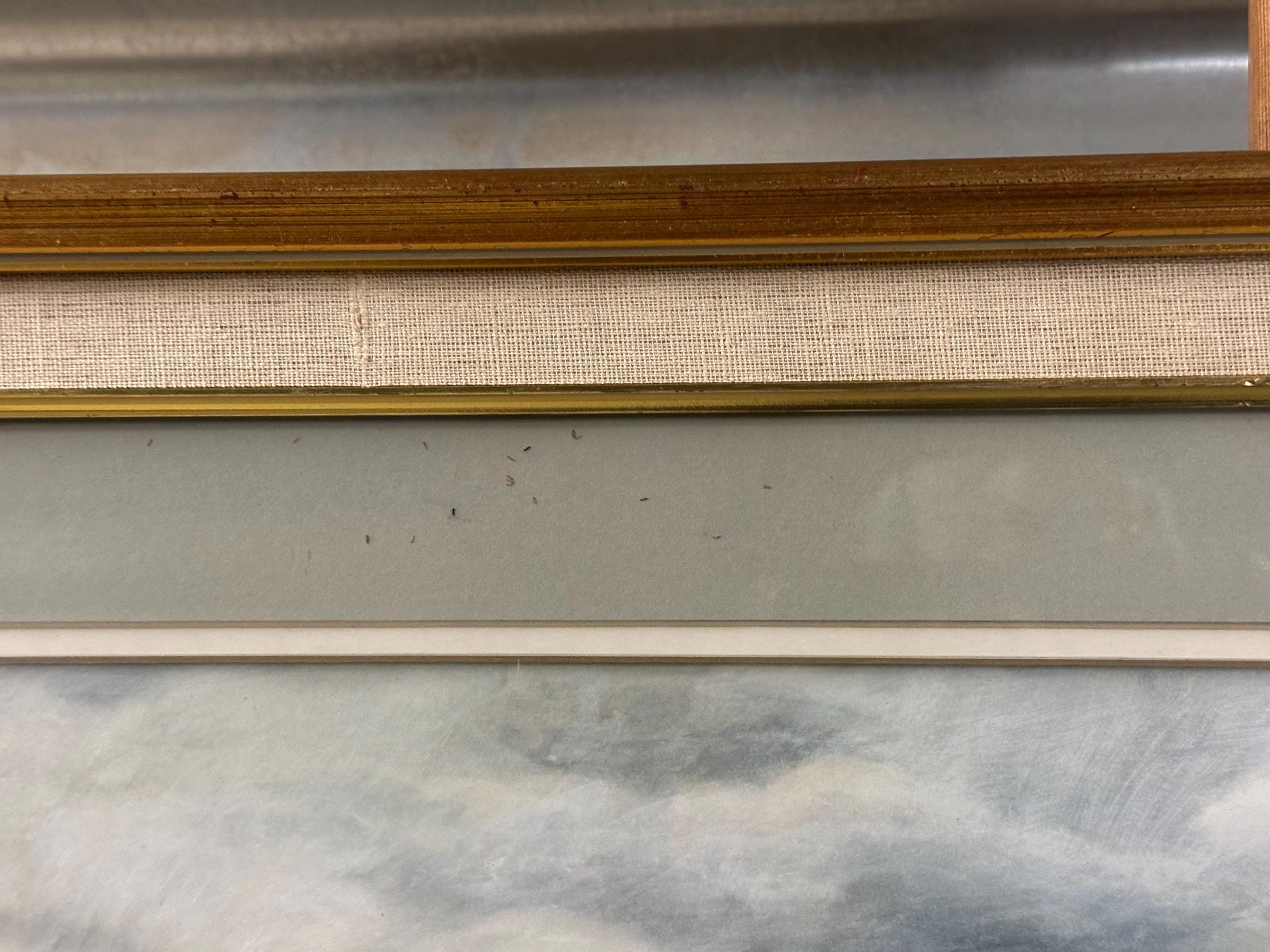 The frame measures approx 68 x 52cm. There are marks and loss to frame and thunderflies under the glass, which is quite common with vintage artwork. In my opinion it would benefit from being reframed.