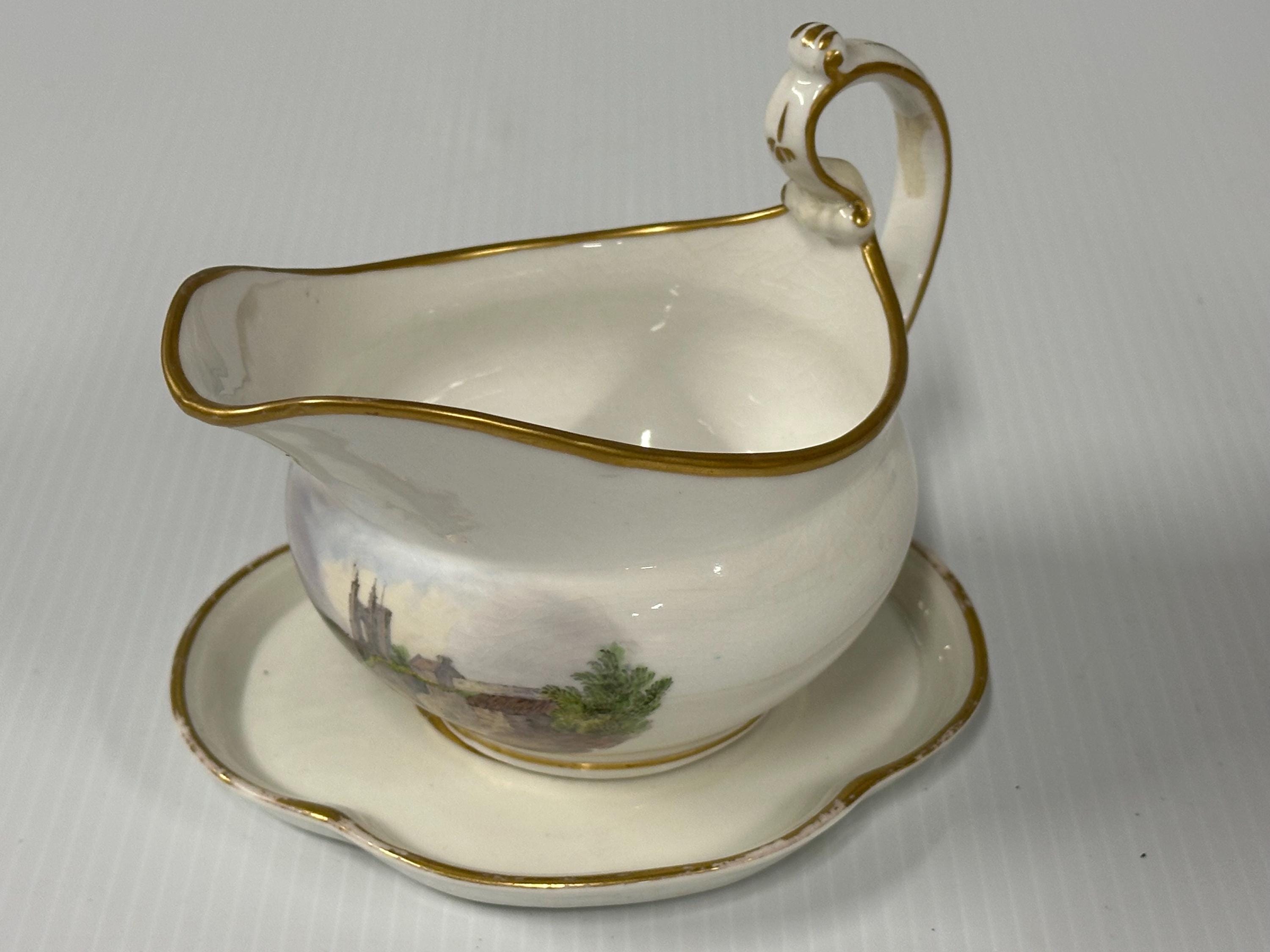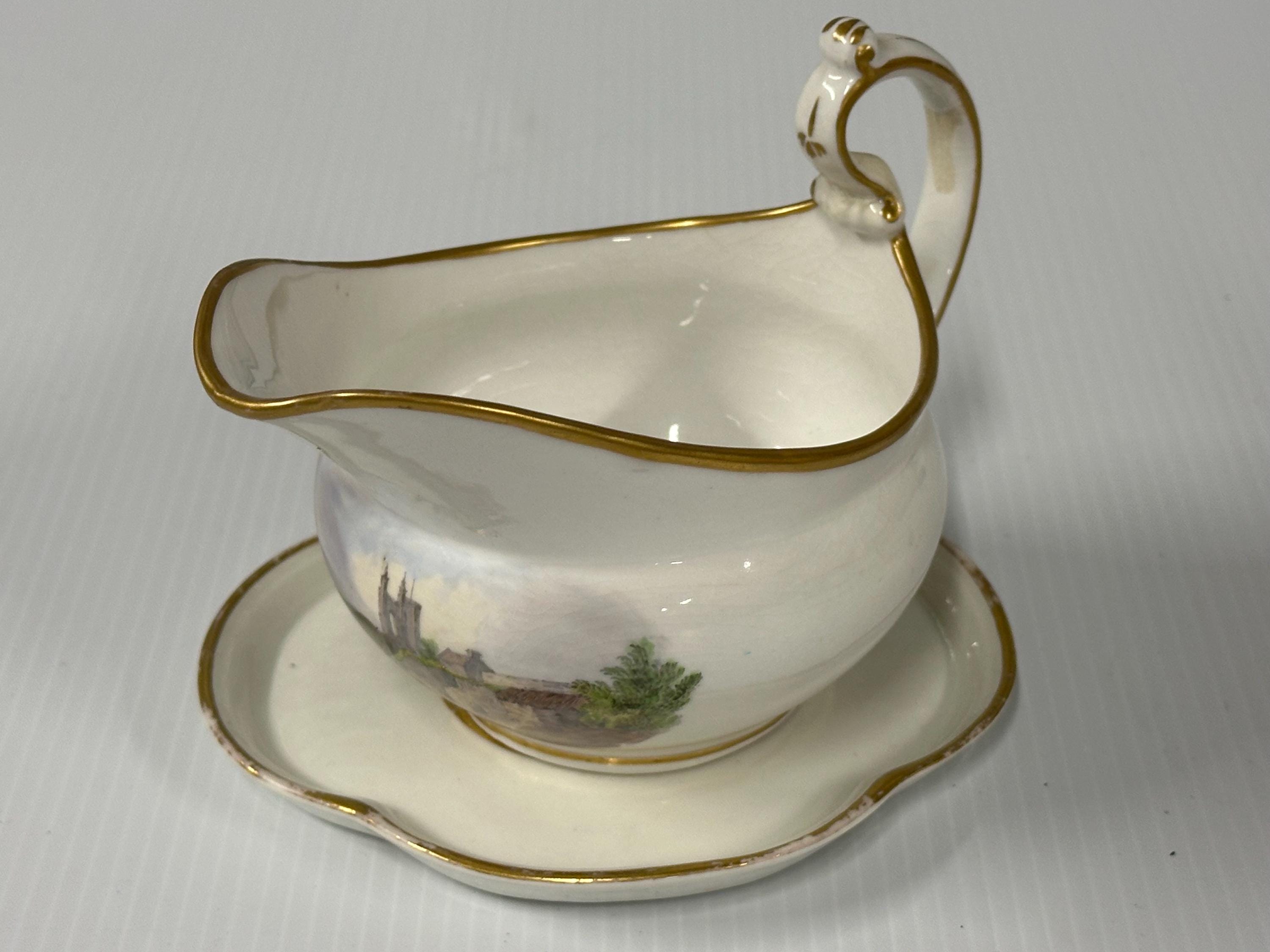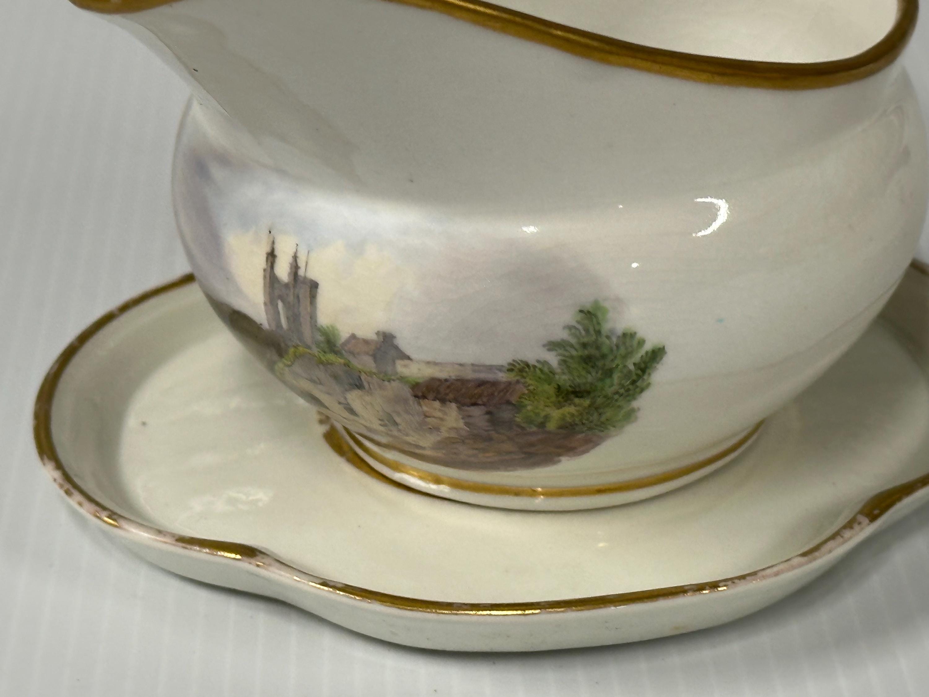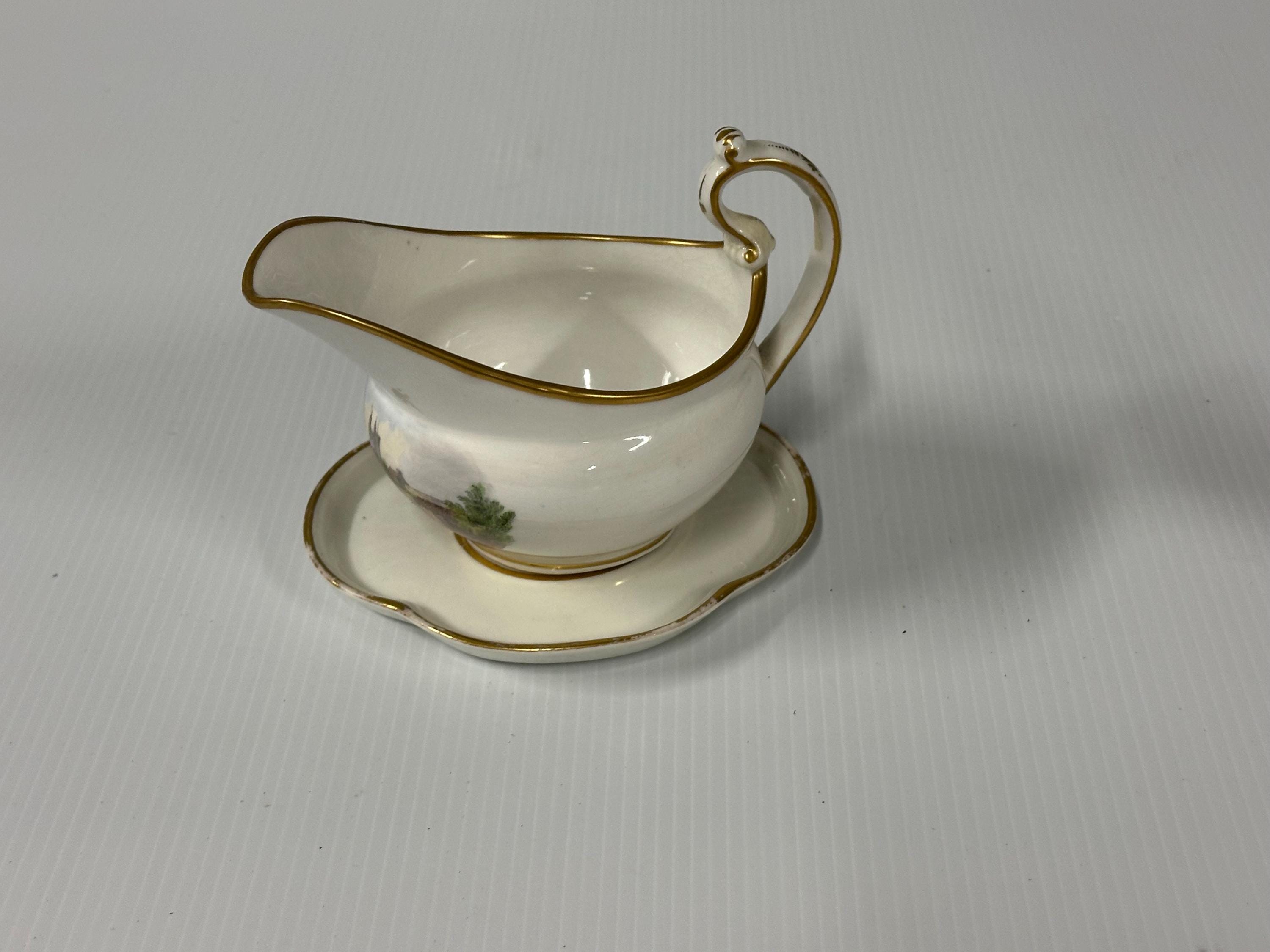 Antique New Hall Porcelain Gravy Boat with Underplate – Hand-Painted Landscape & Gilt Trim