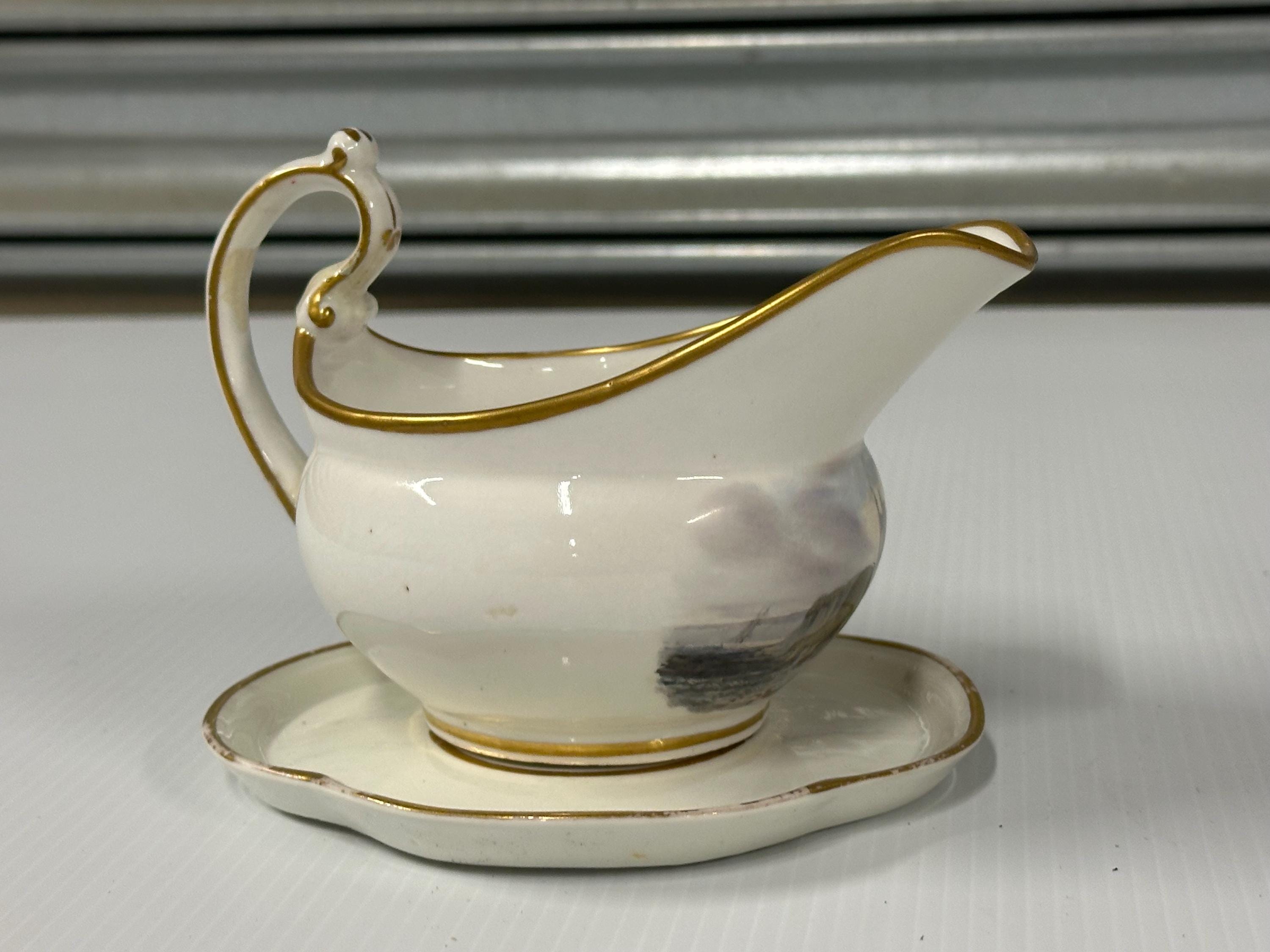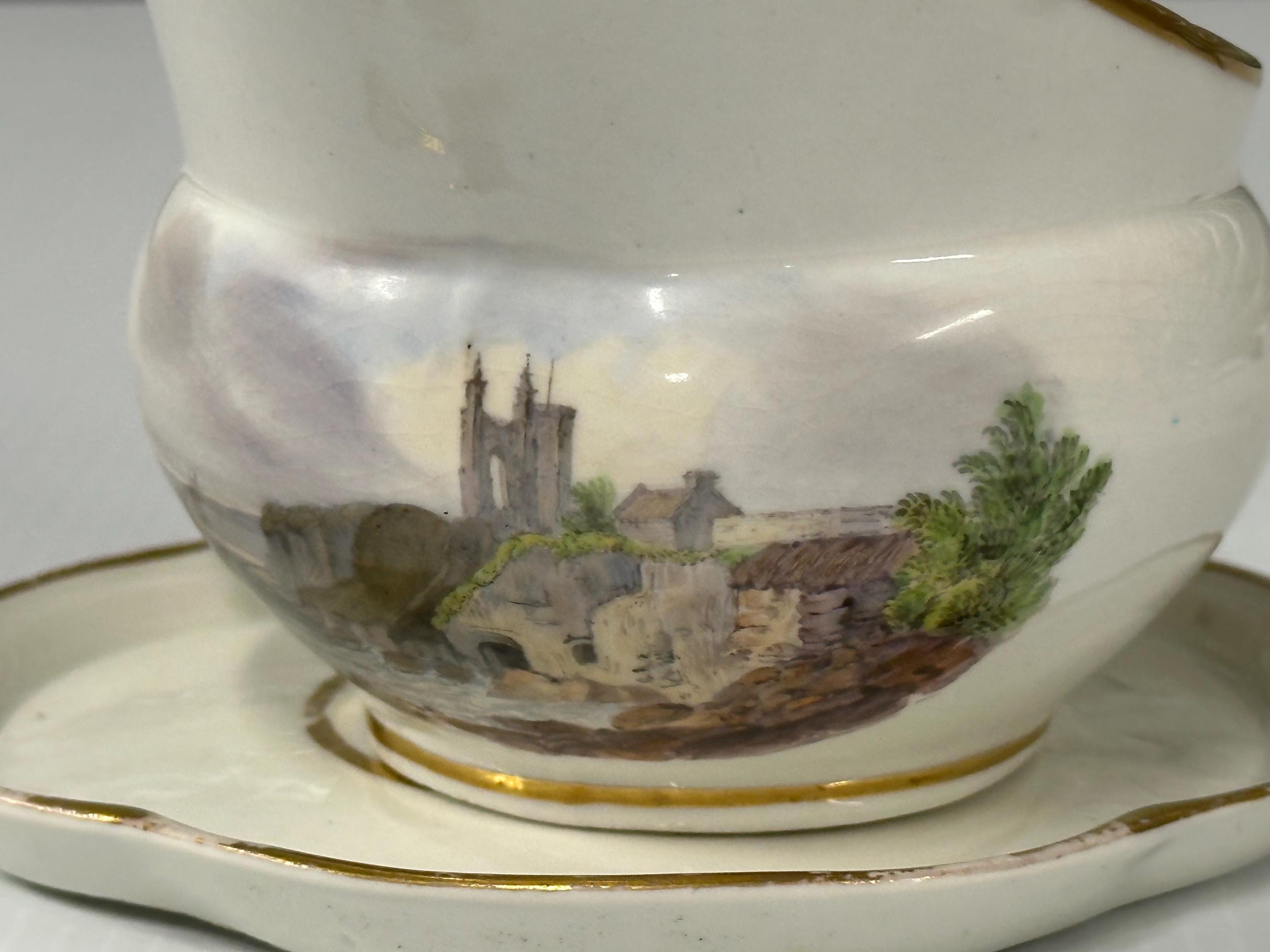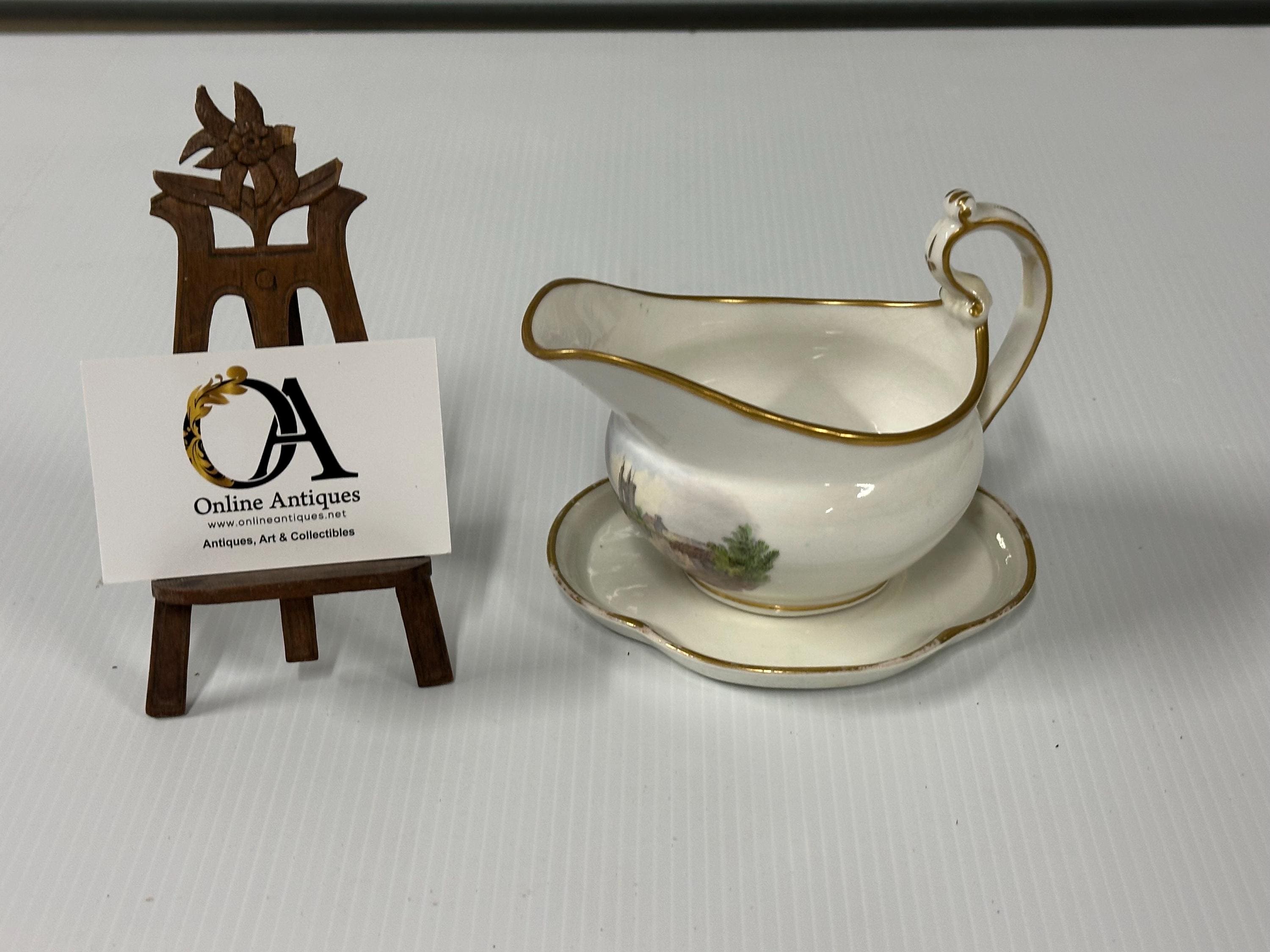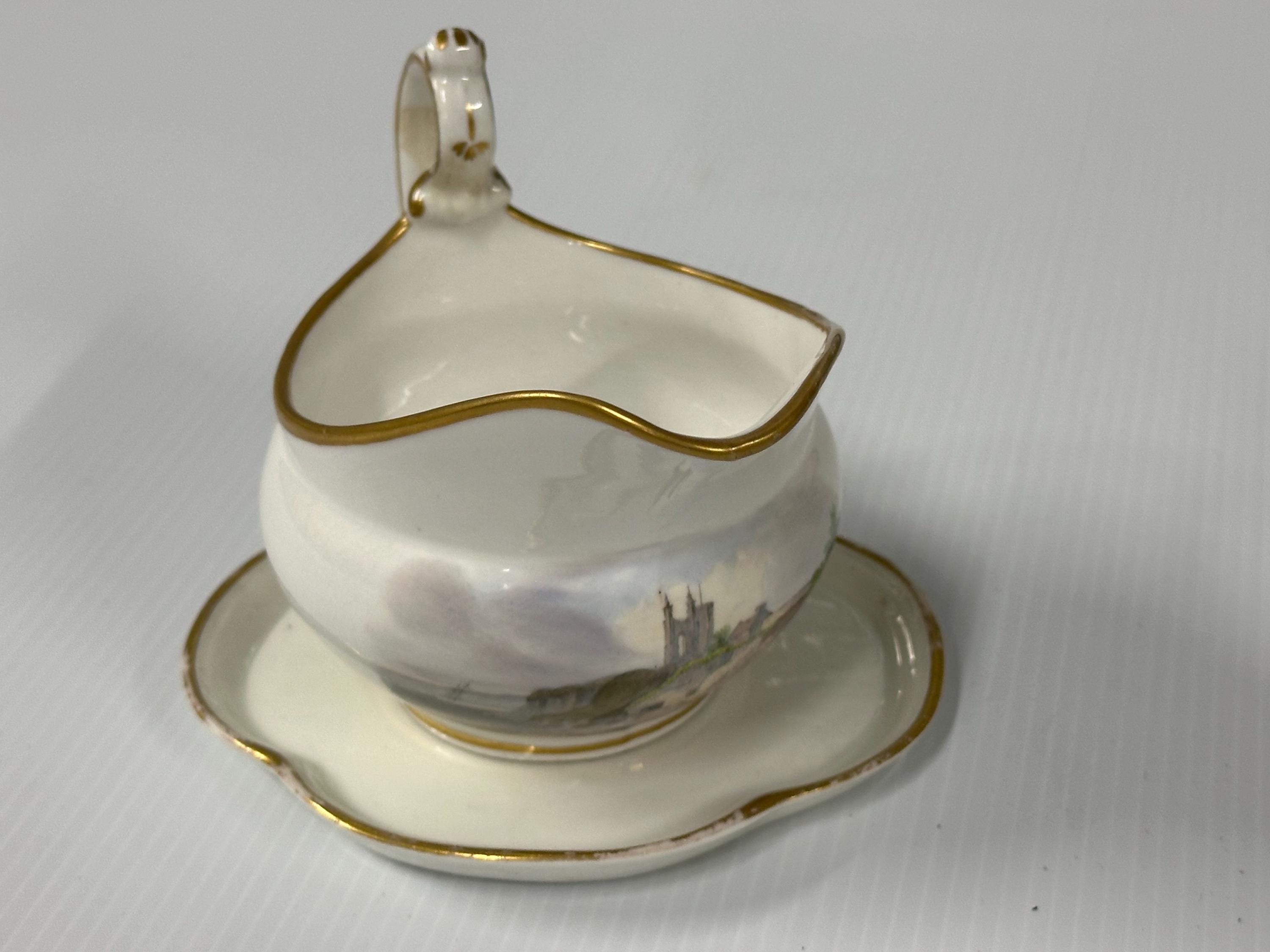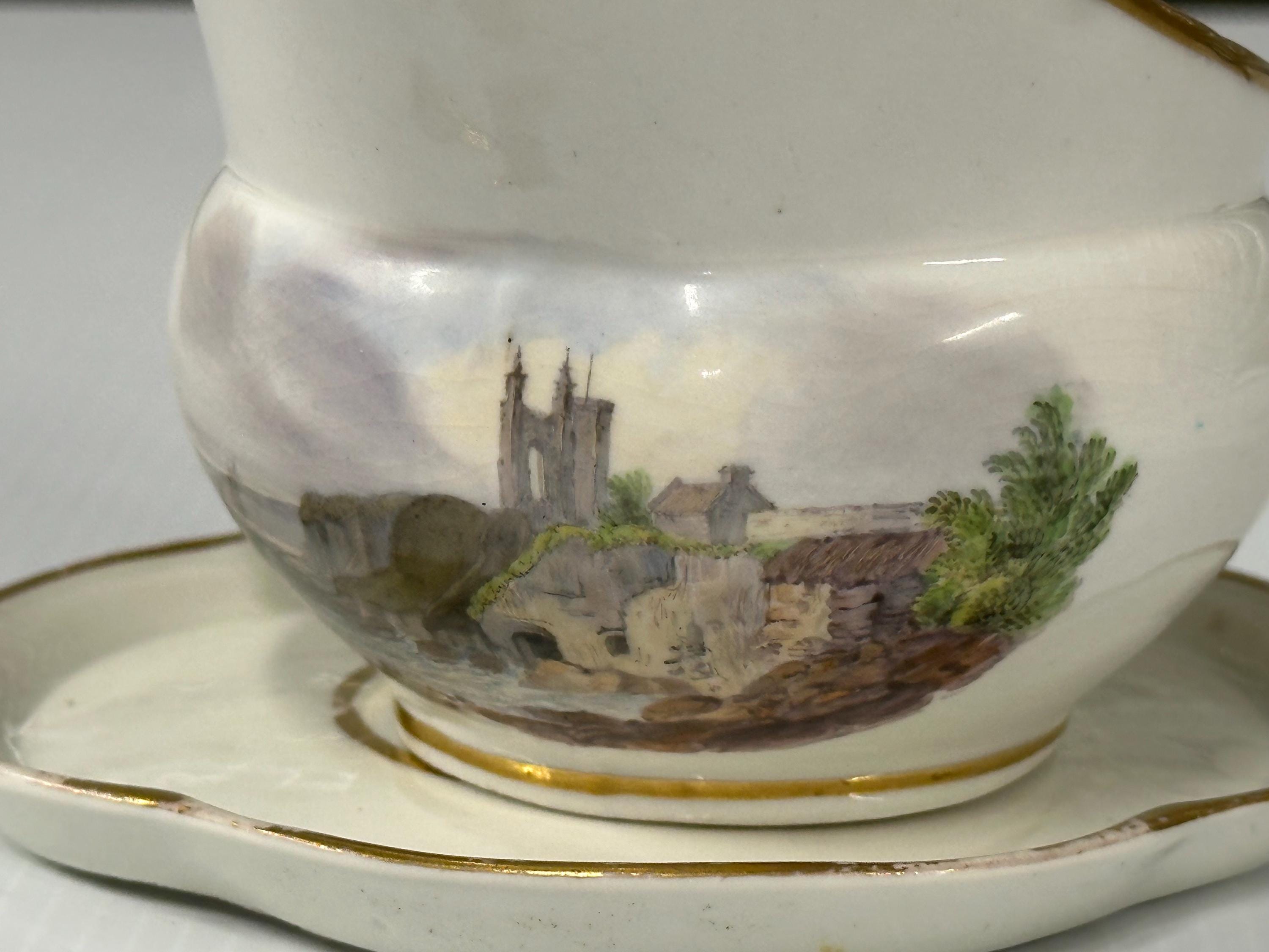Antique New Hall Porcelain Gravy Boat with Underplate – Hand-Painted Landscape & Gilt Trim