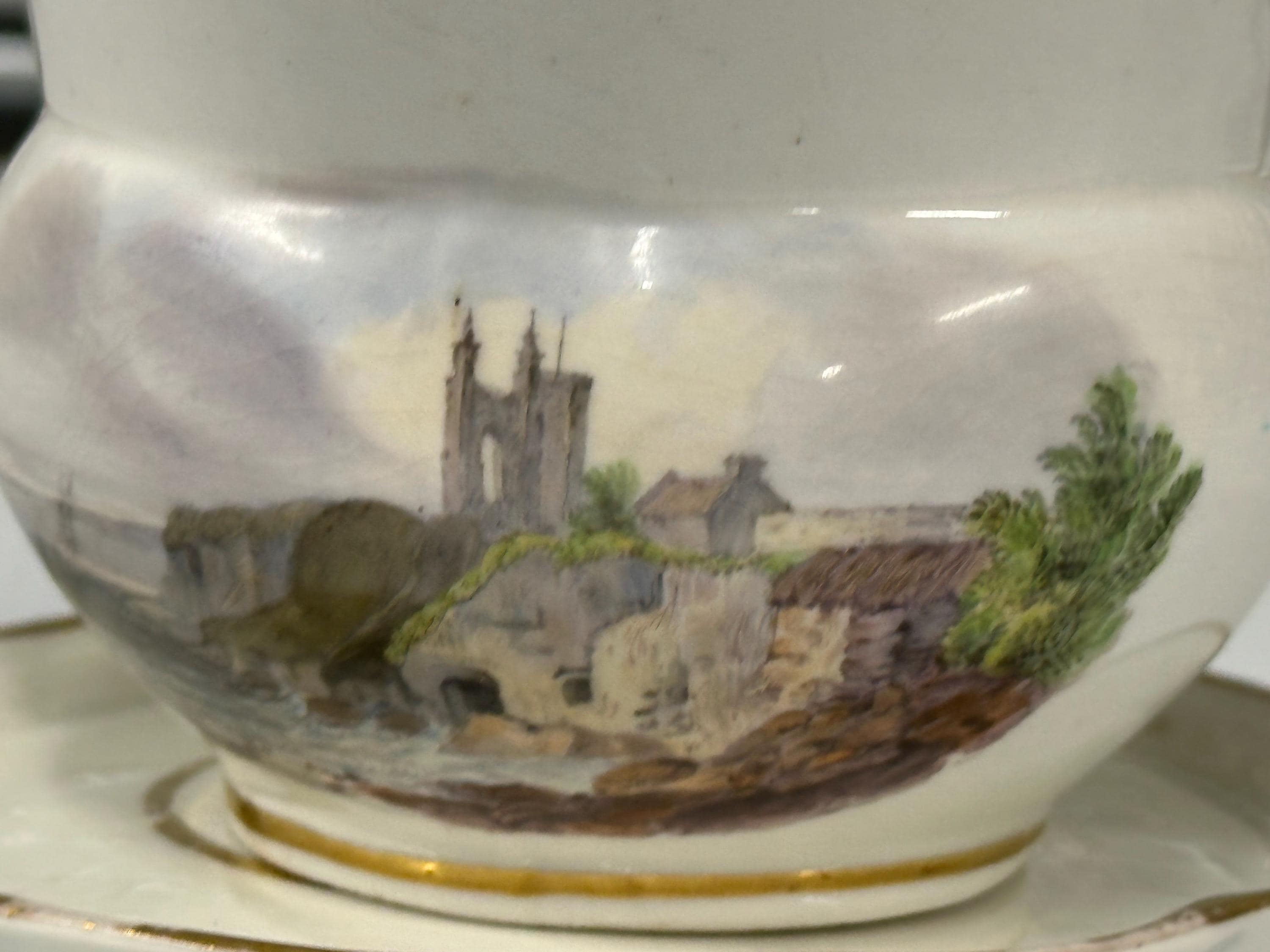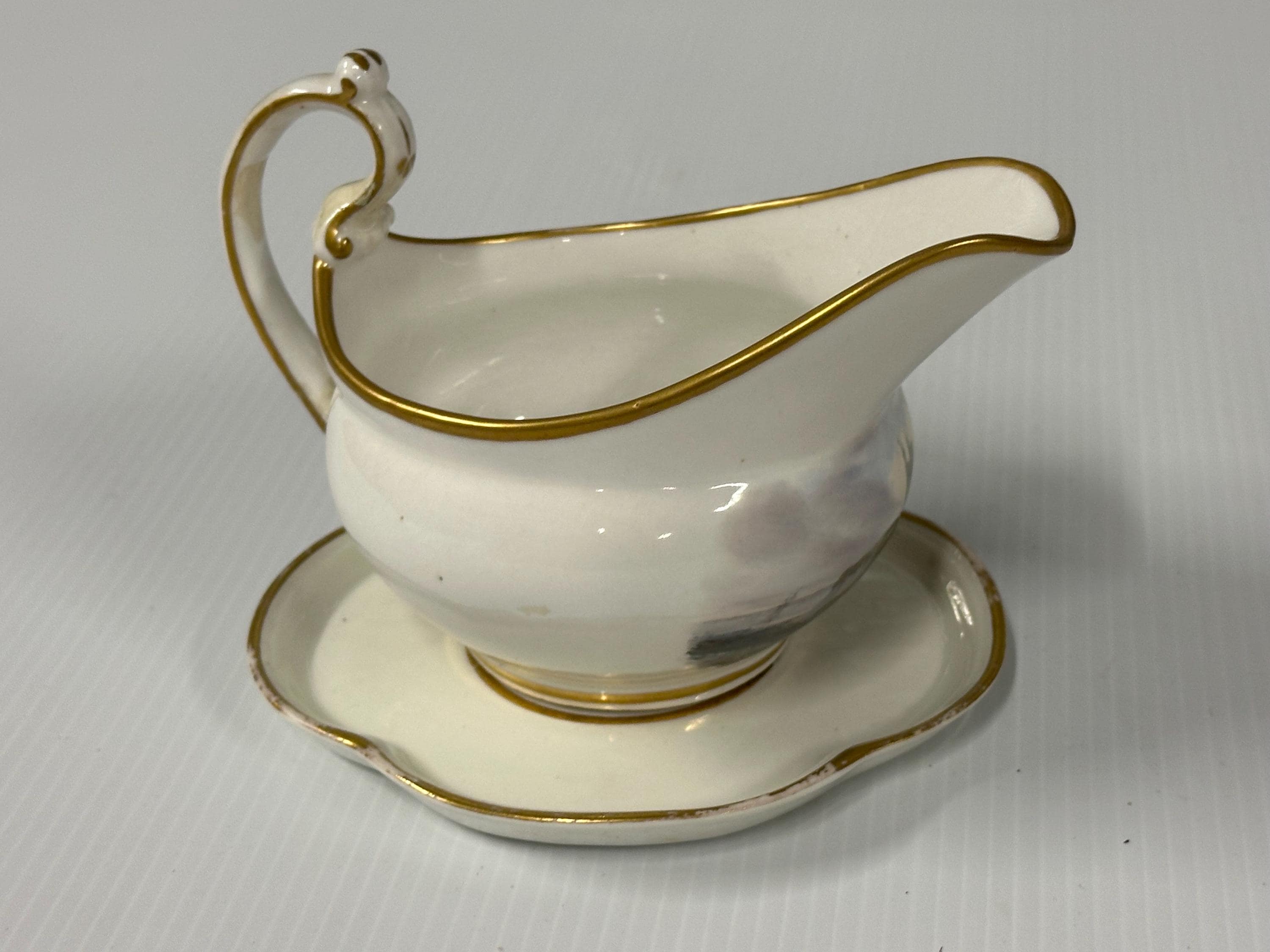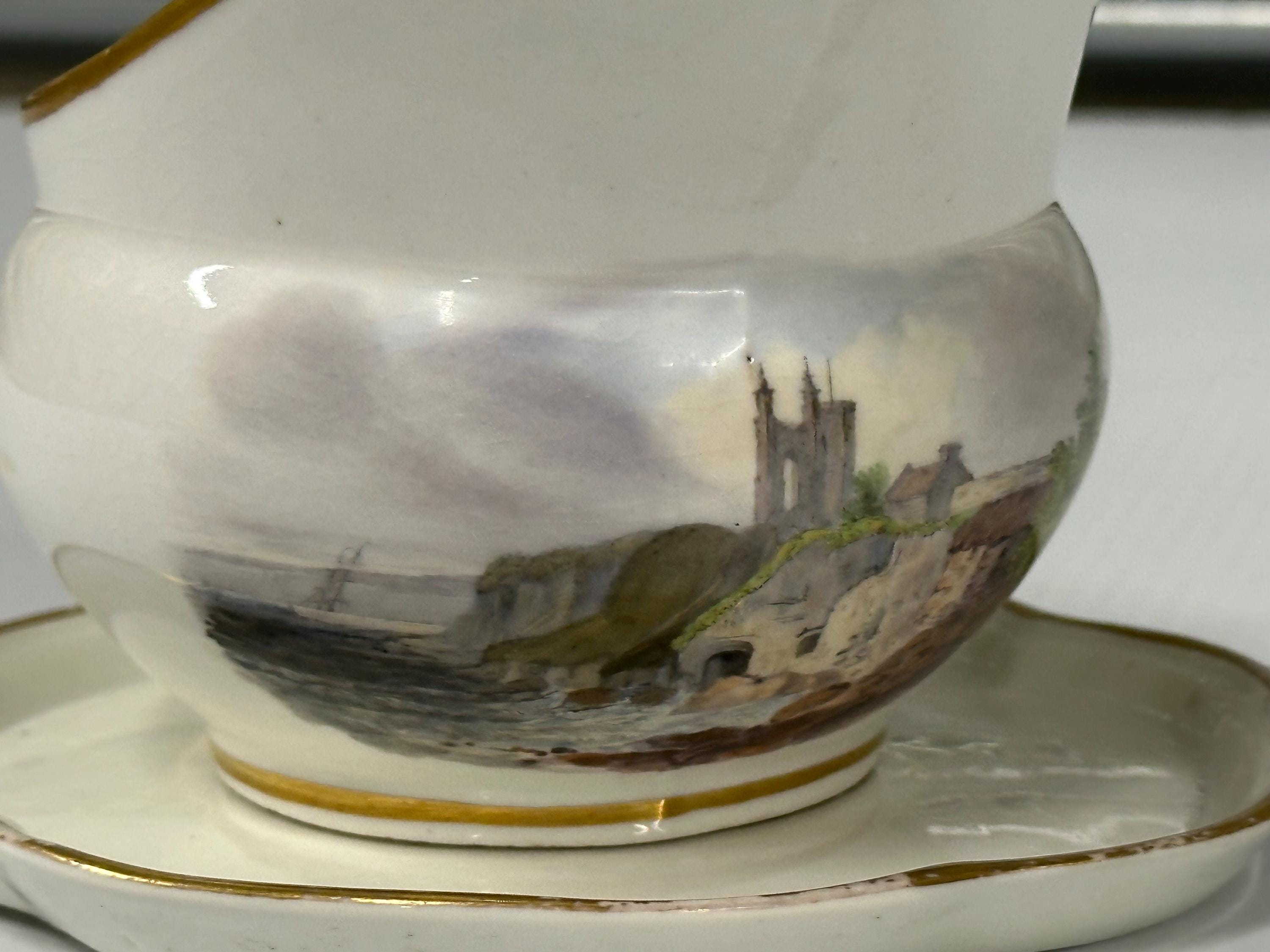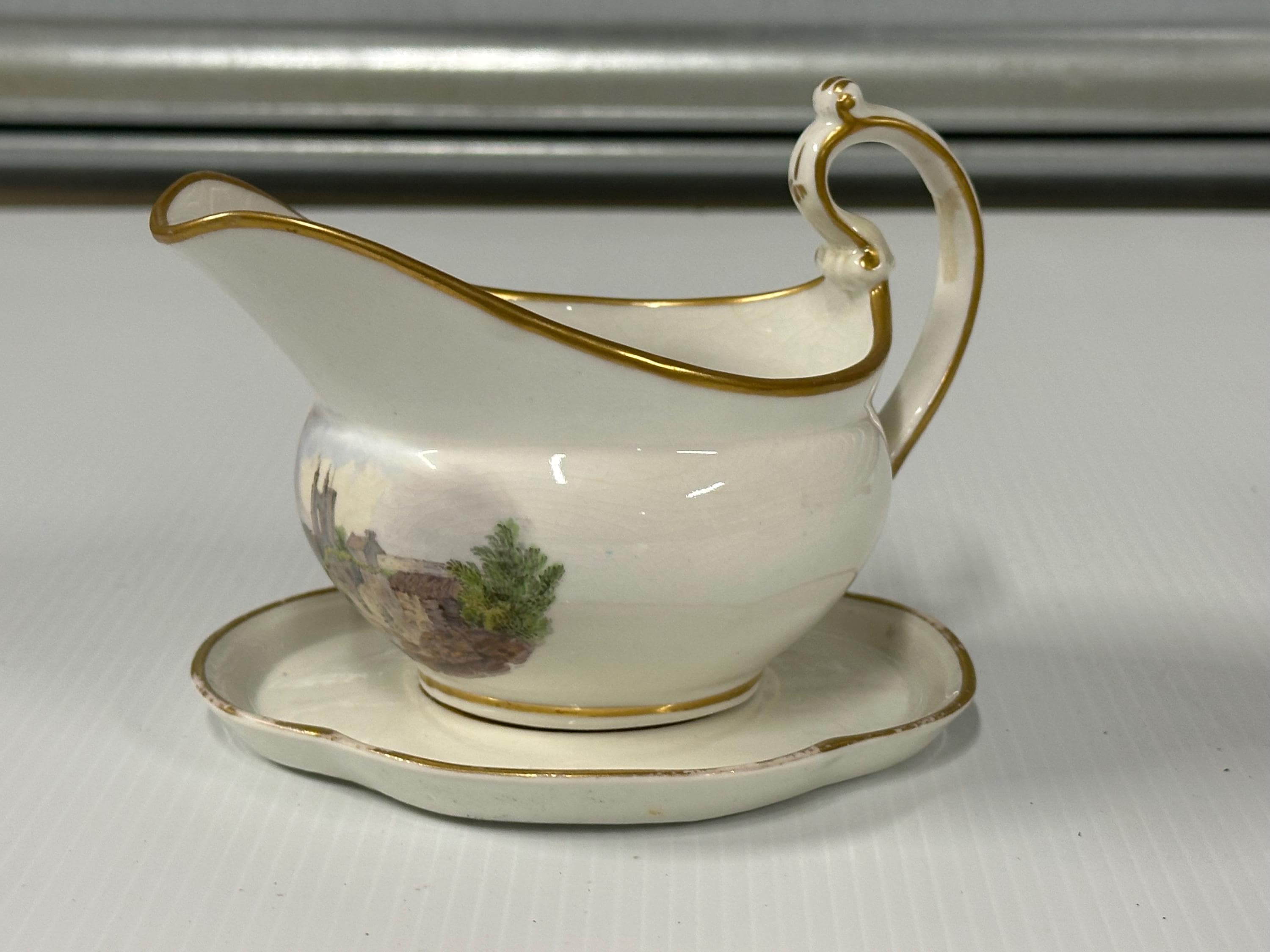 Antique New Hall Porcelain Gravy Boat with Underplate – Hand-Painted Landscape & Gilt Trim