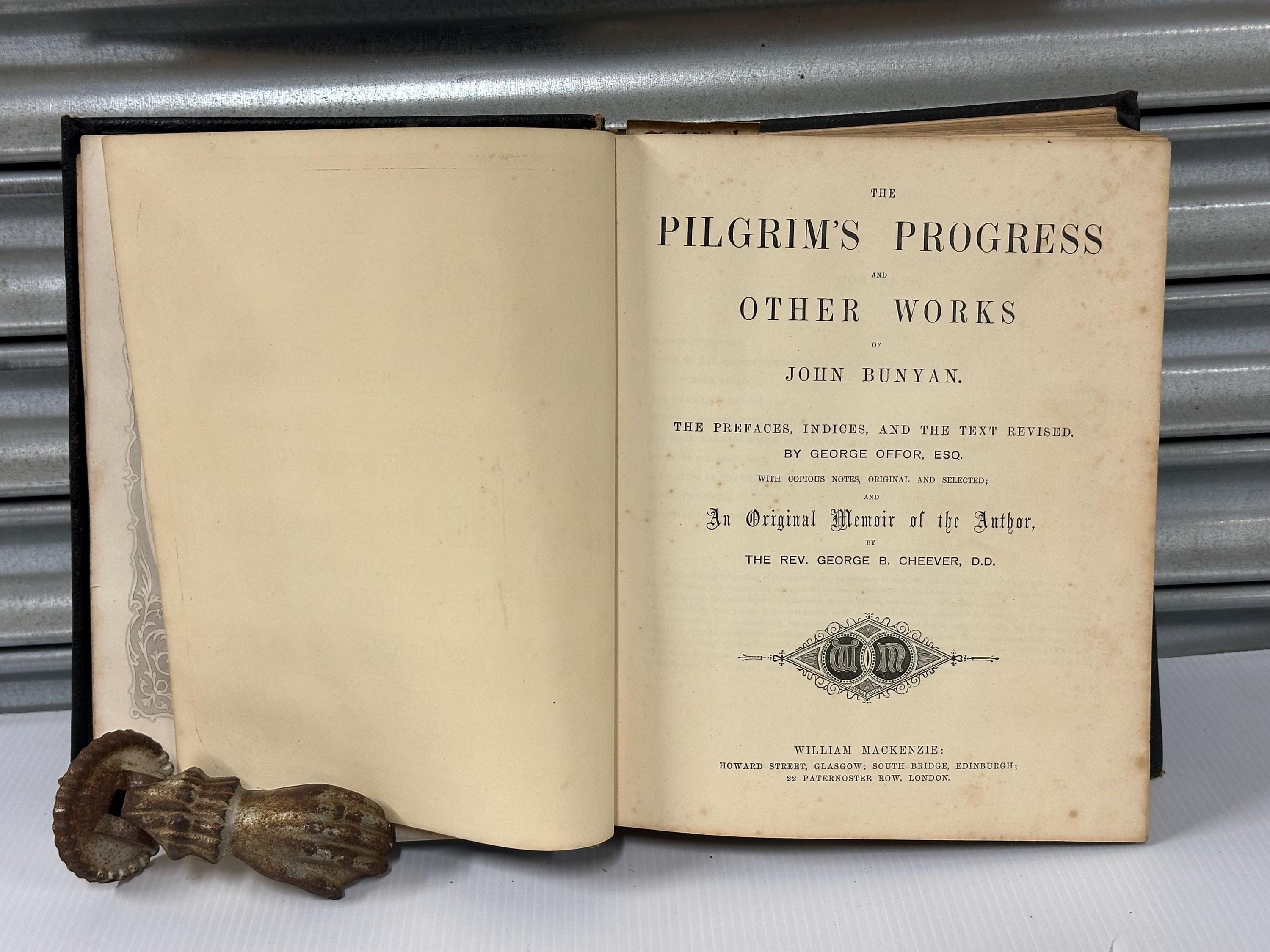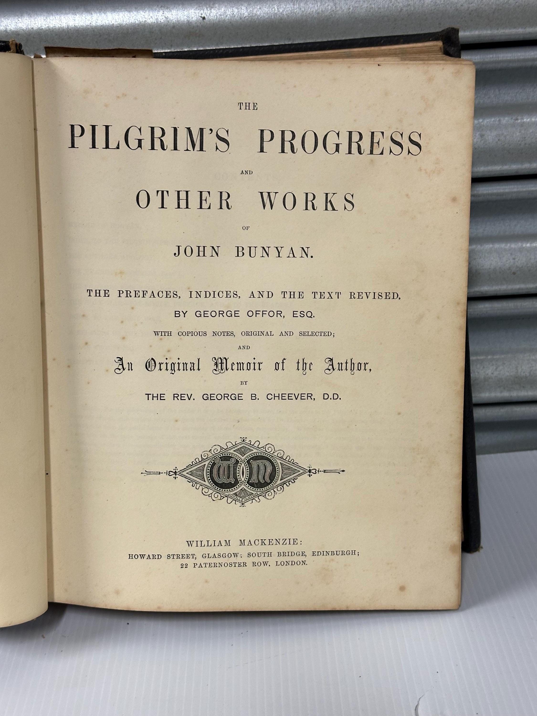 A beautiful and substantial antique volume of The Pilgrim’s Progress & Other Works by John Bunyan, published by William Mackenzie (Glasgow, London and Edinburgh). This impressive Victorian edition includes an original memoir by Rev. George B. Cheever, D.D. and features richly decorated title pages and high-quality illustrations throughout.