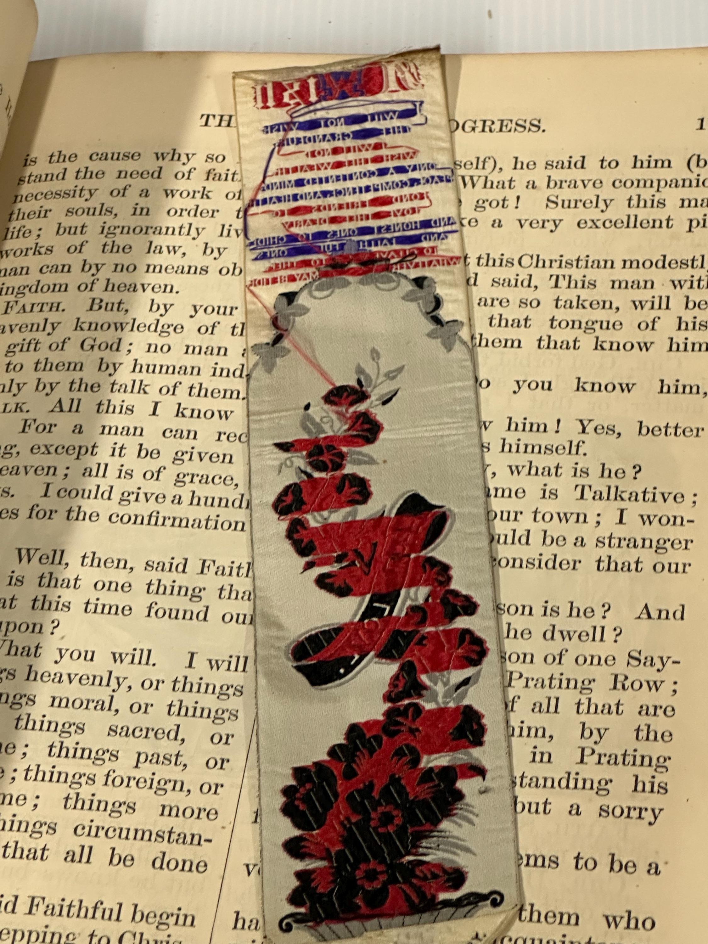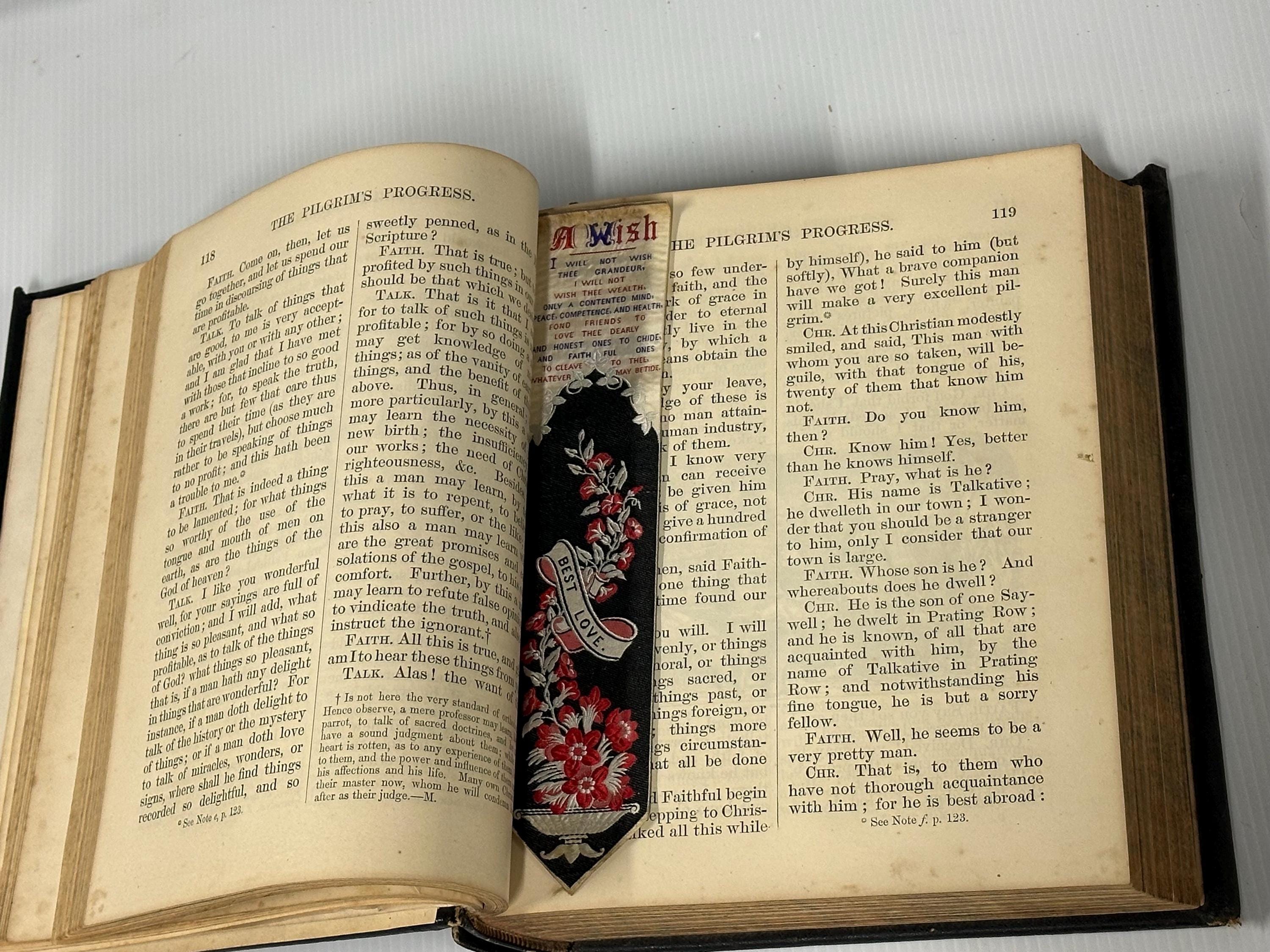 19th Century John Bunyan Leather Bound Book Published By William MacKenzie with handmade embroidered book mark
