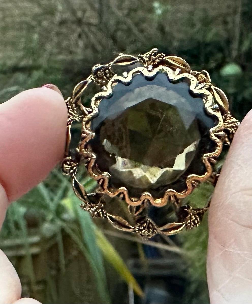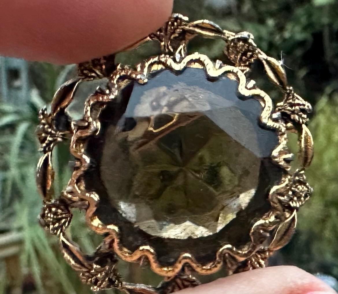 Stunning Vintage Gold-Tone Floral Brooch with Large Faceted Smoky Quartz Glass Stone
