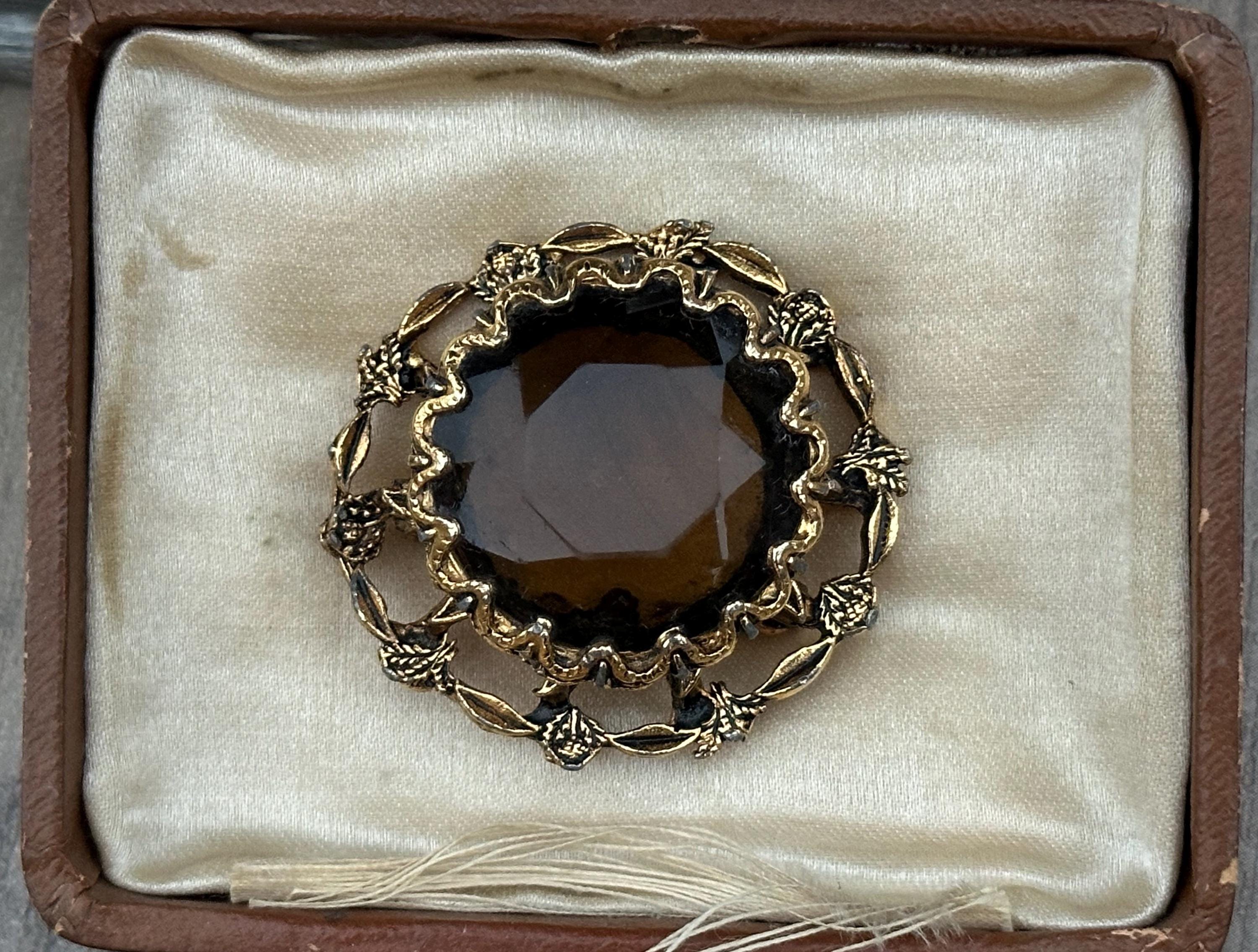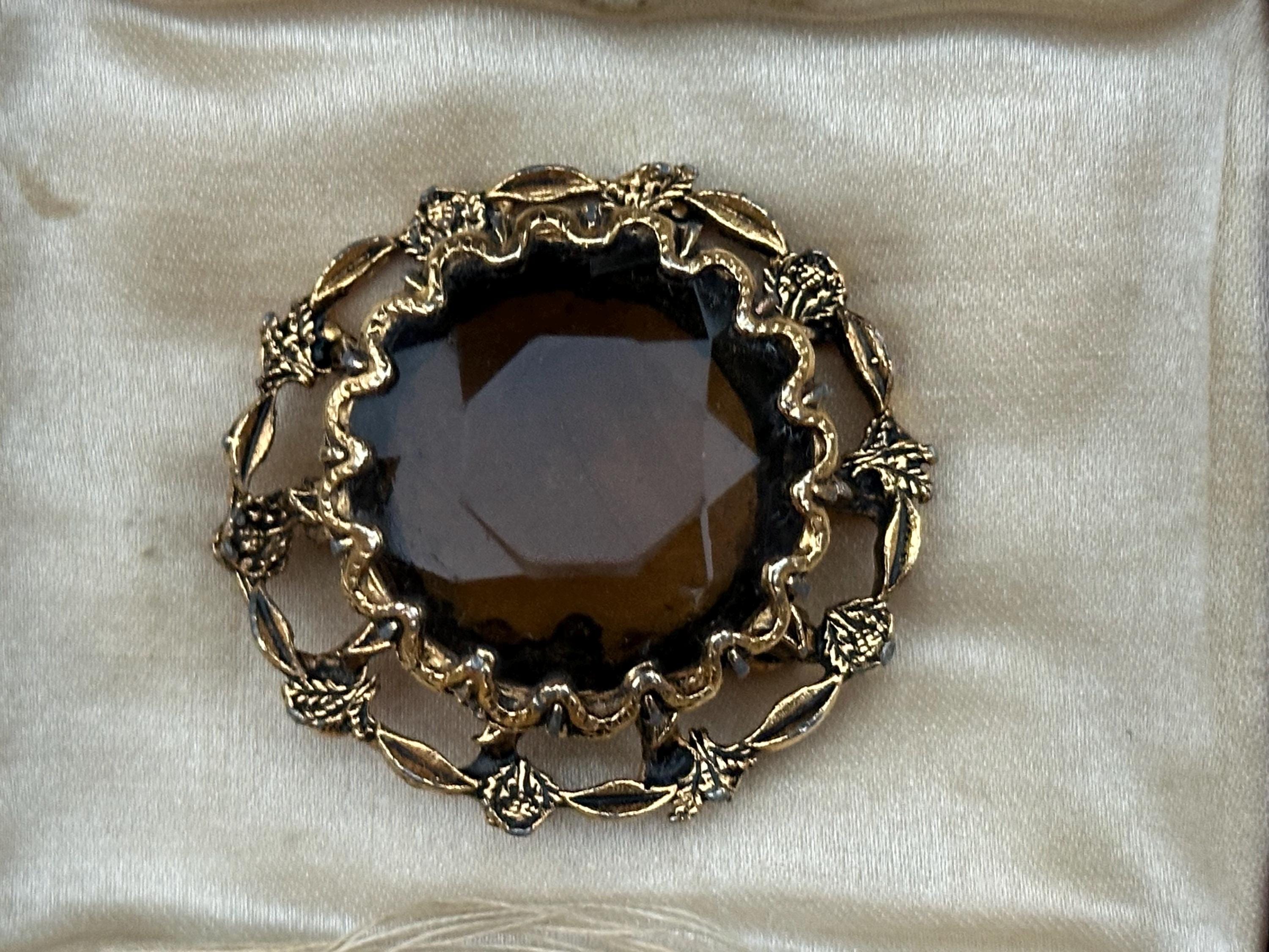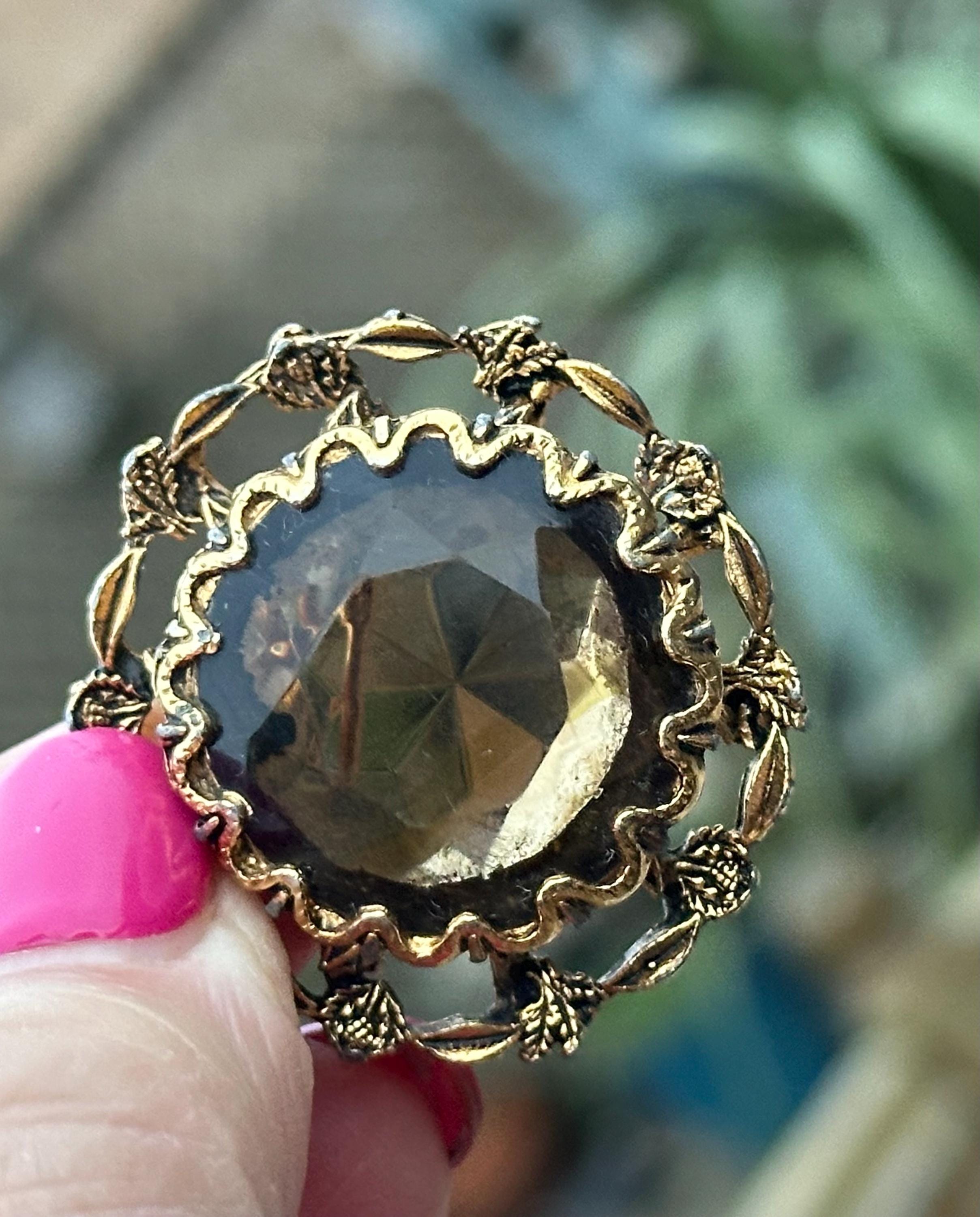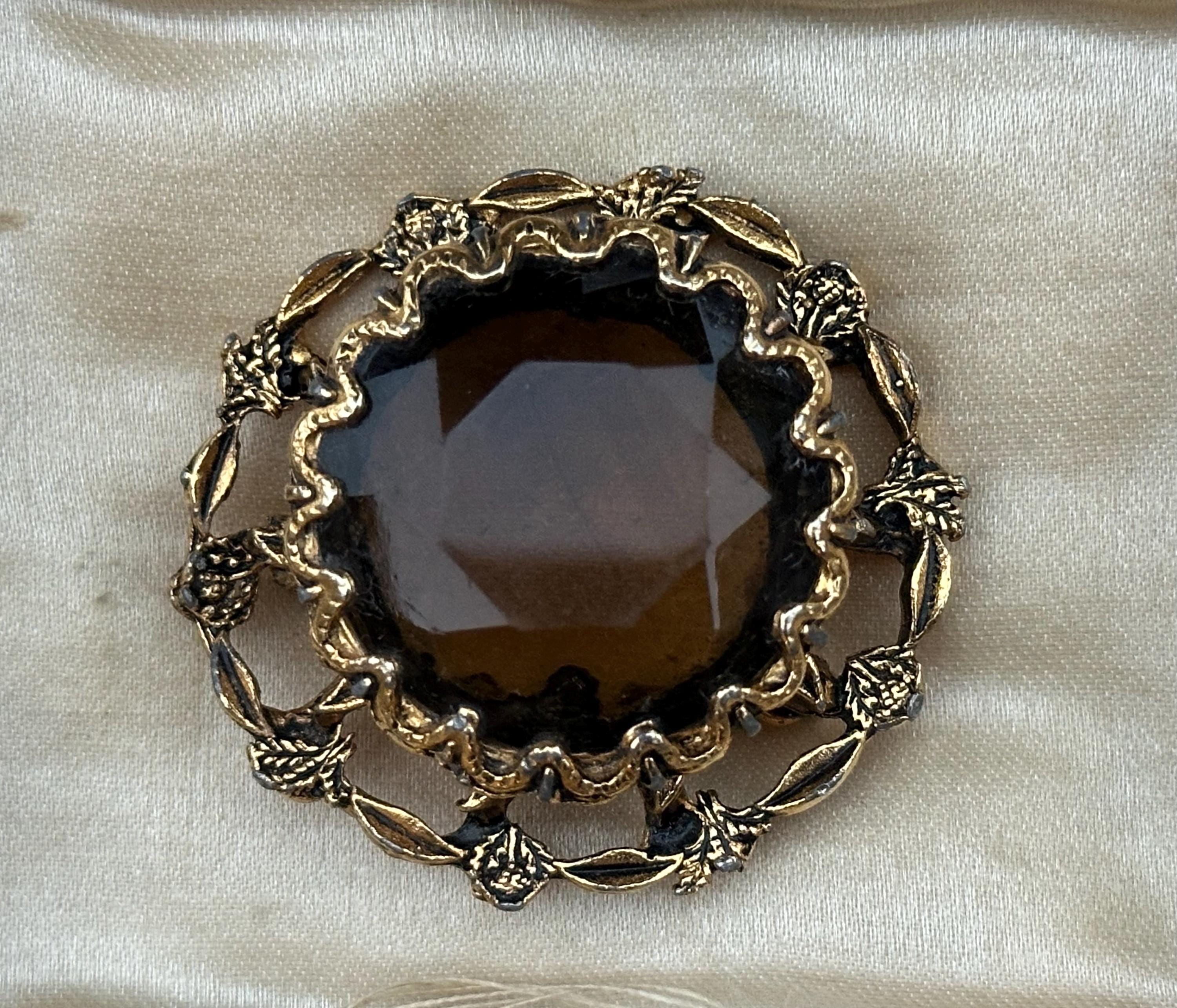 This beautiful vintage brooch features a large faceted smoky-brown glass stone set within an ornate gold-tone floral frame. The decorative scalloped border and raised leaf-and-flower detailing give it a classic Victorian revival feel, perfect for collectors or anyone who loves timeless jewellery.