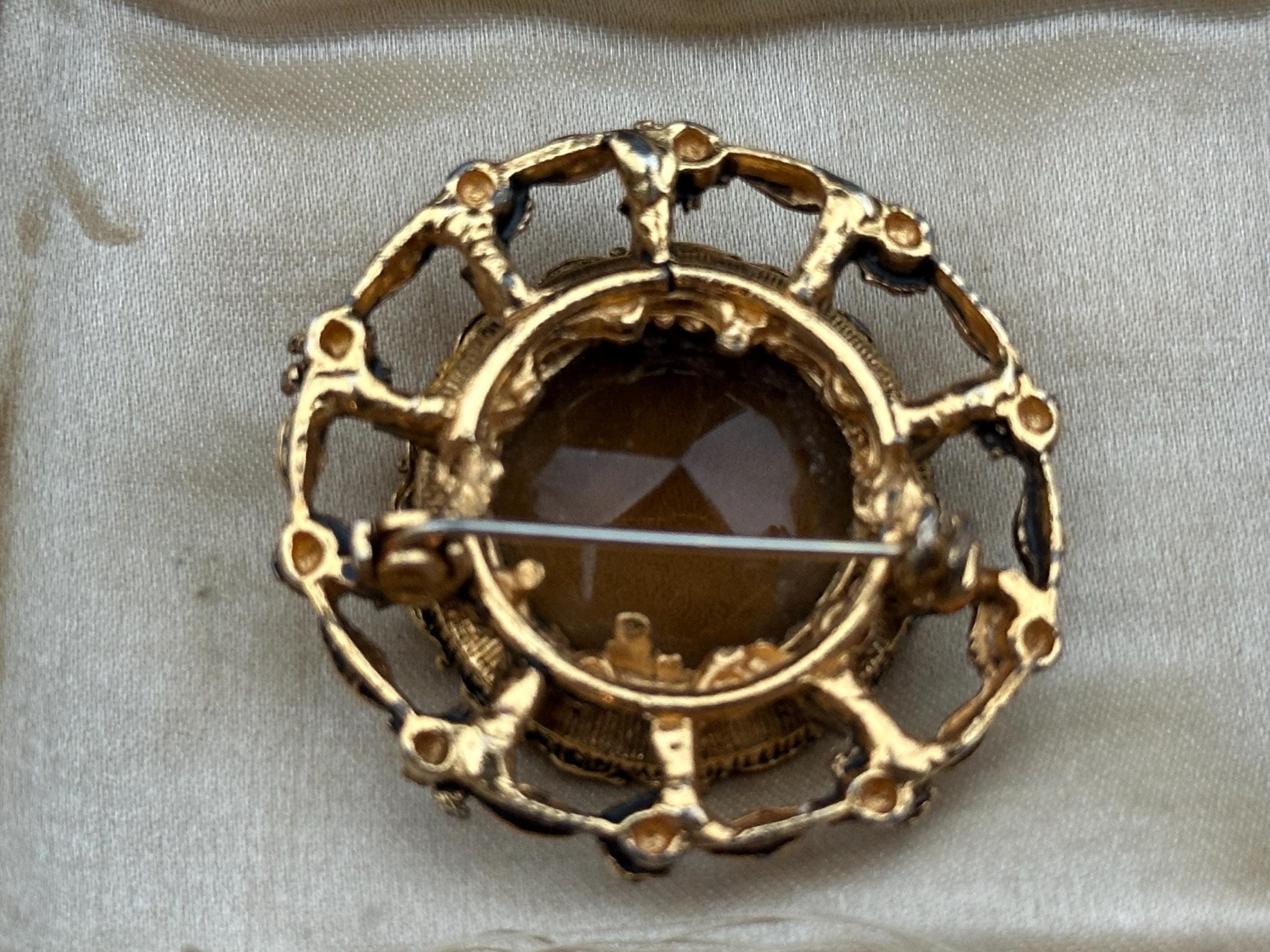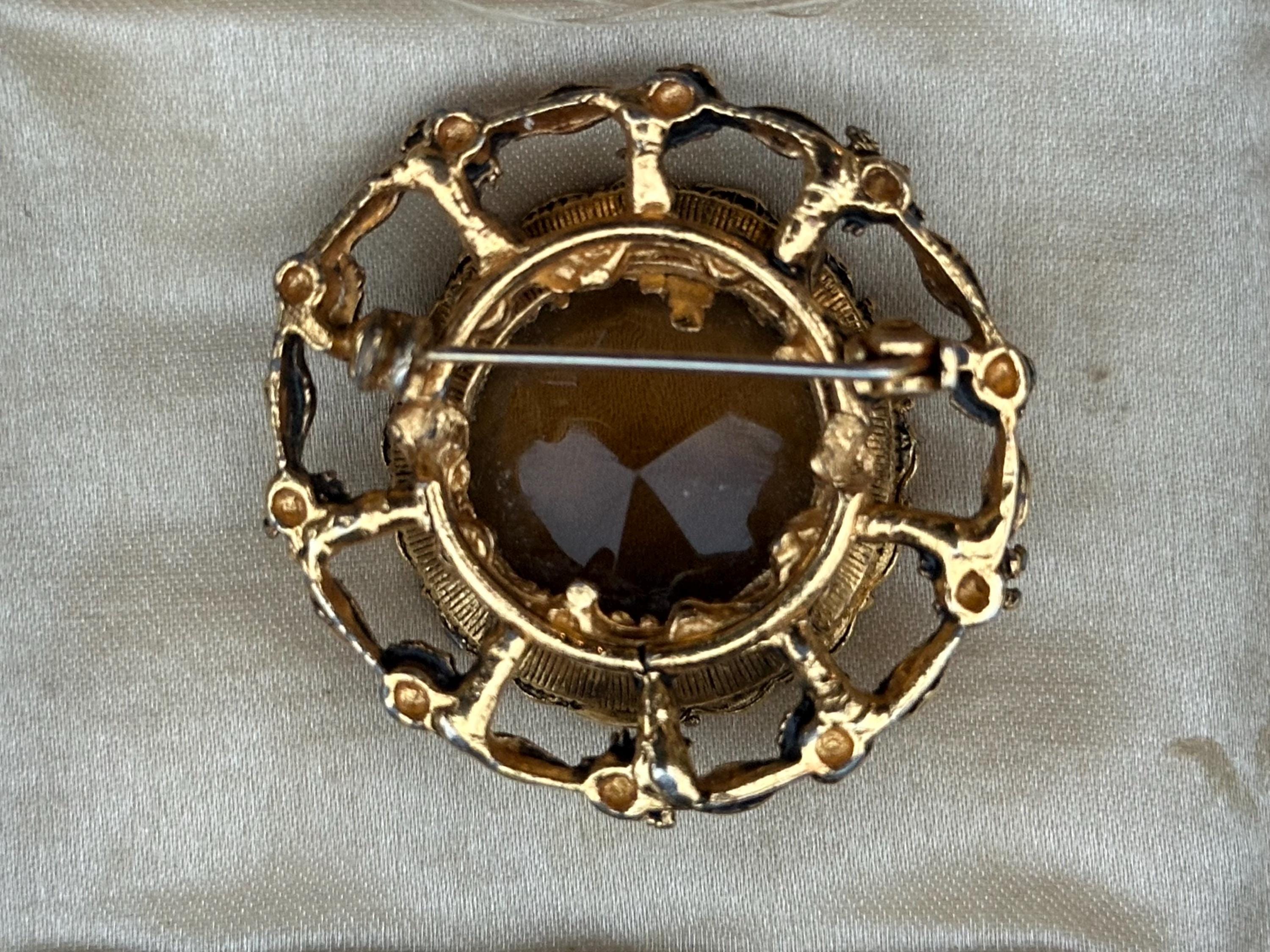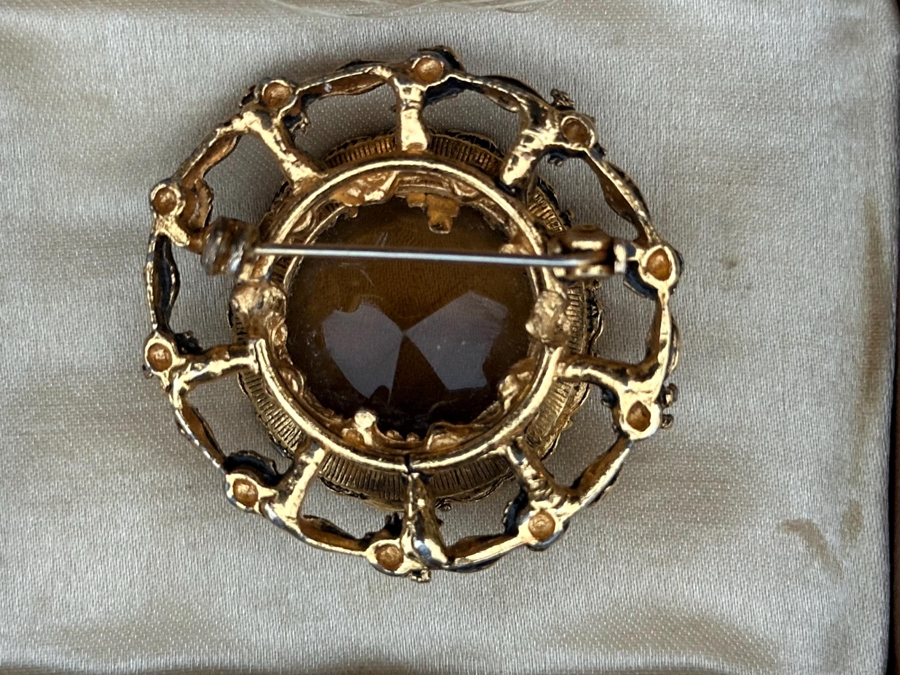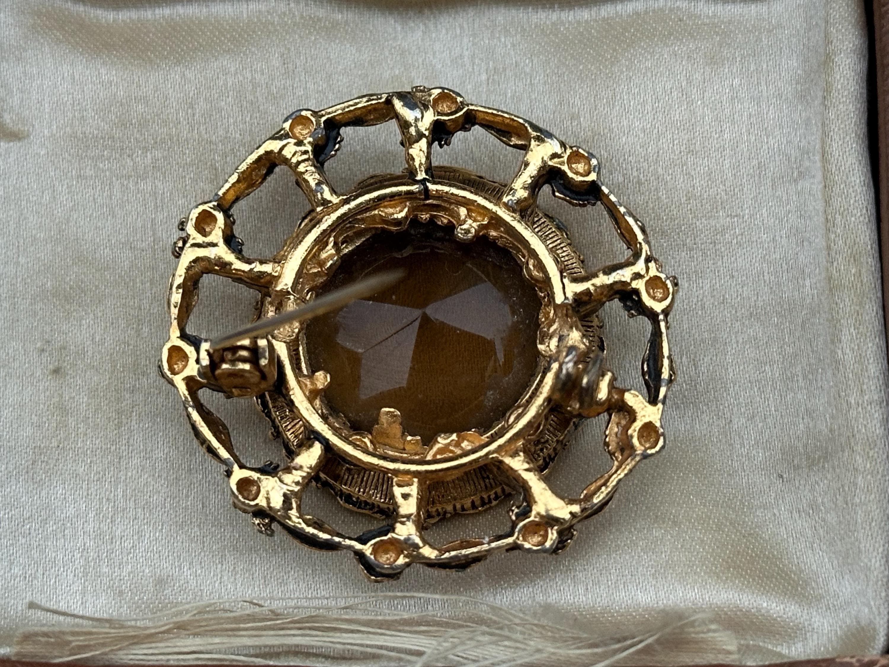 This beautiful vintage brooch features a large faceted smoky-brown glass stone set within an ornate gold-tone floral frame. The decorative scalloped border and raised leaf-and-flower detailing give it a classic Victorian revival feel, perfect for collectors or anyone who loves timeless jewellery.
