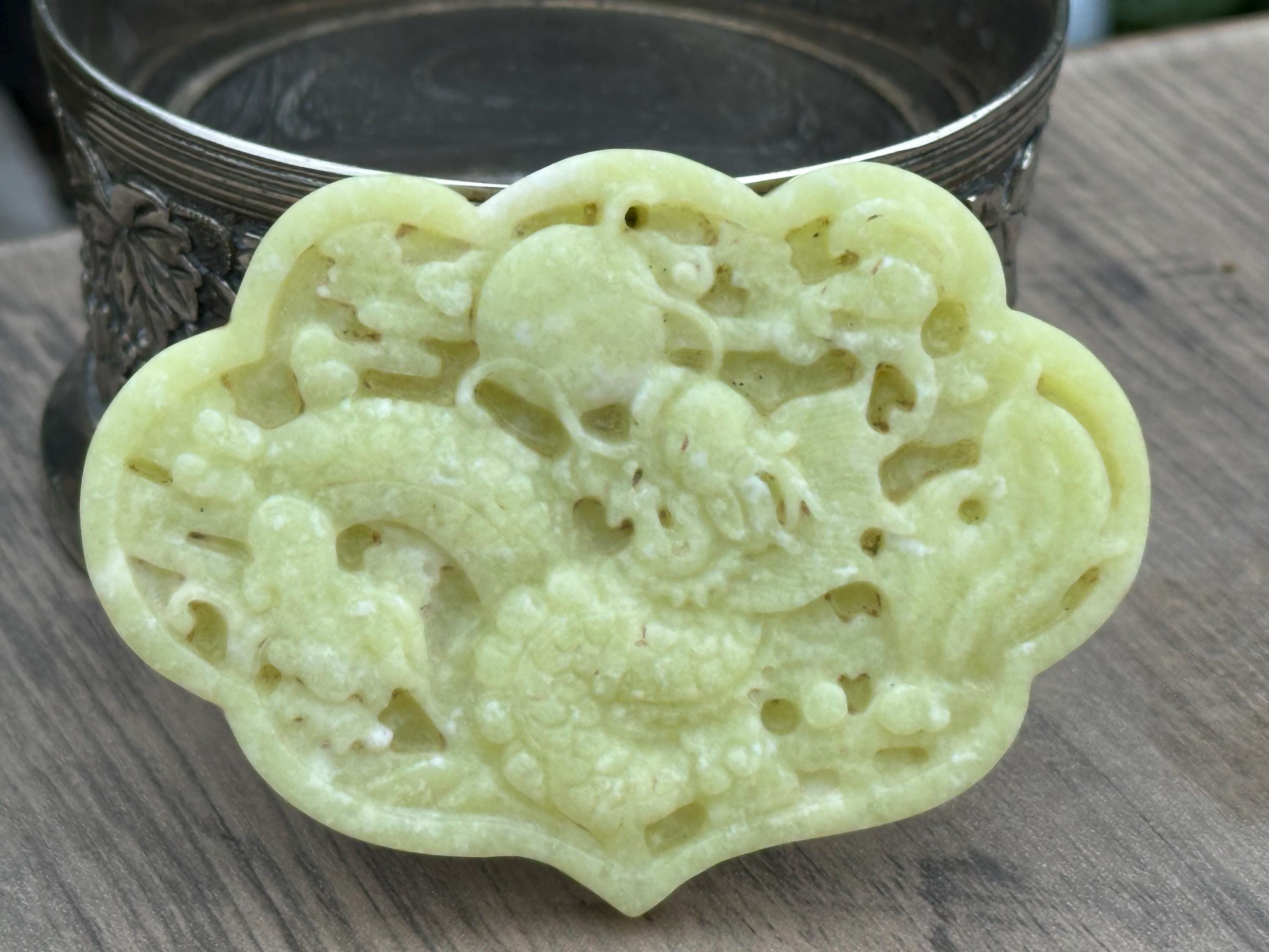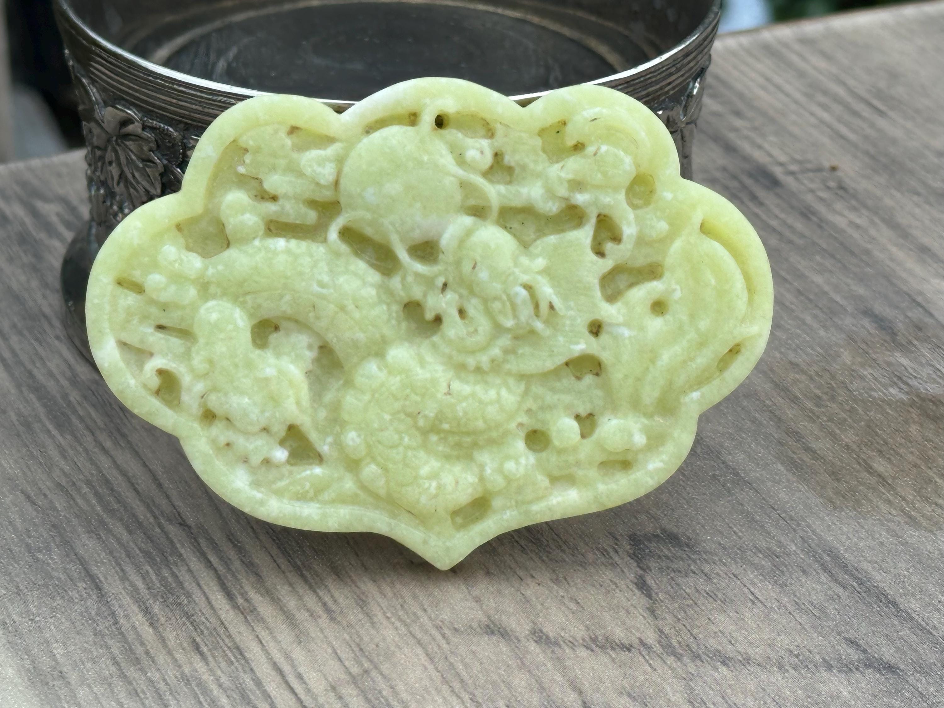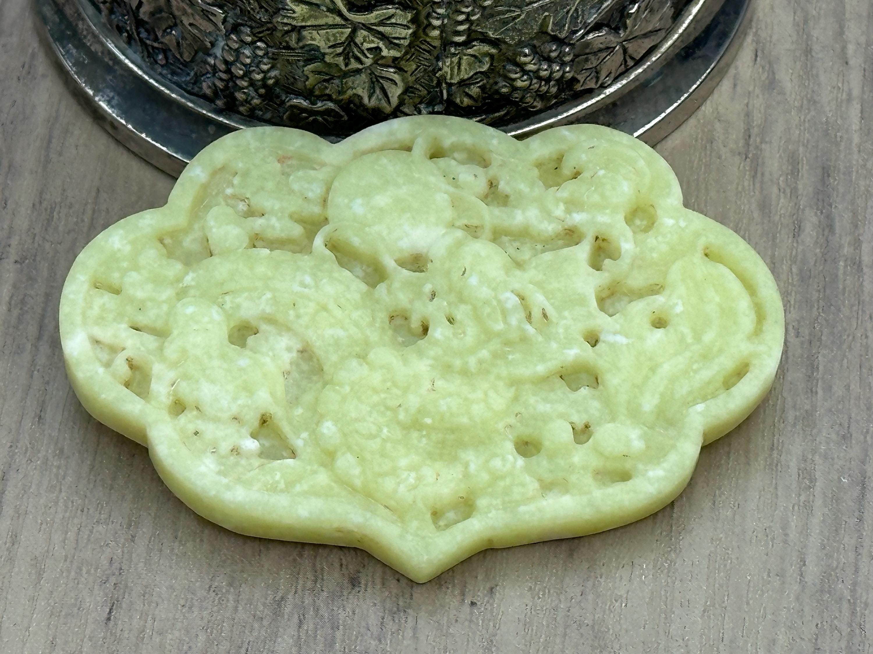 With natural mottling and a smooth polished finish. The piece features an intricate openwork (pierced) design, likely depicting traditional symbolic motifs, making it both decorative and wearable.