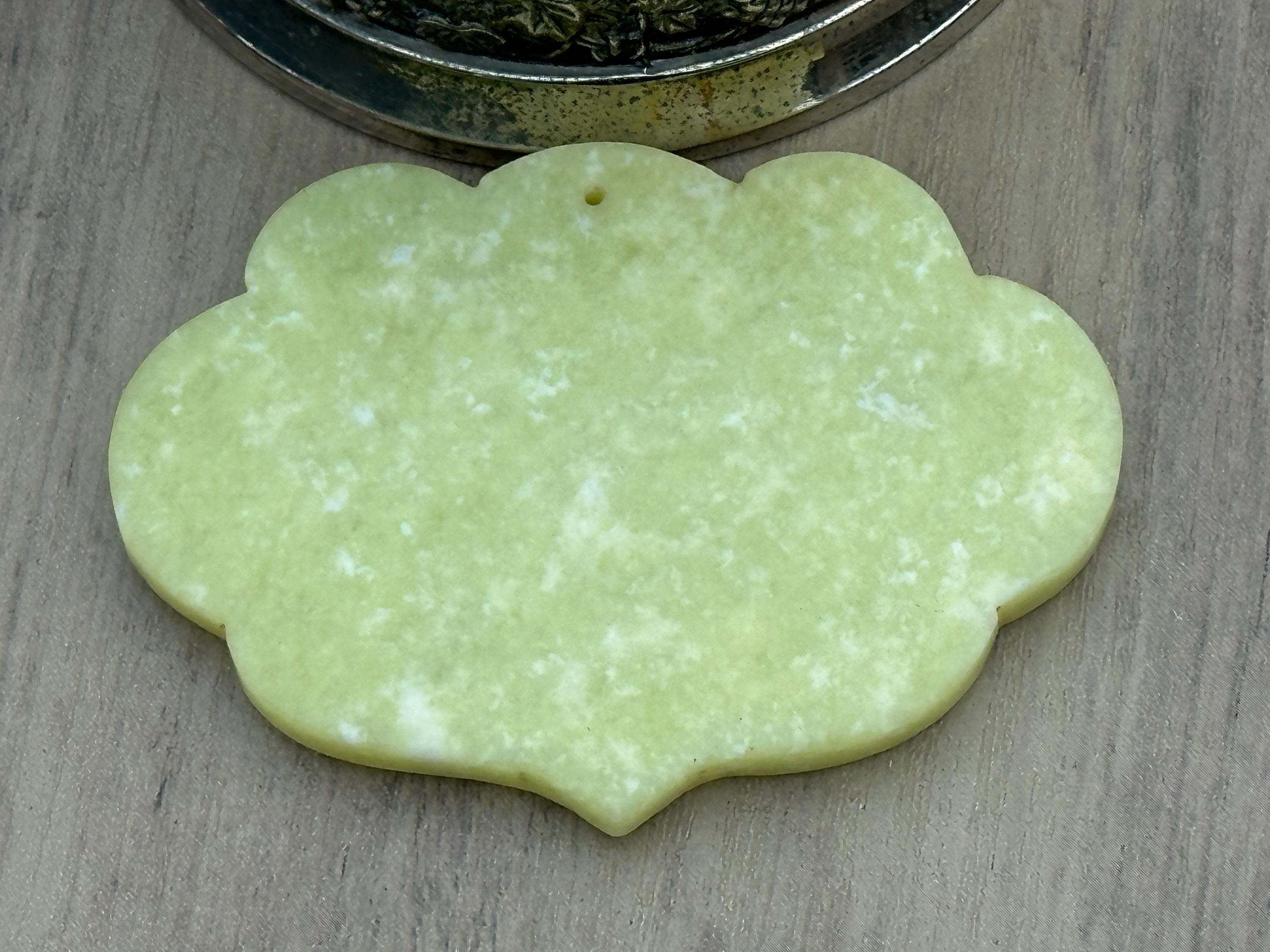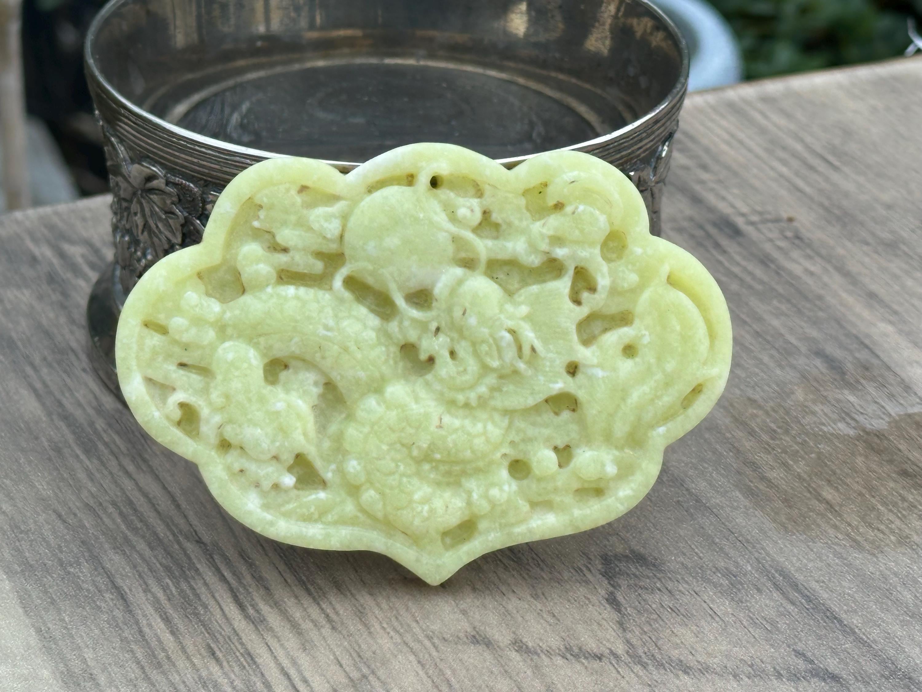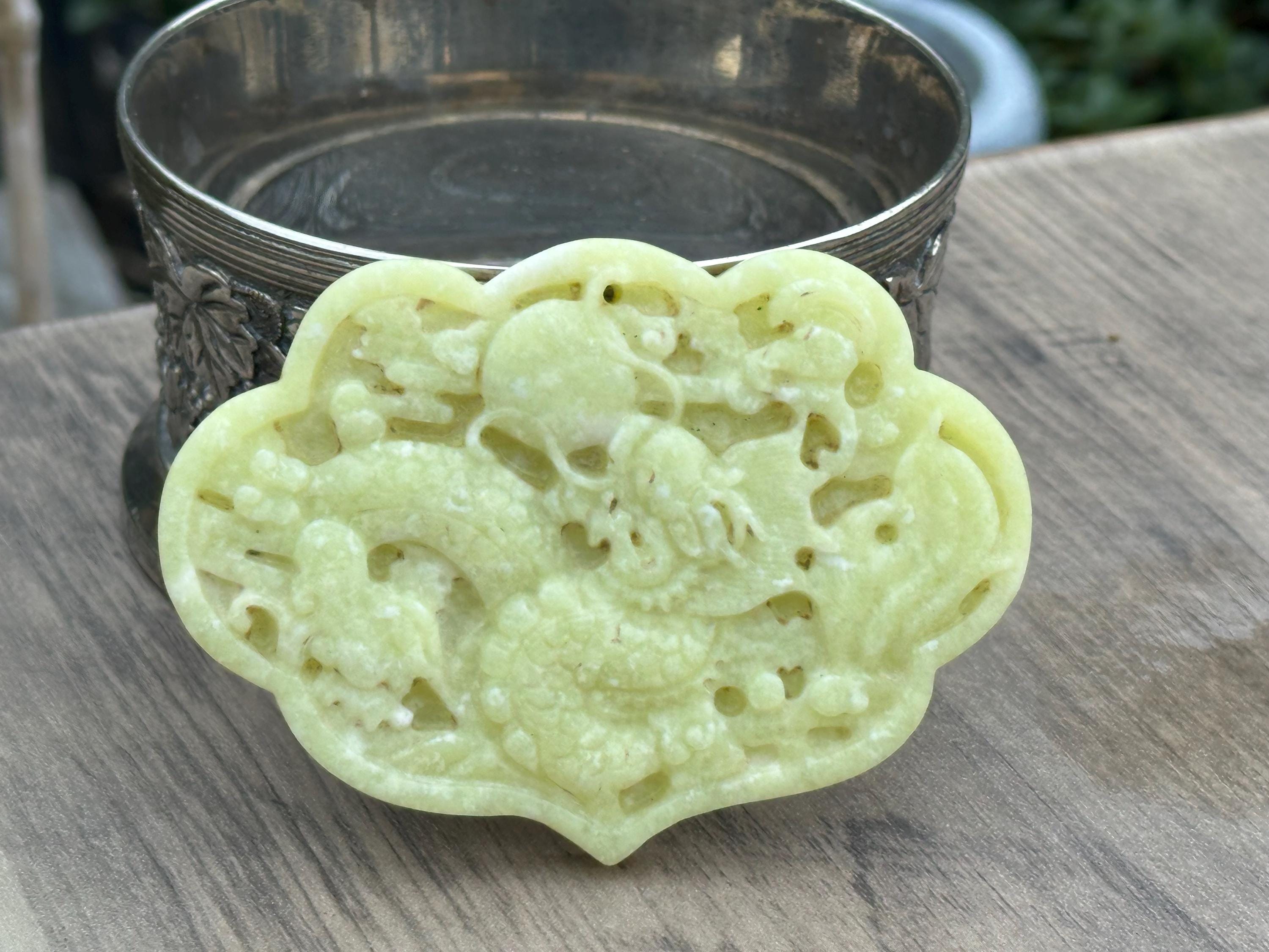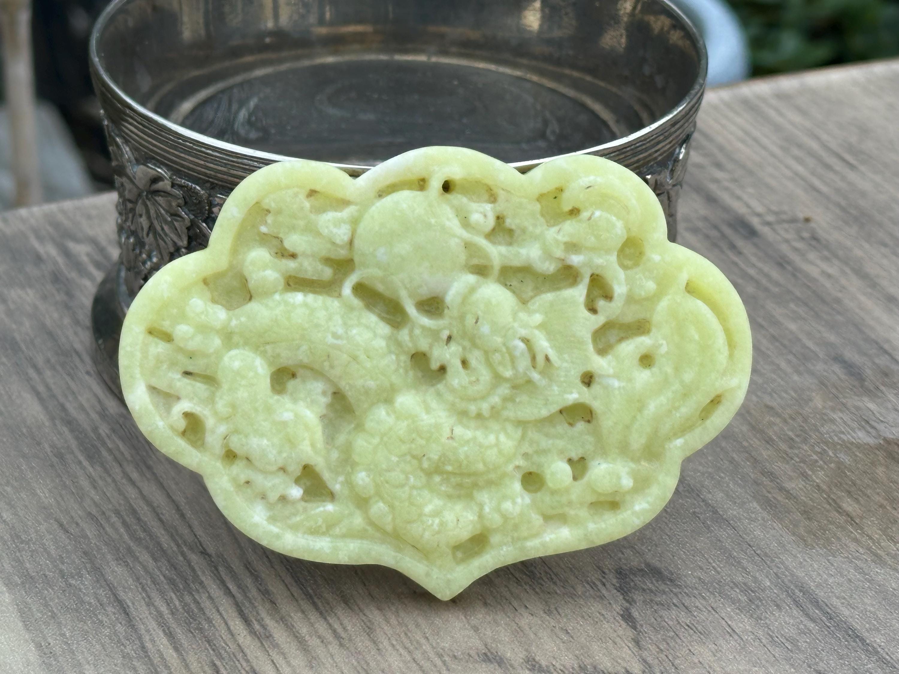 With natural mottling and a smooth polished finish. The piece features an intricate openwork (pierced) design, likely depicting traditional symbolic motifs, making it both decorative and wearable.
