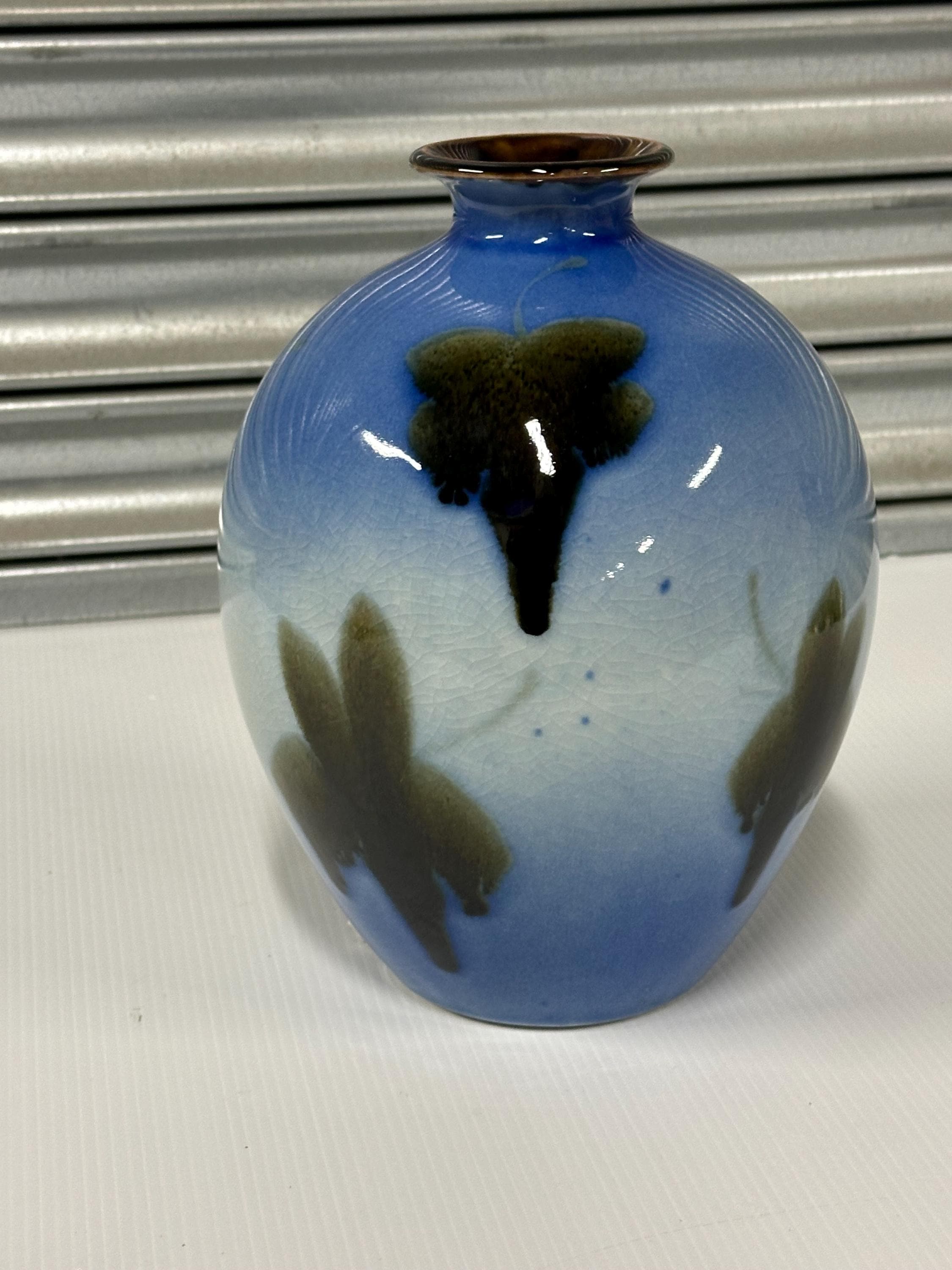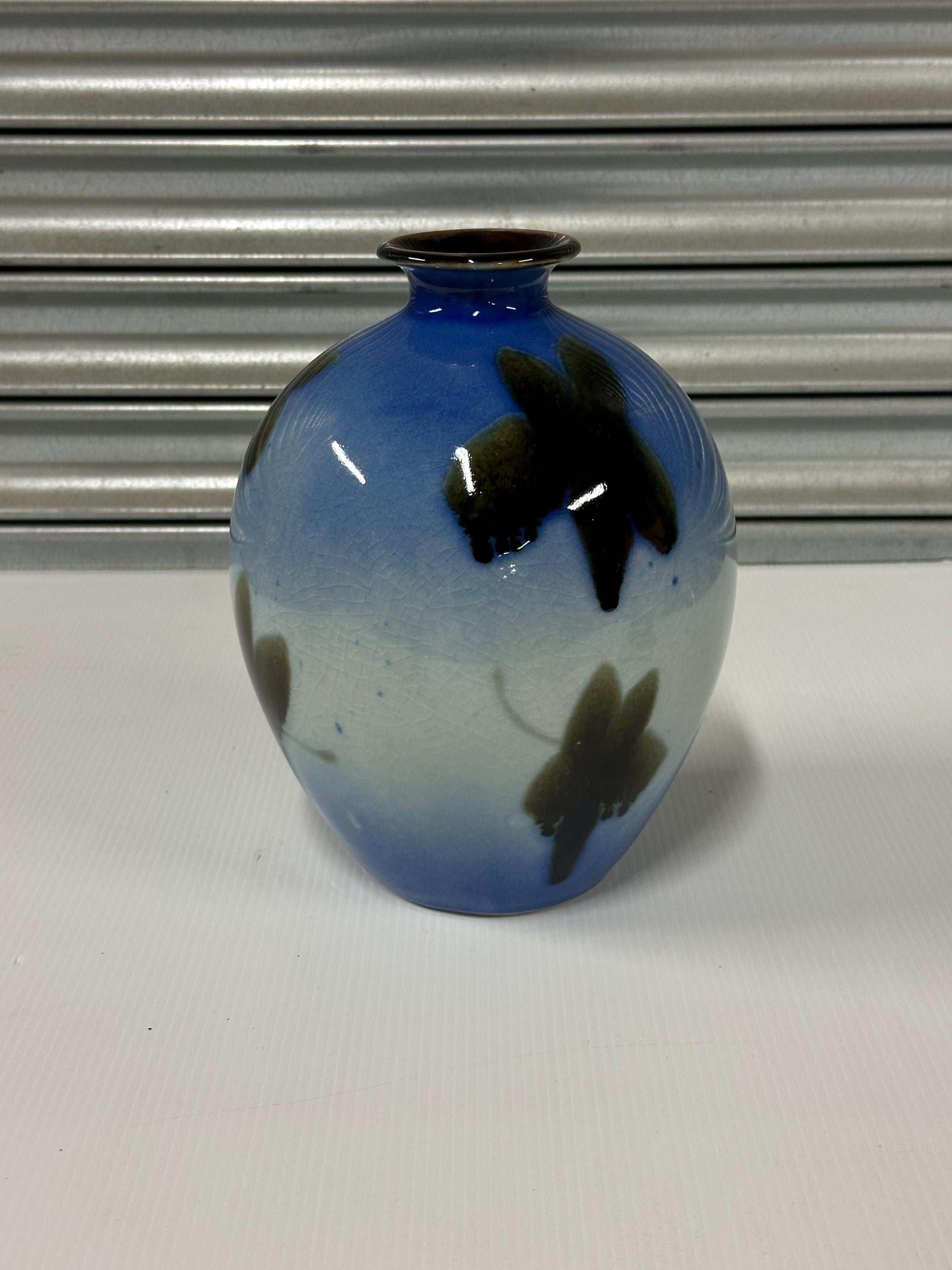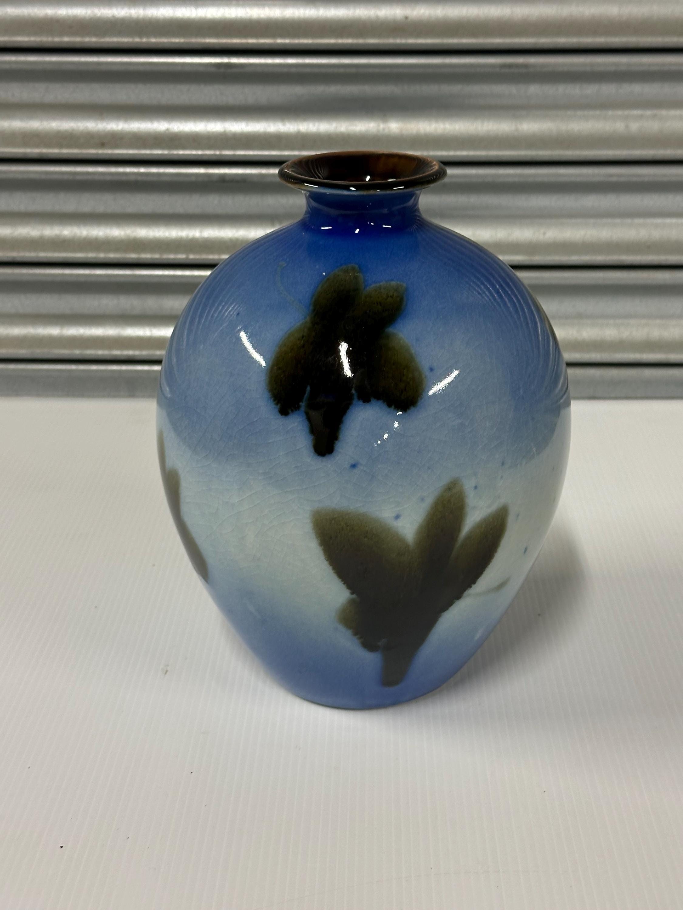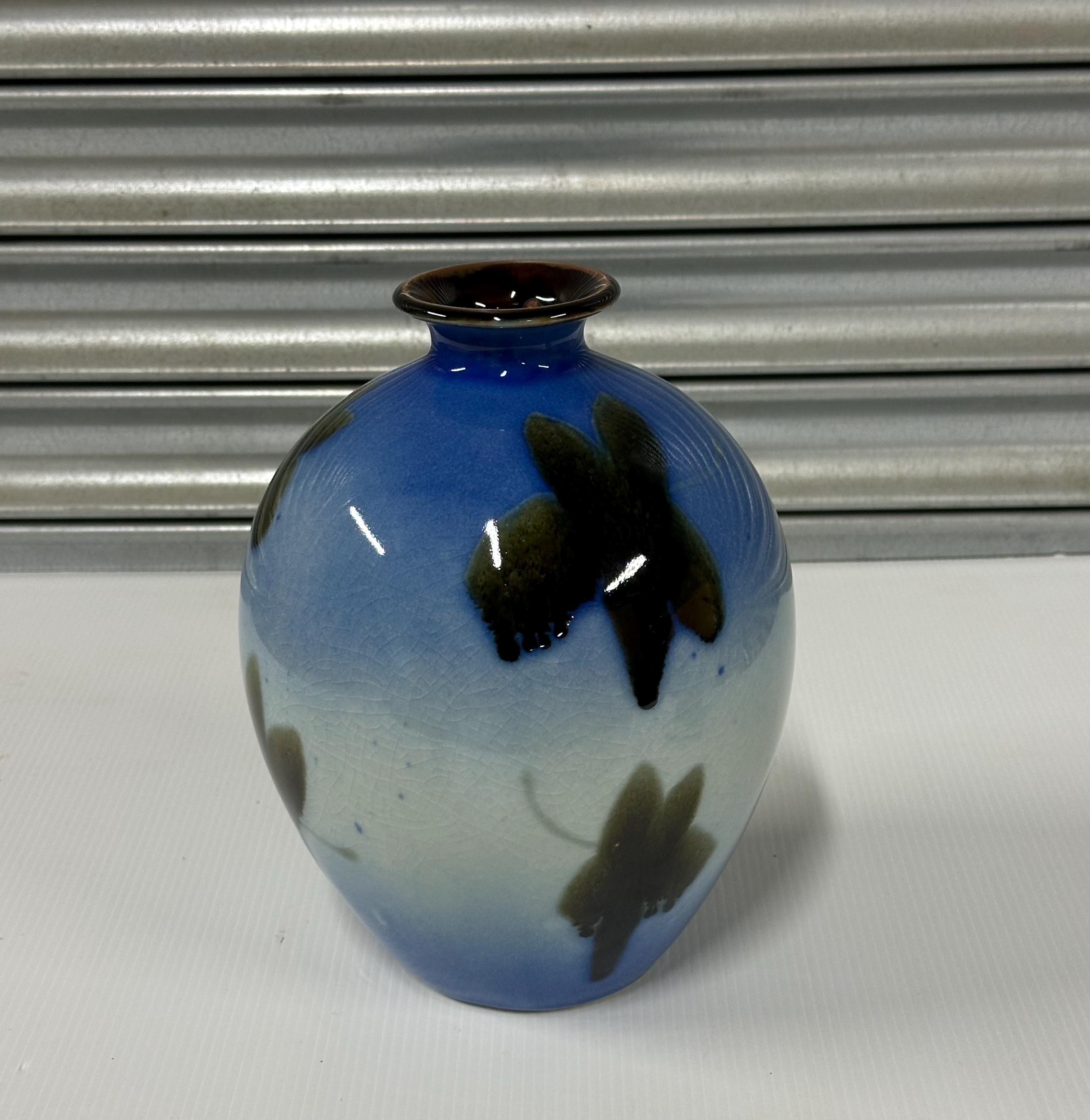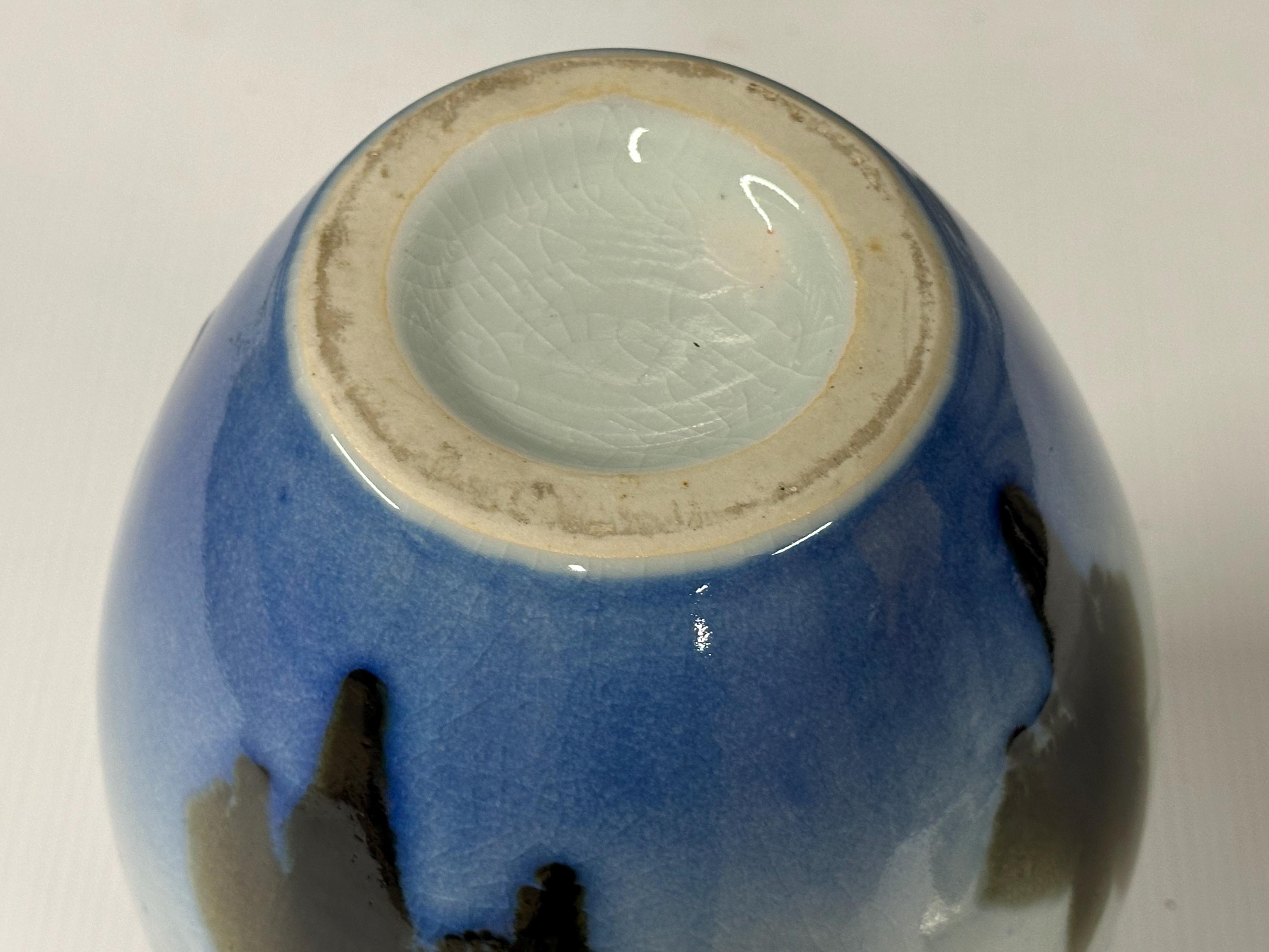The glaze shows crazing effect adding character to the vase. The neck is delicately flared with a warm brown glaze to the rim, offering a lovely contrast to the cooler hues below.