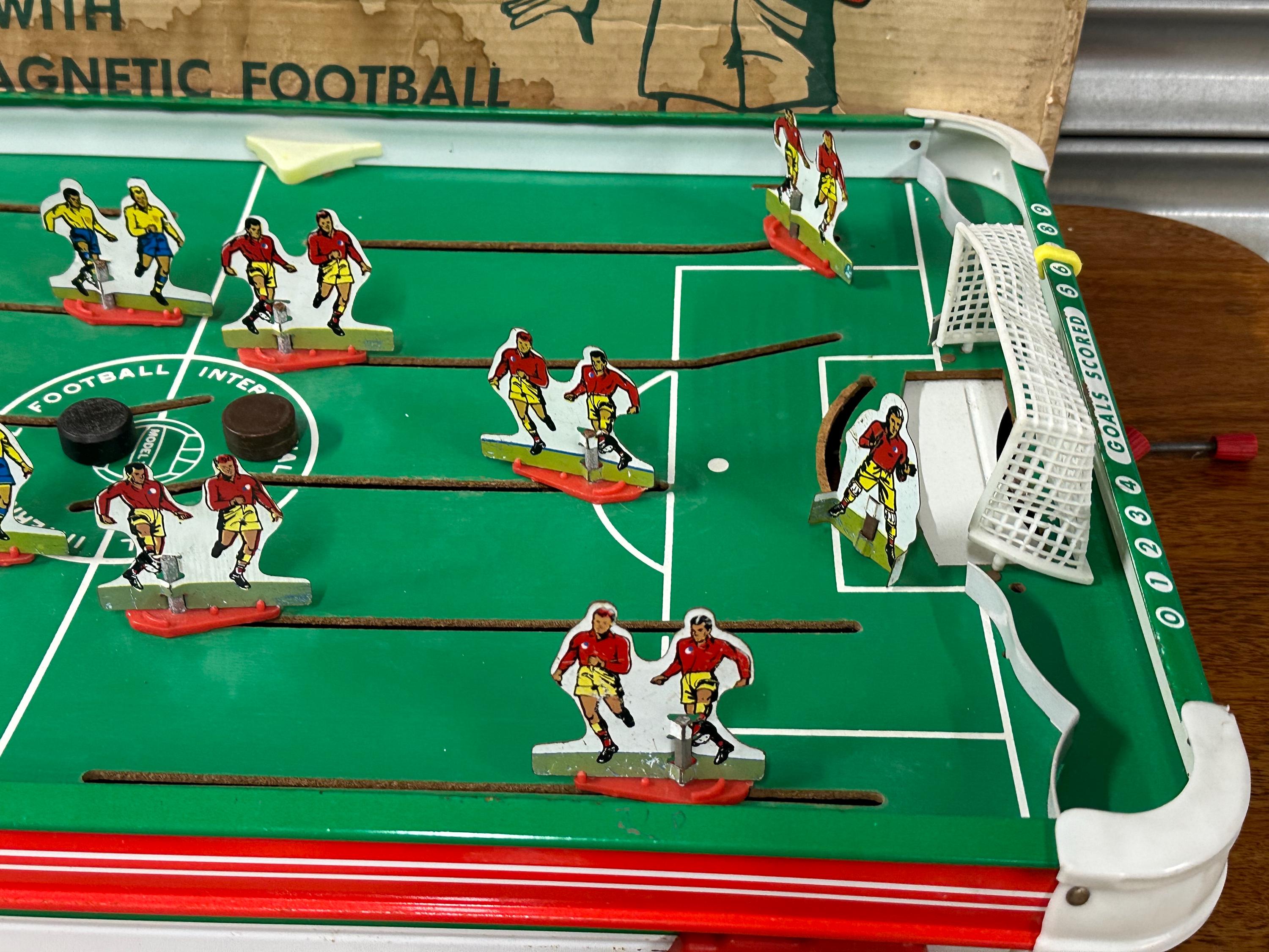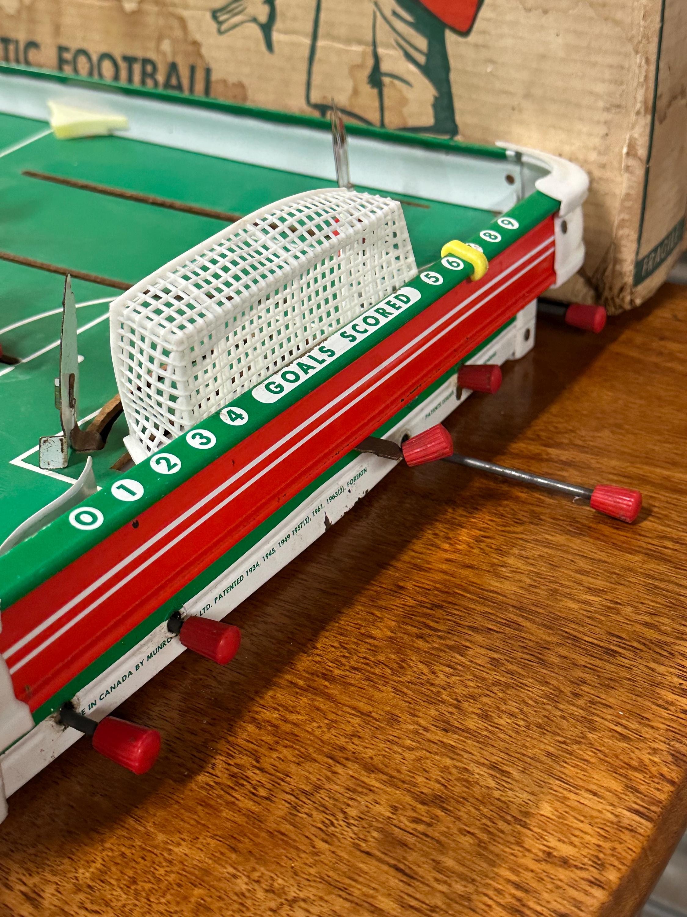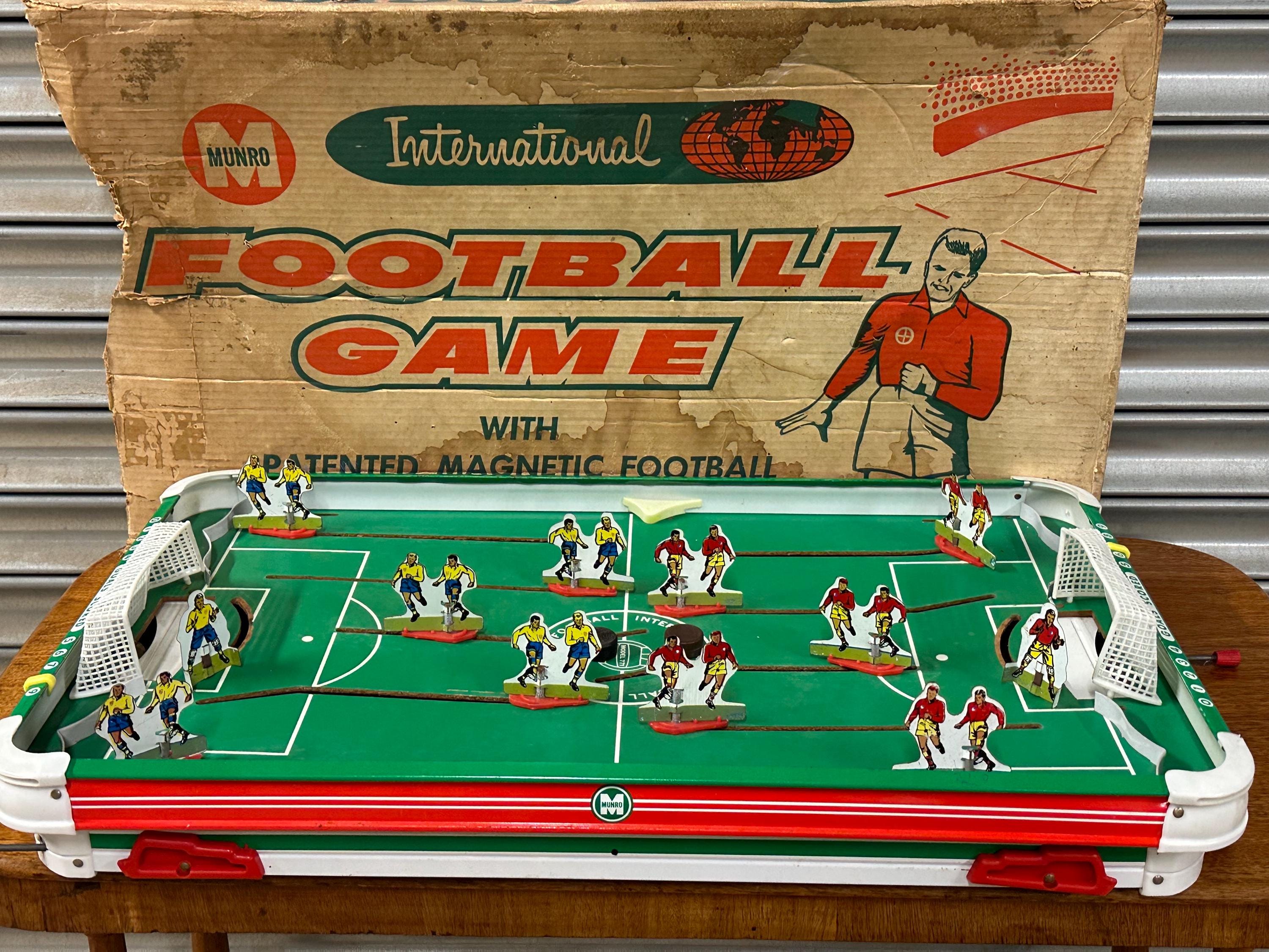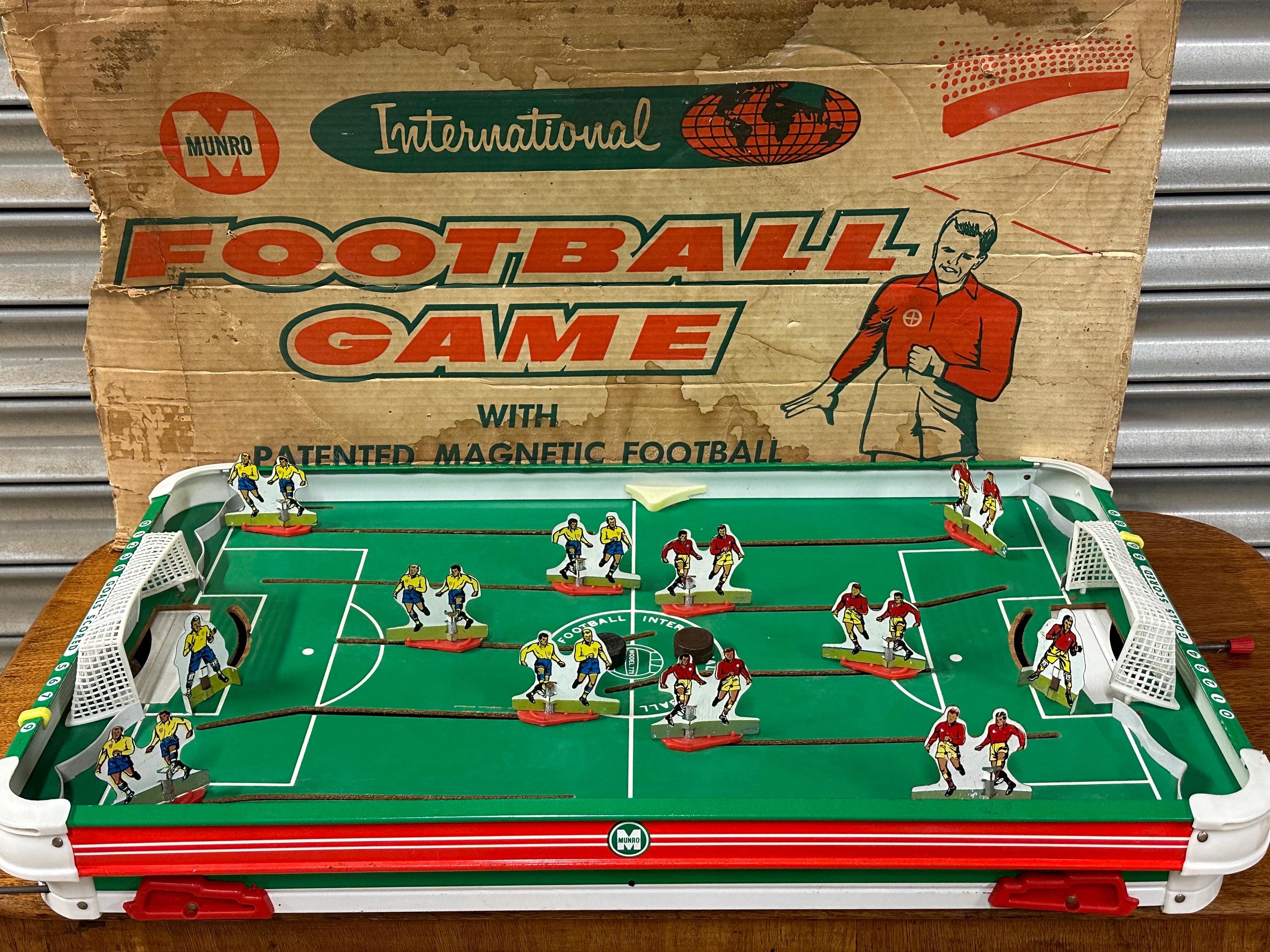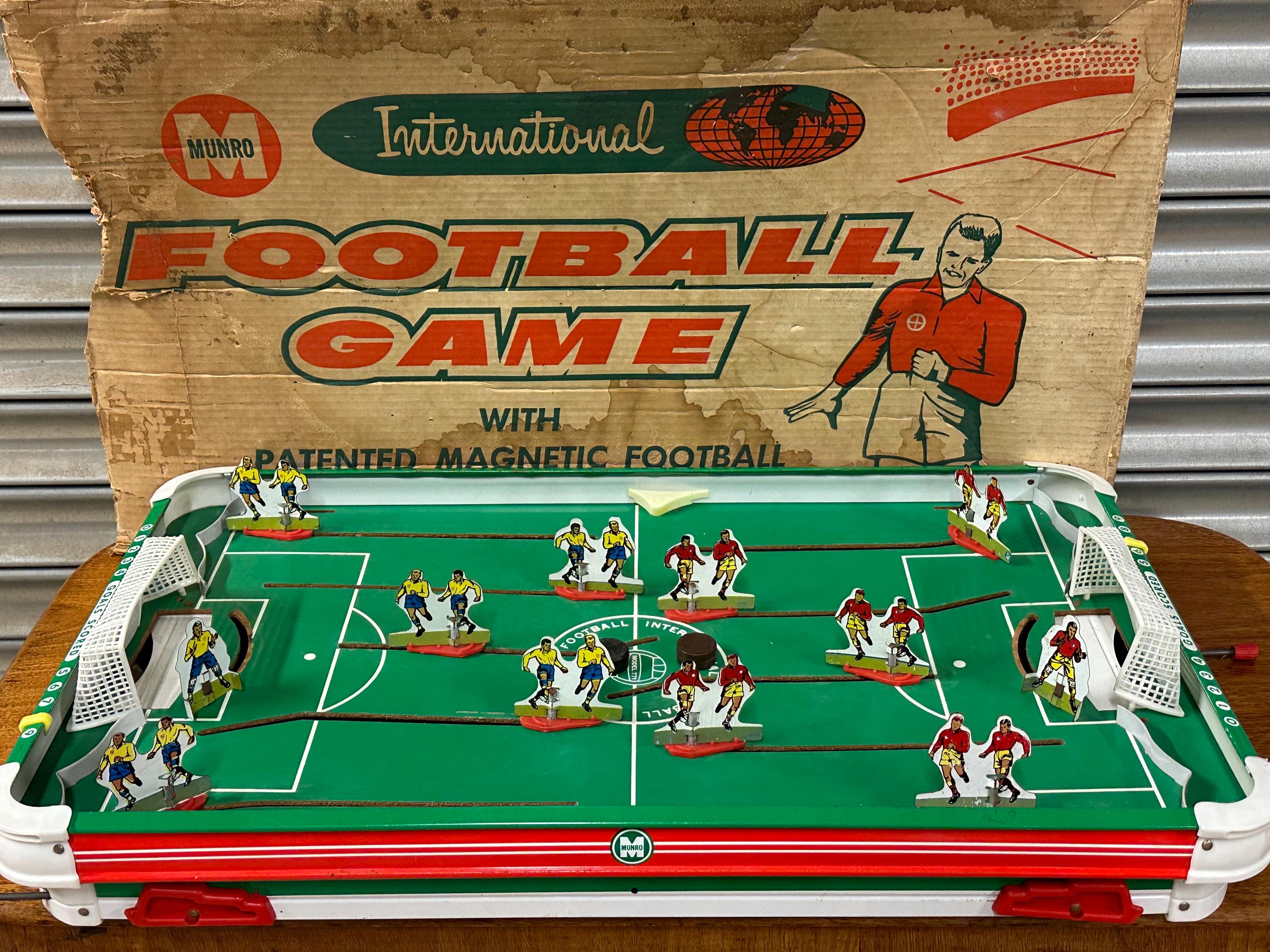 A fantastic vintage Munro International Football Game, dating from the 1960s/70s, complete with its original illustrated box. This classic tabletop game features magnetic football action, with players controlled via sliding metal rods beneath the pitch – an early and very charming precursor to modern table football.