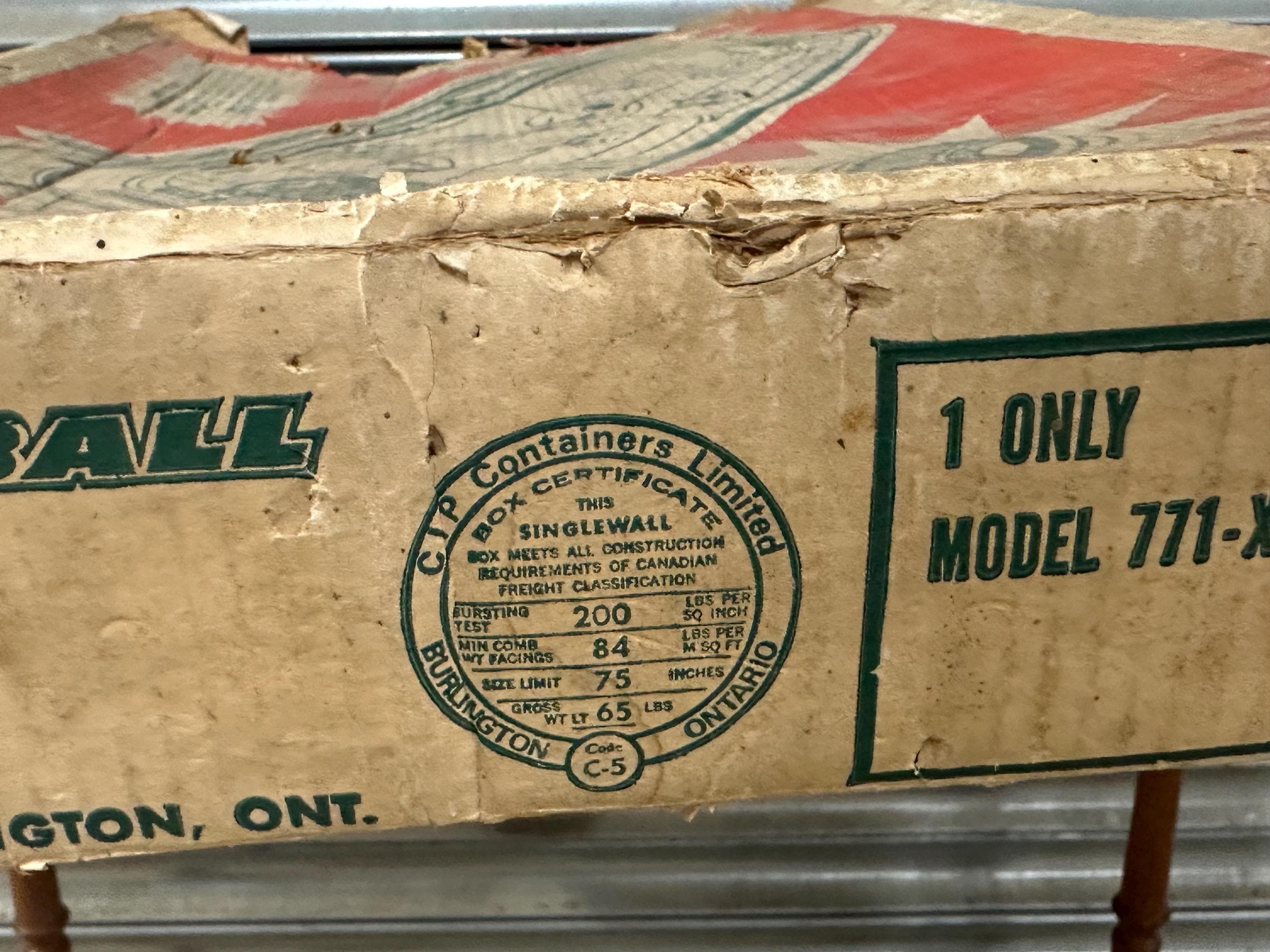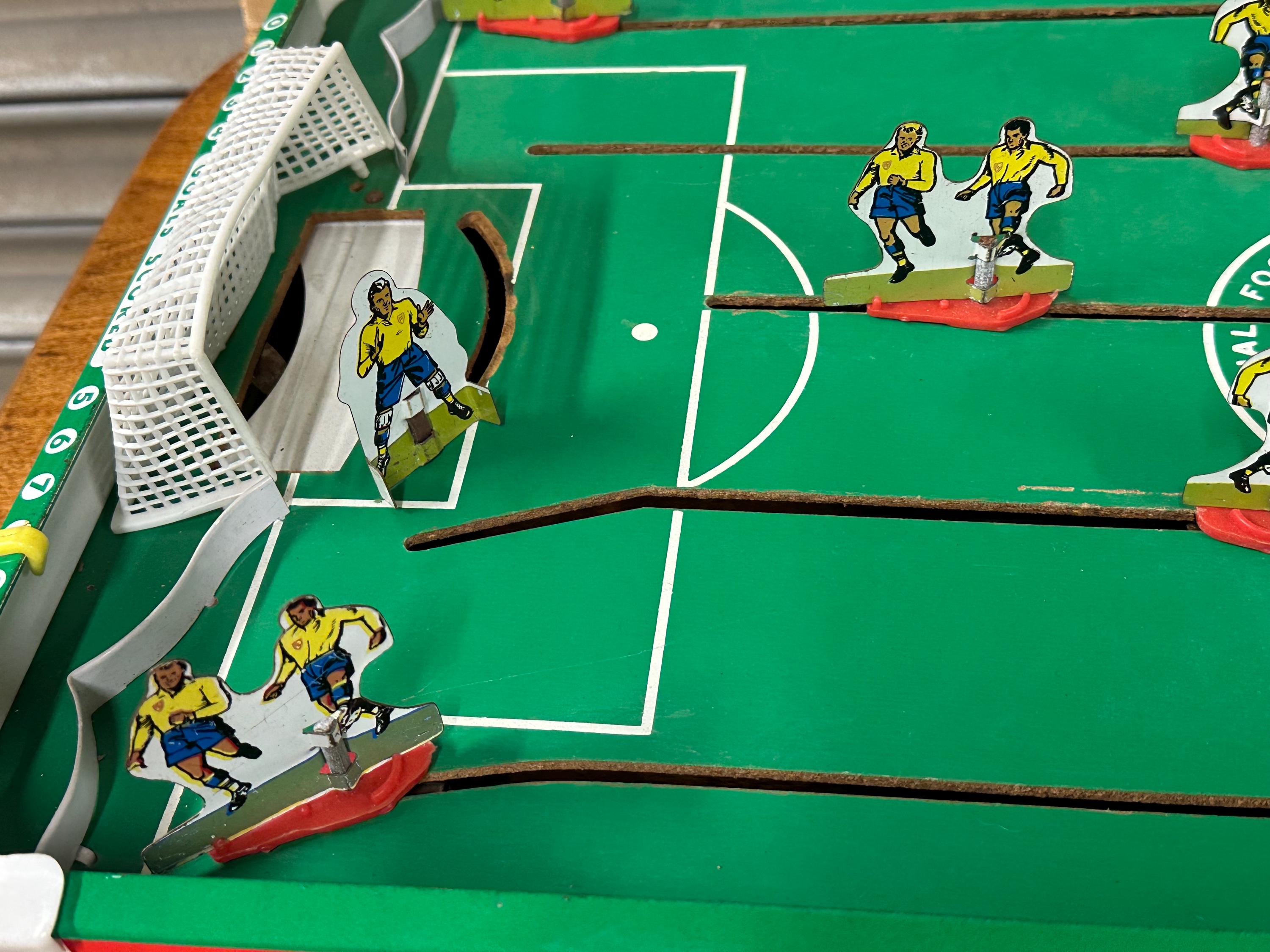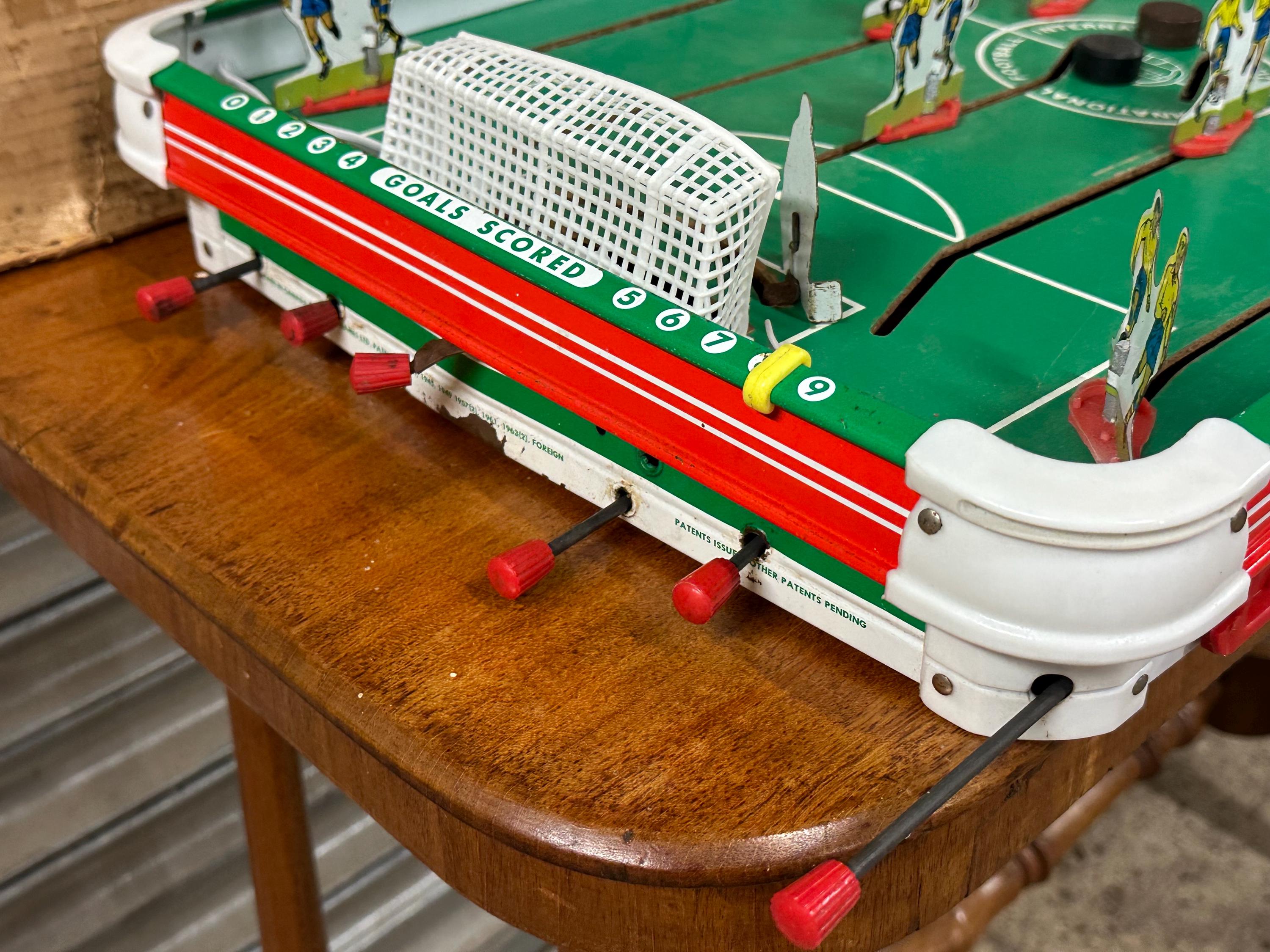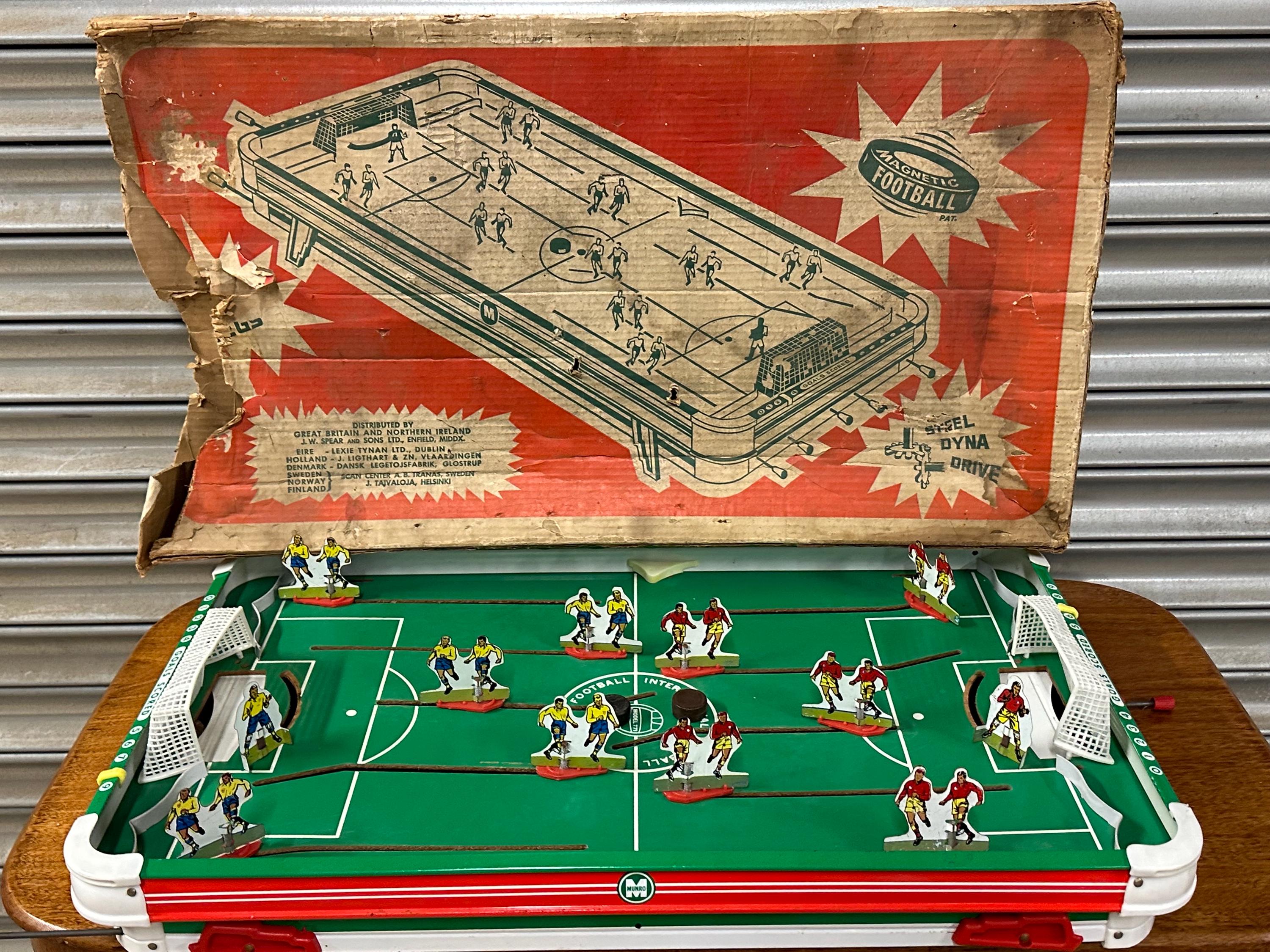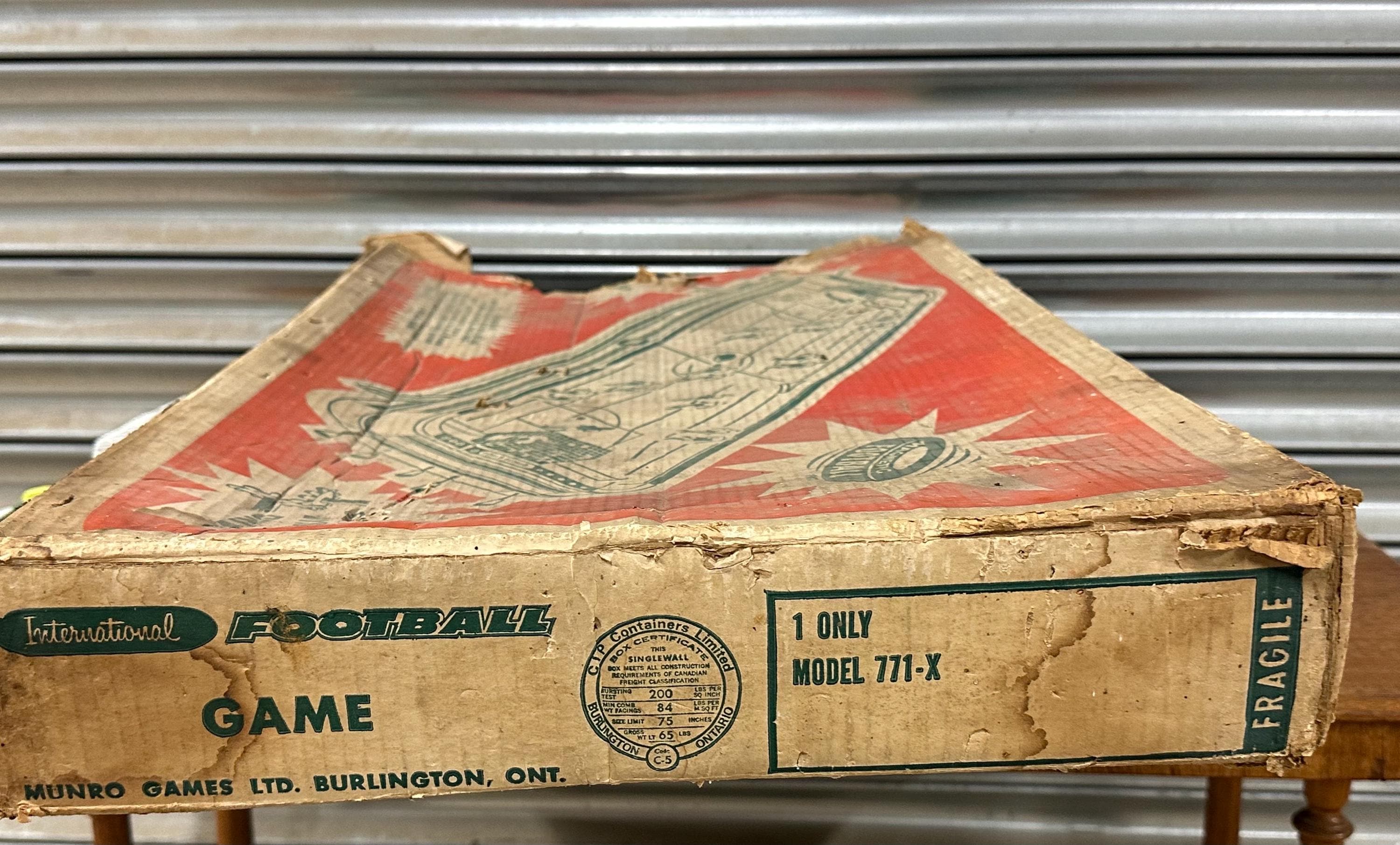 A fantastic vintage Munro International Football Game, dating from the 1960s/70s, complete with its original illustrated box. This classic tabletop game features magnetic football action, with players controlled via sliding metal rods beneath the pitch – an early and very charming precursor to modern table football.