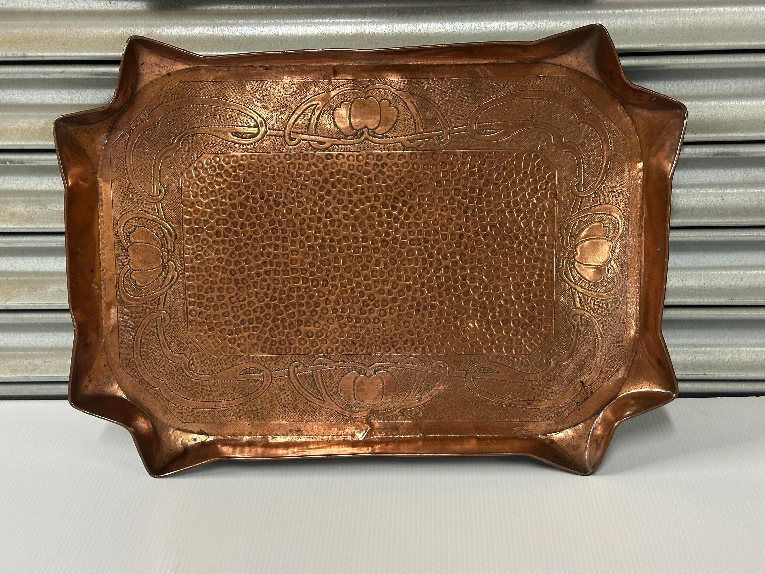 A beautiful and highly decorative Art Nouveau period copper tray, attributed to the Eustace Brothers of Hale, well known for producing quality hand-crafted arts-and-crafts metalwork in the early 20th century.