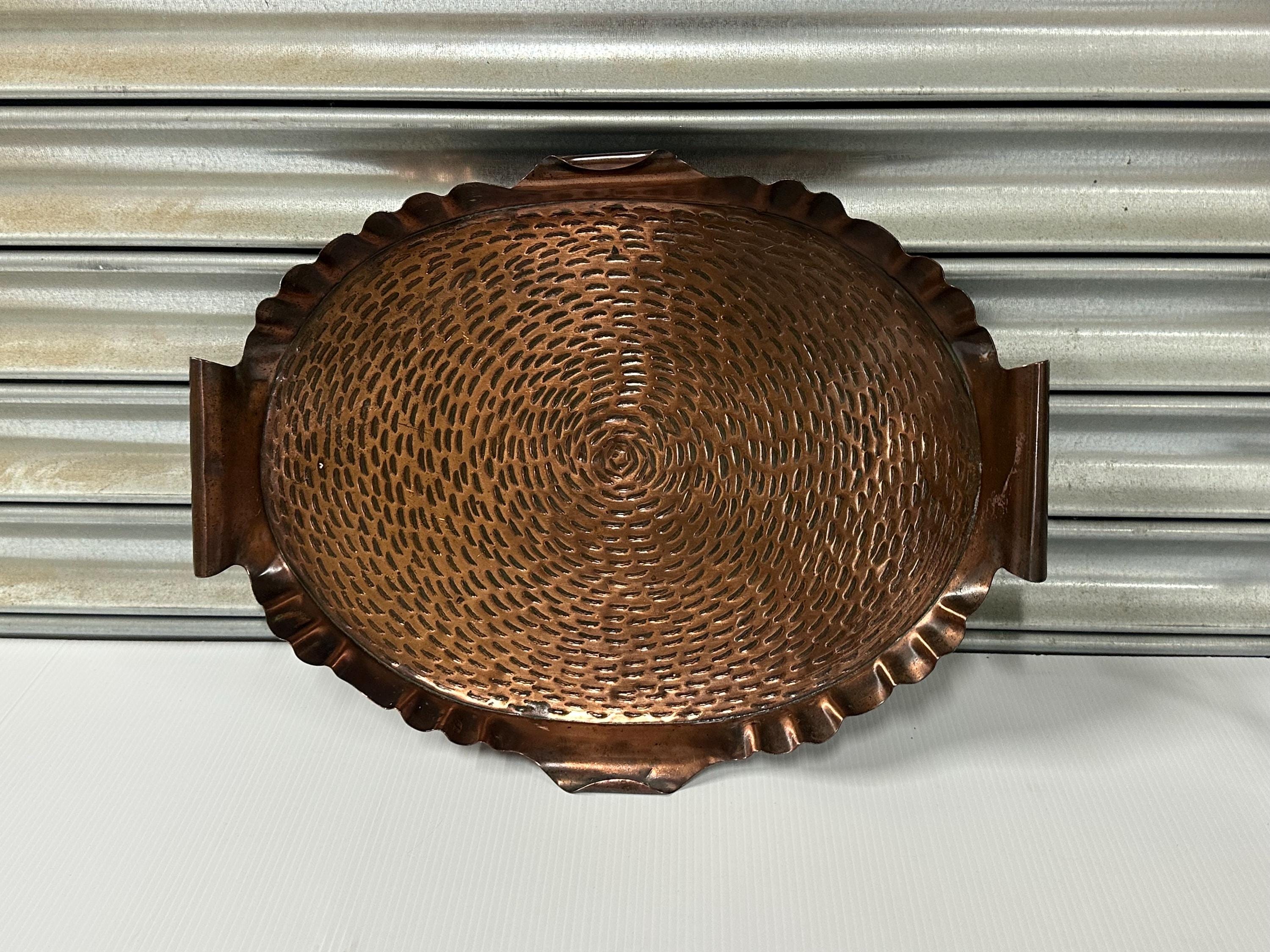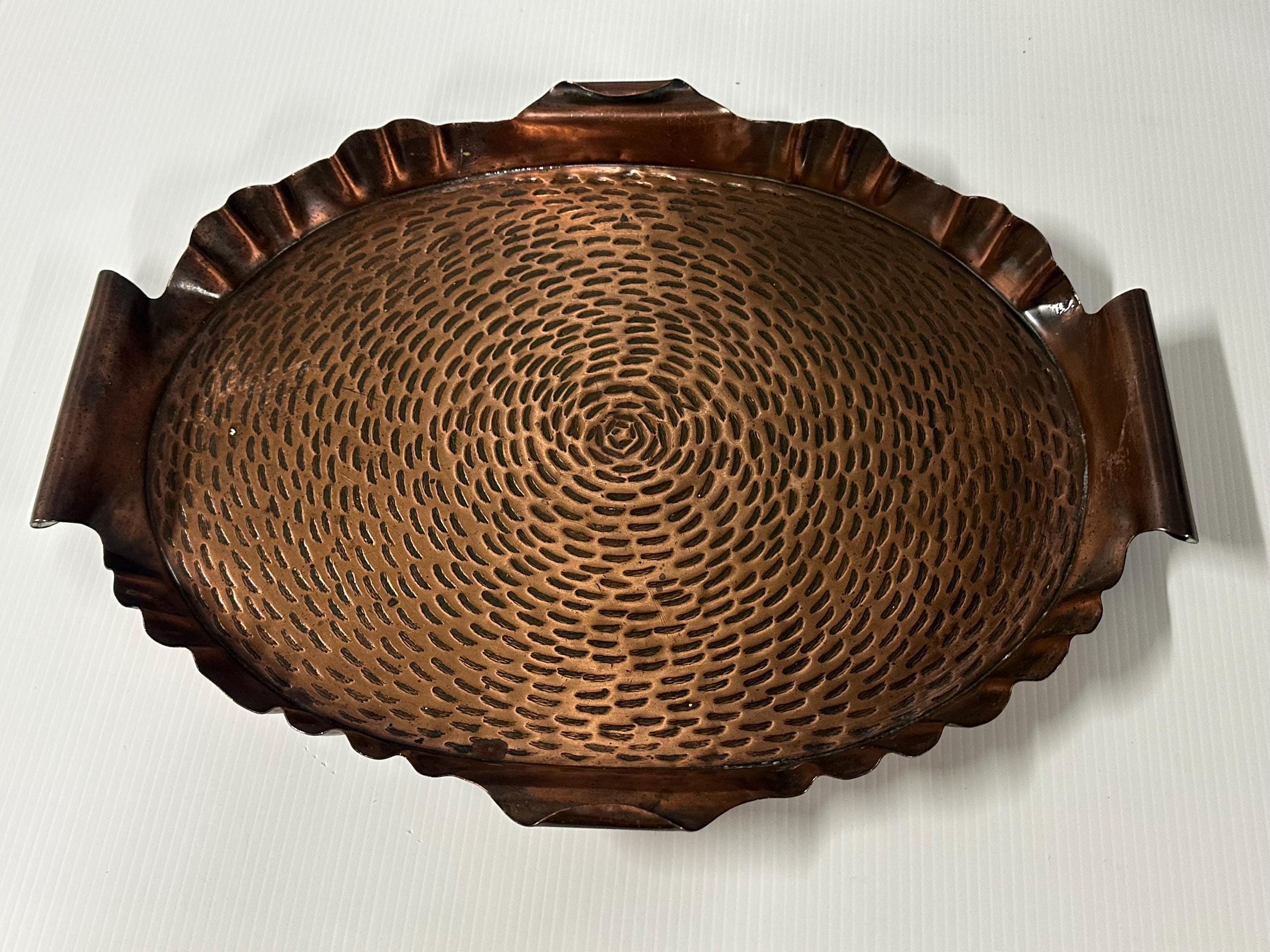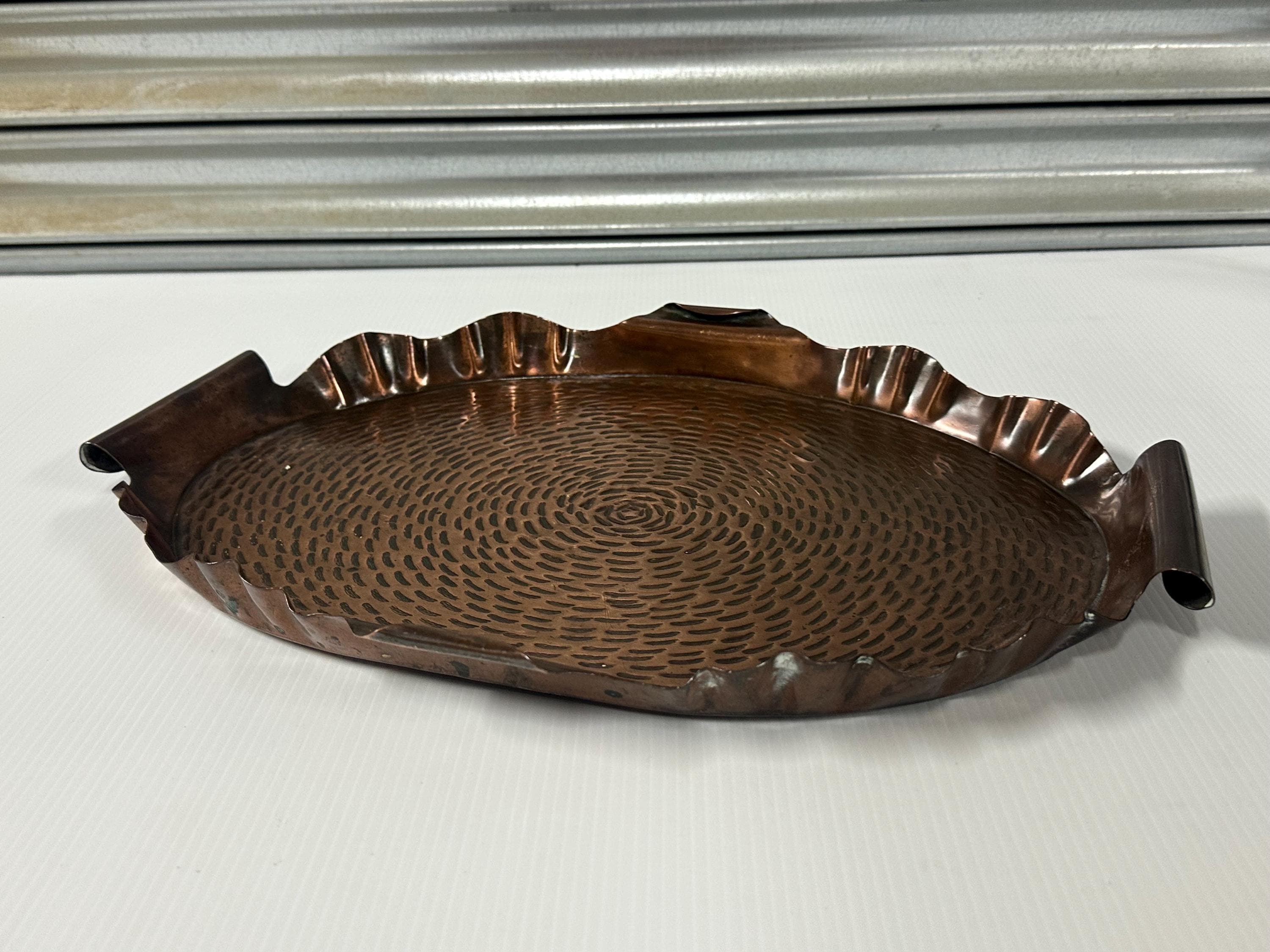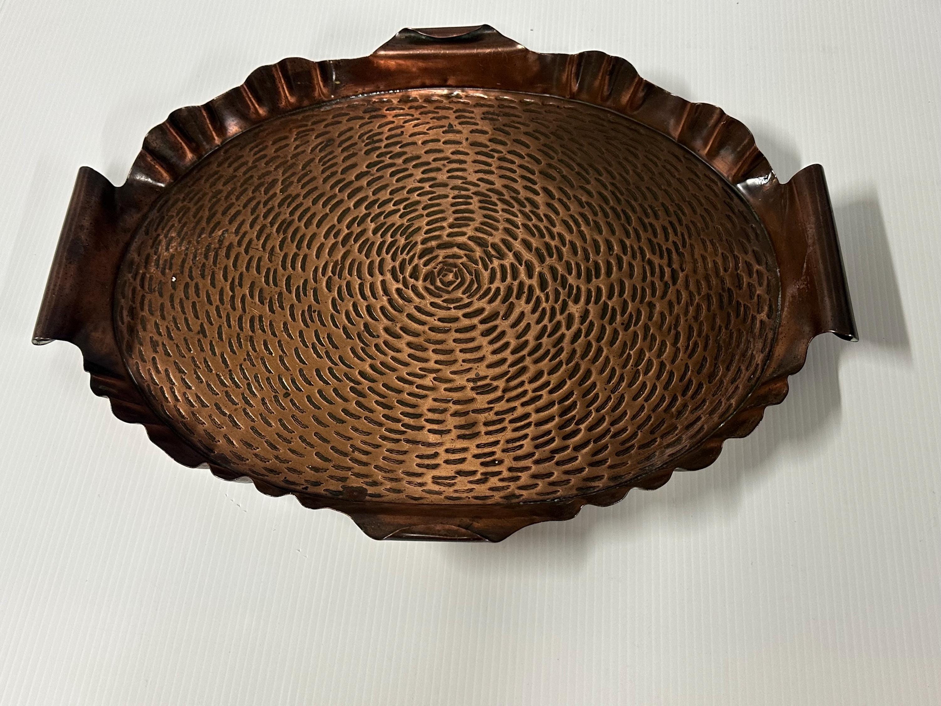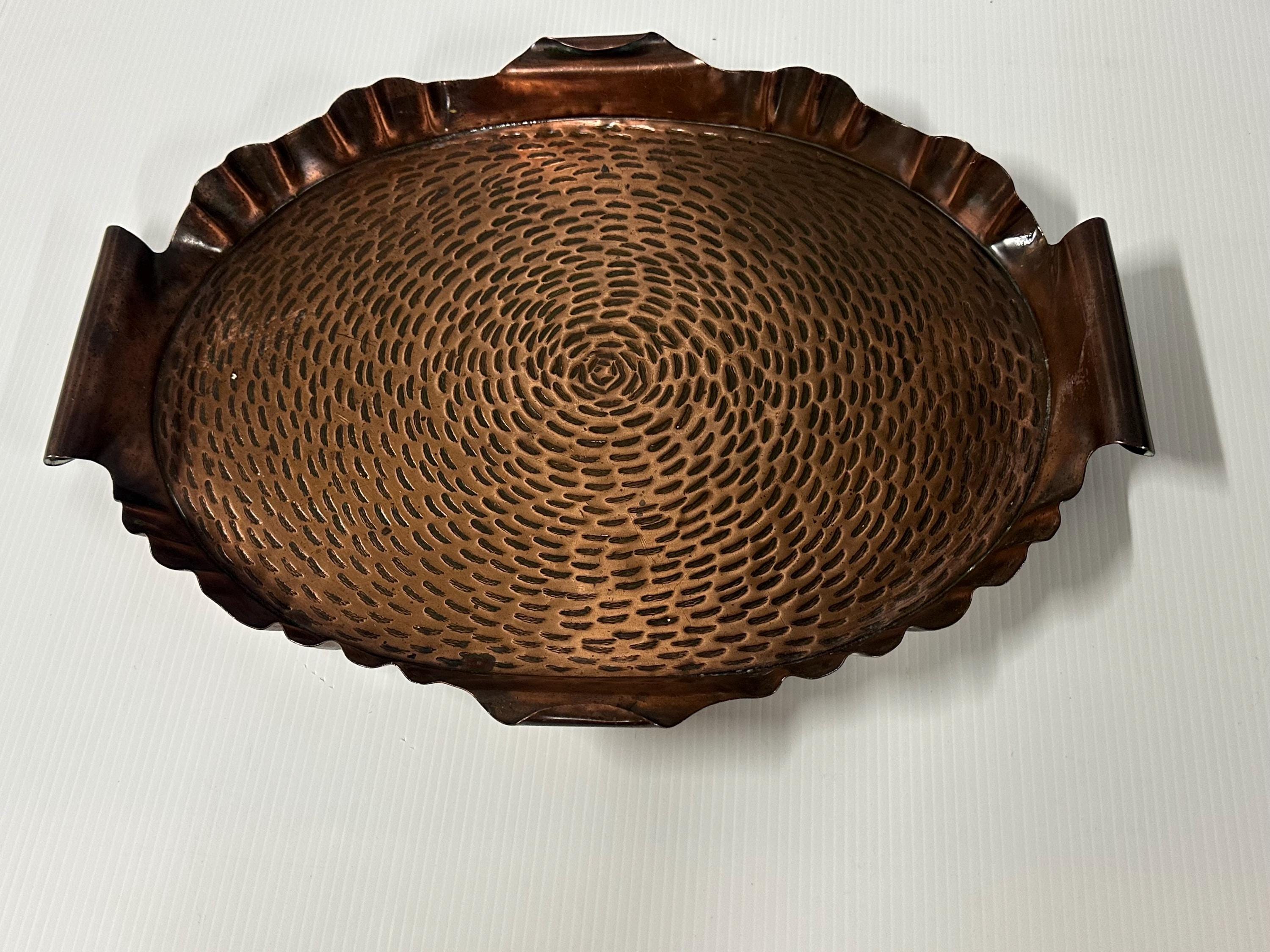This tray displays a rich, warm copper tone with age-related patina that enhances its character. Perfect for collectors of antique metalware or as a striking decorative accent in the home.