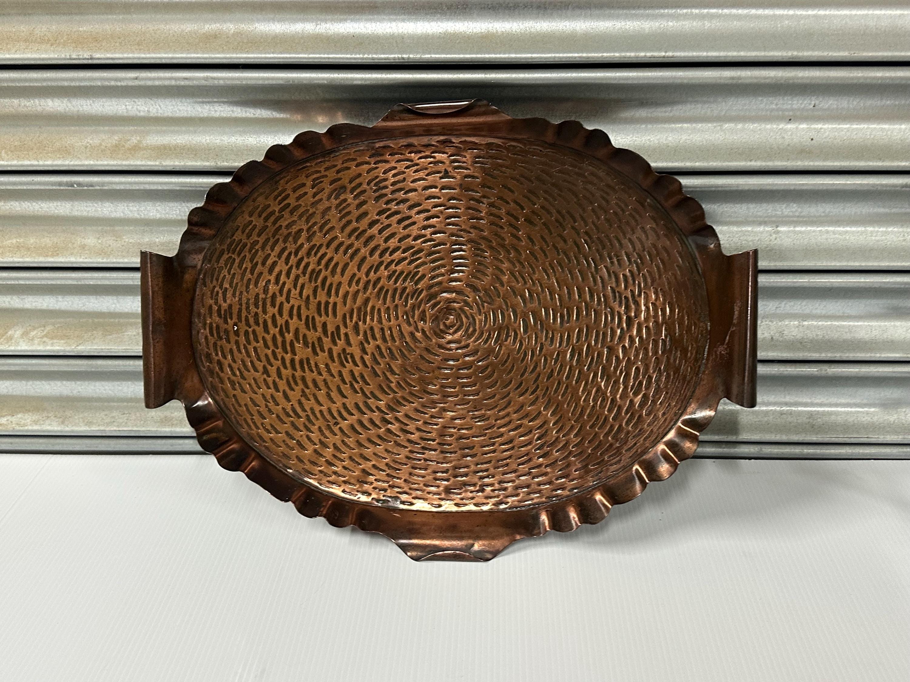 A beautiful Victorian-era hand-beaten copper tray, skilfully crafted with a distinctive spiral hammered pattern to the centre and finished with elegant ruffled edges and rolled side handles. A true example of late 19th to early 20th-century Art Nouveau metalwork, showcasing the organic, decorative style typical of the period.