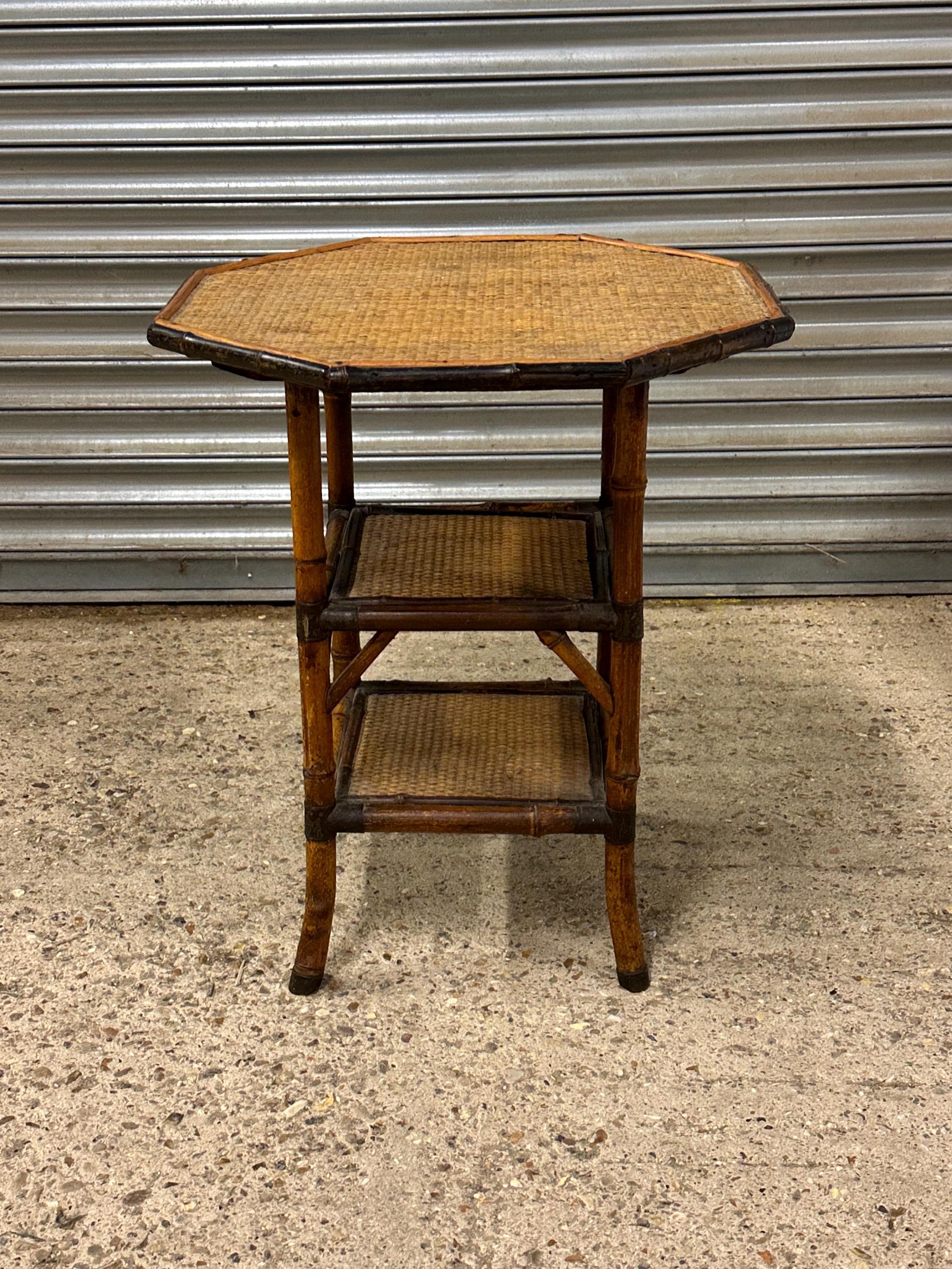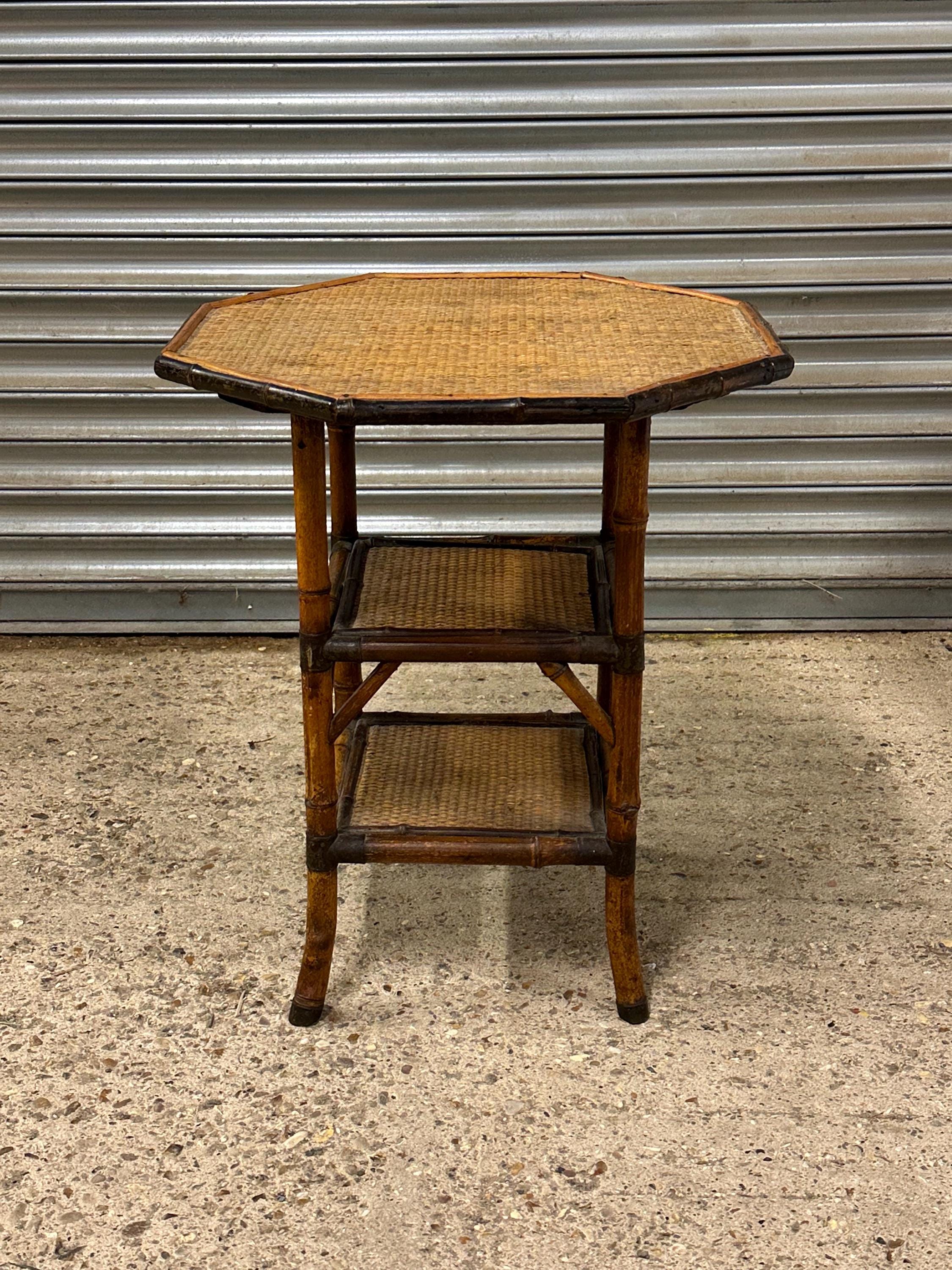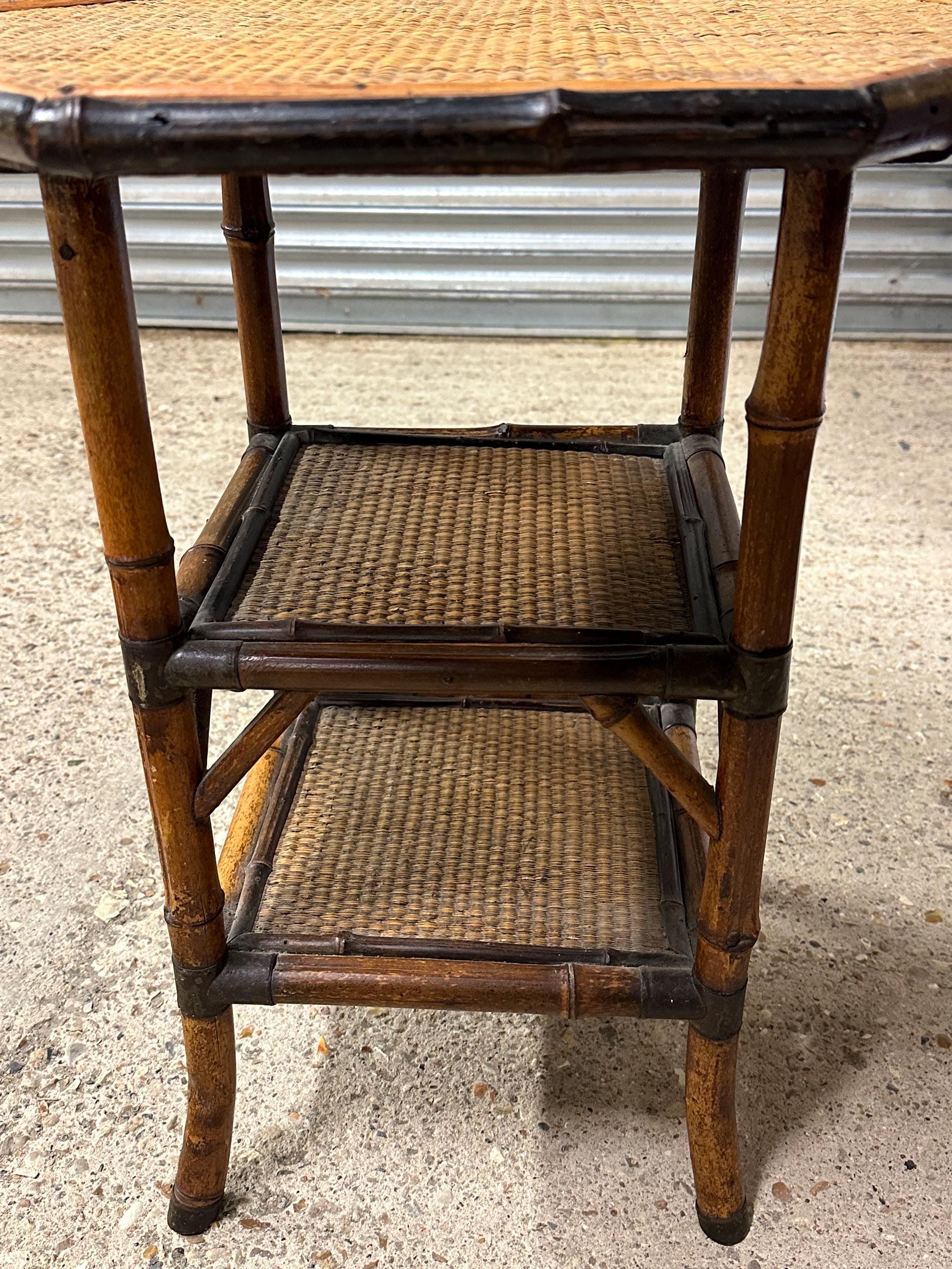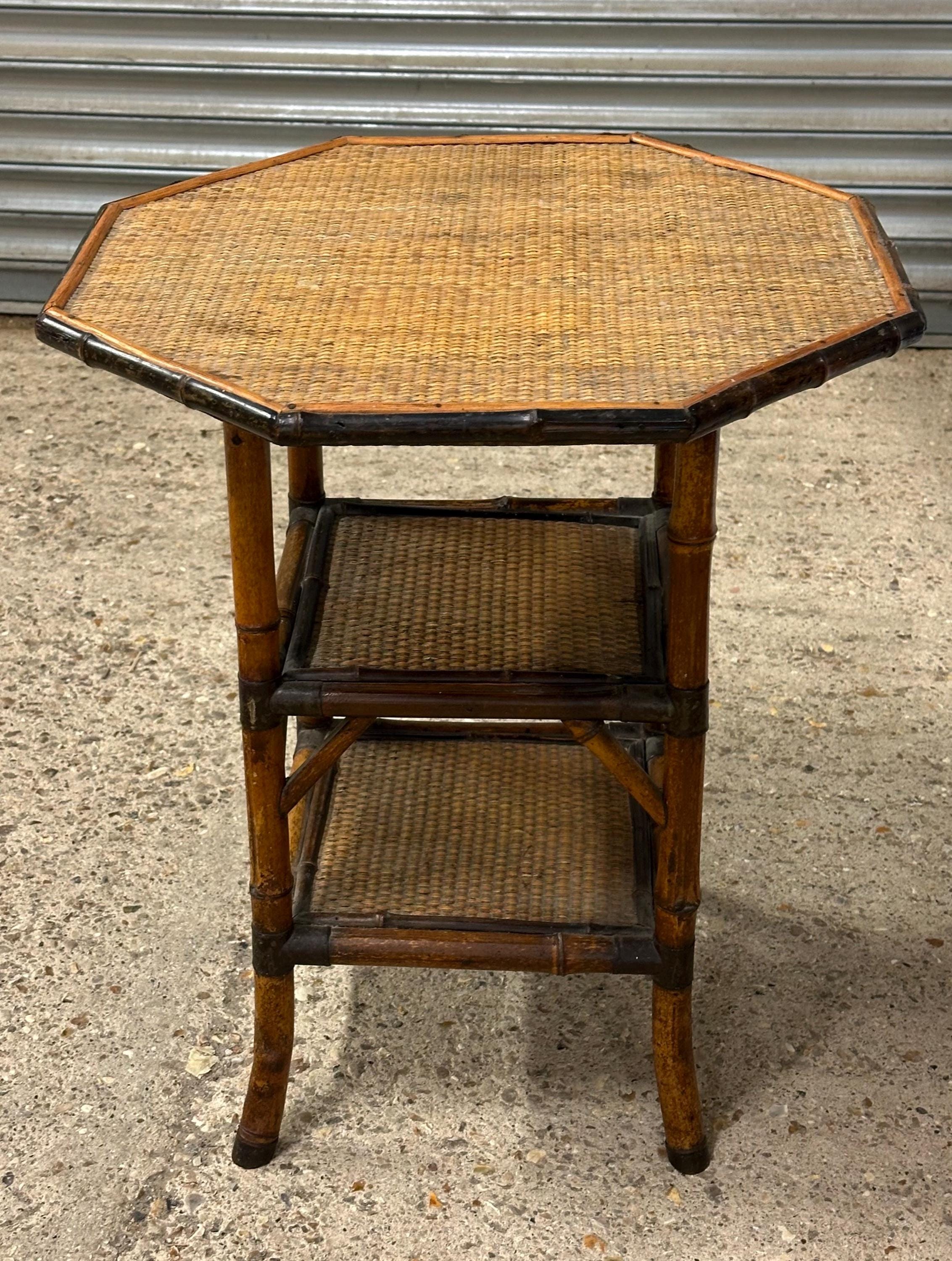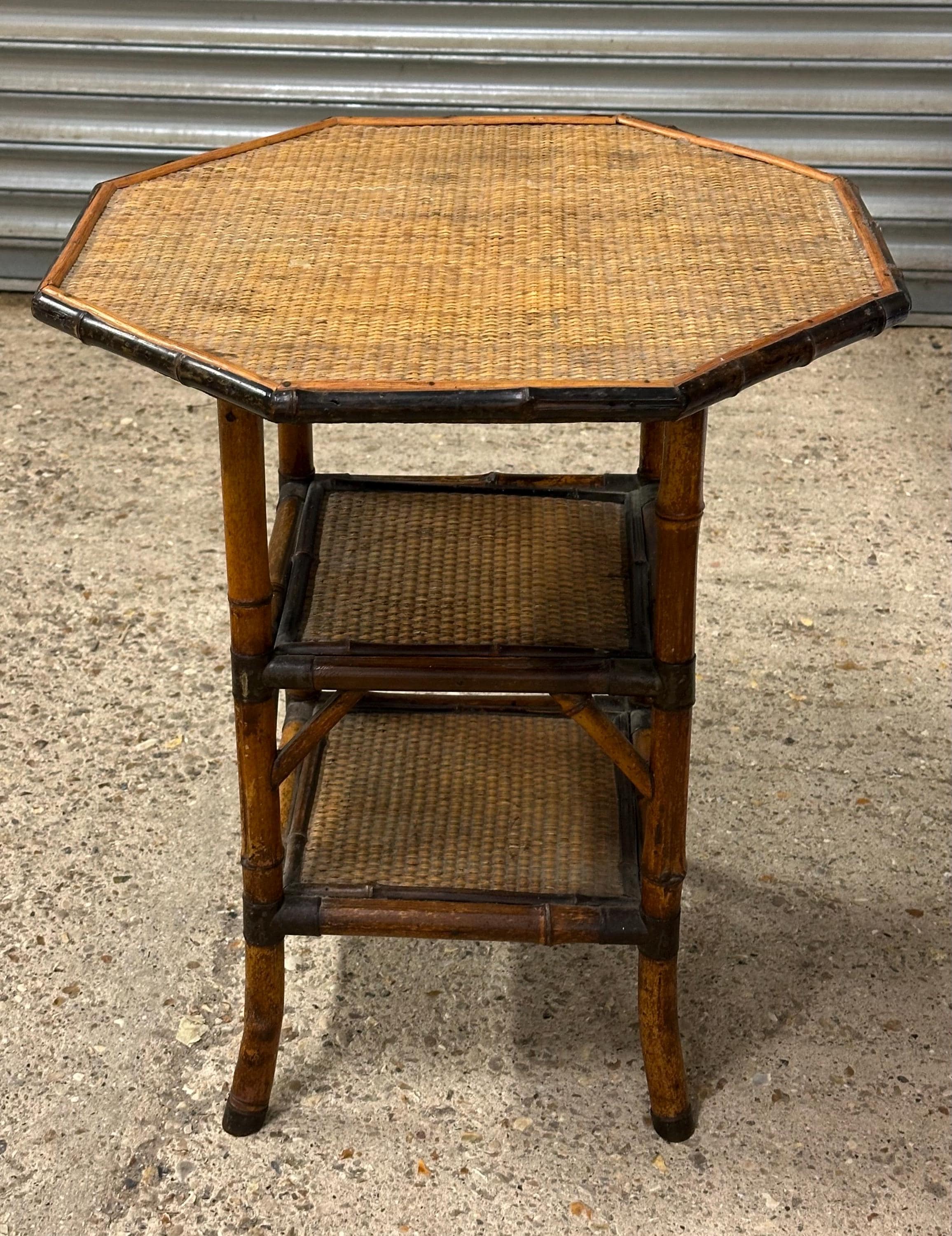 A charming and highly decorative late 19th-century Aesthetic Movement bamboo side table, featuring a beautiful octagonal woven cane top and two lower woven rattan shelves. Classic of the period, this piece showcases the elegant Japonesque influences so popular in the 1880s–1900s, with naturally aged bamboo, warm patina, and gently splayed legs.
