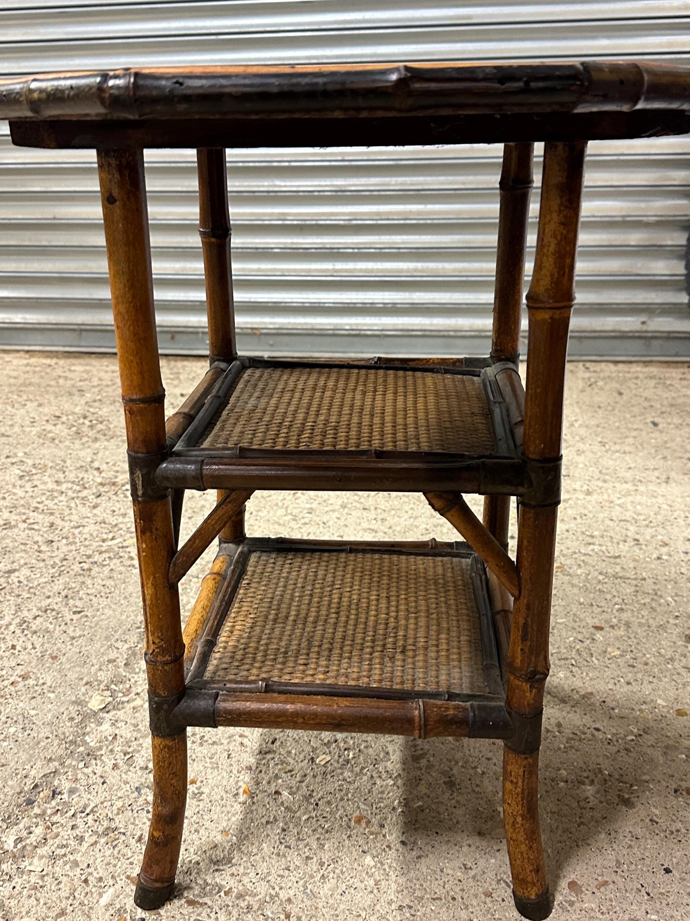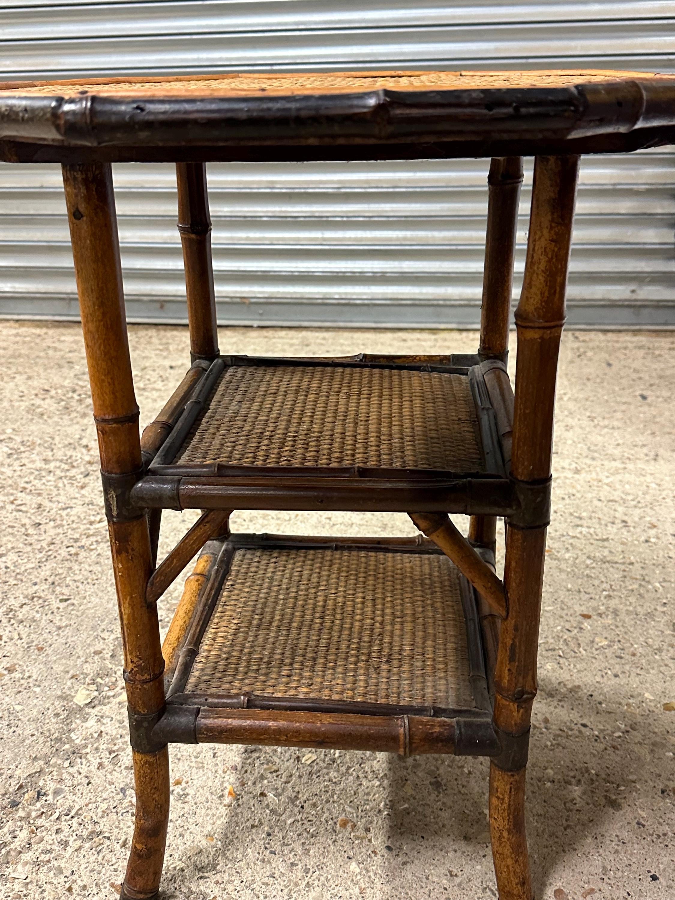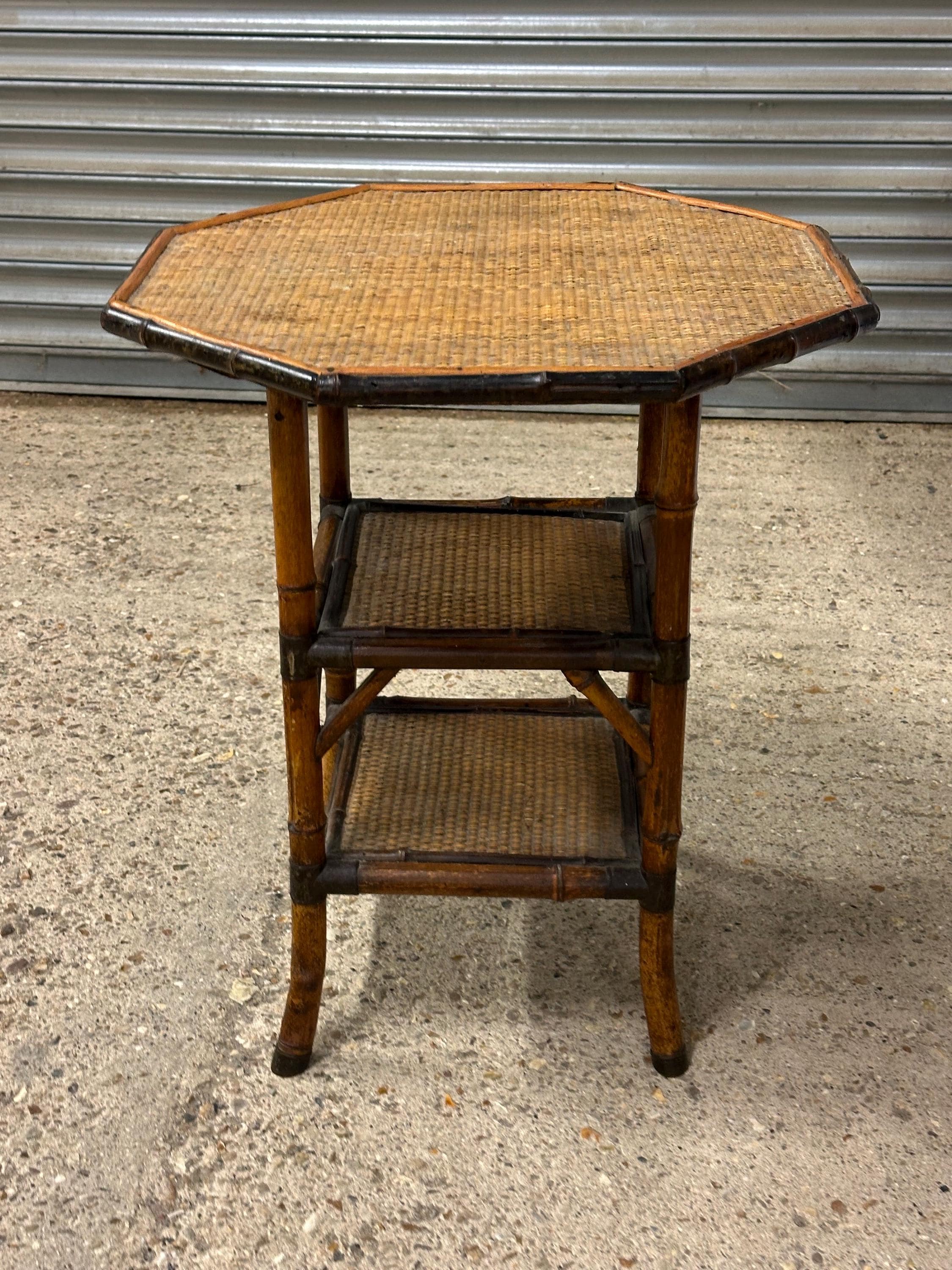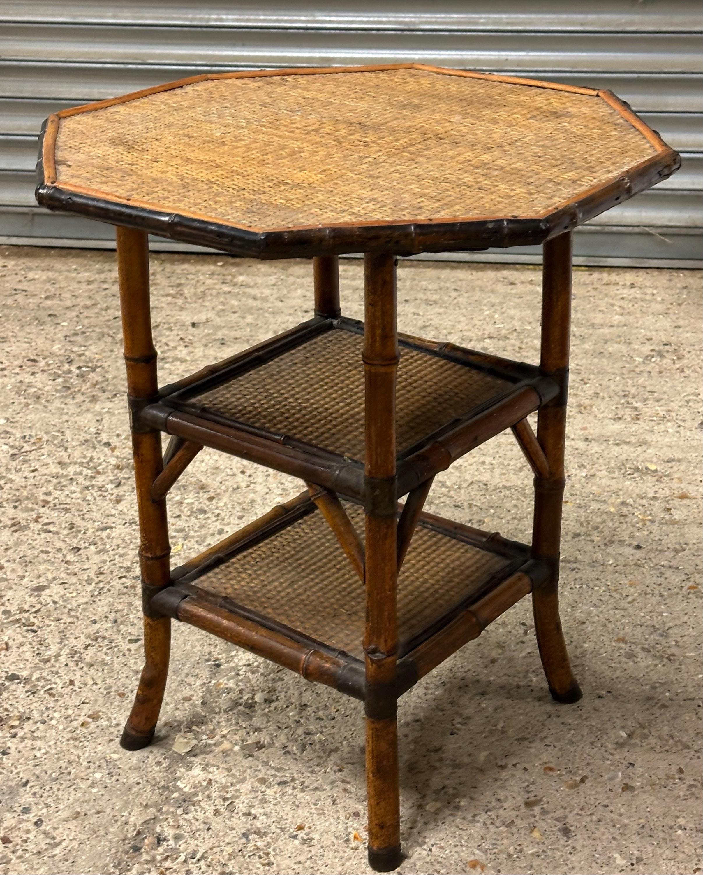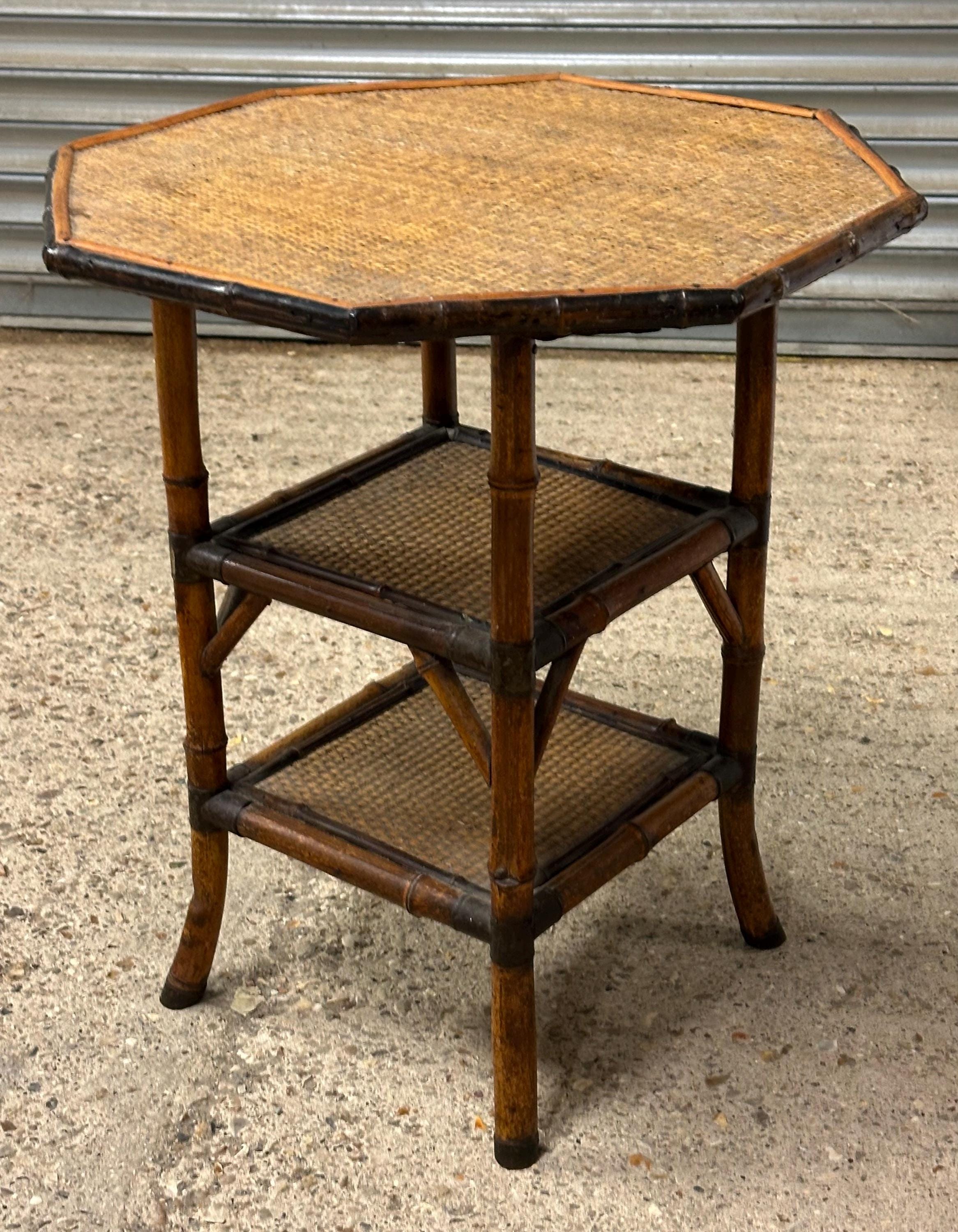 A charming and highly decorative late 19th-century Aesthetic Movement bamboo side table, featuring a beautiful octagonal woven cane top and two lower woven rattan shelves. Classic of the period, this piece showcases the elegant Japonesque influences so popular in the 1880s–1900s, with naturally aged bamboo, warm patina, and gently splayed legs.