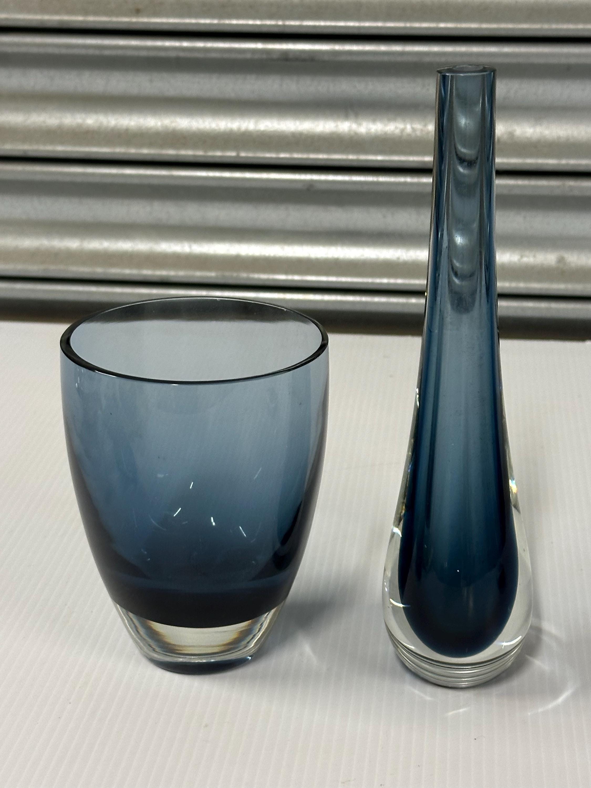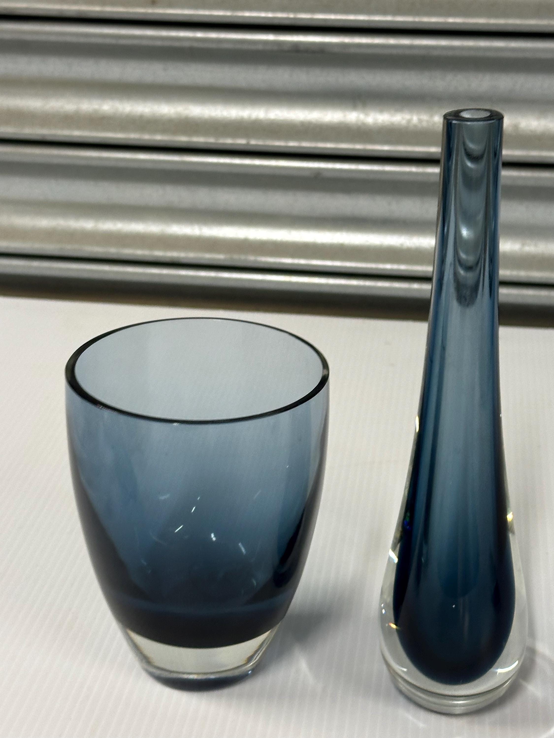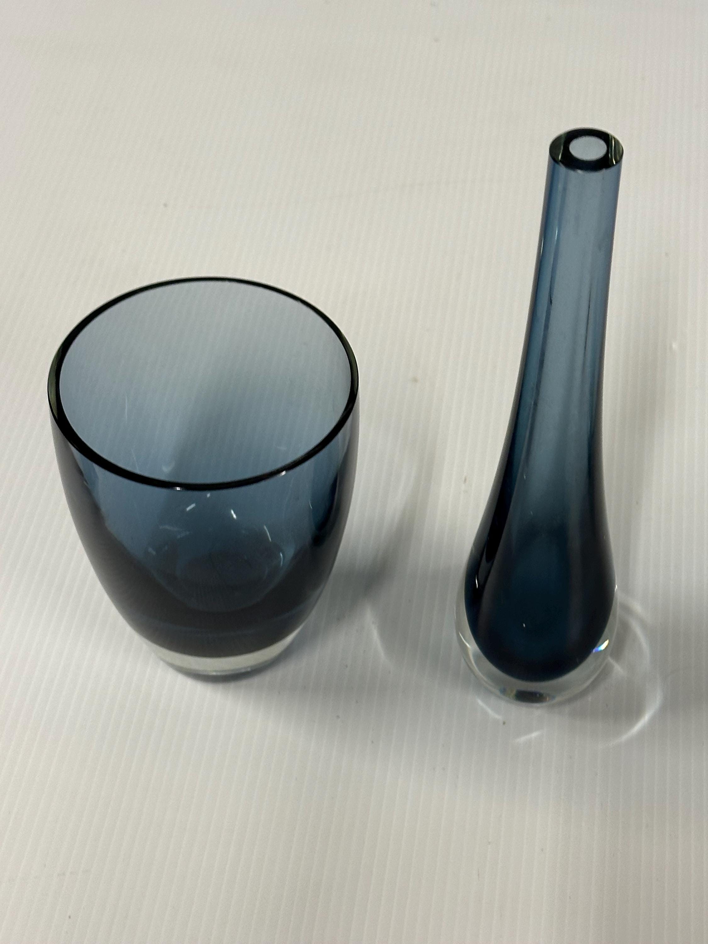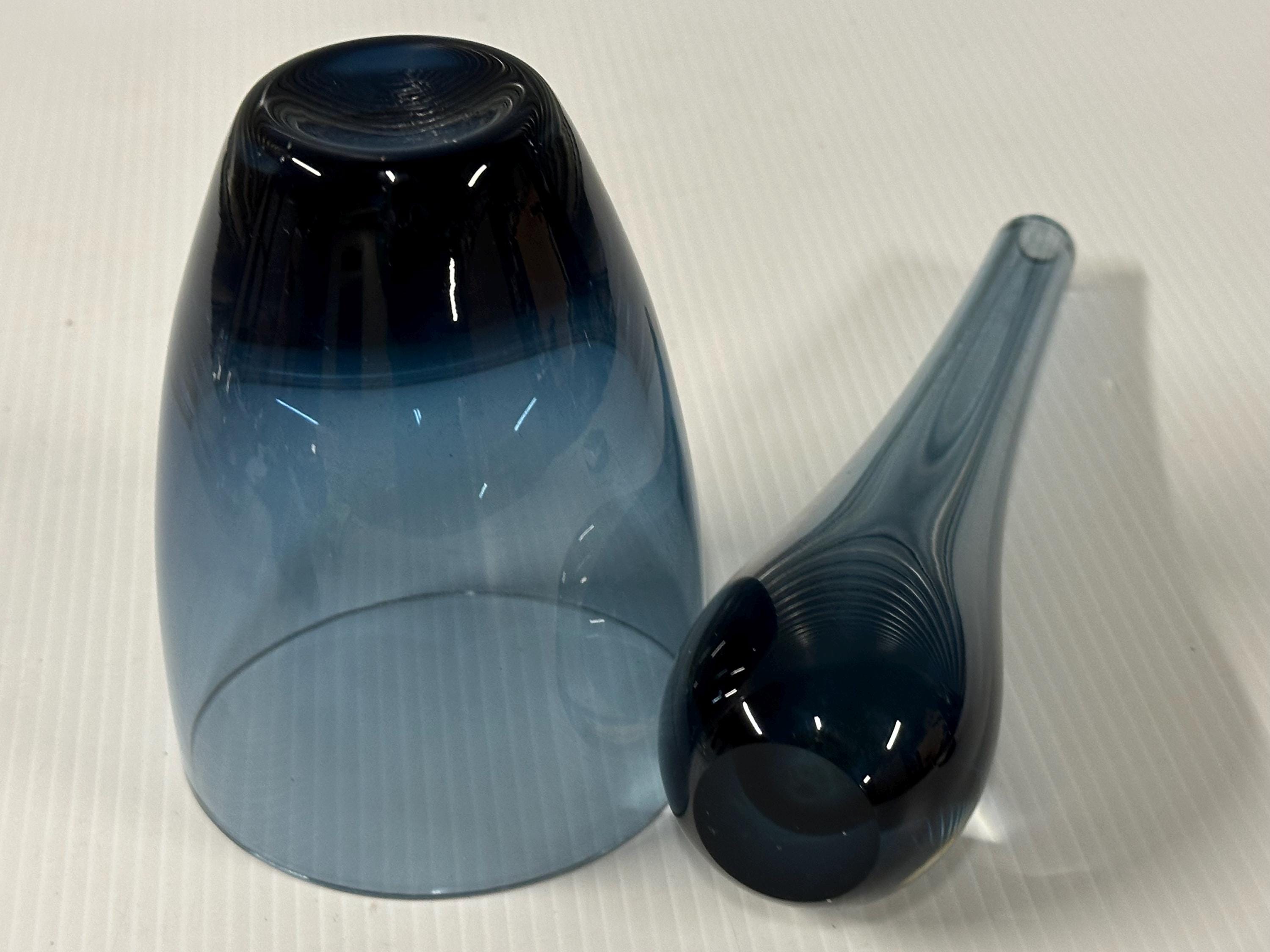 A beautifully complementary pair of mid-century art glass pieces, each hand-crafted with the clean lines and subtle colour gradients associated with Scandinavian design of the 1950s–70s.