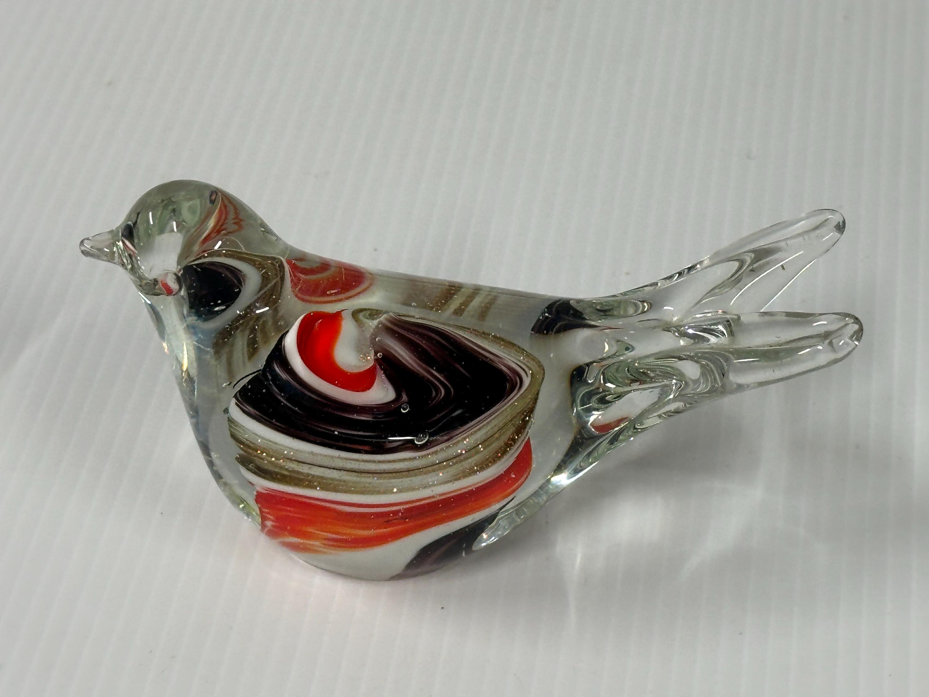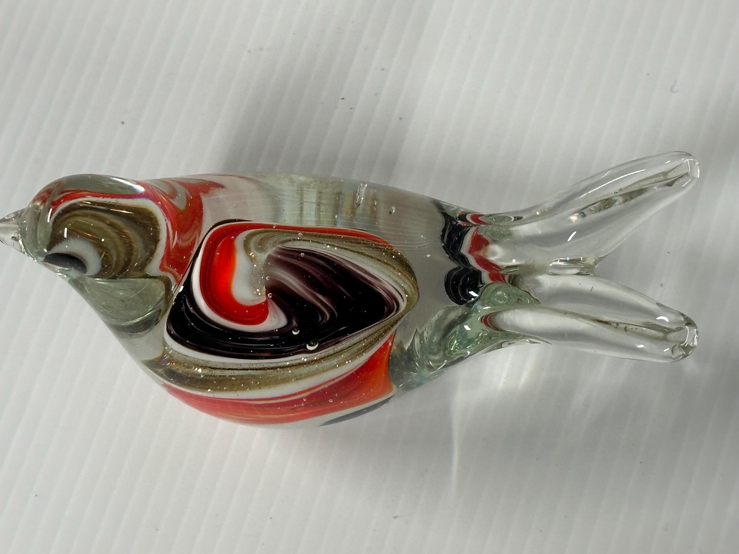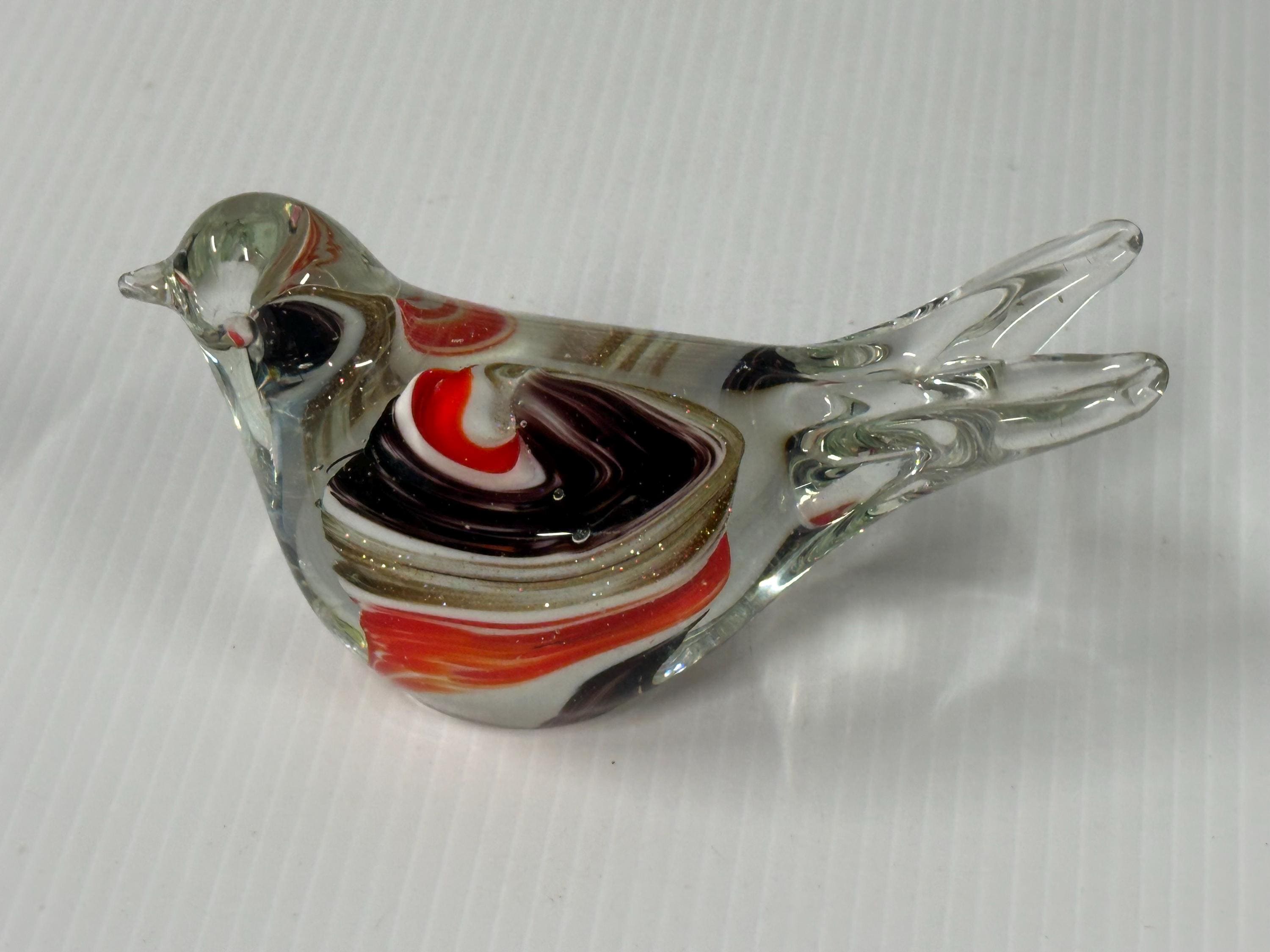 A striking vintage art glass bird ornament featuring vivid swirls of red, black, white and gold suspended within clear glass. Expertly hand-shaped with a graceful elongated tail and smooth, polished finish, this piece displays beautifully from all angles.