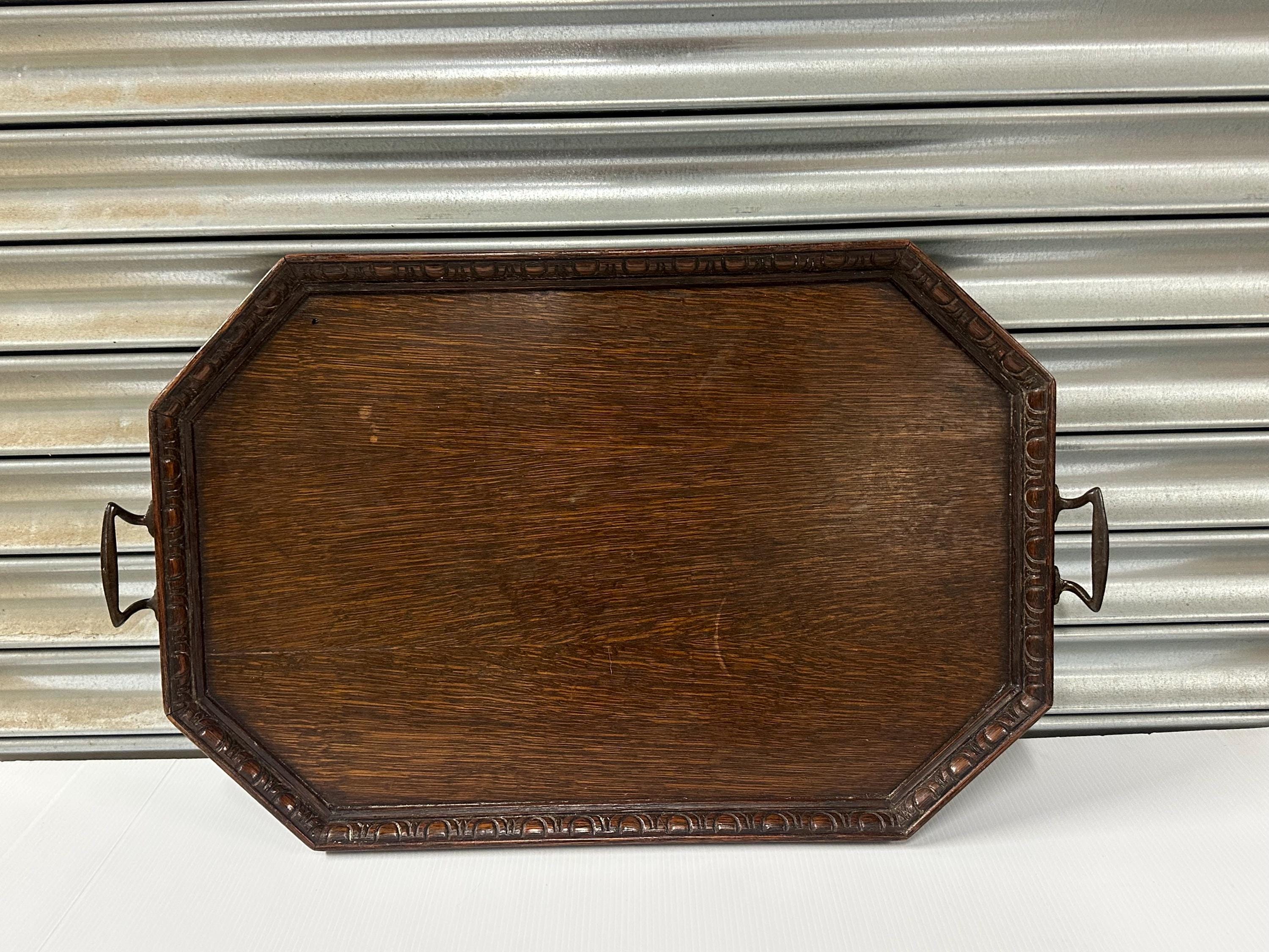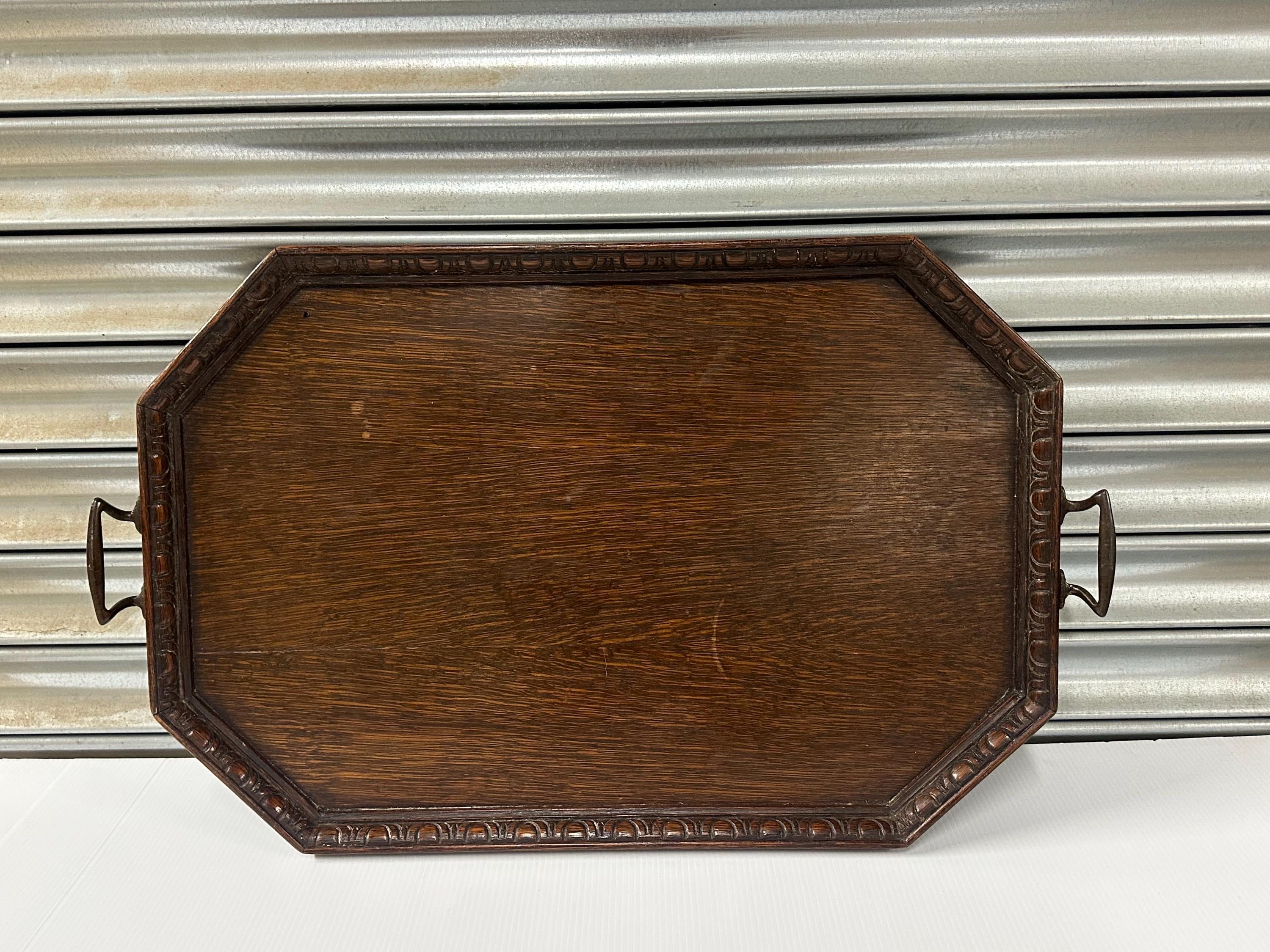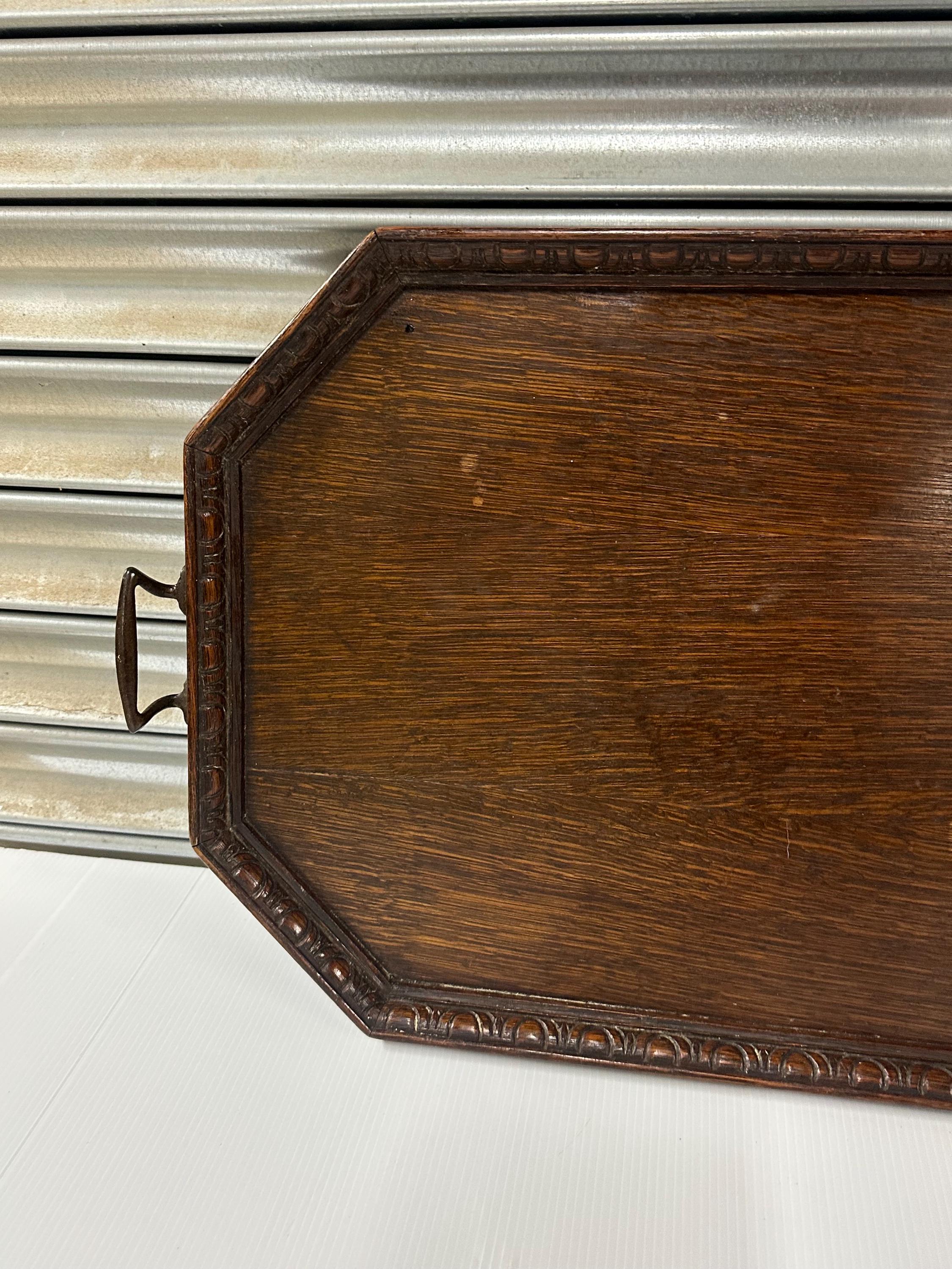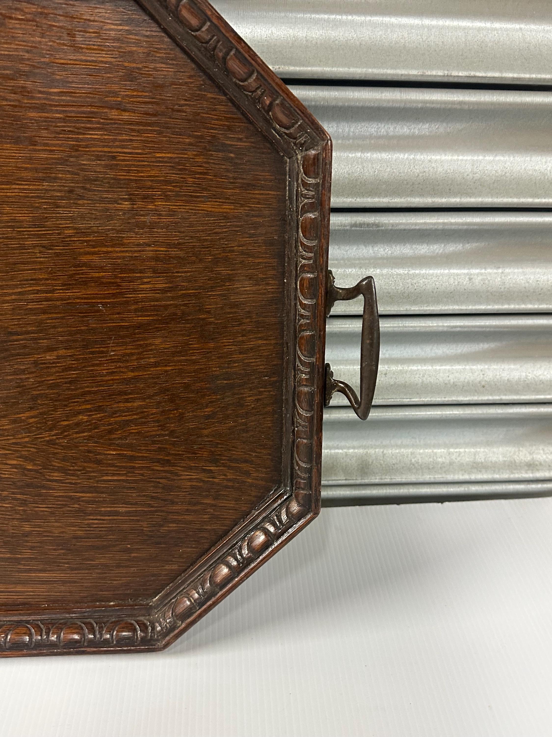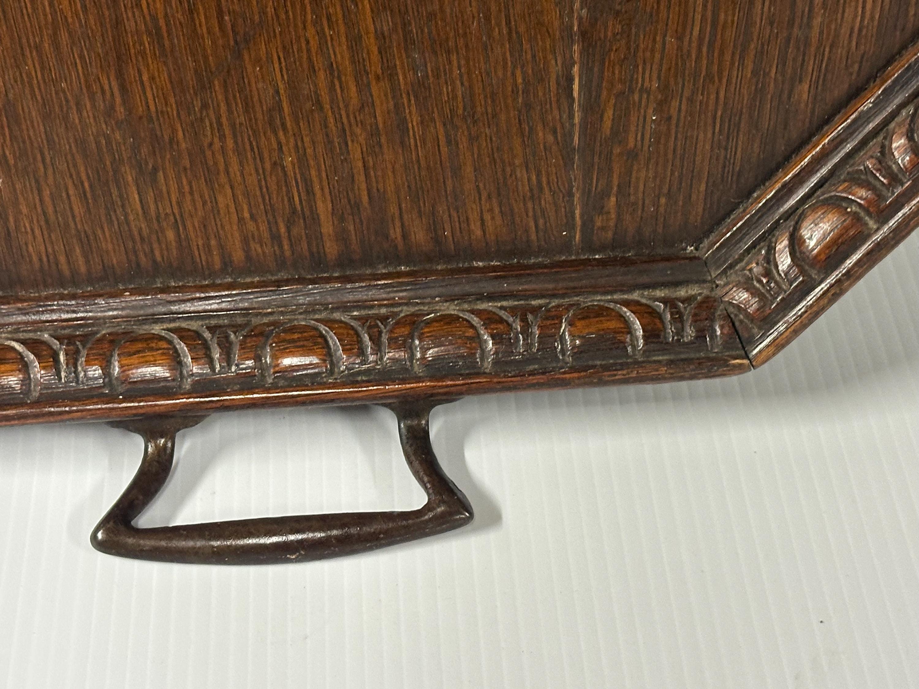 A charming antique oak serving tray dating from the early 20th century, featuring a beautifully hand-carved border and an attractive octagonal shape. The tray is crafted from solid oak with a rich, warm patina that has developed naturally over time. The carved edge displays a repeating scalloped motif, adding a touch of Arts & Crafts character.