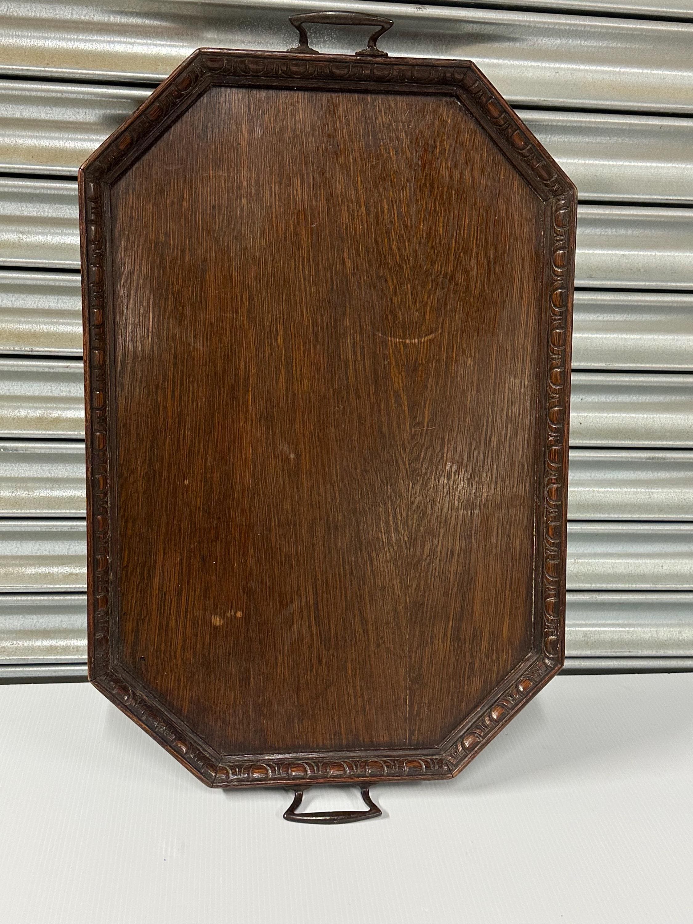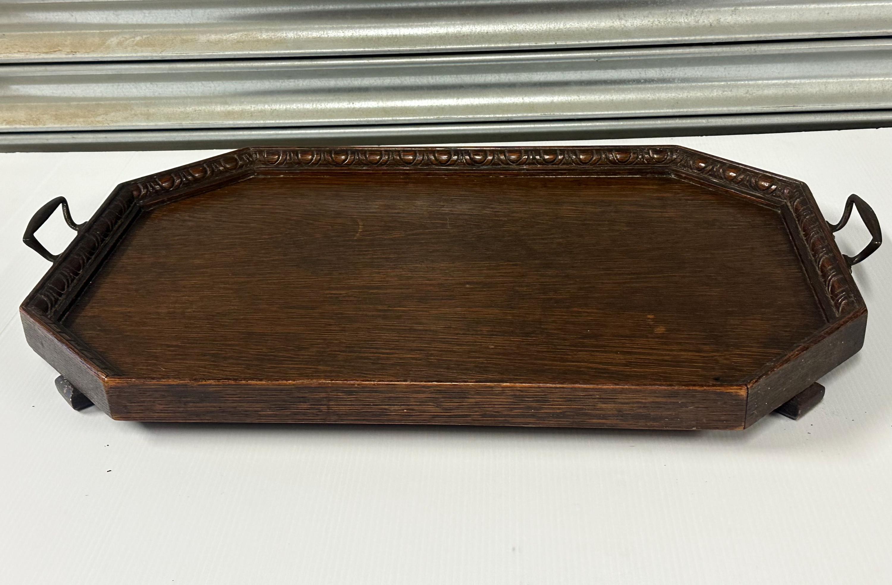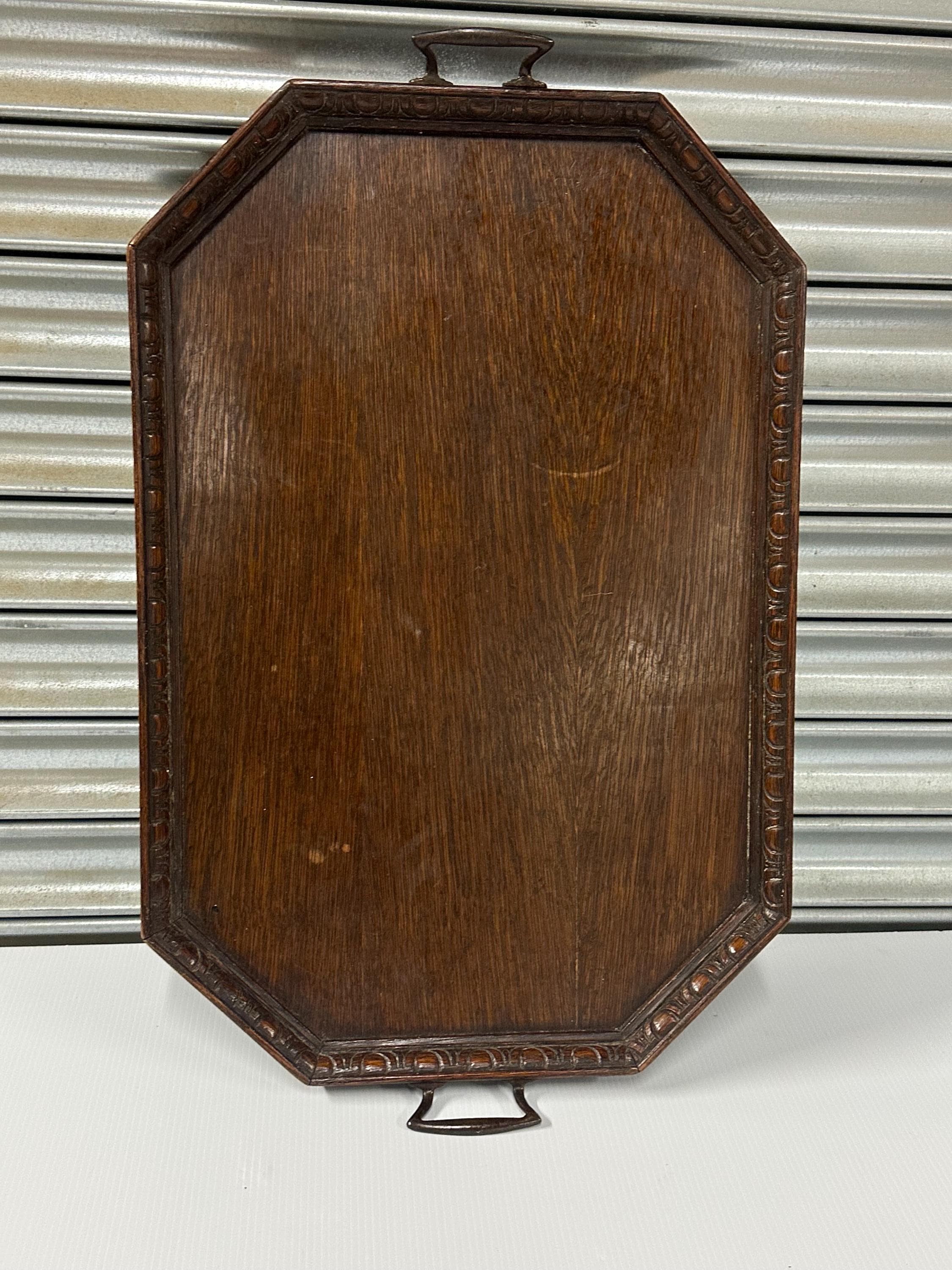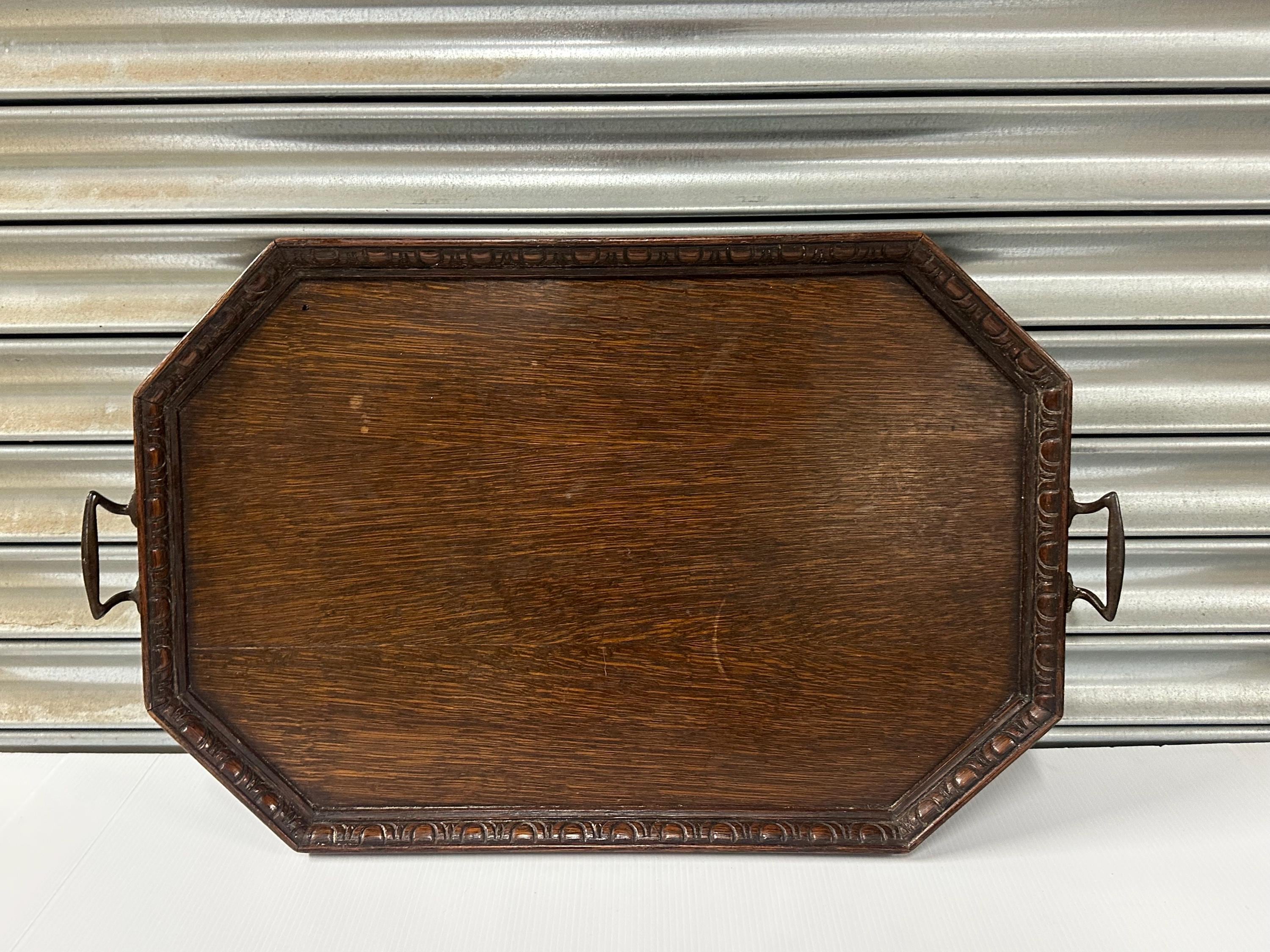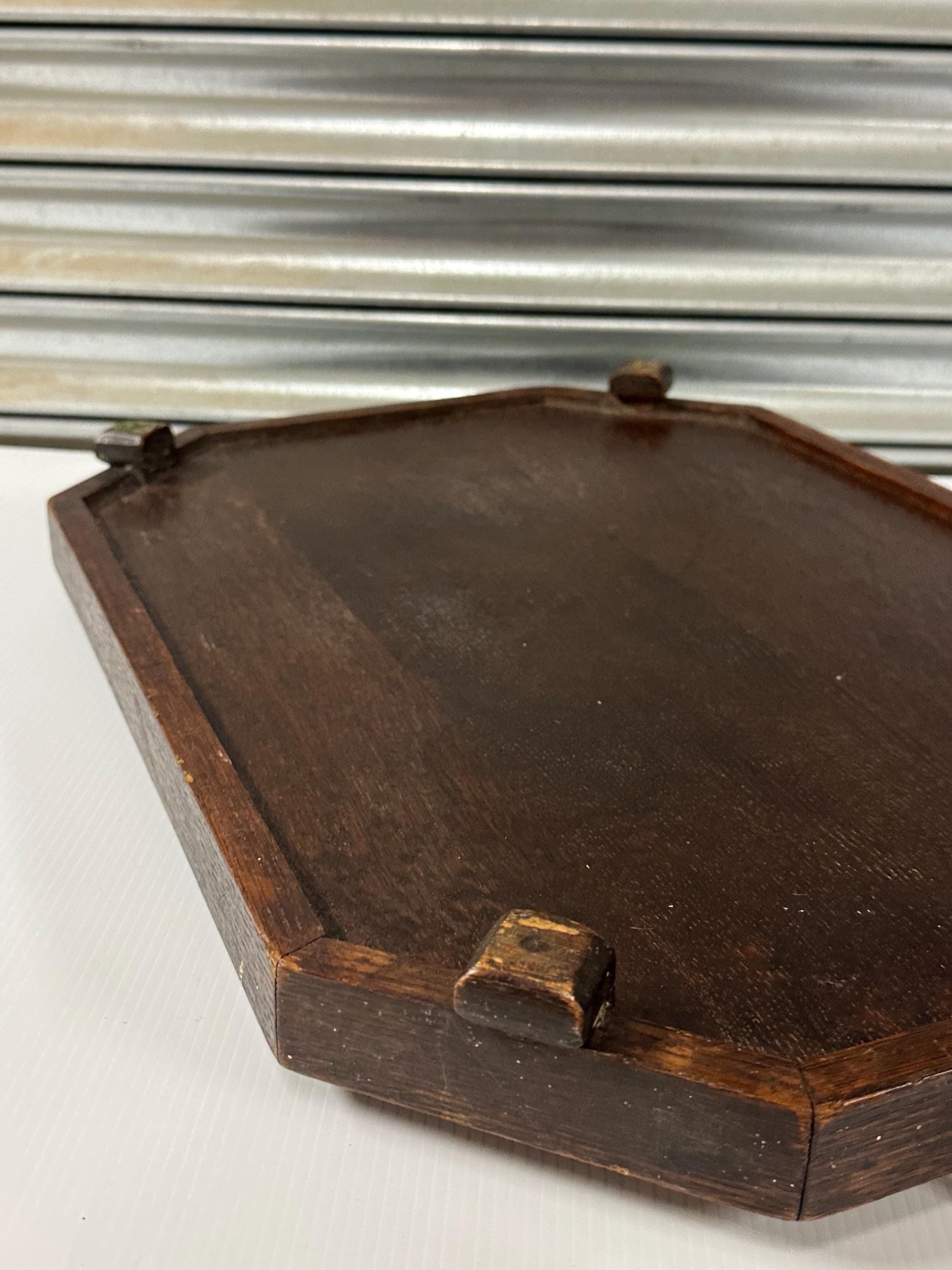 A charming antique oak serving tray dating from the early 20th century, featuring a beautifully hand-carved border and an attractive octagonal shape. The tray is crafted from solid oak with a rich, warm patina that has developed naturally over time. The carved edge displays a repeating scalloped motif, adding a touch of Arts & Crafts character.