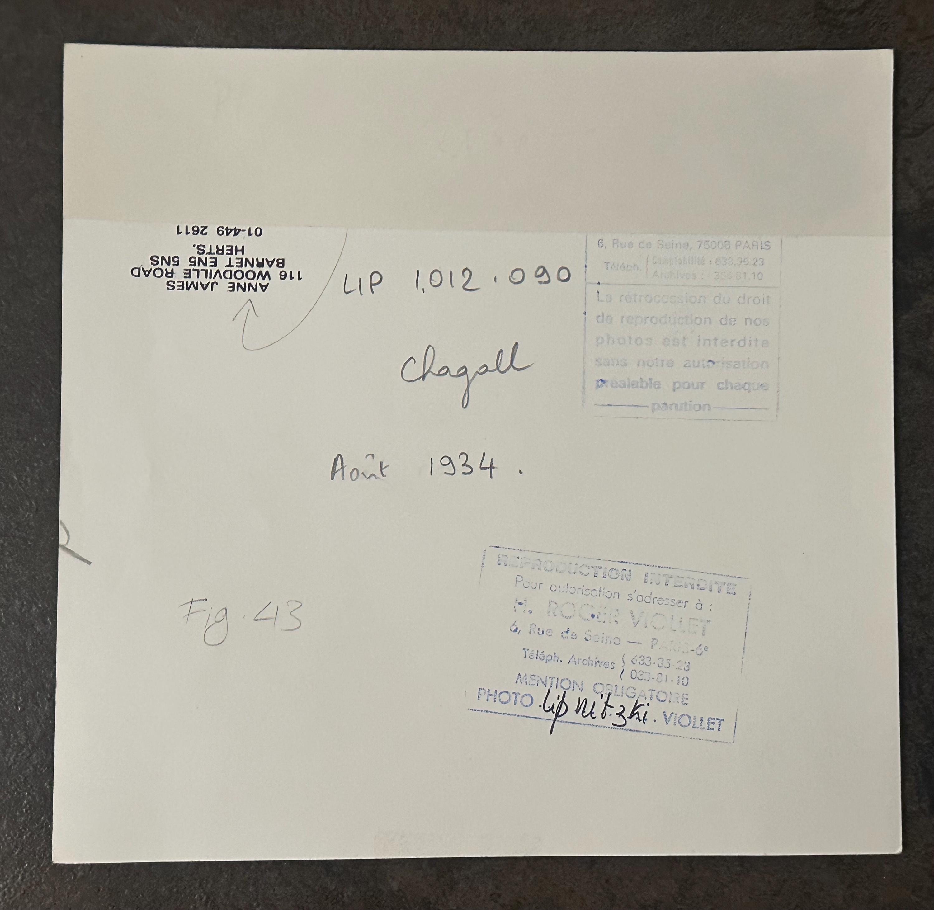 This striking black-and-white photograph captures artist Marc Chagall at work on a painting in August 1934, during the early and highly influential period of his Paris career. The print is period-correct and not a later reproduction, confirmed by multiple studio stamps on the reverse and handwritten archival notes.