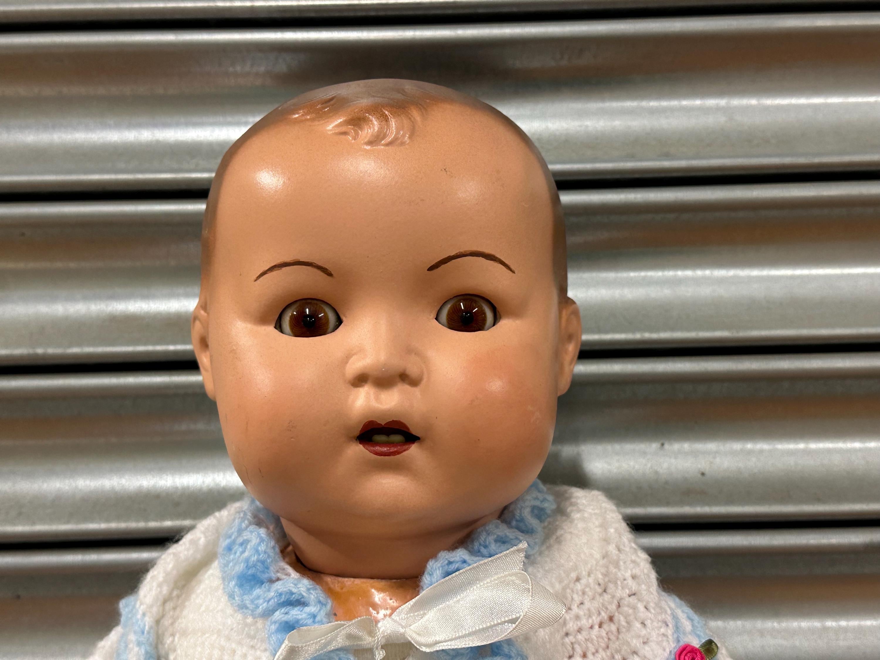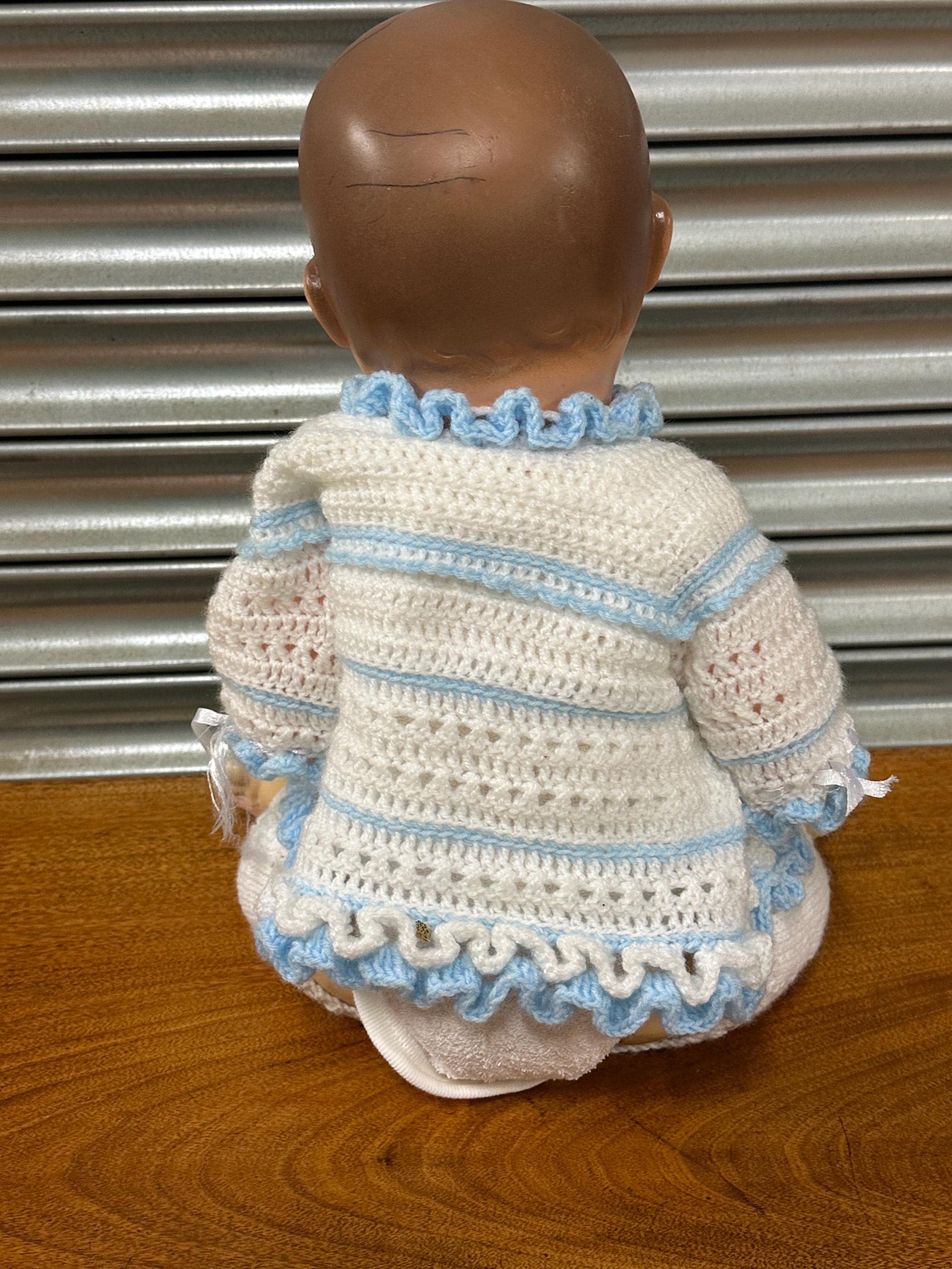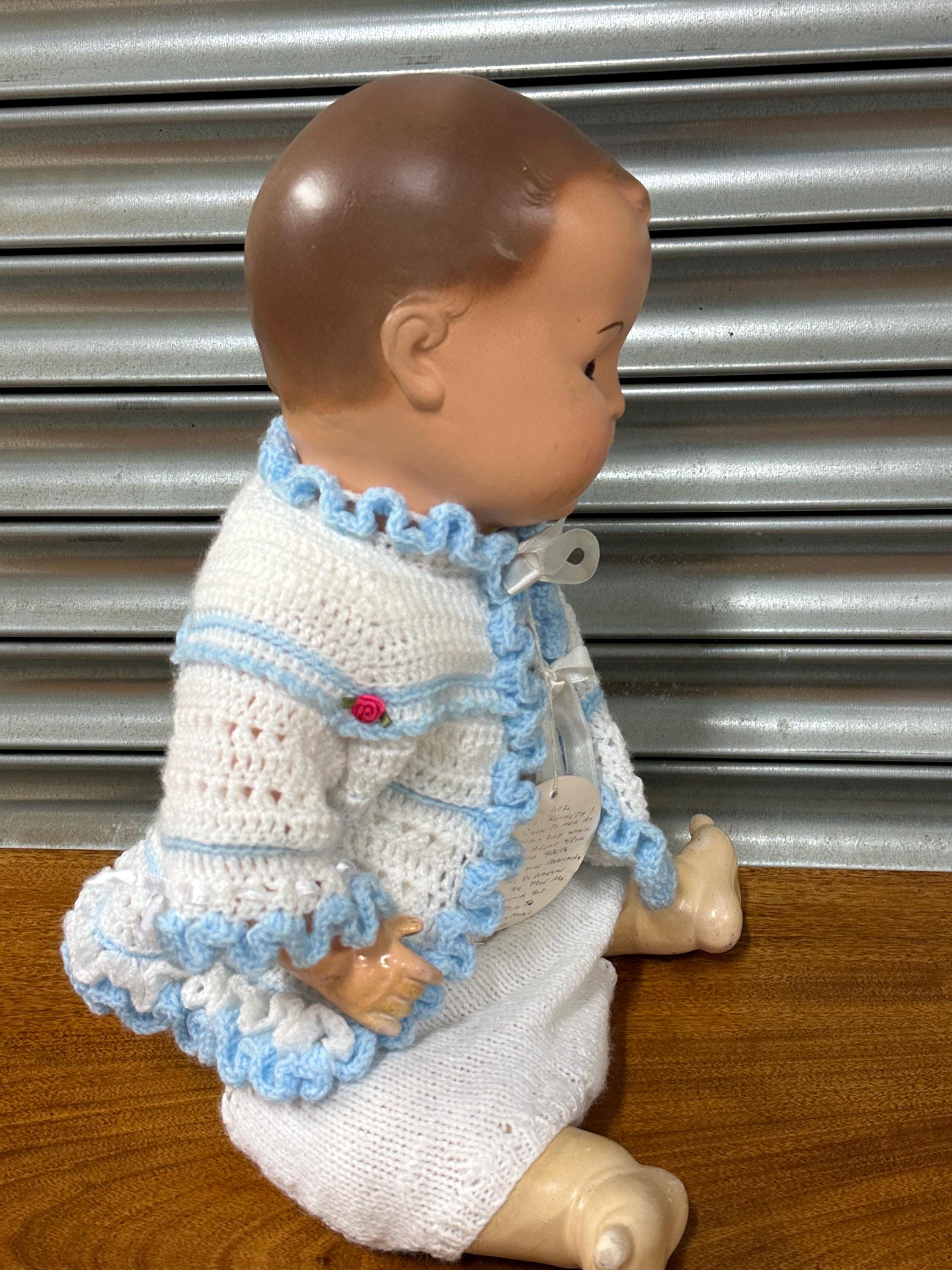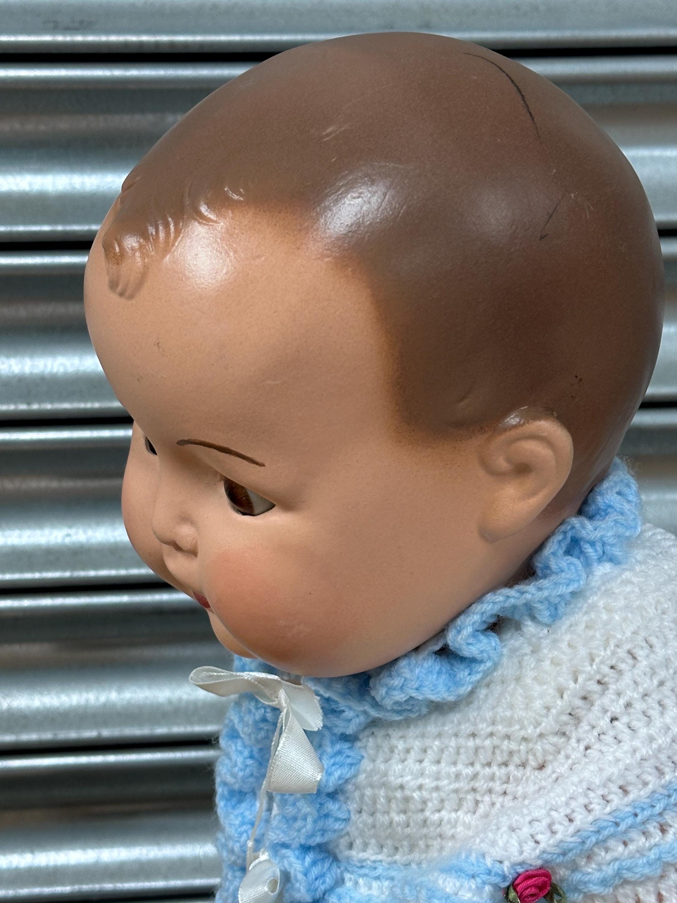 A charming early 1920s composition baby doll, featuring classic sleeping brown eyes, painted facial detail and the characteristic early 20th-century baby form. The doll wears a lovely set of handmade vintage crocheted cardigan in white and pale blue, adding to its nostalgic appeal.