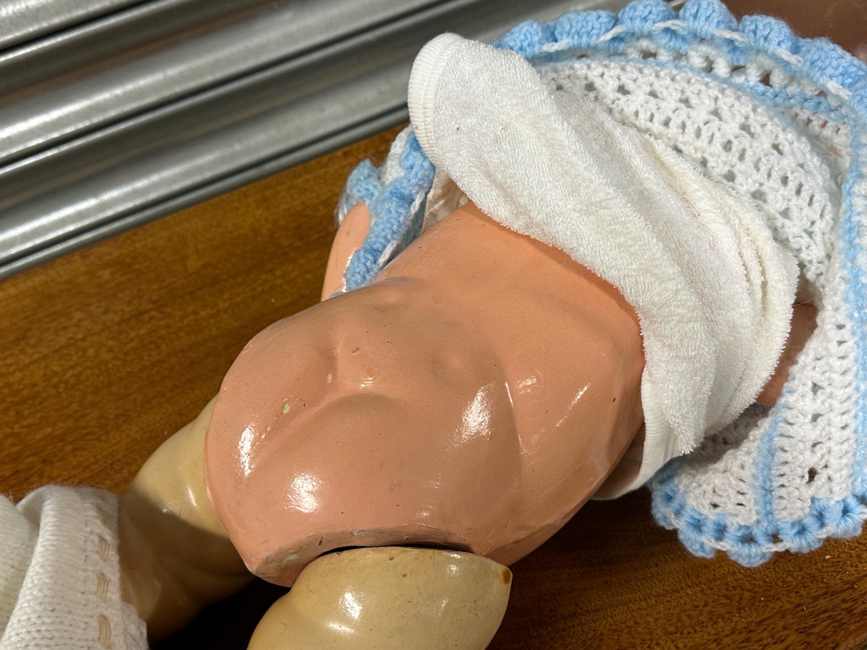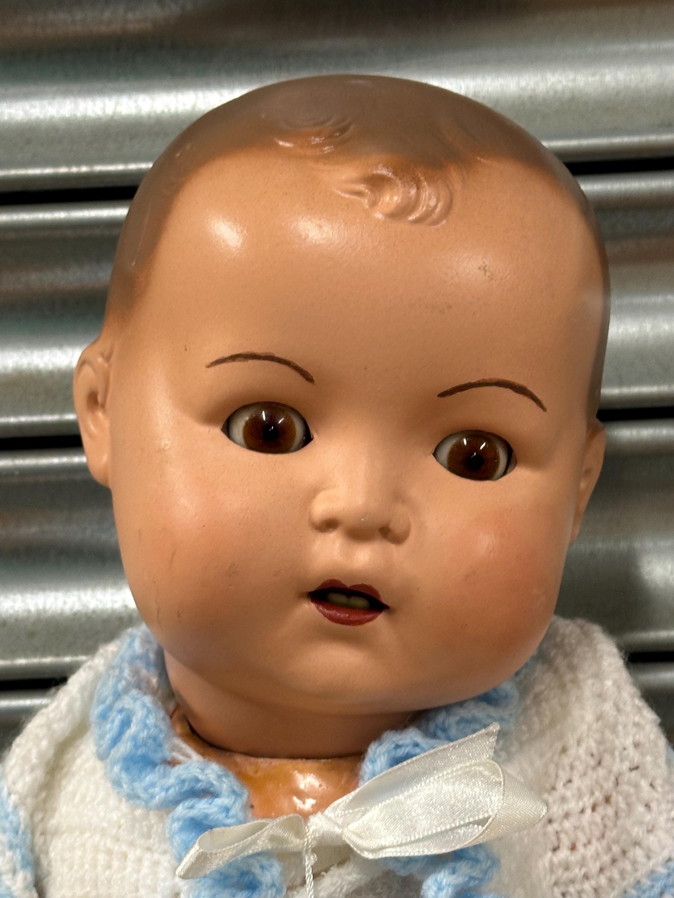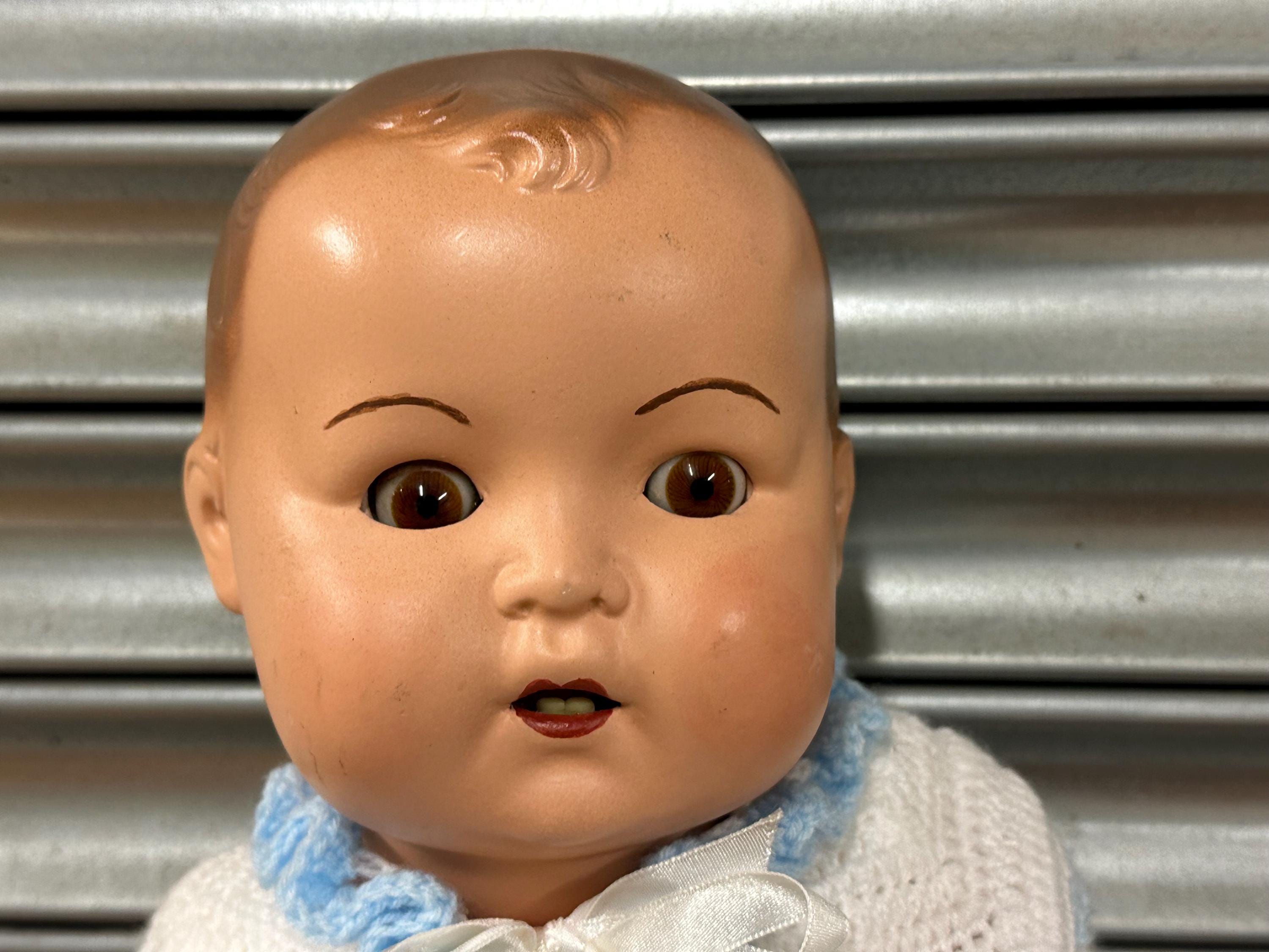 A charming early 1920s composition baby doll, featuring classic sleeping brown eyes, painted facial detail and the characteristic early 20th-century baby form. The doll wears a lovely set of handmade vintage crocheted cardigan in white and pale blue, adding to its nostalgic appeal.