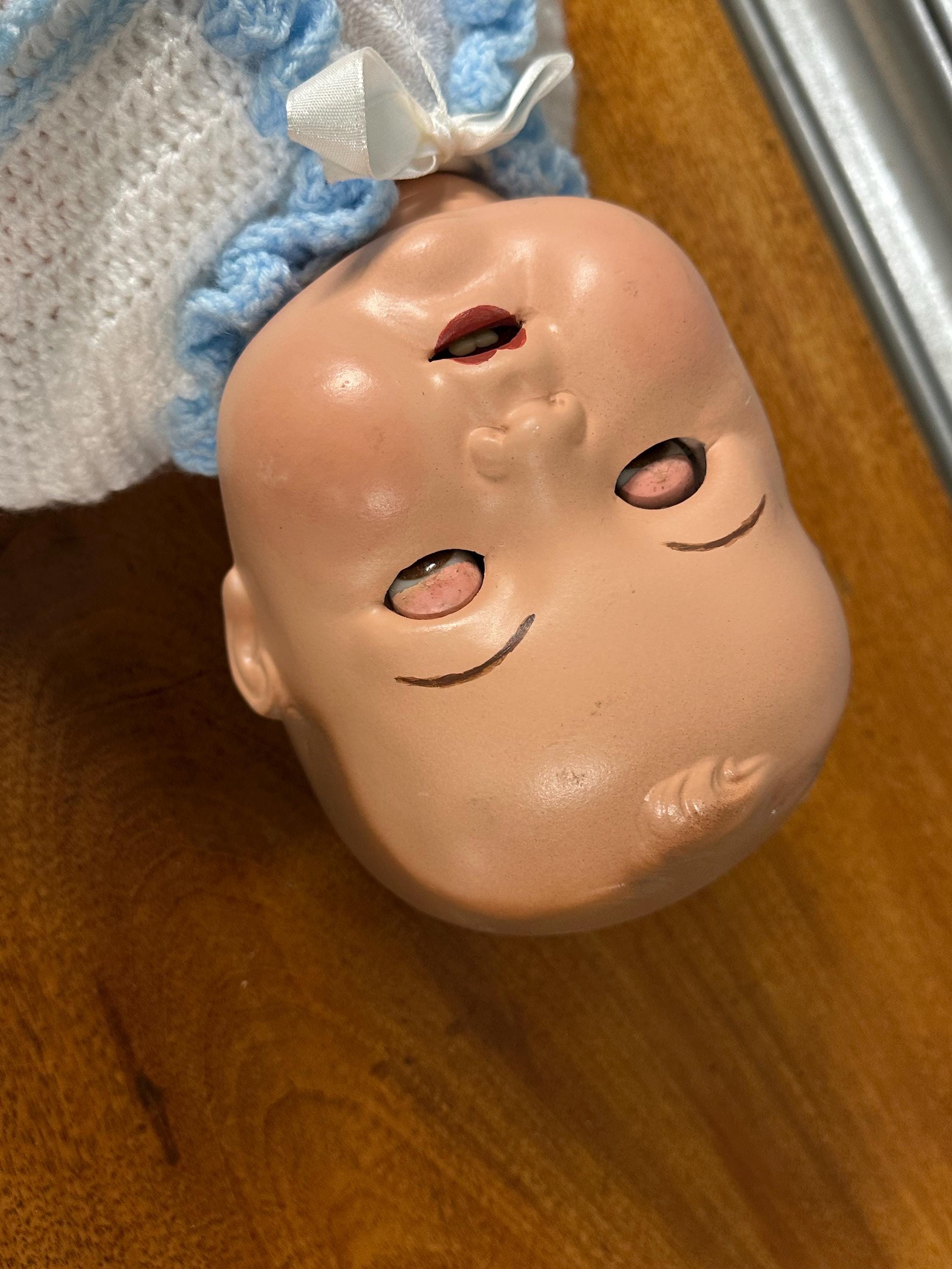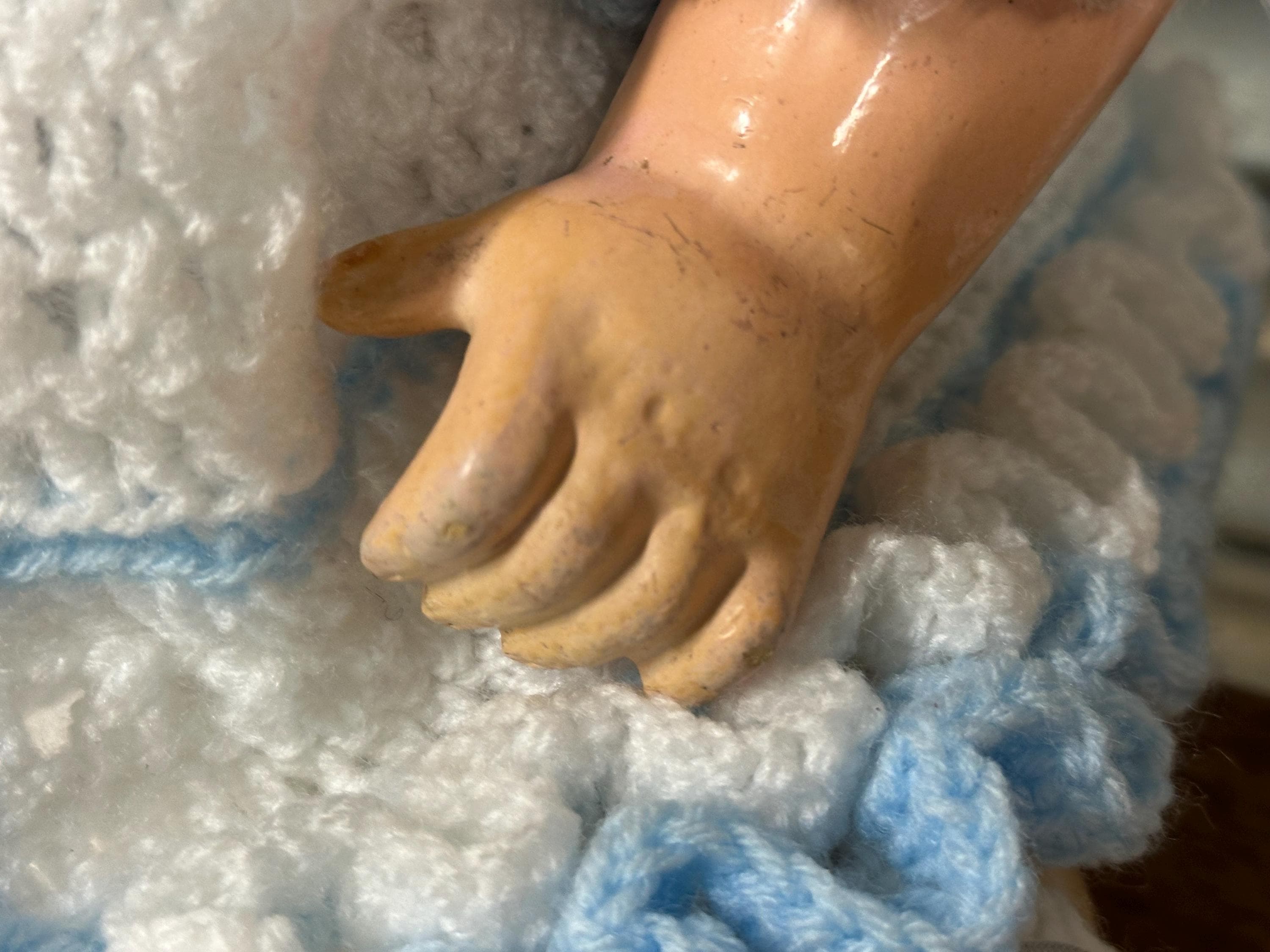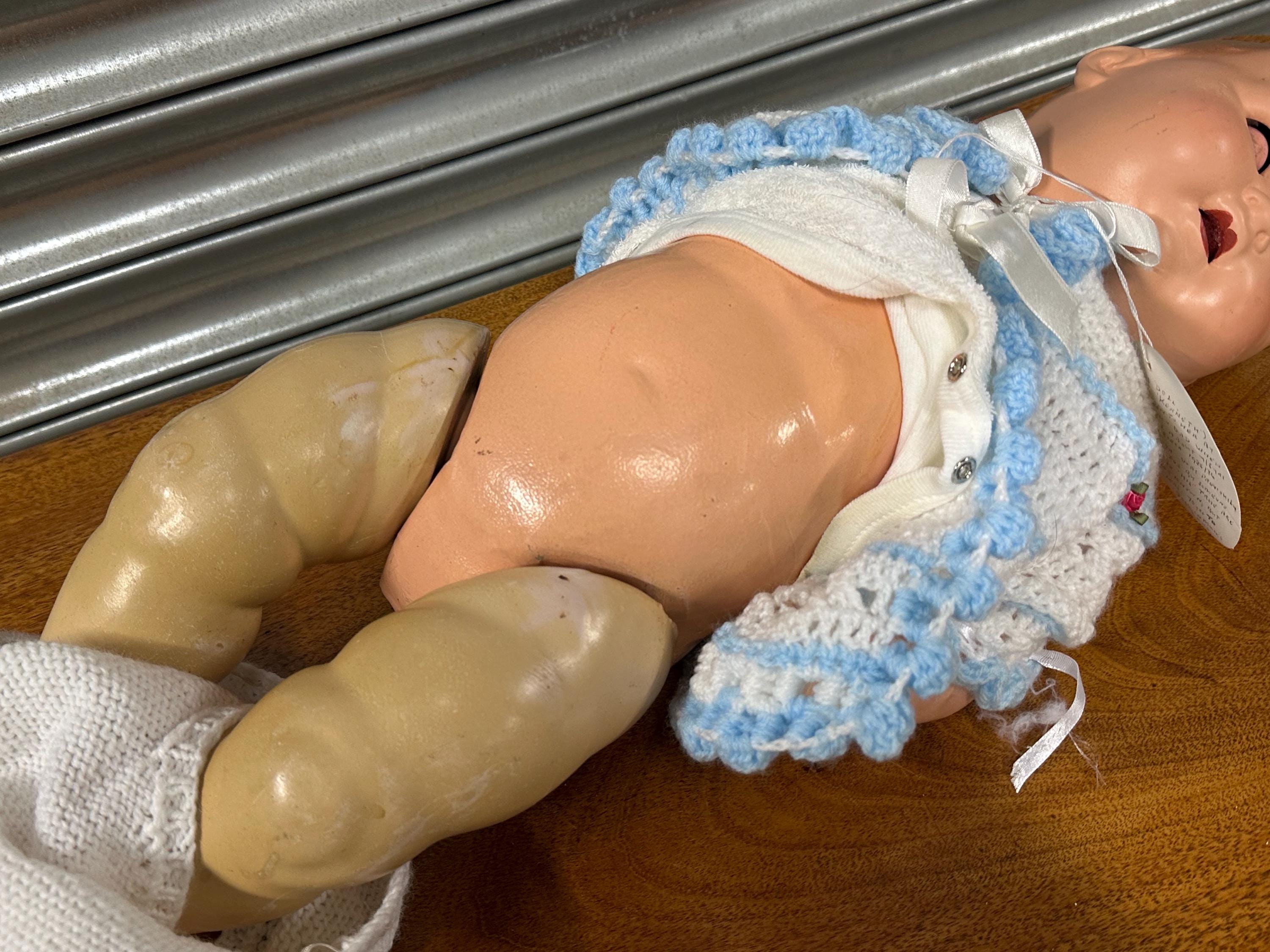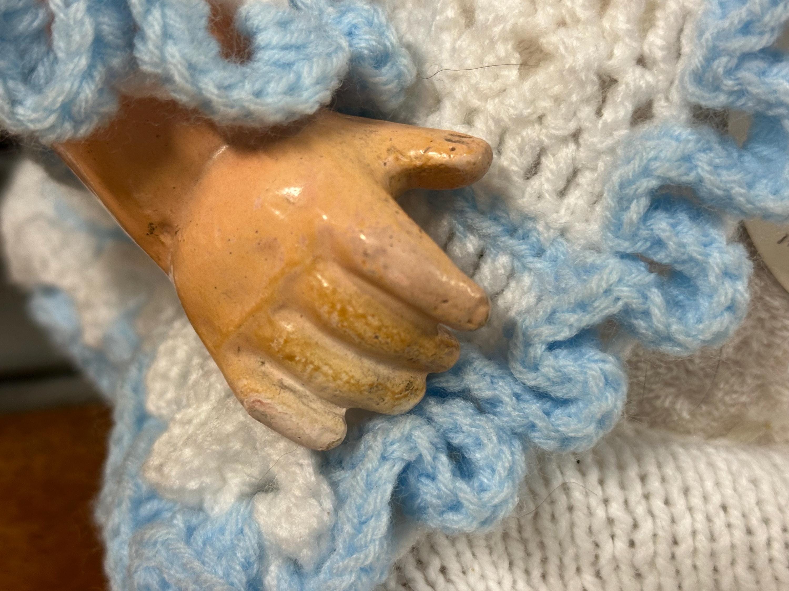 A charming early 1920s composition baby doll, featuring classic sleeping brown eyes, painted facial detail and the characteristic early 20th-century baby form. The doll wears a lovely set of handmade vintage crocheted cardigan in white and pale blue, adding to its nostalgic appeal.