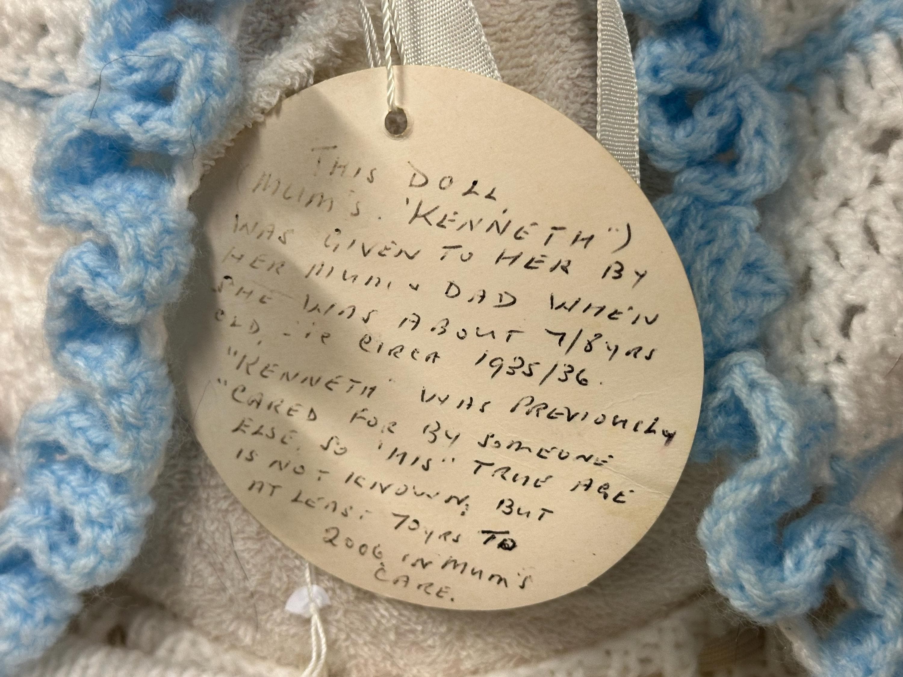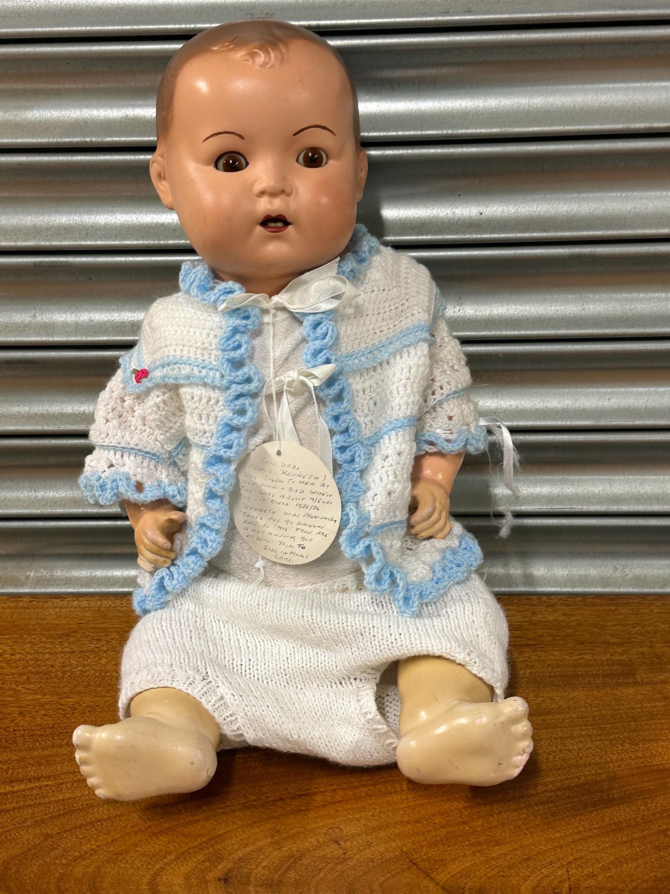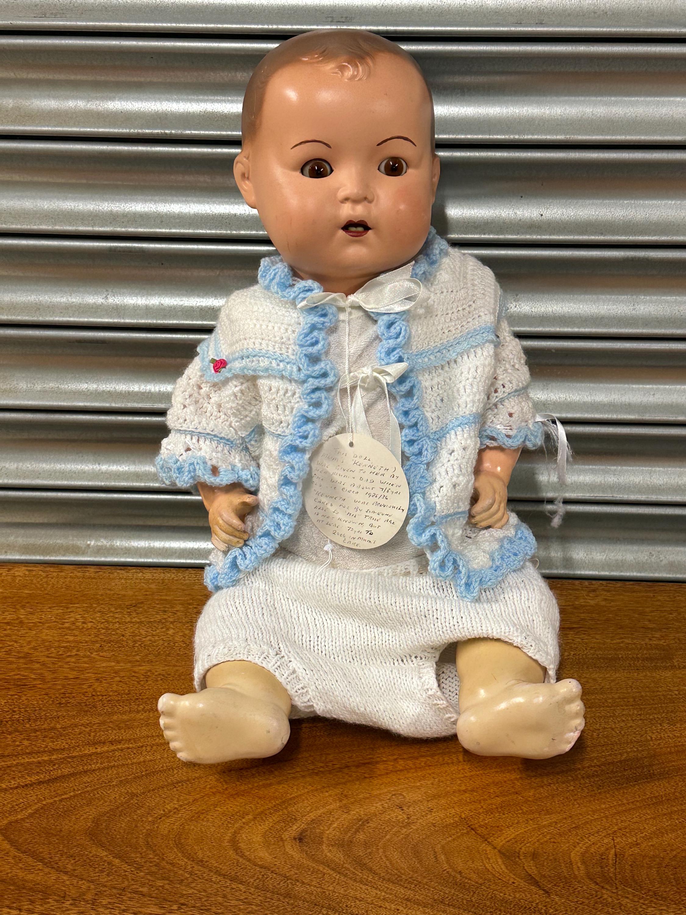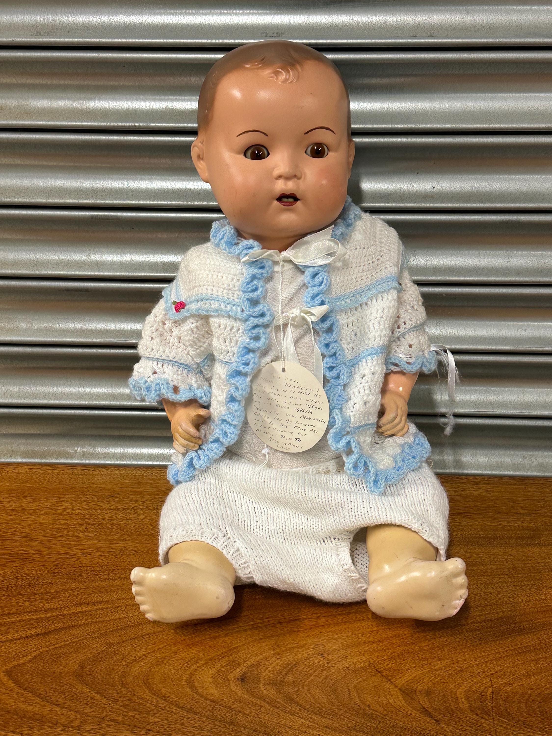 The doll has a composition head, arms and legs with a cloth body, typical of dolls from this period. A handwritten tag is attached, giving a previous owner’s notes about its age and history.