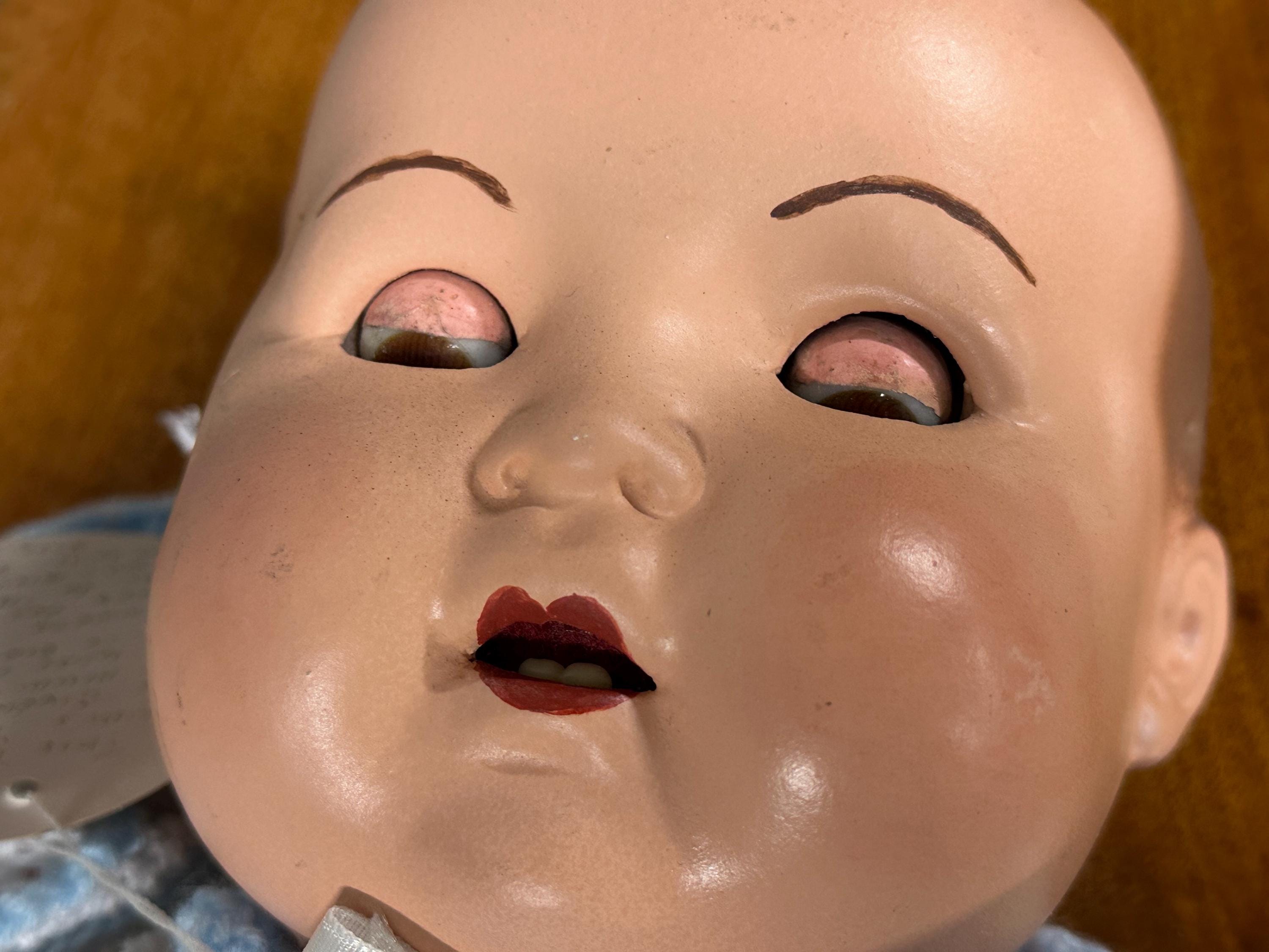 Vintage Circa 1920s Composition Baby Doll with Sleeping Brown Eyes - His owner named him Michael, see attached tag label