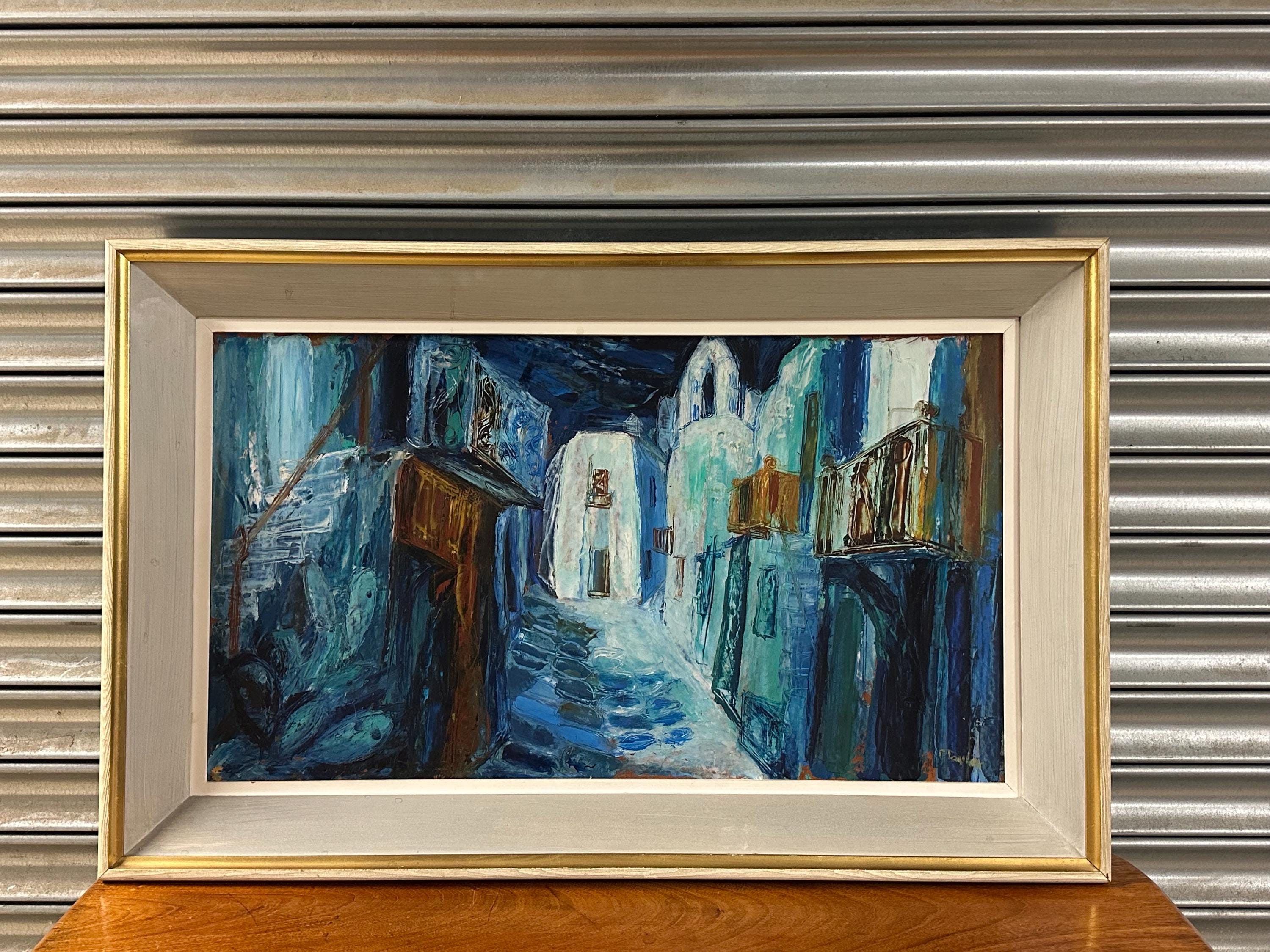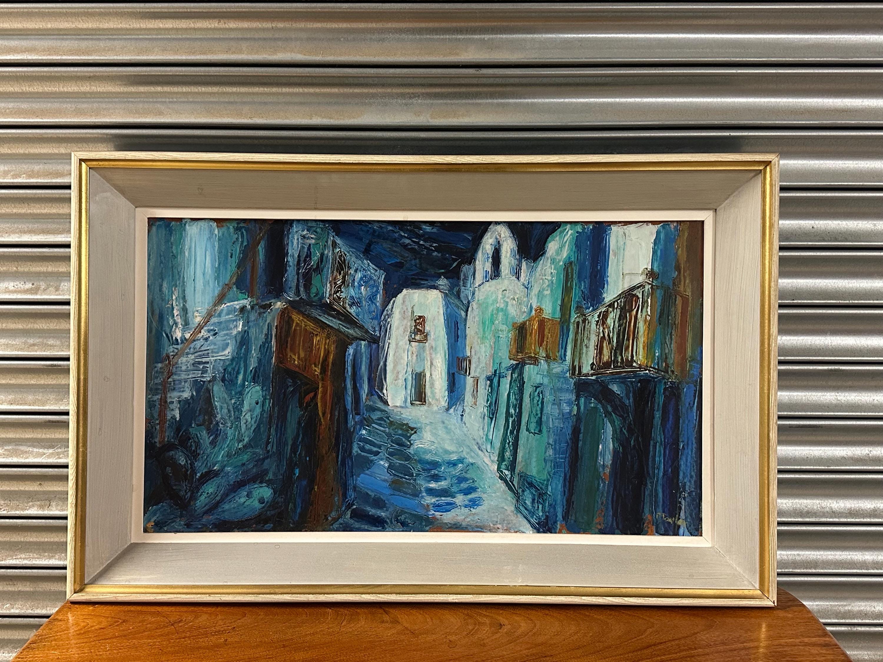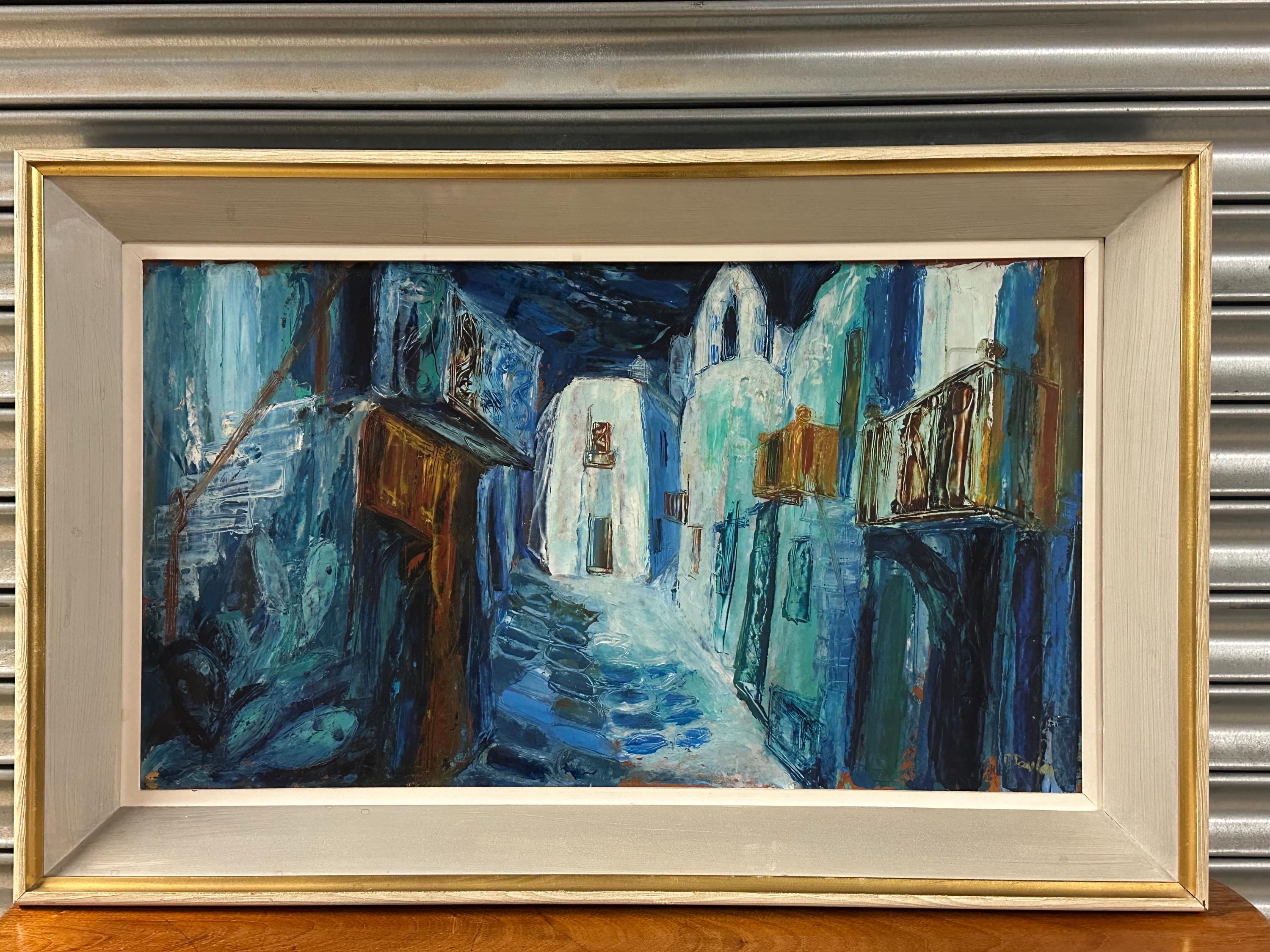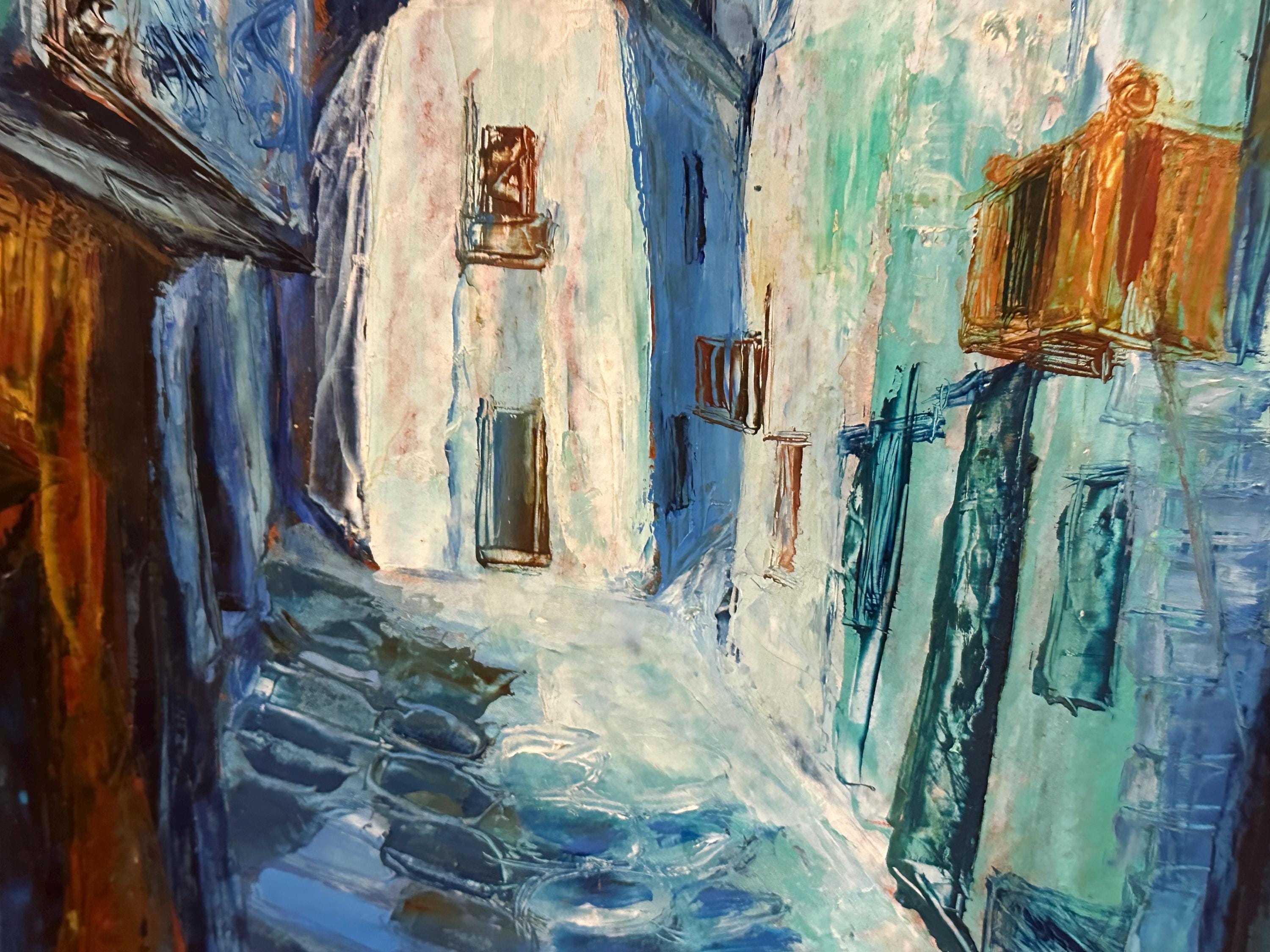 A captivating original oil painting depicting an evocative narrow street scene, reminiscent of a historic European town or Mediterranean alleyway. The composition draws the viewer inward along a cobbled pathway flanked by tall, close-set buildings with balconies and shuttered windows, creating depth and a strong sense of perspective.