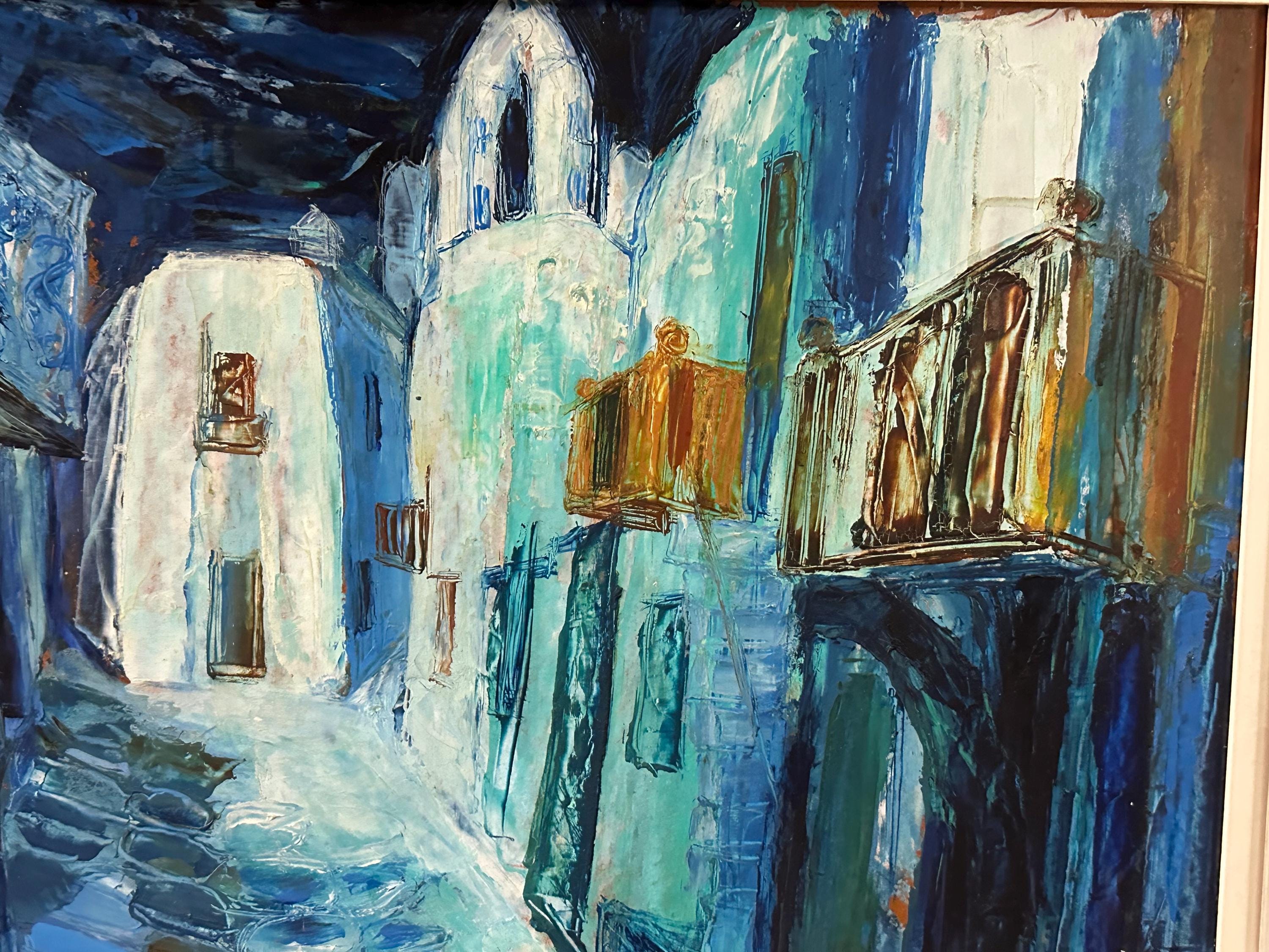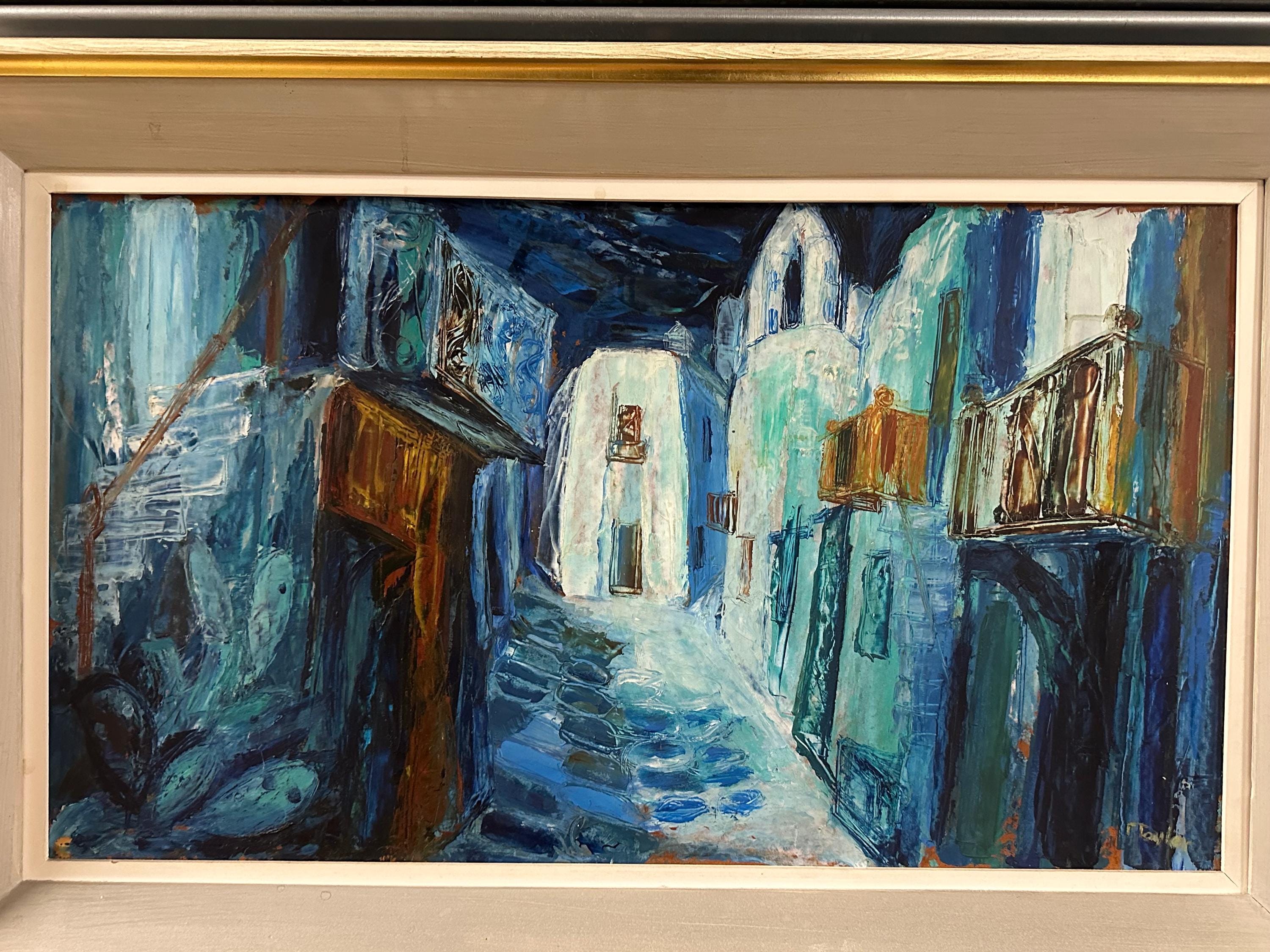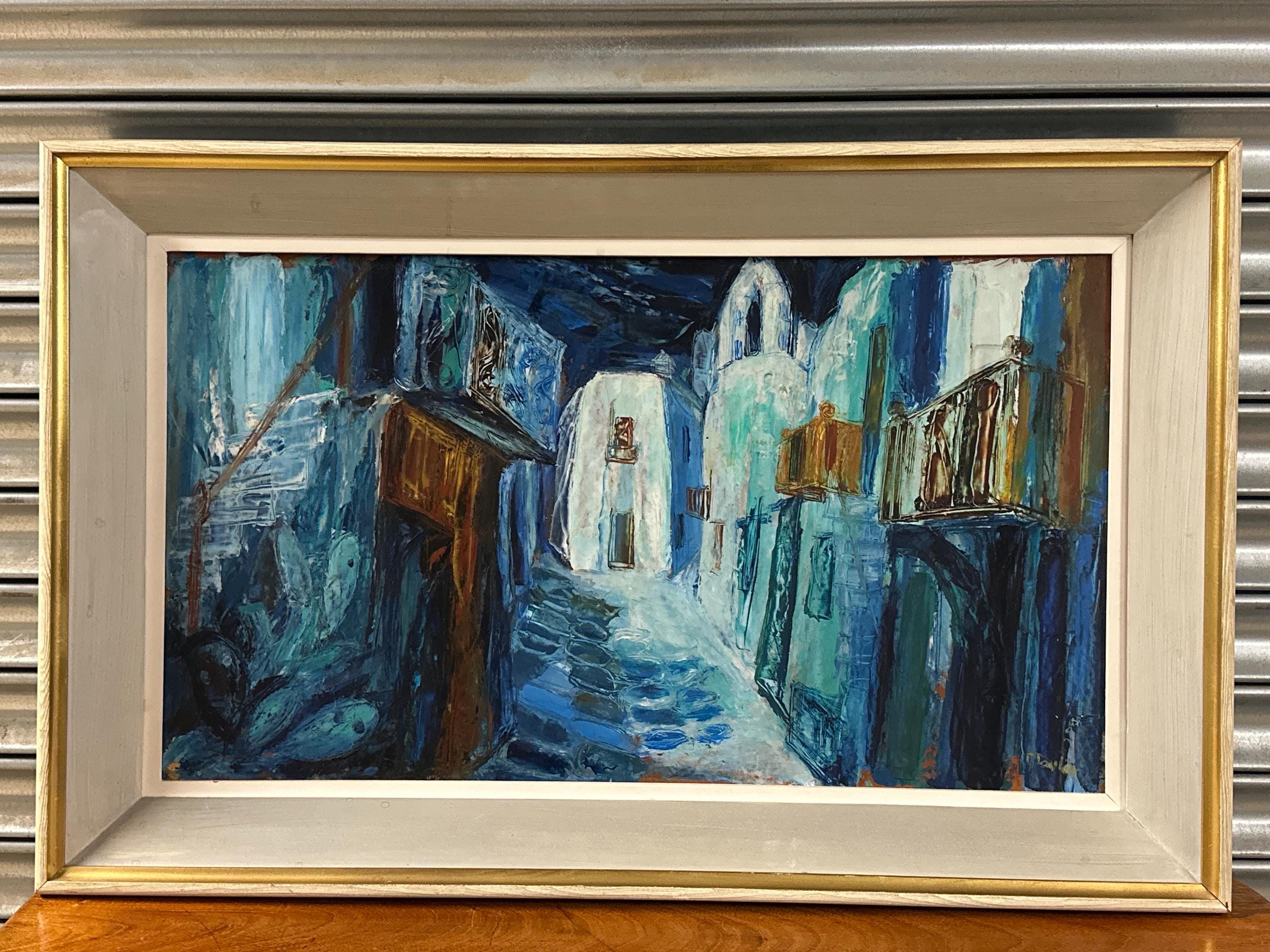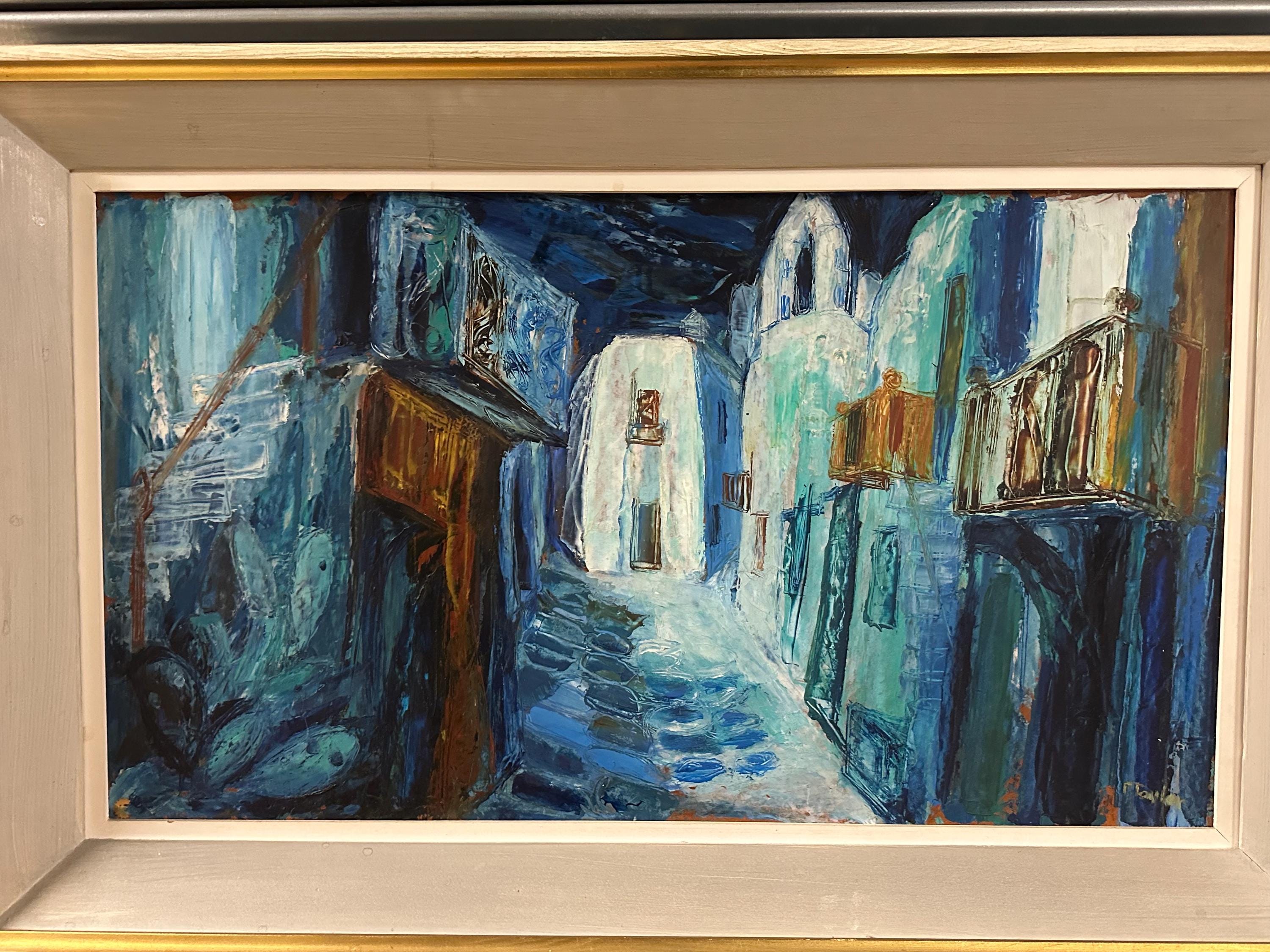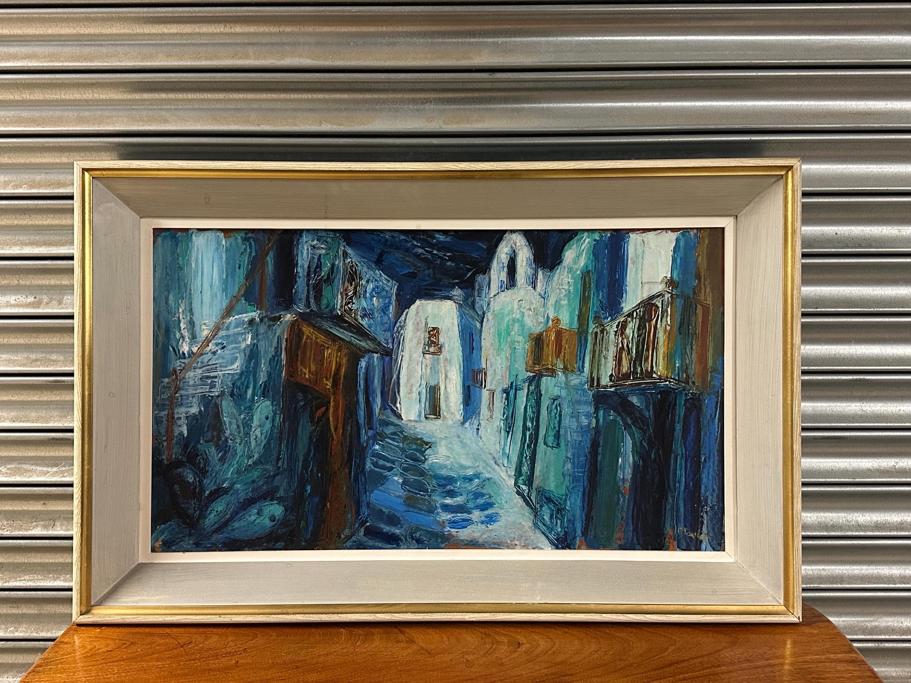 A captivating original oil painting depicting an evocative narrow street scene, reminiscent of a historic European town or Mediterranean alleyway. The composition draws the viewer inward along a cobbled pathway flanked by tall, close-set buildings with balconies and shuttered windows, creating depth and a strong sense of perspective.