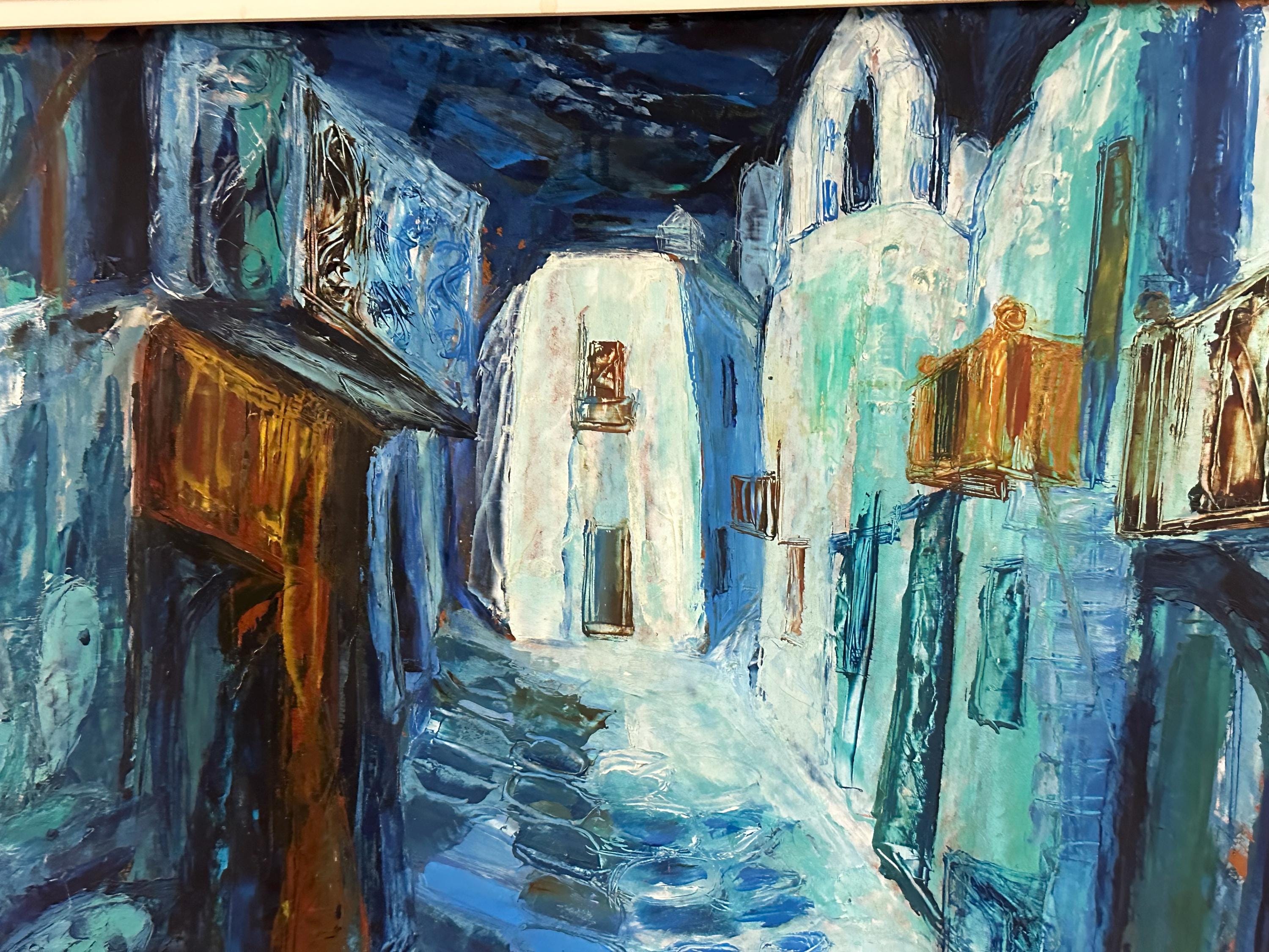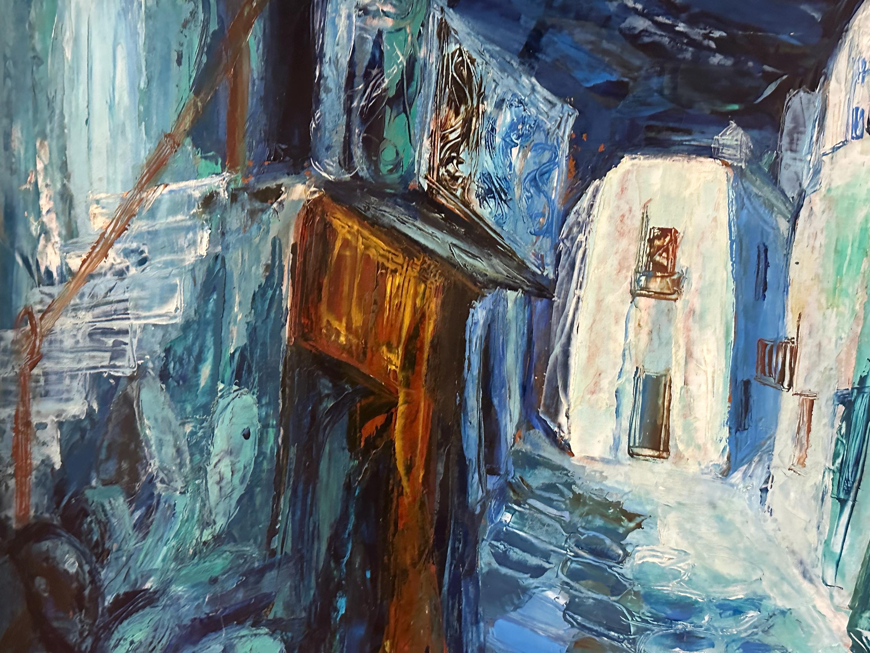 Painted in rich, expressive brushstrokes, the artist uses a moody palette of blues, teals and deep indigo tones, contrasted with warmer highlights to give the scene drama and atmosphere. The impasto texture adds movement and character, suggesting evening light or moonlit shadows, and giving the work a slightly abstract, modernist feel.