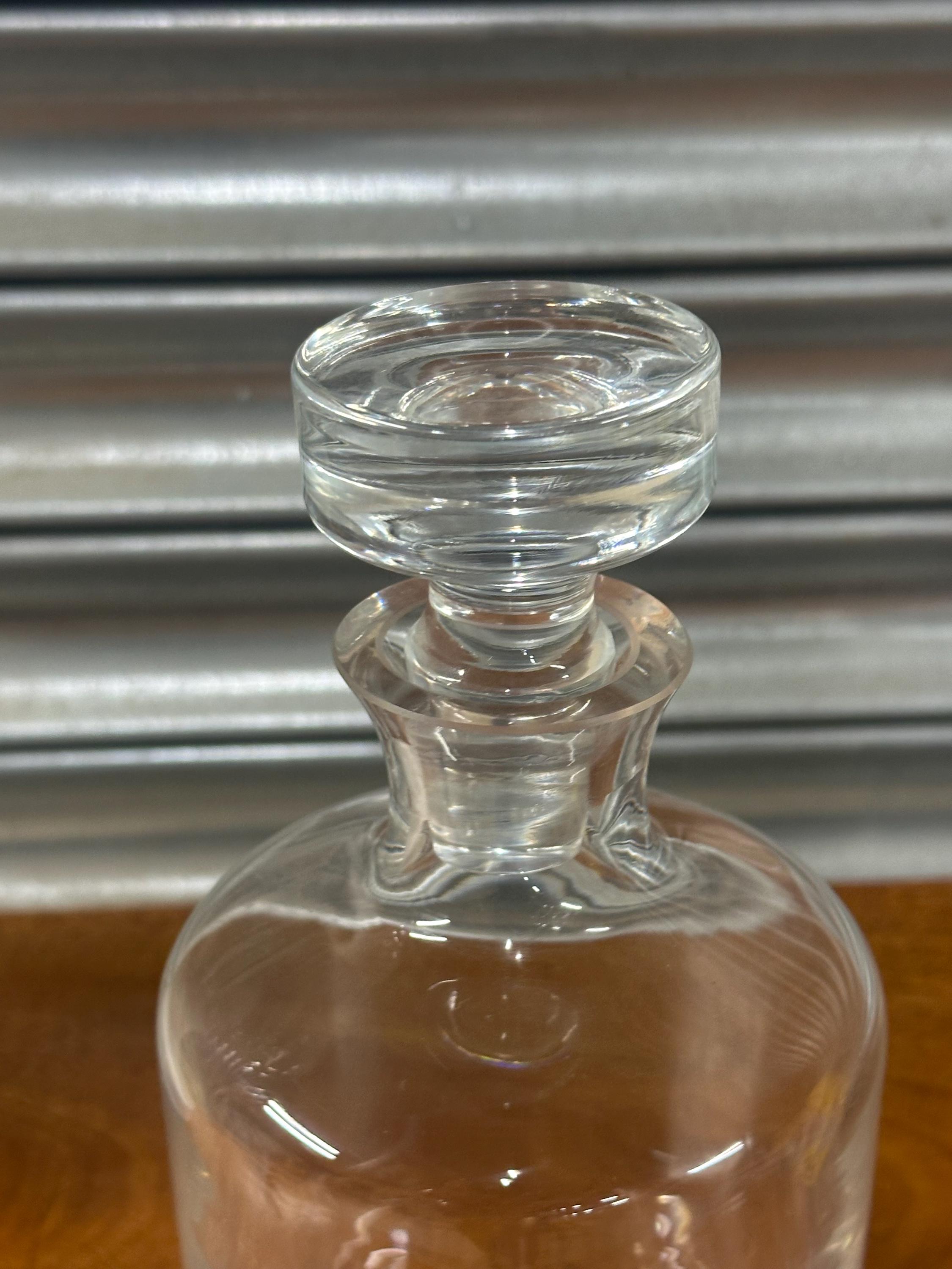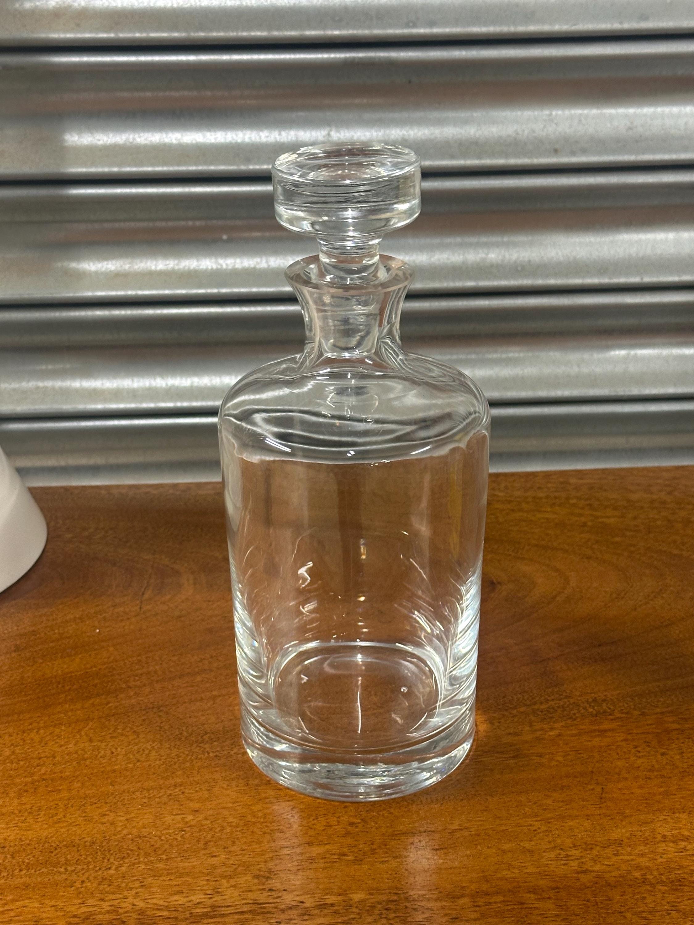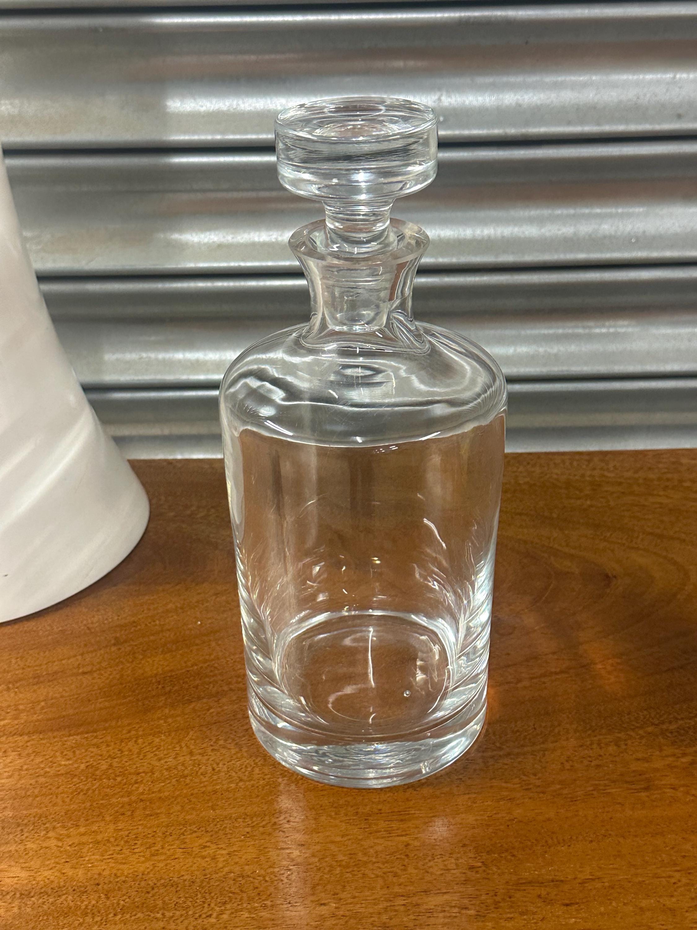 A classic clear glass decanter with matching stopper, simple and timeless in design. The decanter has a gently rounded shoulder tapering to a short neck, finished with a solid, well-fitting glass stopper. Made from good quality clear glass with a pleasing weight to the base, giving it stability and presence.