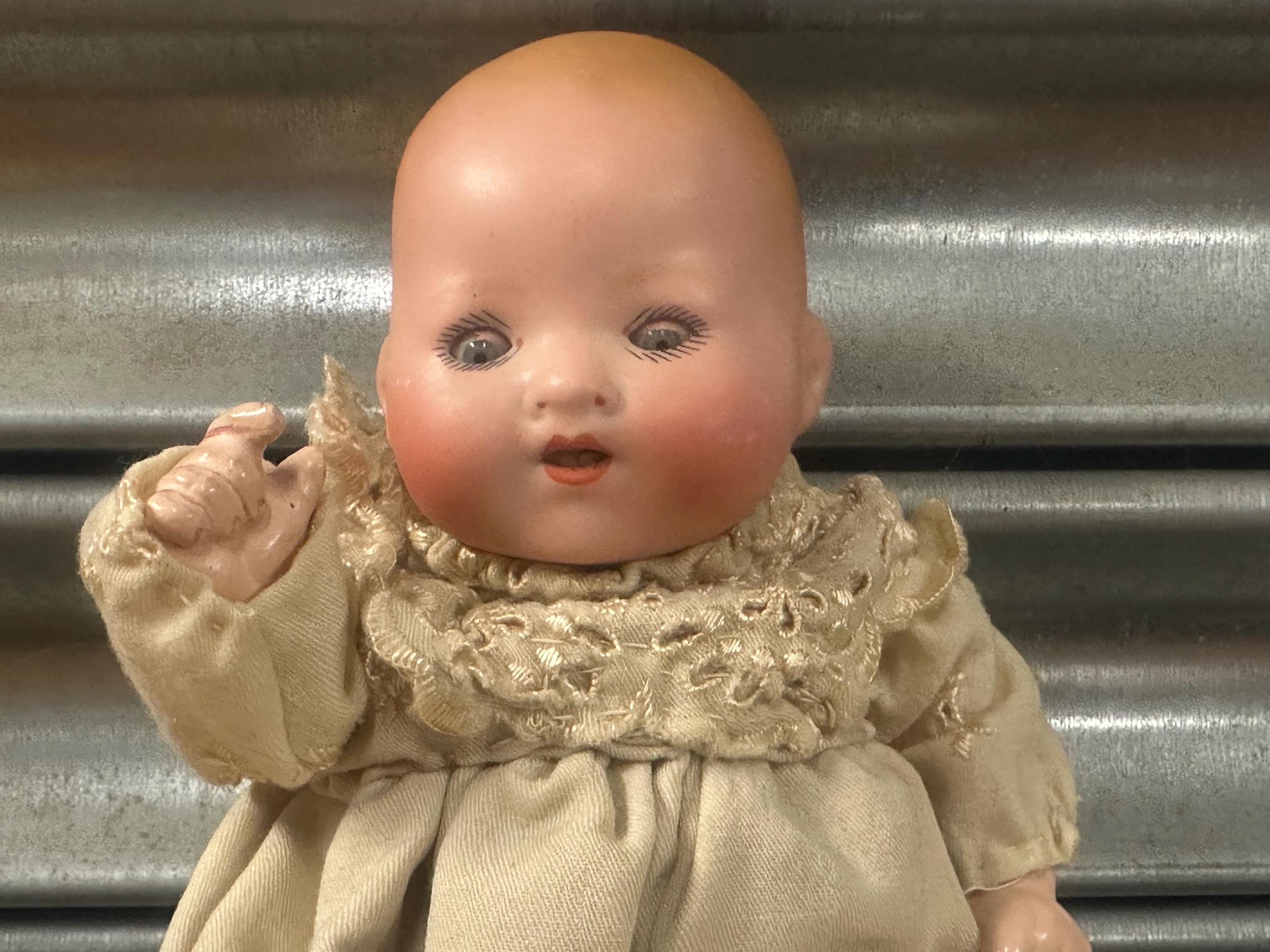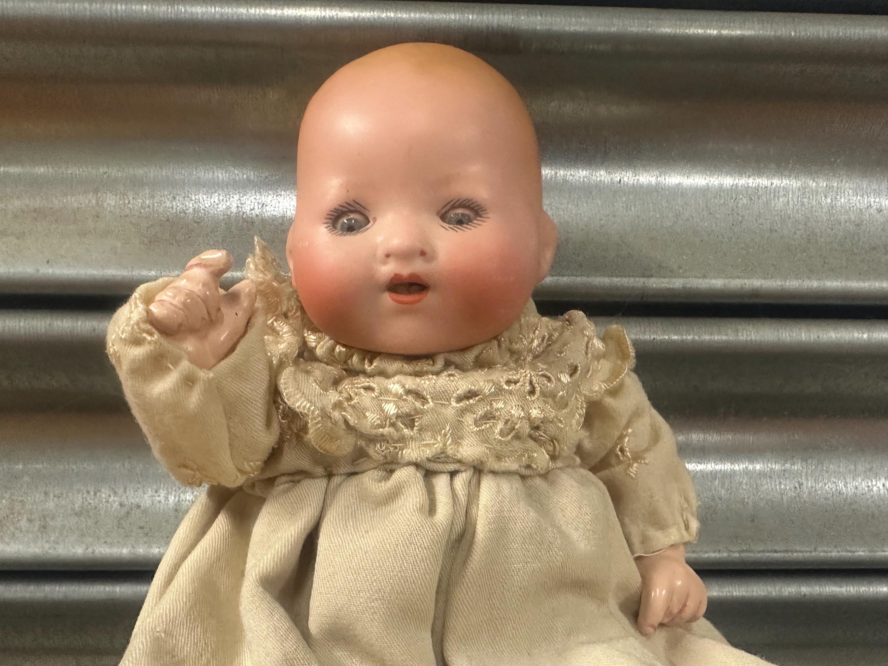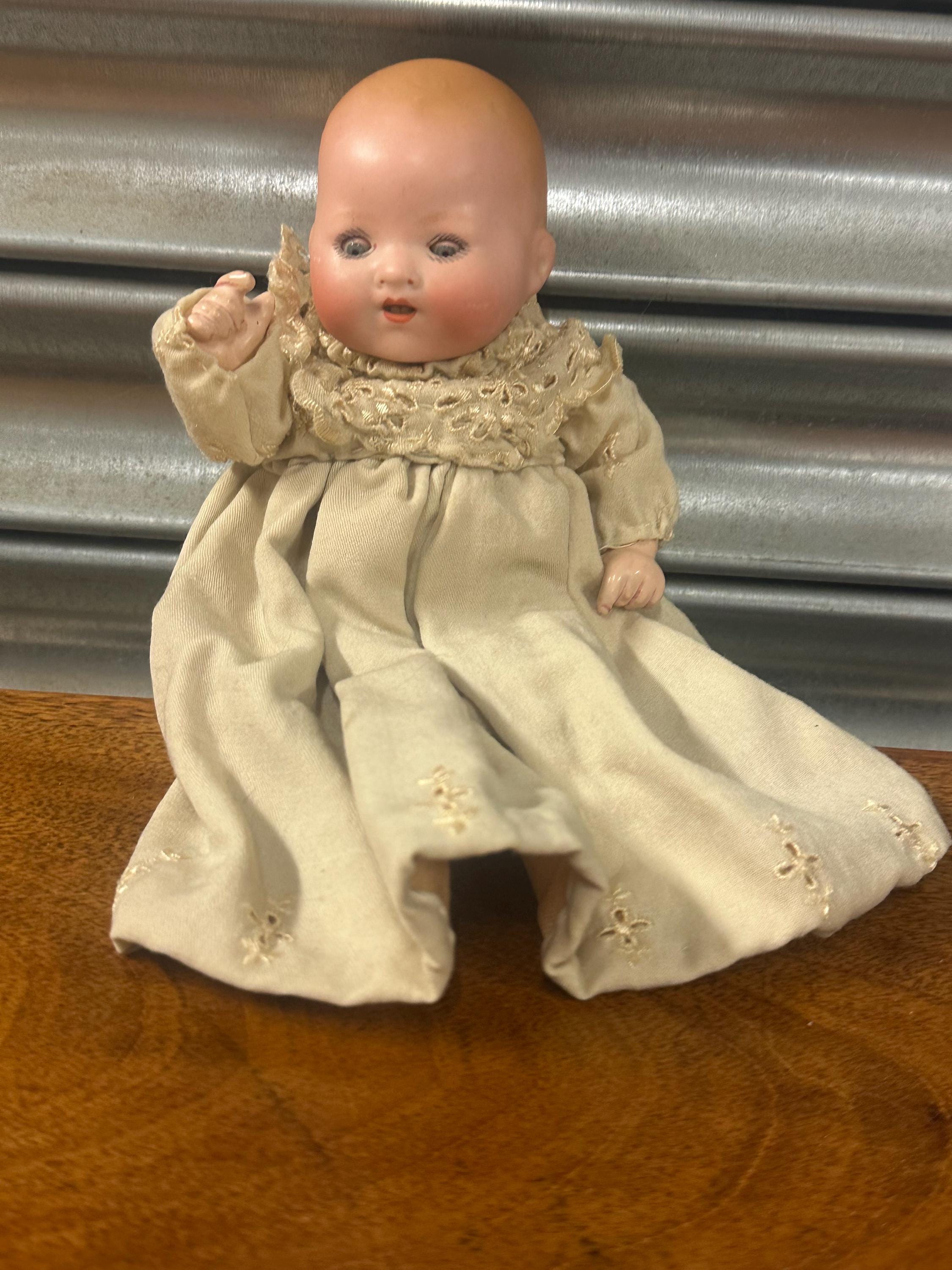 A charming antique baby doll dating to the early 20th century, featuring a painted composition head with sweet wide-eyed expression, blushed cheeks and delicately painted lashes. The doll has a bald head, typical of the period, and retains its original painted facial detail with good character throughout.