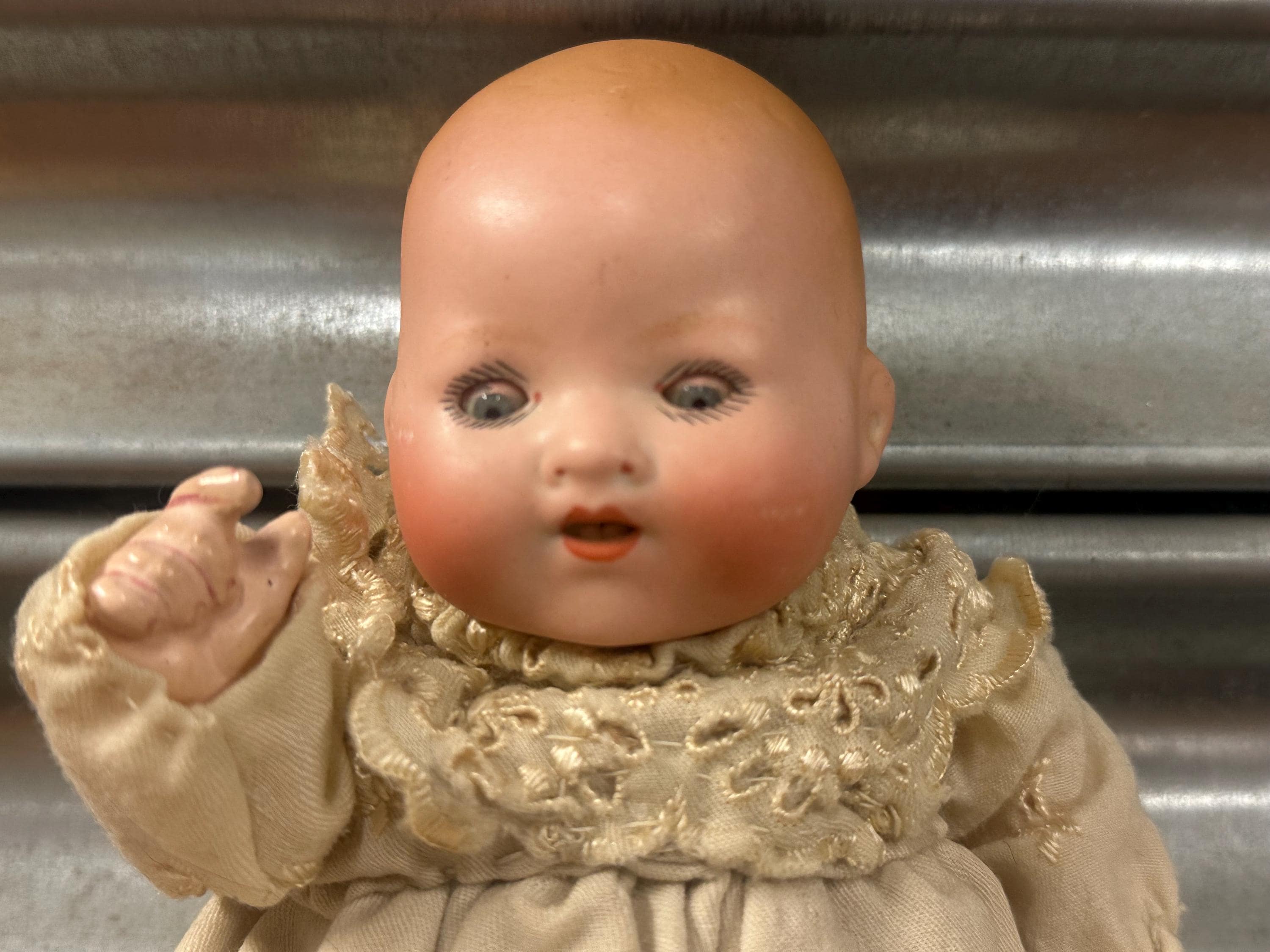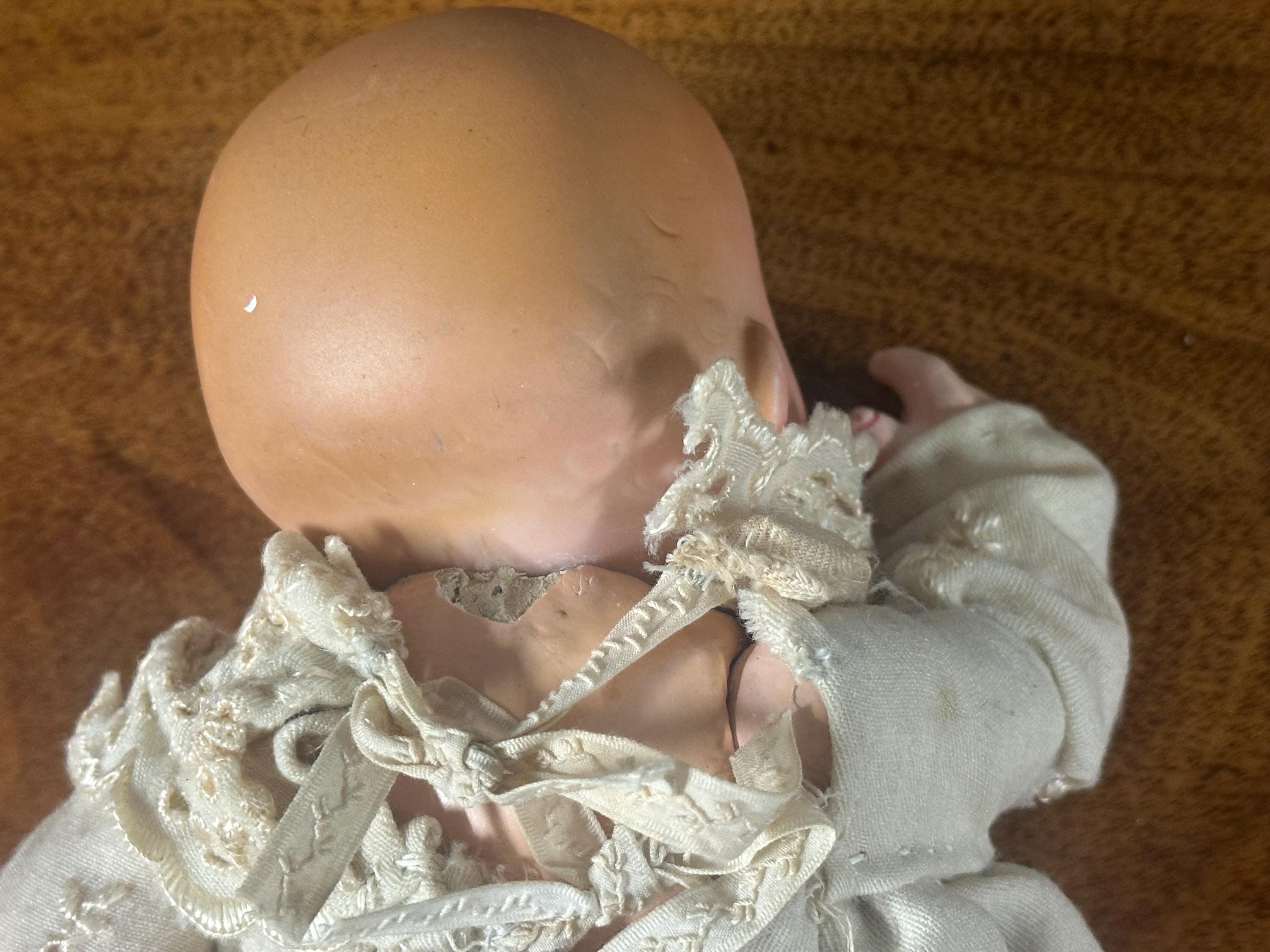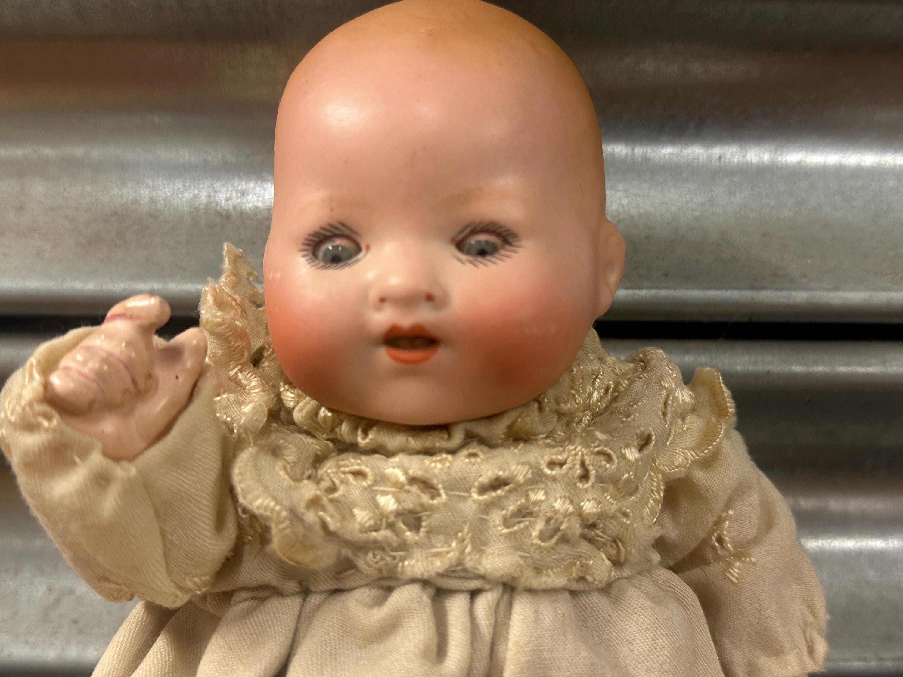 A charming antique baby doll dating to the early 20th century, featuring a painted composition head with sweet wide-eyed expression, blushed cheeks and delicately painted lashes. The doll has a bald head, typical of the period, and retains its original painted facial detail with good character throughout.