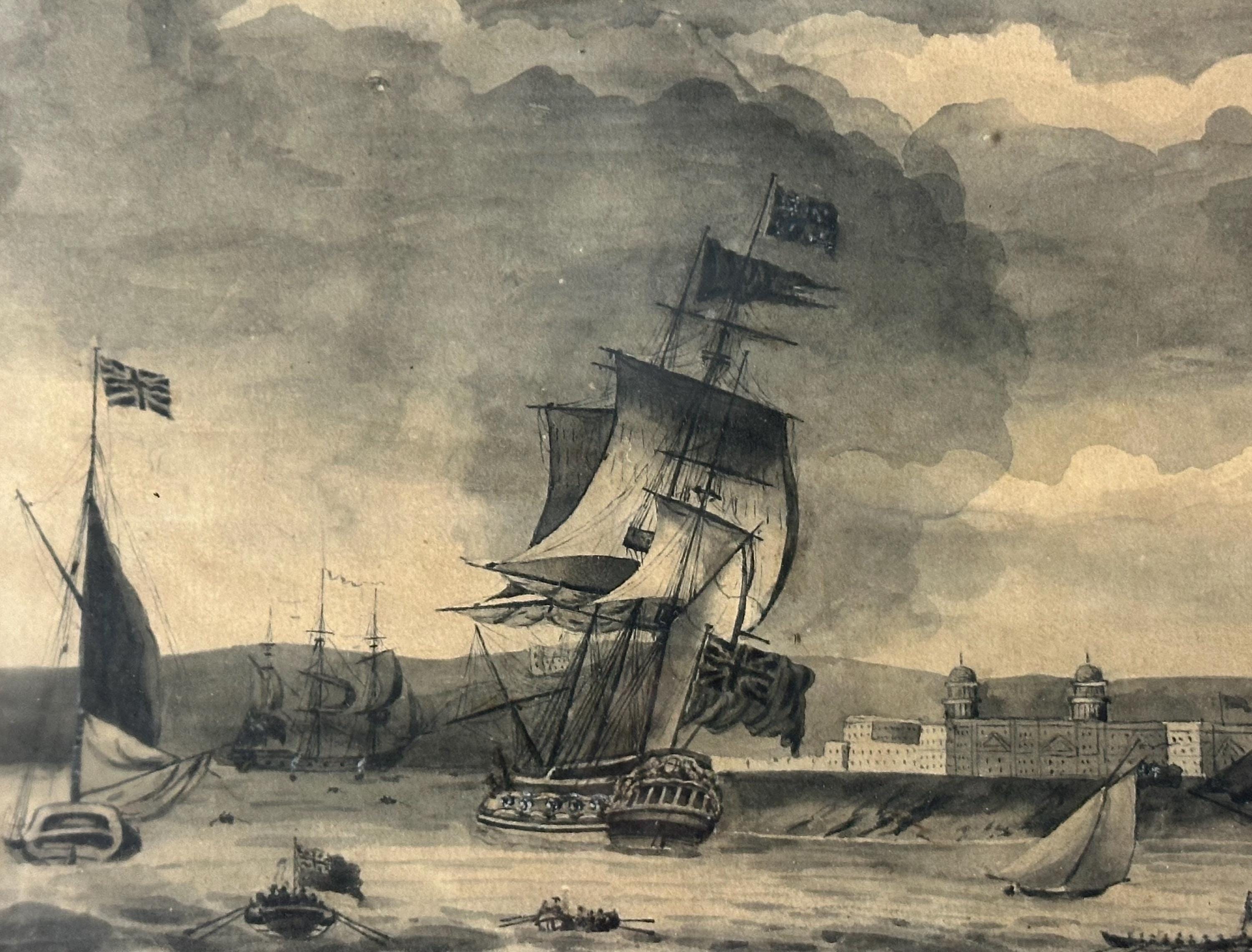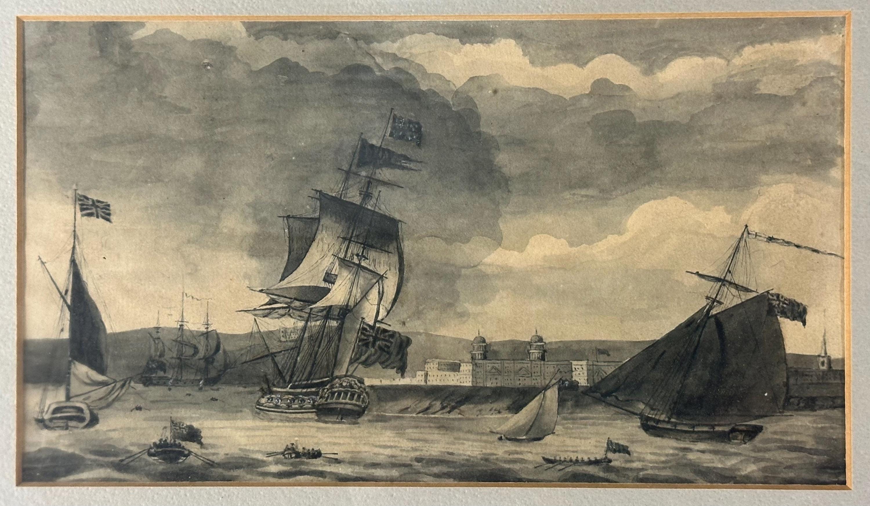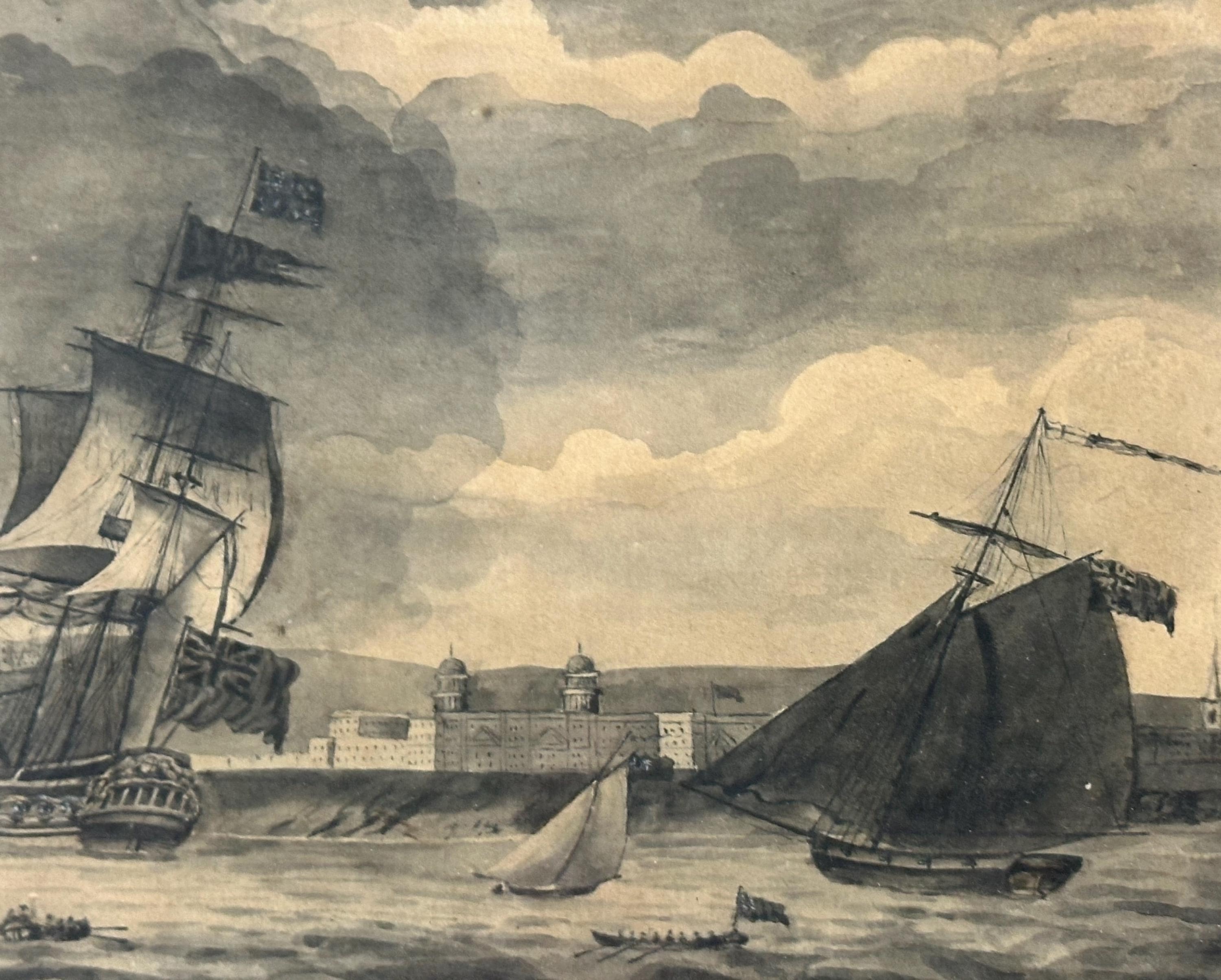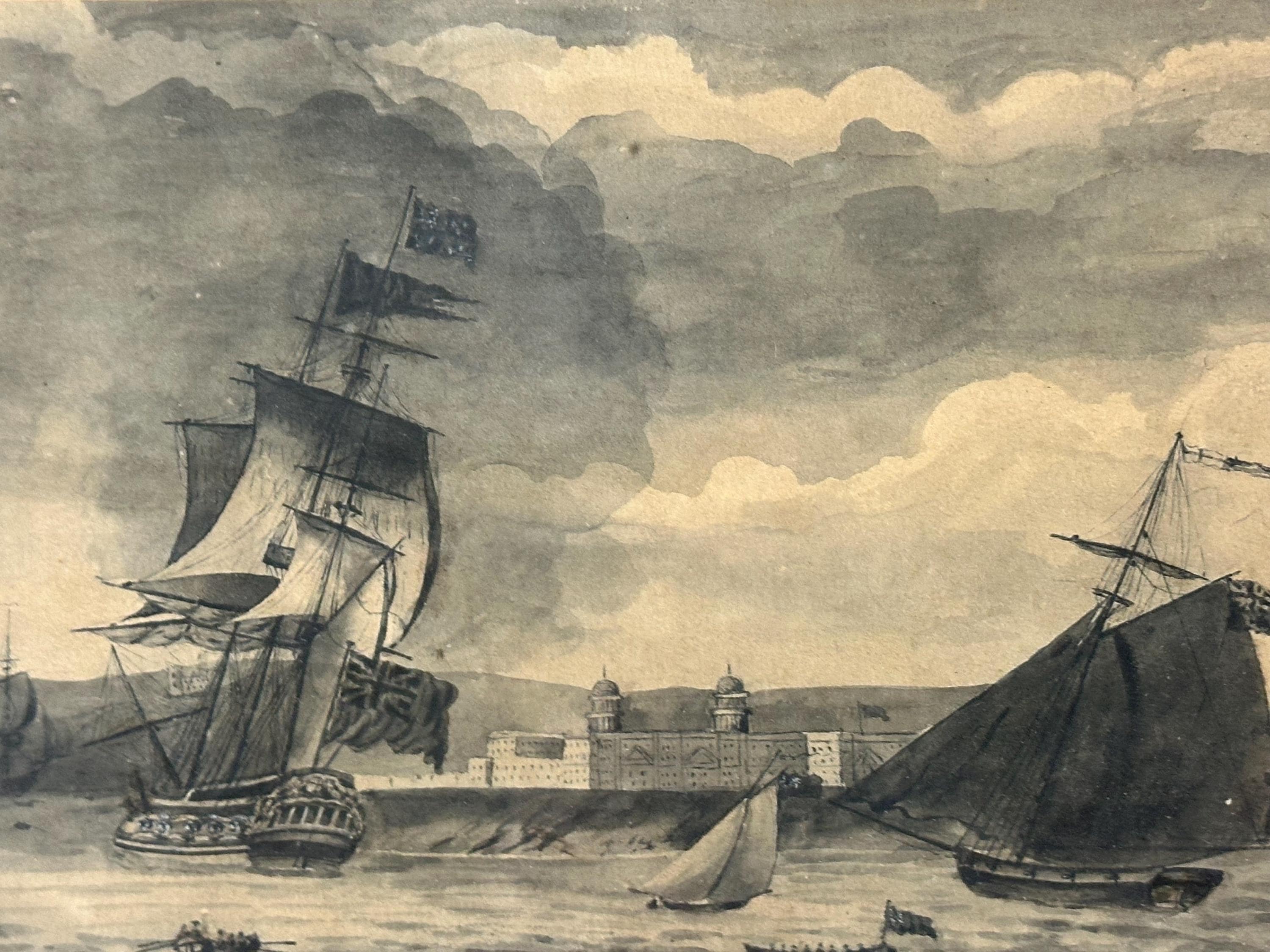The artist has used a restrained palette of soft greys, sepia and muted blues, with confident line work and delicate washes to convey movement on the water and depth in the sky. The style and subject matter are strongly evocative of late 18th to early 19th century British marine watercolours.