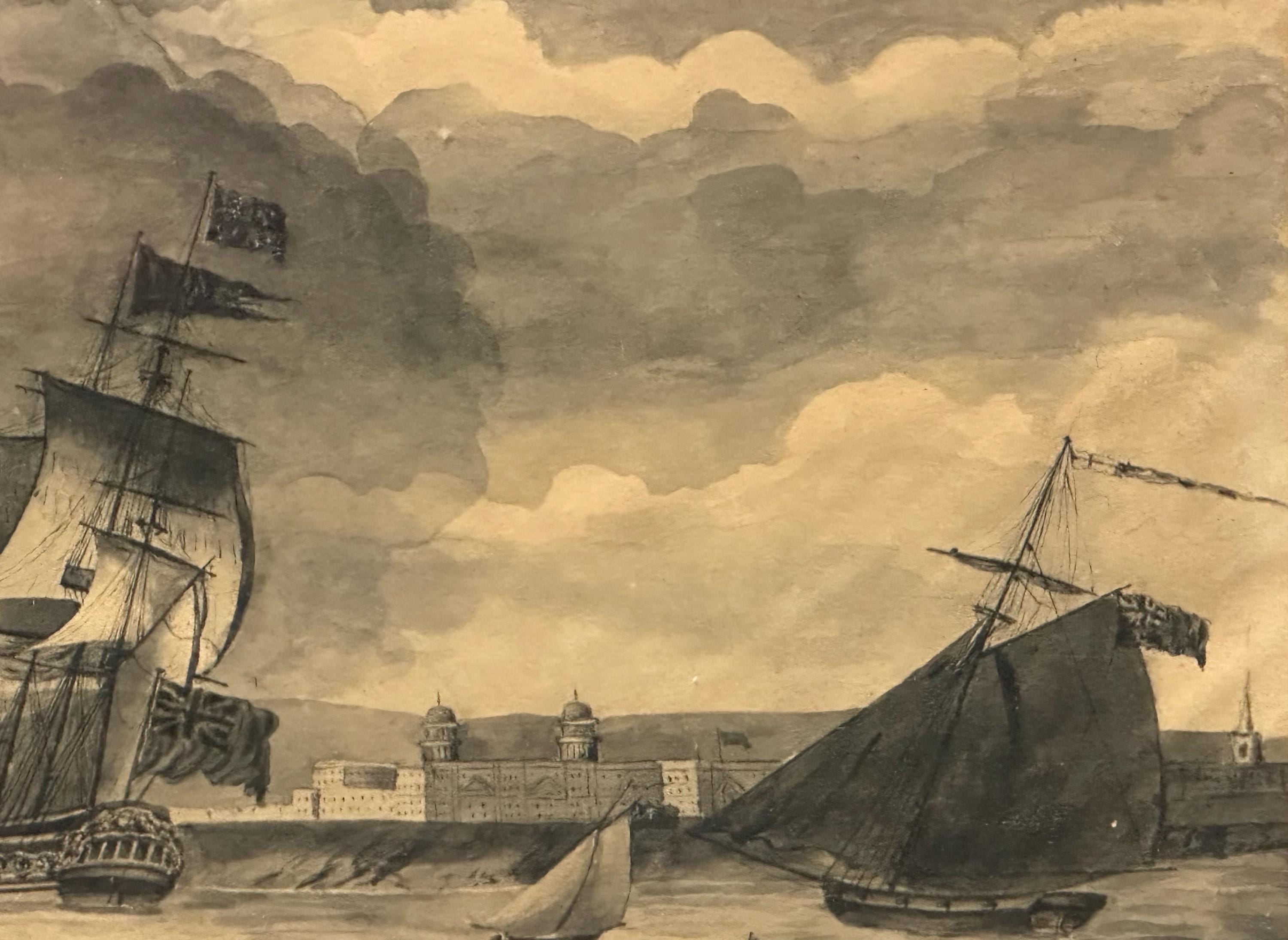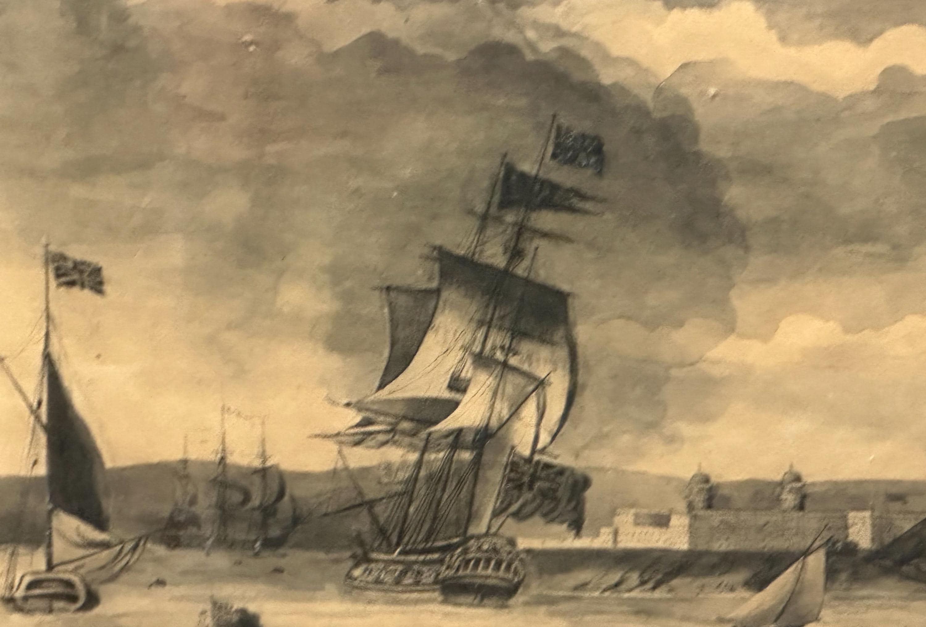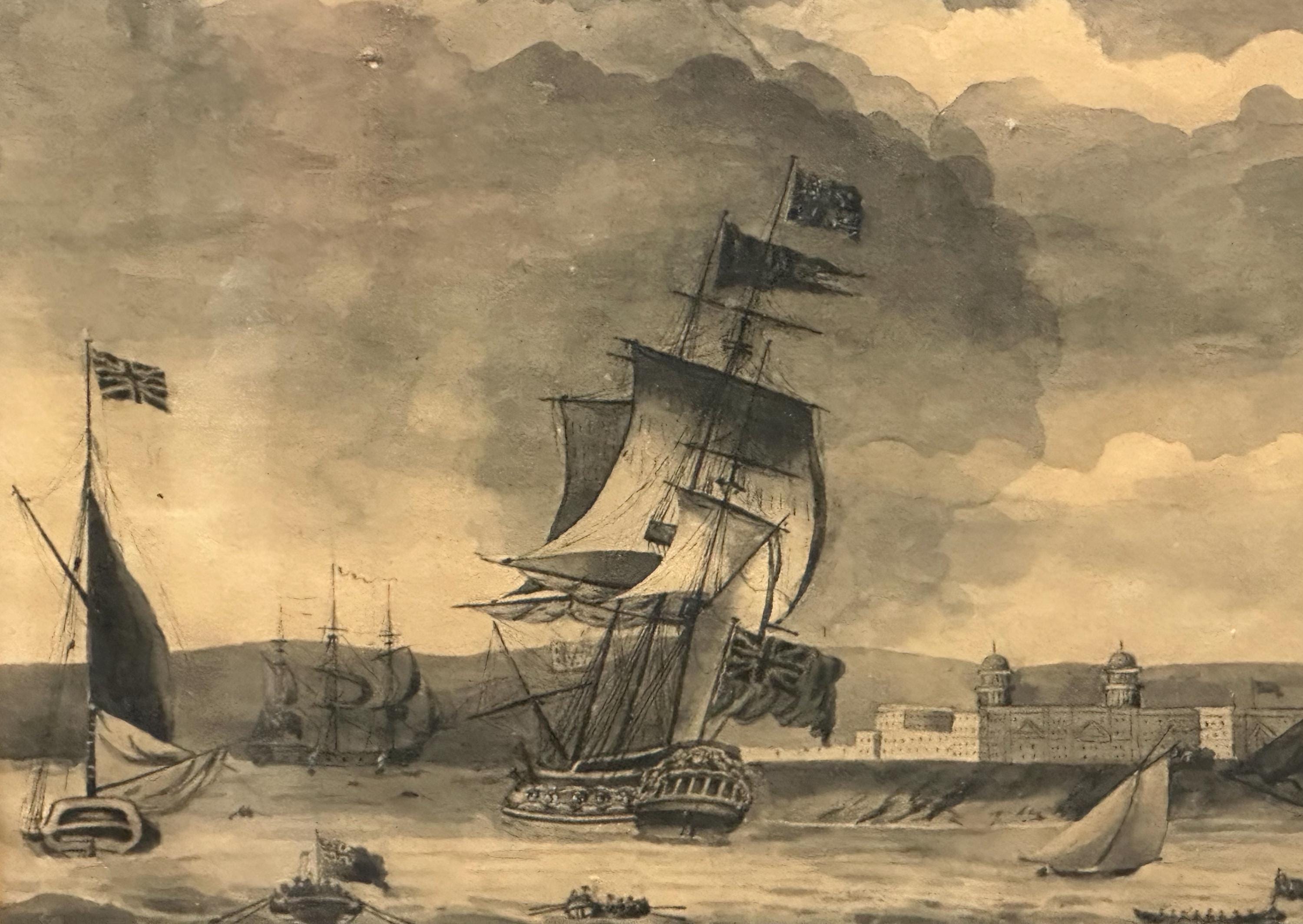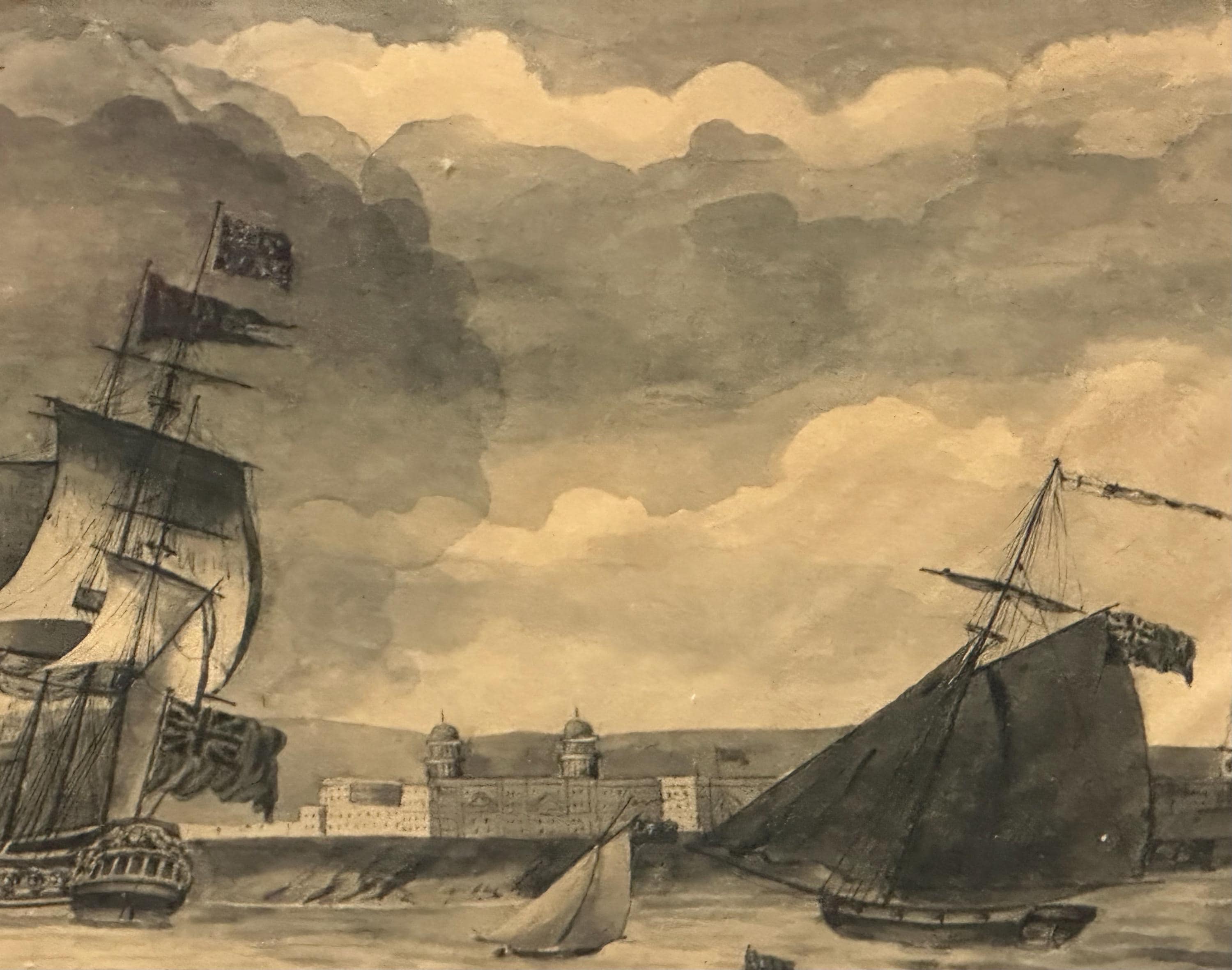 The artist has used a restrained palette of soft greys, sepia and muted blues, with confident line work and delicate washes to convey movement on the water and depth in the sky. The style and subject matter are strongly evocative of late 18th to early 19th century British marine watercolours.