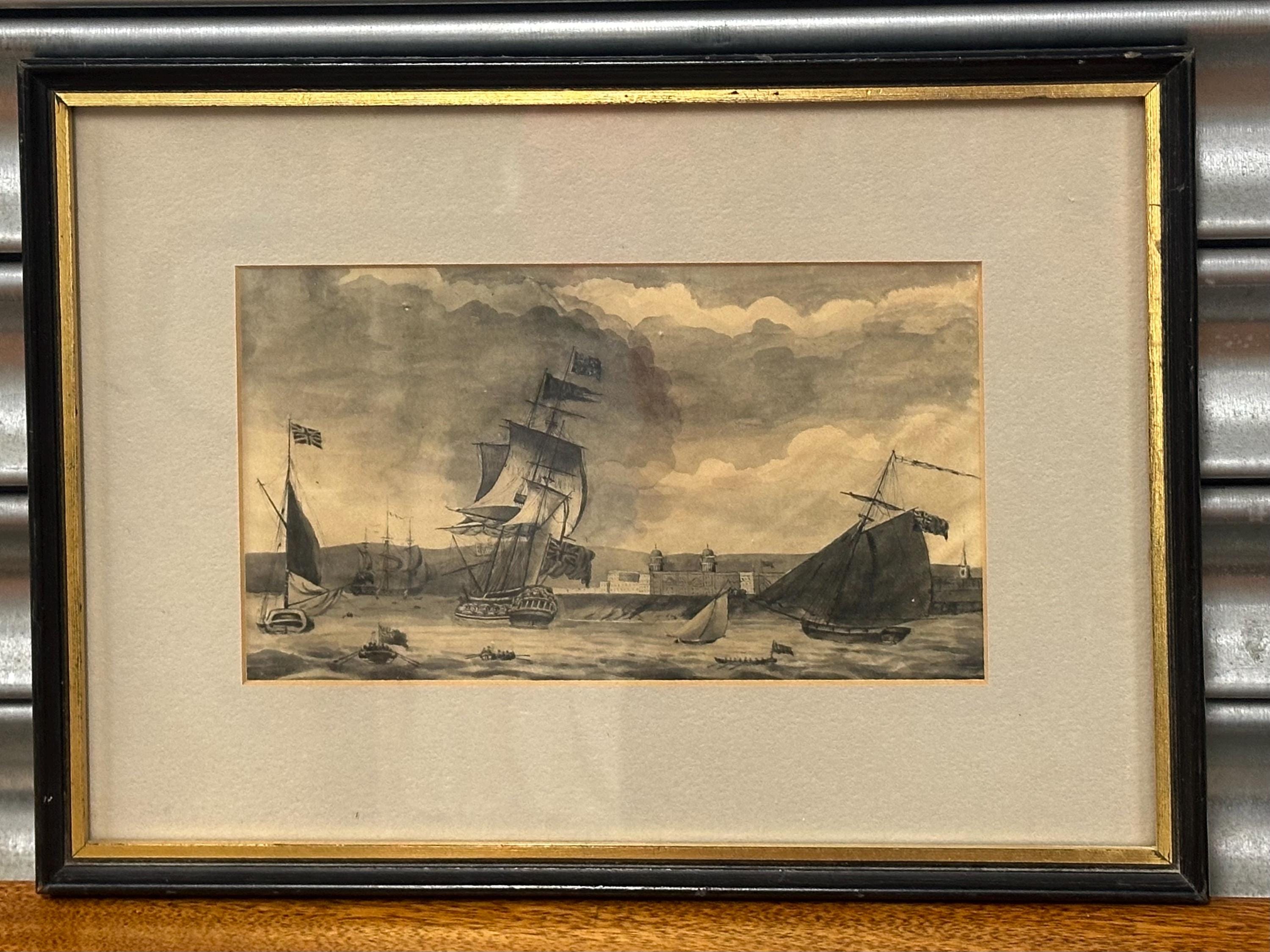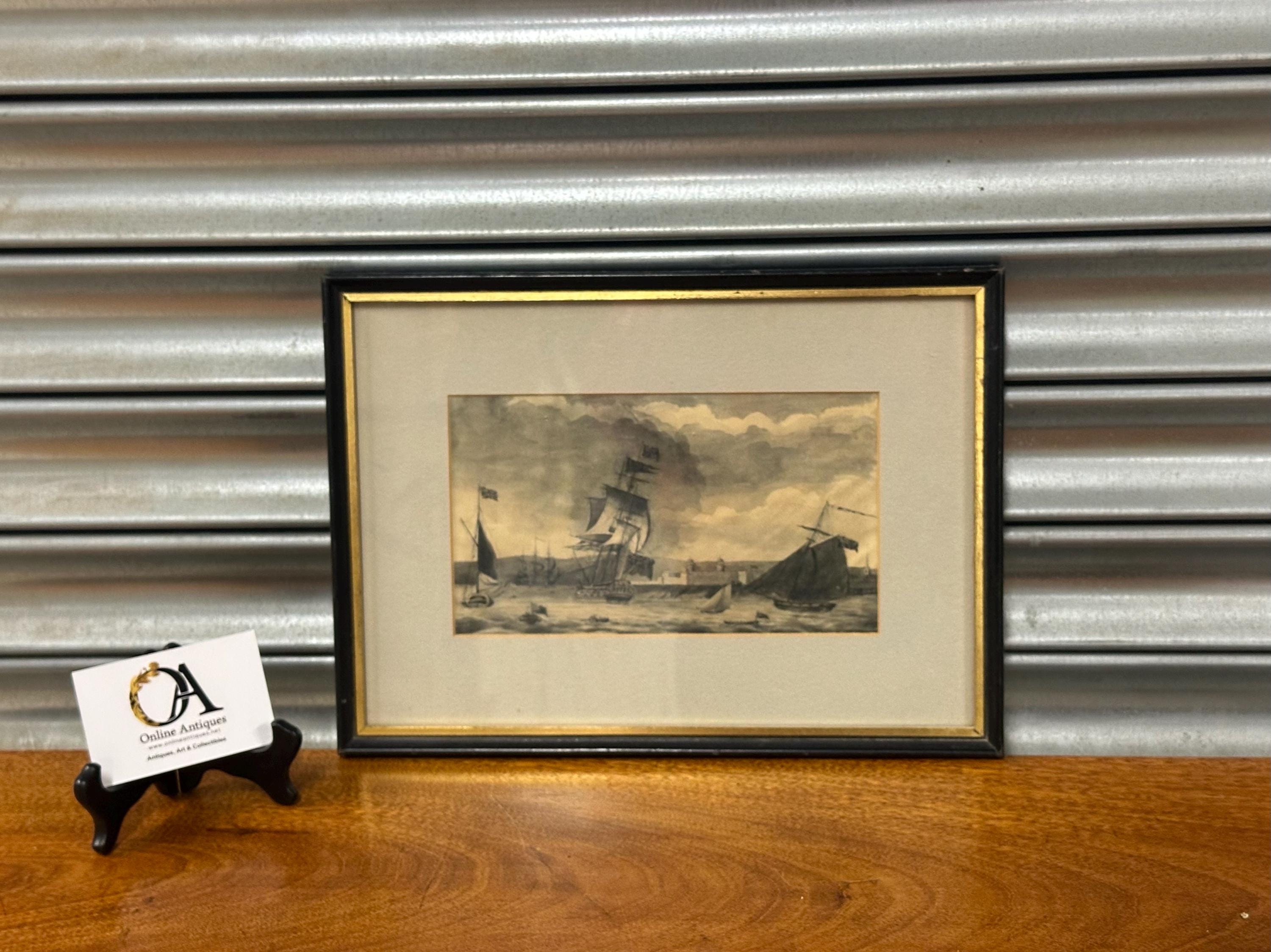 Antique Framed Watercolour – Maritime Harbour Scene with Sailing Ships – 18th / Early 19th Century Style