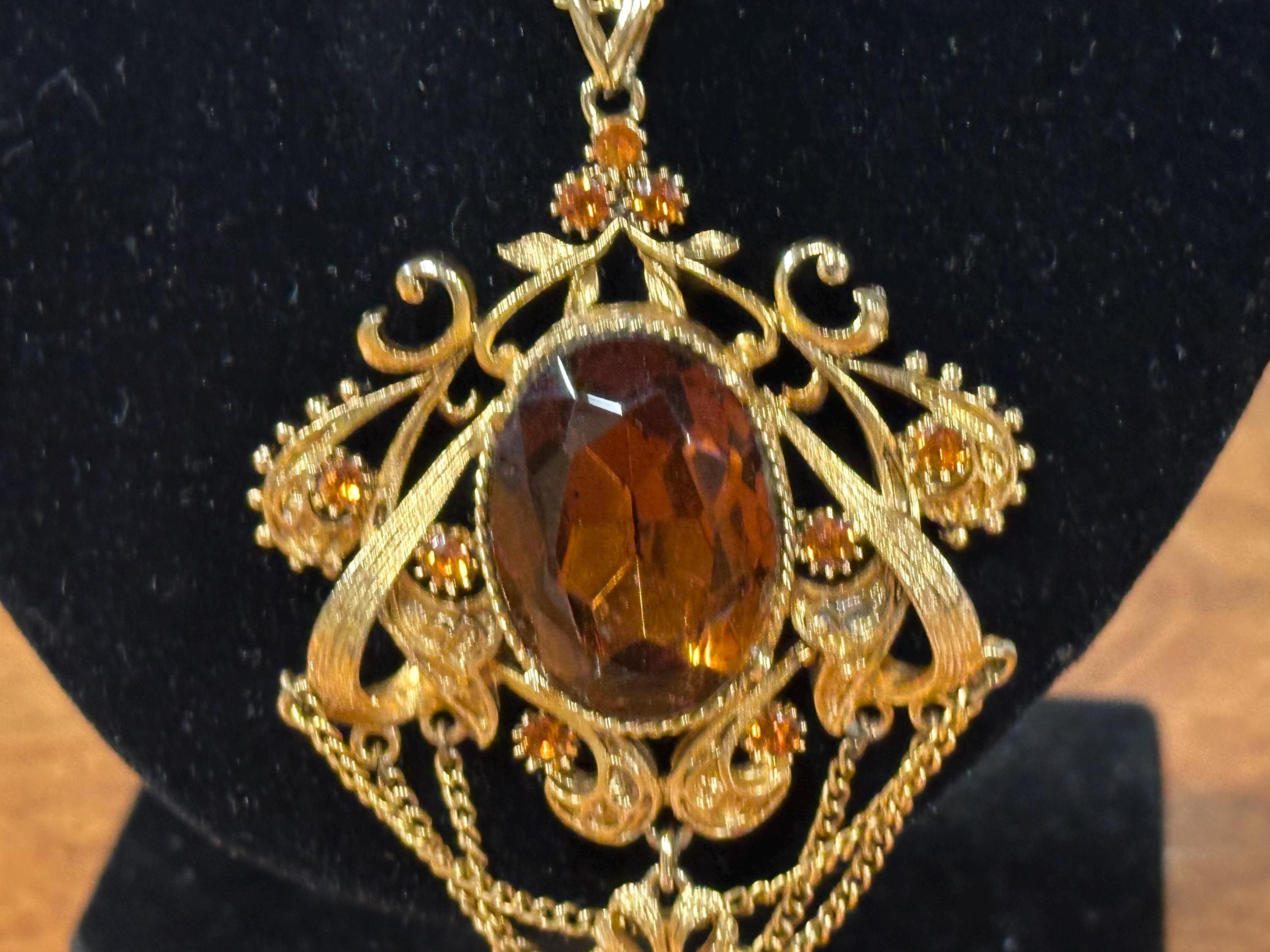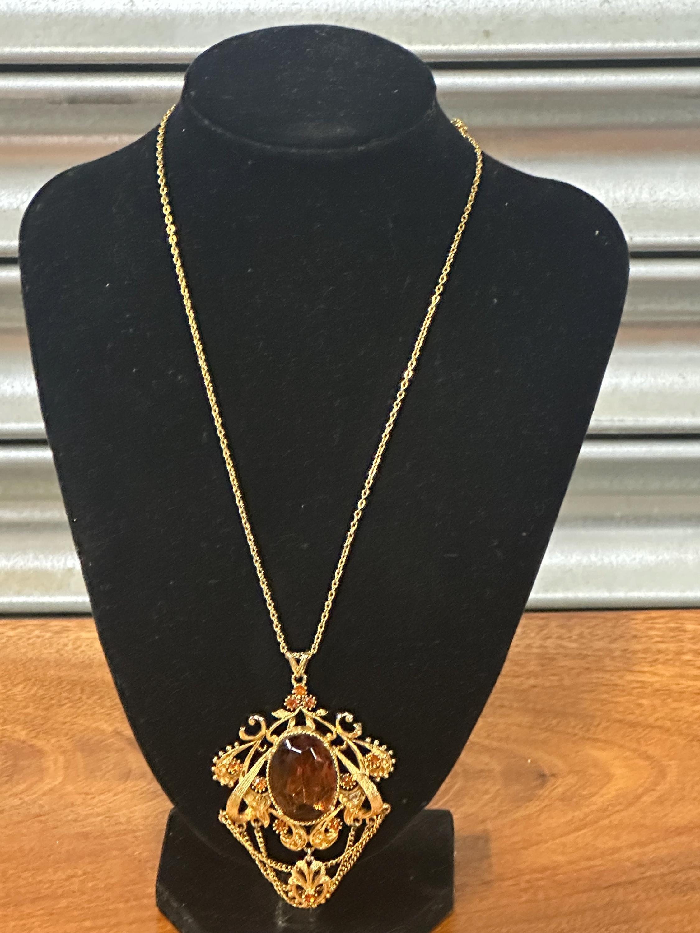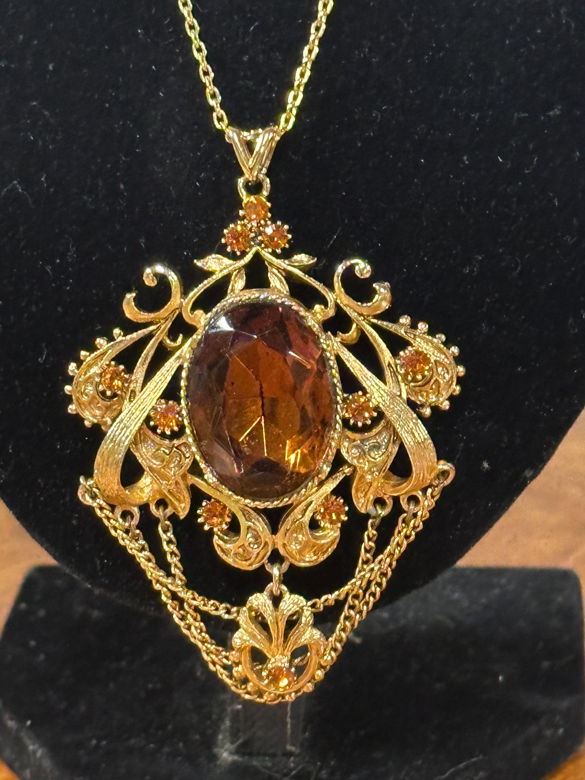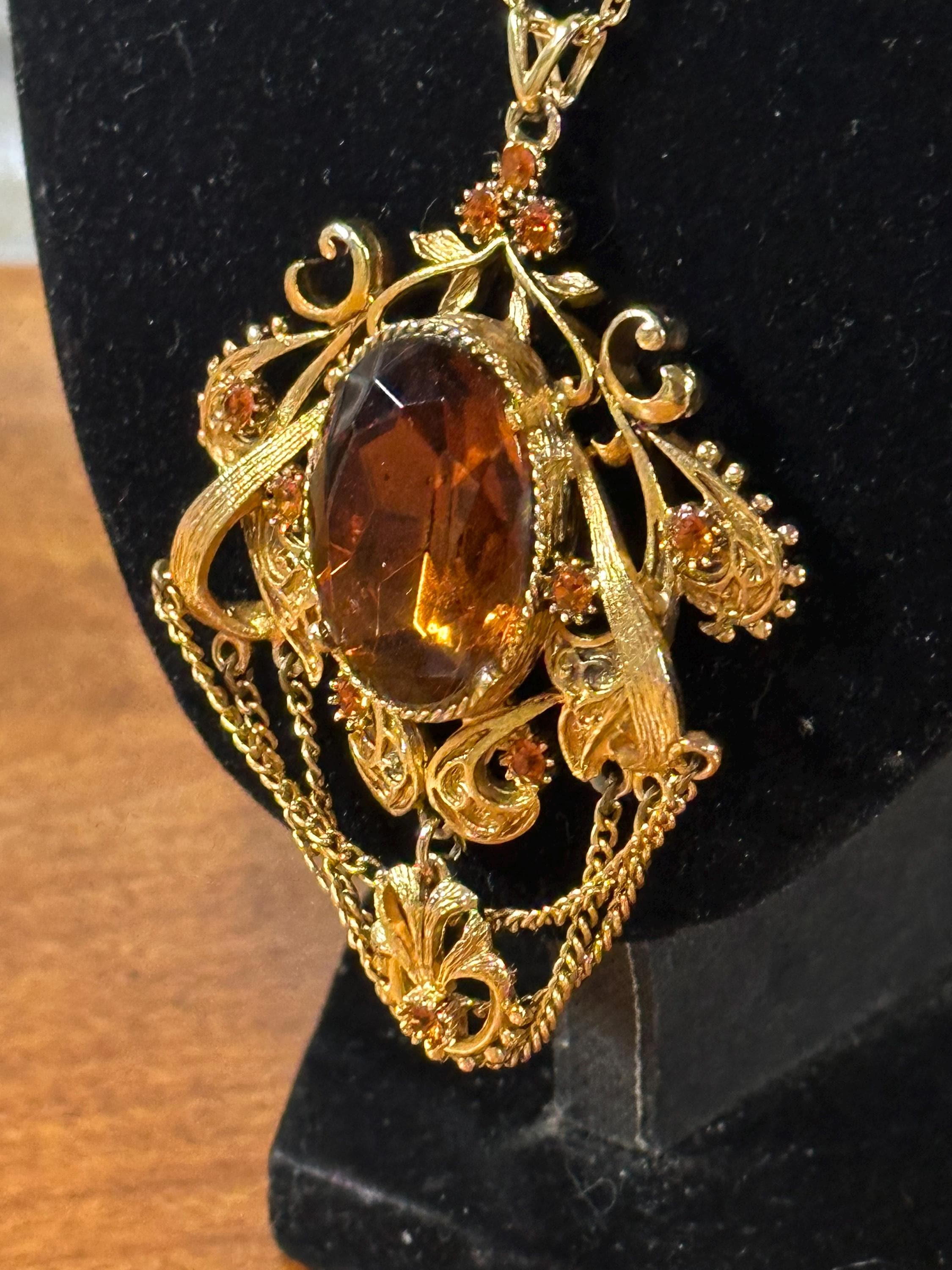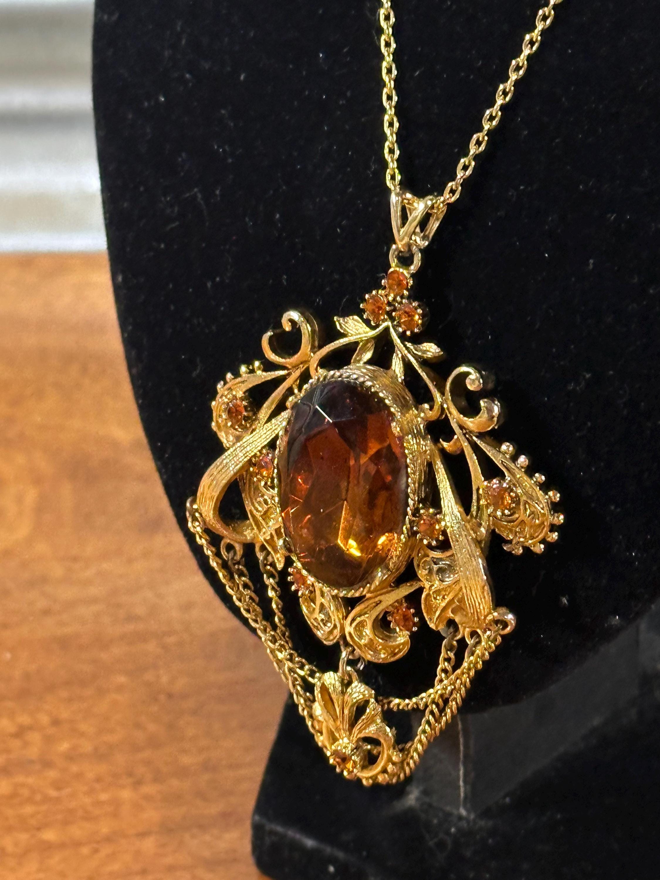 A striking vintage pendant necklace dating to the circa 1960s, beautifully crafted in ornate gold-tone metal. The large statement pendant features an intricate openwork filigree design with scrolling details and decorative chain swags, centred by a faceted amber-coloured stone that catches the light beautifully.